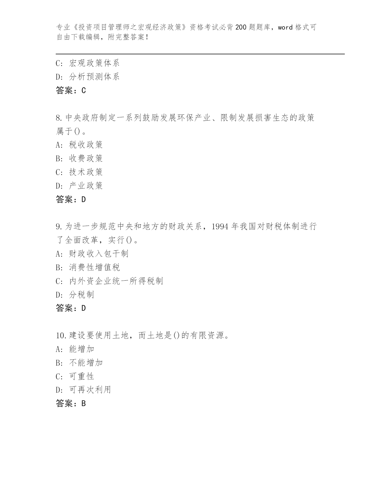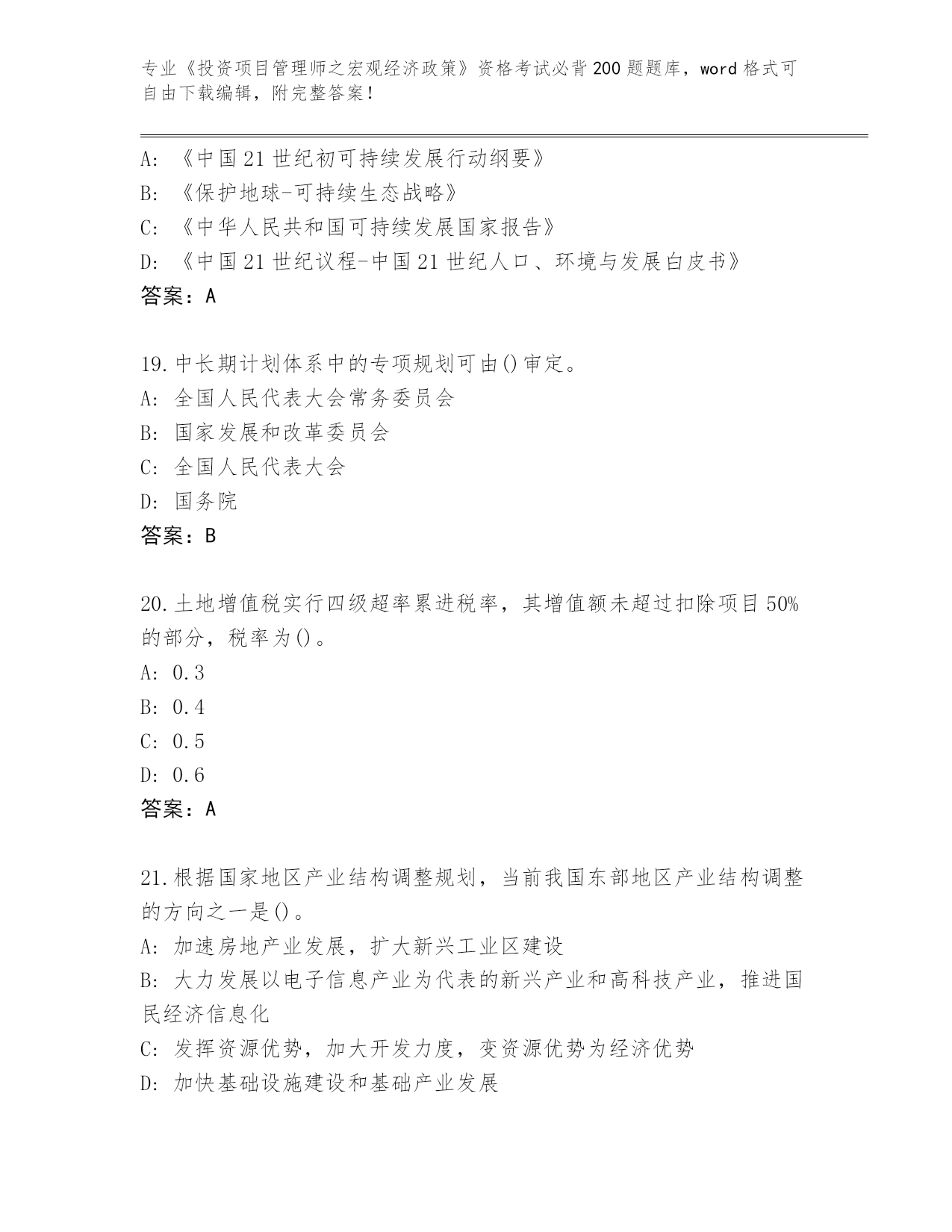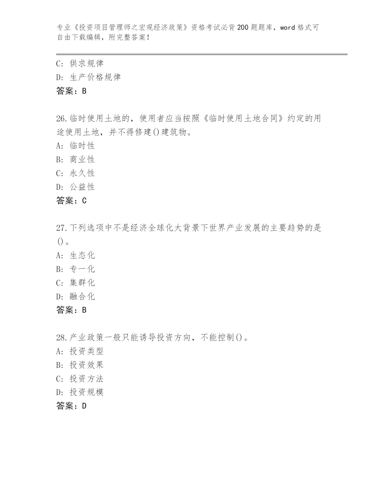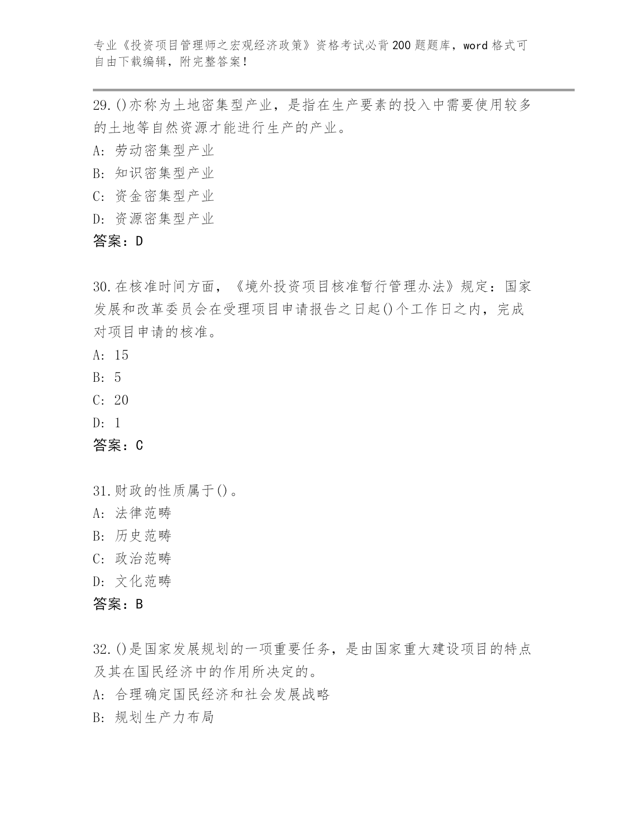 完整版河南省宜阳县《投资项目管理师之宏观经济政策》资格考试必背200题王牌题库完整