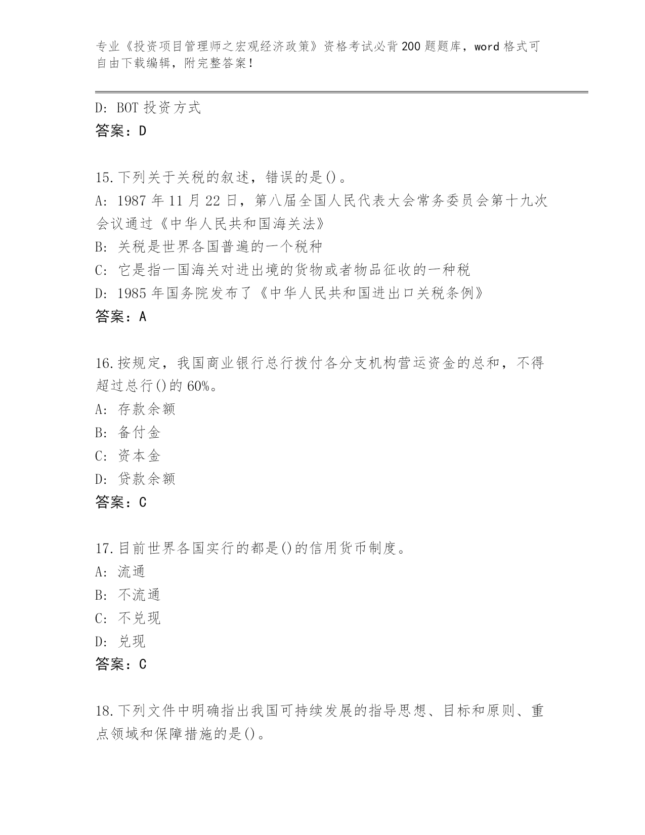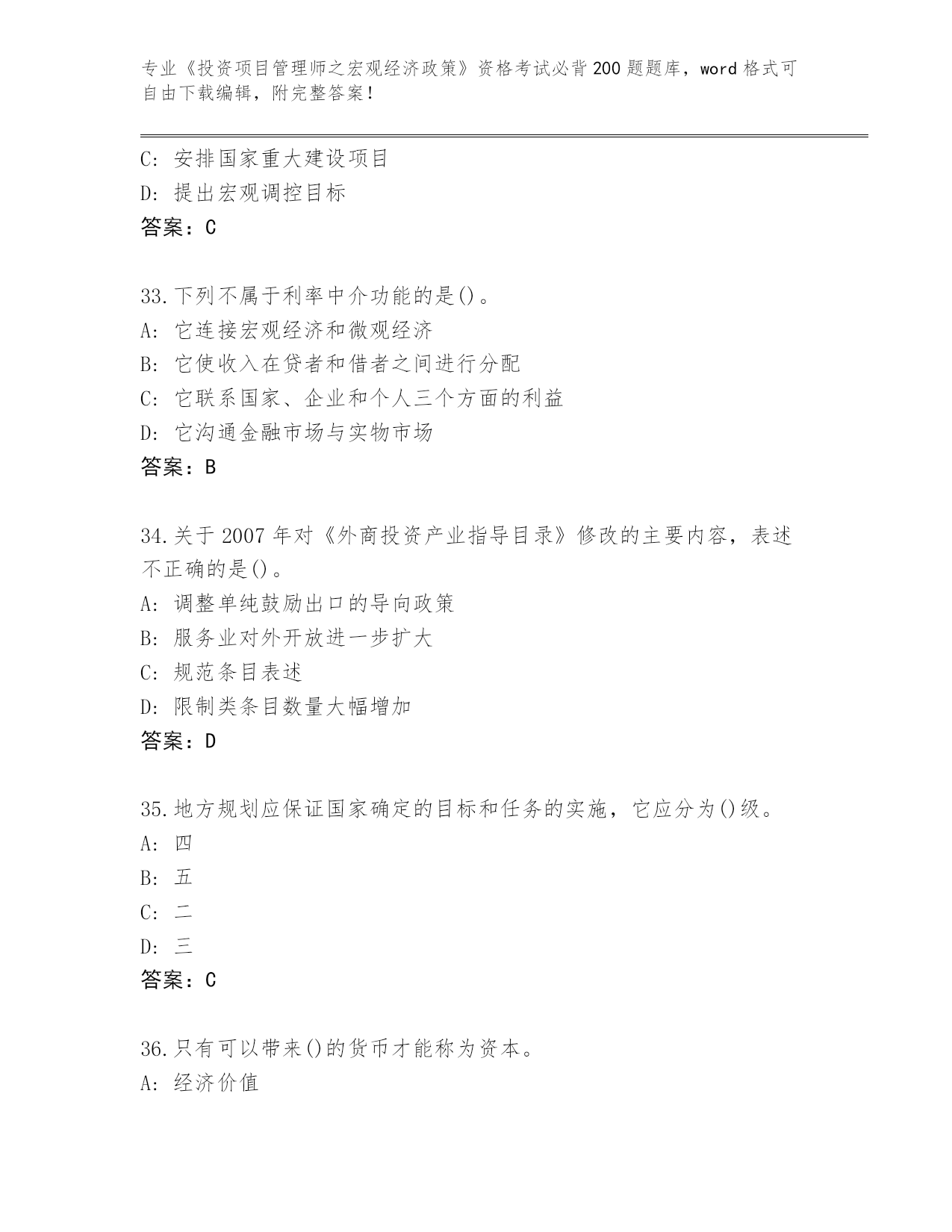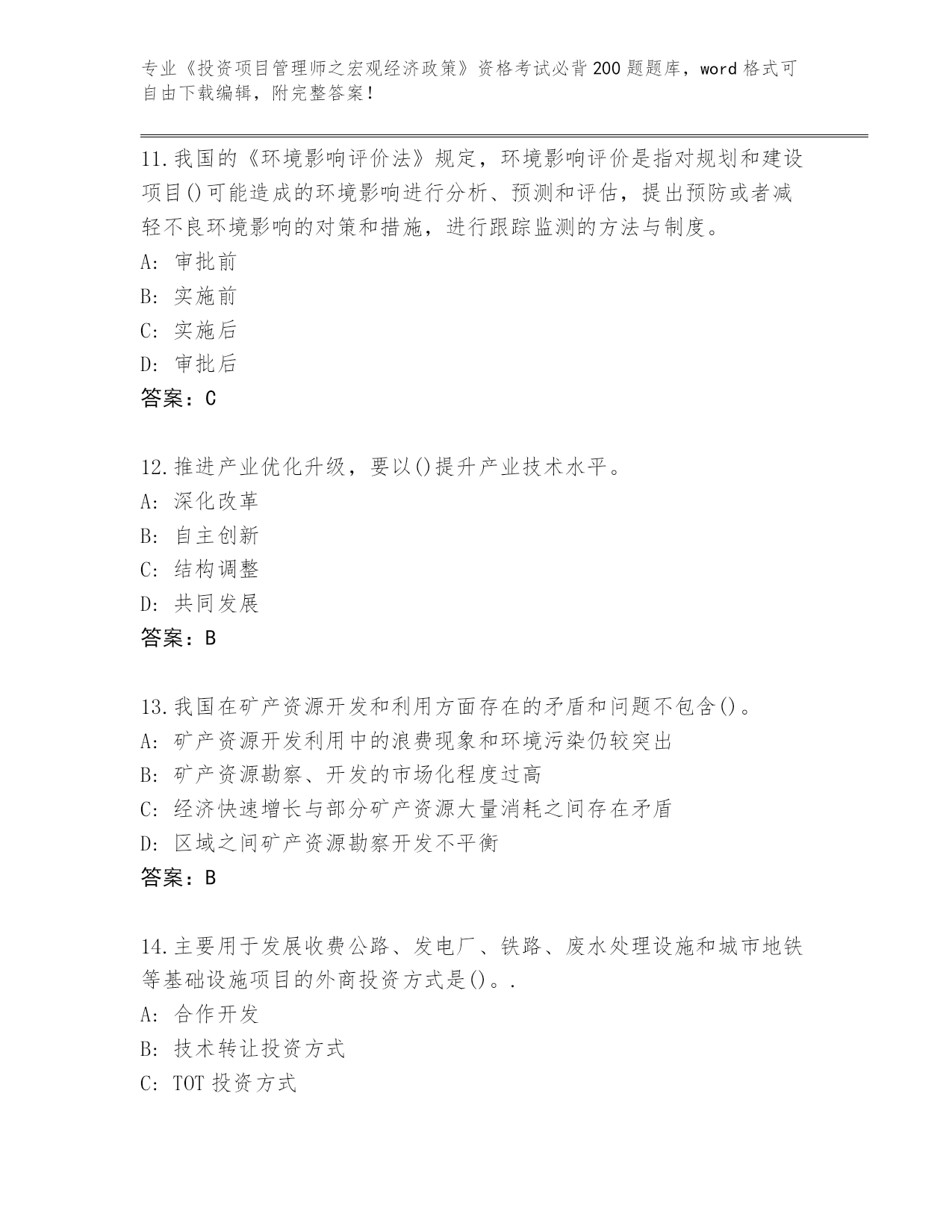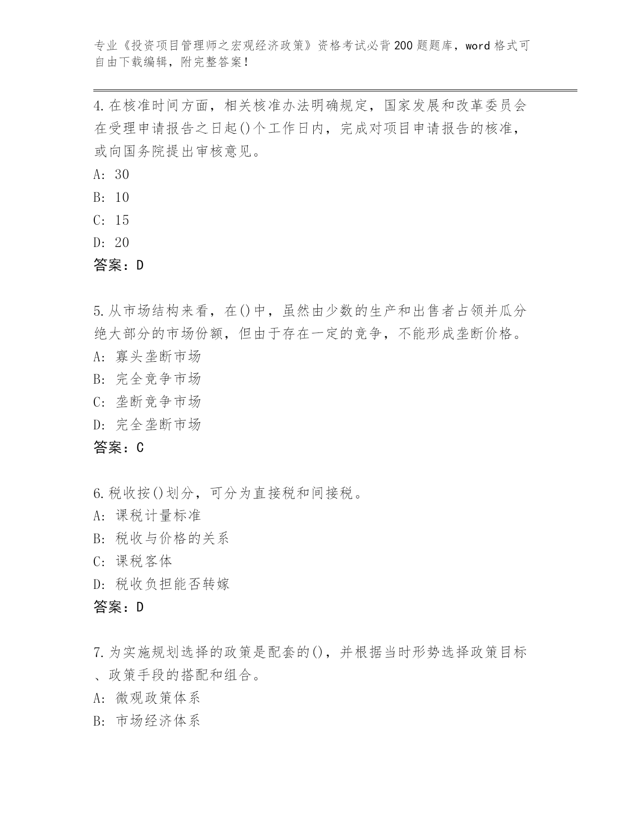 完整版河南省宜阳县《投资项目管理师之宏观经济政策》资格考试必背200题王牌题库完整