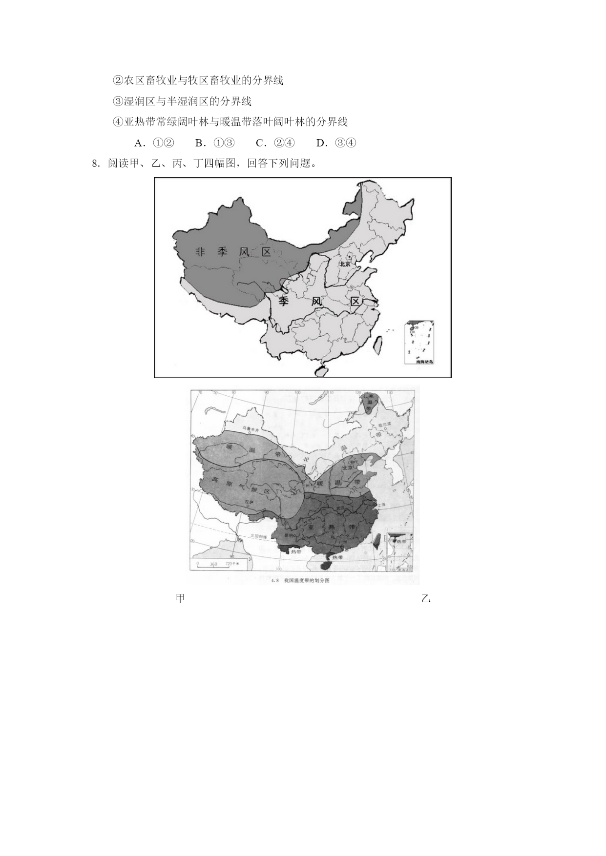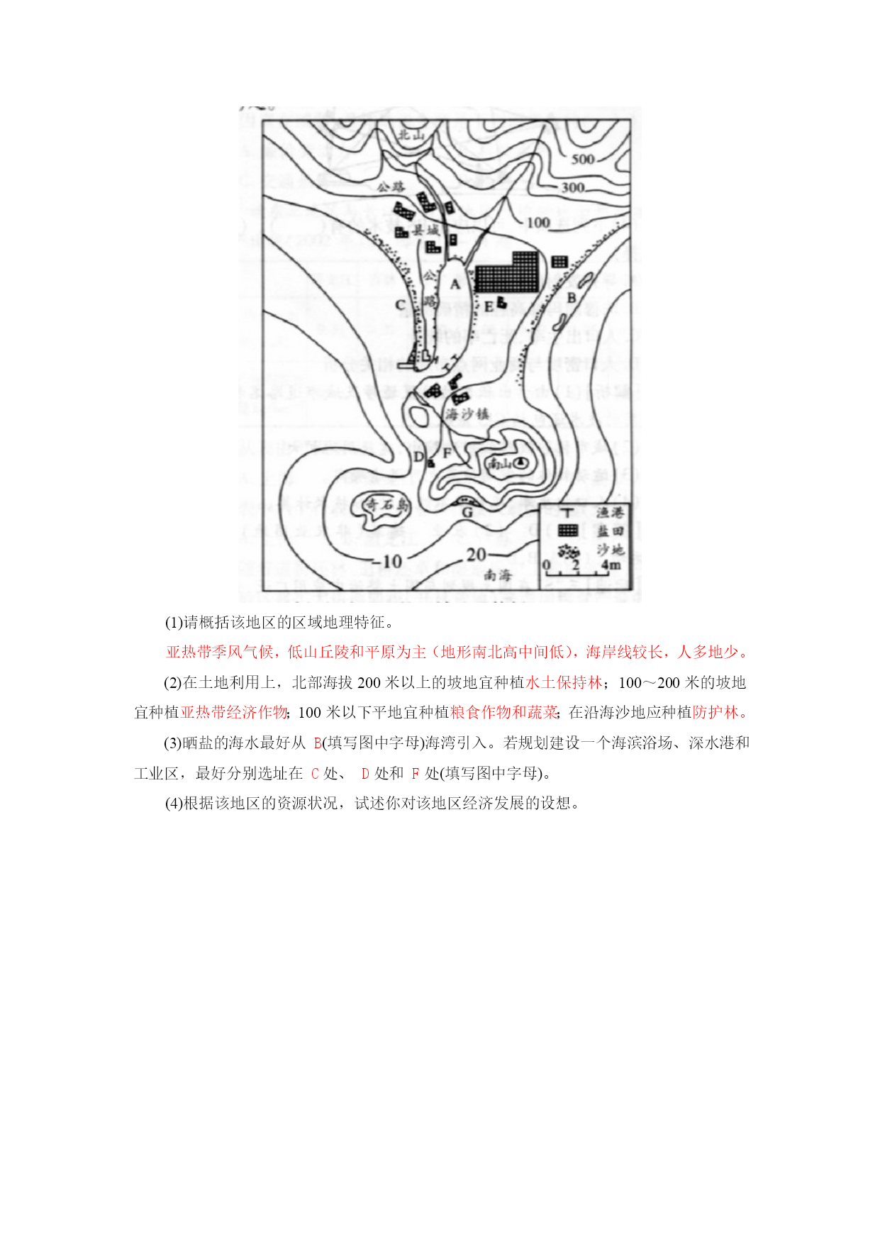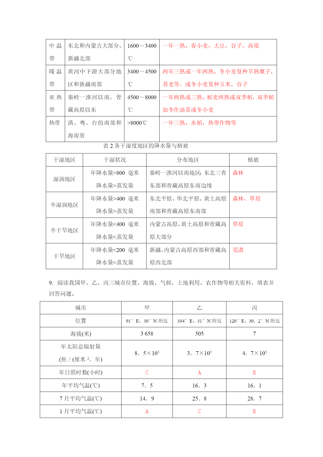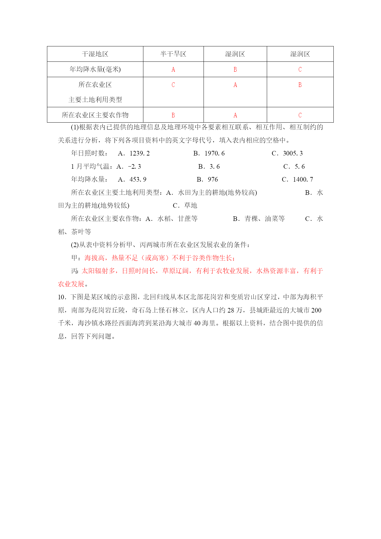 高考链接:1.下列关于区域的说法,错误的是BA.区域是人们按一定的指标和方法划分出来的HYPERLINK"file:///E:\\高中课件\\湘教版必修3\\files\\gaokaolianjie\\A0101.htm"\l"aaab#aaab"B.区域的界线都是明确的C.区域内部有明显的共同性,区域之间则有显著的差异性D.最高级的区域是整个地球表层【解析】此题考查的是区域的概念。有的区域界线是模糊的,例如气候区、植被区。另外,区域界线是明确的,也是相对而言的,例如严格划定的国界,从漫长的历史进程来看,也是变动的。2.下列四幅图,用于表示不同区域的从属关系。其中正确的是C【解析】此题考查的是区域的概念。A项中的东北平原应是东北地区的一部分;B项中的四川省西部处于青藏地区;D项中的亚洲区域内的岛屿并不属于亚欧大陆。工业地理区域按等级层次可以划分为工业点、工业区、工业城镇、工业枢纽、工业基地等,这里的工业区是指城镇里的工业区,不是“美国东北部工业区”中的工业区,后者相当于“工业基地”。3.下列关于区域空间分布形式的叙述,正确的是B①城市和工业点表现为岛状②城市群和工业基地表现为点状③交通运输线表现为线状和网状④农业区表现为面状A.①②HYPERLINK"file:///E:\\高中课件\\湘教版必修3\\files\\gaokaolianjie\\A0101.htm"\l"aaab#aaab"B.③④C.①③④D.②③④【解析】此题考查的是区域空间结构的基本知识。城市和工业点应表现为点状;城市群和工业基地应表现为岛状。4.关于区域产业结构的差异的叙述,错误的是AHYPERLINK"file:///E:\\高中课件\\湘教版必修3\\files\\gaokaolianjie\\A0101.htm"\l"aaab#aaab"A.区域产业结构主要表现为三次产业占国内生产总值的比重B.一般来说.传统的农业区域,或发展水平较低的区域,第一产业所占比重较大C.工业区域,或加速推进工业化的区域,第一产业所占比重较小,第二产业所占比重较大D.发展水平较高的区域,第二产业和第三产业所占比重较大【解析】此题考查的是区域产业结构的基本知识。区域产业结构主要表现不仅有三次产业占国内生产总值的比重,还有三次产业的就业比重、三次产业的内部构成等。5.我国青藏高原农区小麦高产的主要原因是AHYPERLINK"file:///E:\\高中课件\\湘教版必修3\\files\\gaokaolianjie\\A0101.htm"\l"aaab#aaab"A.昼夜温差大,太阳辐射强B.二氧化碳浓度高C.雨量充沛D.气温偏低,水分蒸发少【解析】此题考查的是地理环境的整体性知识。青藏高原白天太阳辐射强、温度较高,小麦光合作用强,合成淀粉多;夜晚温度较低,小麦呼吸作用弱,消耗淀粉(糖分)少。这样,小麦的淀粉积累就多,产量就高。6.澳门对外贸易没有香港发达的最主要原因是BA.香港离祖国大陆近而澳门远HYPERLINK"file:///E:\\高中课件\\湘教版必修3\\files\\gaokaolianjie\\A0101.htm"\l"aaab#aaab"B.香港有天然深水港而澳门没有C.香港自然资源丰富而澳门贫乏D.香港有京九线联系而澳门没有【解析】此题考查的是区域环境的差异对经济发展的影响。7.秦岭一淮河一线是我国D①冬小麦与春小麦主要产区的分界线②农区畜牧业与牧区畜牧业的分界线③湿润区与半湿润区的分界线④亚热带常绿阔叶林与暖温带落叶阔叶林的分界线A.①②B.①③C.②④HYPERLINK"file:///E:\\高中课件\\湘教版必修3\\files\\gaokaolianjie\\A0101.htm"\l"aaab#aaab"D.③④【解析】此题主要考查区域之间的分界线。冬小麦与春小麦主要产区的分界线是长城.农区畜牧业与牧区畜牧业的分界线大致是400毫米等降水量线。8.阅读甲、乙、丙、丁四幅图,回答下列问题。甲乙丙丁(1)甲、乙、丙、丁四幅图表示的区域,其划分依据分别是什么?甲:夏季风的影响范围;乙:≥10℃积温;丙:年降水量及降水量和蒸发量的对比;丁:地理位置,自然和人文地理特点。(2)填写下列两个表格,比较不同热量或水分条件对农业生产的影响。表1各温度带的积温与作物熟制温度带范围≥l0℃积温作物及熟制寒温带黑龙江省北部、内蒙古东北部<1600℃一年一熟。早熟的春小麦、小麦、马铃薯中温带东北和内蒙古大部分、新疆北部1600~3400℃一年一熟。春小麦、大豆、谷子、高粱暖温带黄河中下游大部分地区和新疆南部3400~4500℃两年三熟或一年两熟。