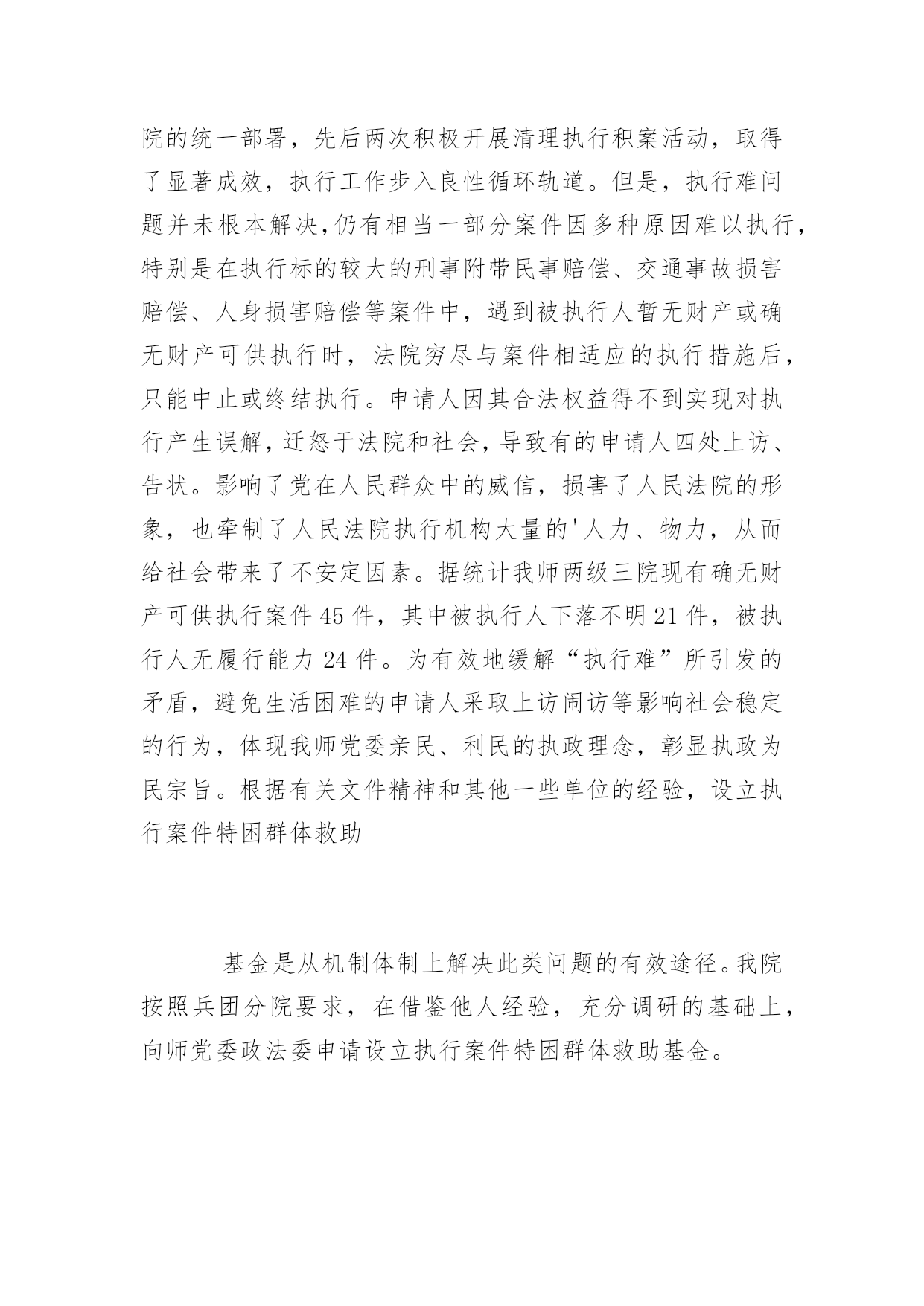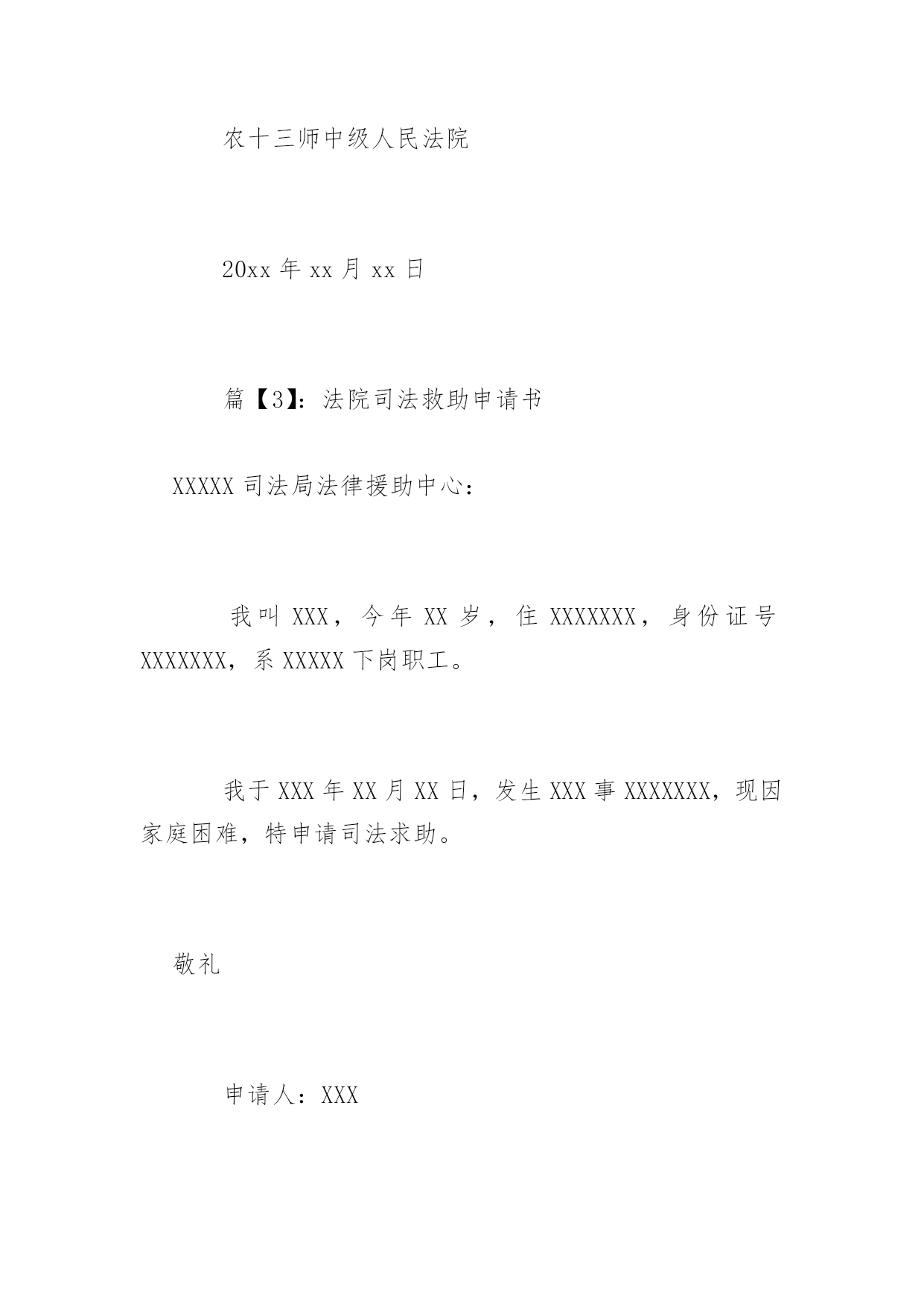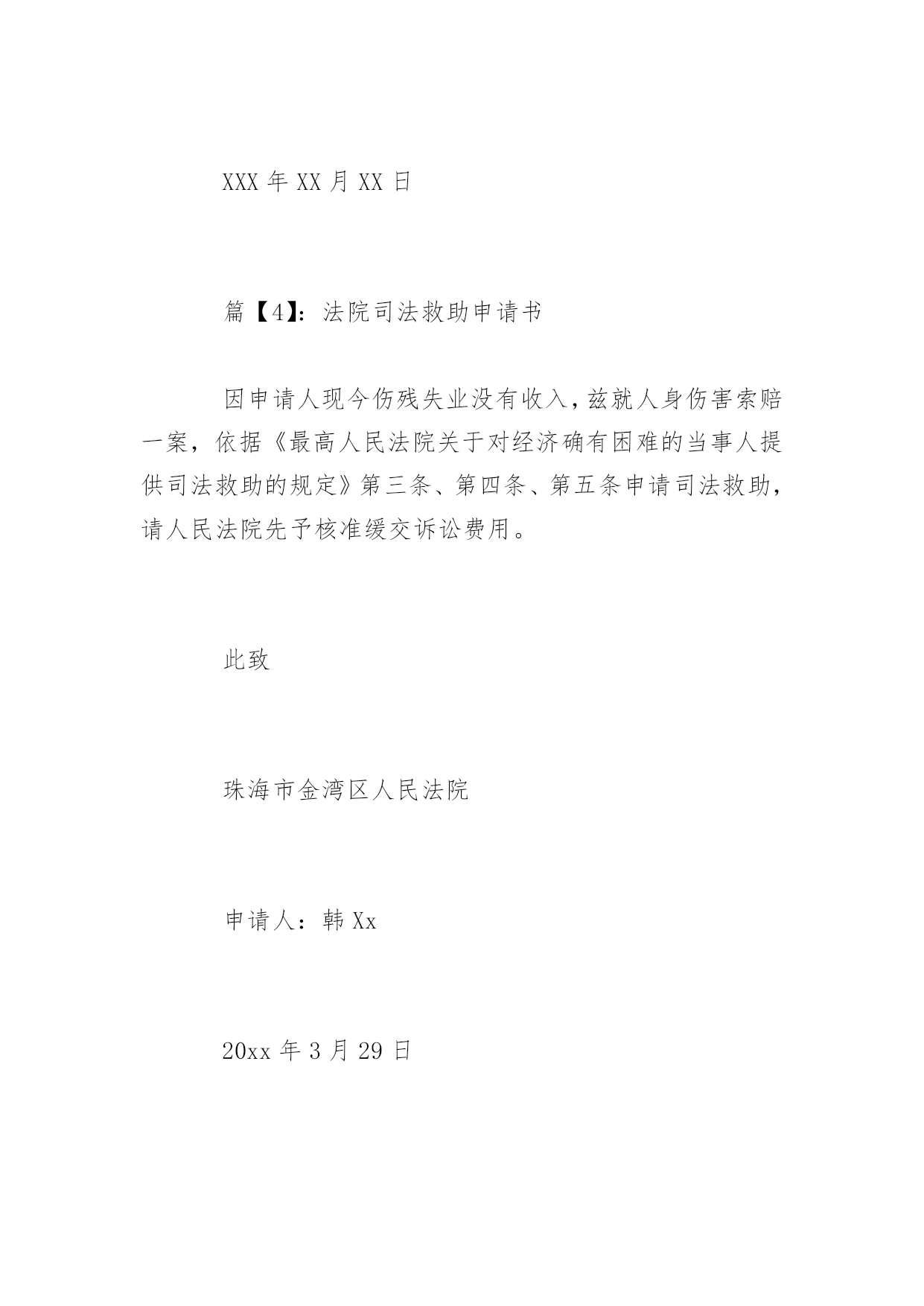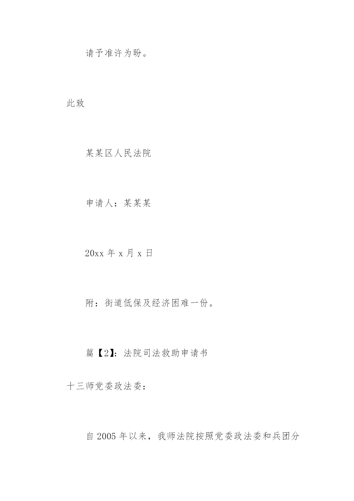 法院司法救助申请书想申请法院援助的话,一般要符合一定的条件,否则提交的法院司法救助申请书无法被受理。以下是法院司法救助申请书范文,可作参考。篇【1】:法院司法救助申请书申请人:某某某请求事项:免交诉讼费用理由:申请人已向贵院提起遗产继承诉讼,但是由于申请人目前属城市低保人员且生活非常困难,无力支付诉讼费用,特申请贵院依法提供司法救助,予以免交诉讼费用。请予准许为盼。此致某某区人民法院申请人:某某某20xx年x月x日附:街道低保及经济困难一份。篇【2】:法院司法救助申请书十三师党委政法委:自2005年以来,我师法院按照党委政法委和兵团分院的统一部署,先后两次积极开展清理执行积案活动,取得了显著成效,执行工作步入良性循环轨道。但是,执行难问题并未根本解决,仍有相当一部分案件因多种原因难以执行,特别是在执行标的较大的刑事附带民事赔偿、交通事故损害赔偿、人身损害赔偿等案件中,遇到被执行人暂无财产或确无财产可供执行时,法院穷尽与案件相适应的执行措施后,只能中止或终结执行。申请人因其合法权益得不到实现对执行产生误解,迁怒于法院和社会,导致有的申请人四处上访、告状。影响了党在人民群众中的威信,损害了人民法院的形象,也牵制了人民法院执行机构大量的'人力、物力,从而给社会带来了不安定因素。据统计我师两级三院现有确无财产可供执行案件45件,其中被执行人下落不明21件,被执行人无履行能力24件。为有效地缓解“执行难”所引发的矛盾,避免生活困难的申请人采取上访闹访等影响社会稳定的行为,体现我师党委亲民、利民的执政理念,彰显执政为民宗旨。根据有关文件精神和其他一些单位的经验,设立执行案件特困群体救助基金是从机制体制上解决此类问题的有效途径。我院按照兵团分院要求,在借鉴他人经验,充分调研的基础上,向师党委政法委申请设立执行案件特困群体救助基金。农十三师中级人民法院20xx年xx月xx日篇【3】:法院司法救助申请书XXXXX司法局法律援助中心:我叫XXX,今年XX岁,住XXXXXXX,身份证号XXXXXXX,系XXXXX下岗职工。我于XXX年XX月XX日,发生XXX事XXXXXXX,现因家庭困难,特申请司法求助。敬礼申请人:XXXXXX年XX月XX日篇【4】:法院司法救助申请书因申请人现今伤残失业没有收入,兹就人身伤害索赔一案,依据《最高人民法院关于对经济确有困难的当事人提供司法救助的规定》第三条、第四条、第五条申请司法救助,请人民法院先予核准缓交诉讼费用。此致珠海市金湾区人民法院申请人:韩Xx20xx年3月29日附:镇政府证明材料一份