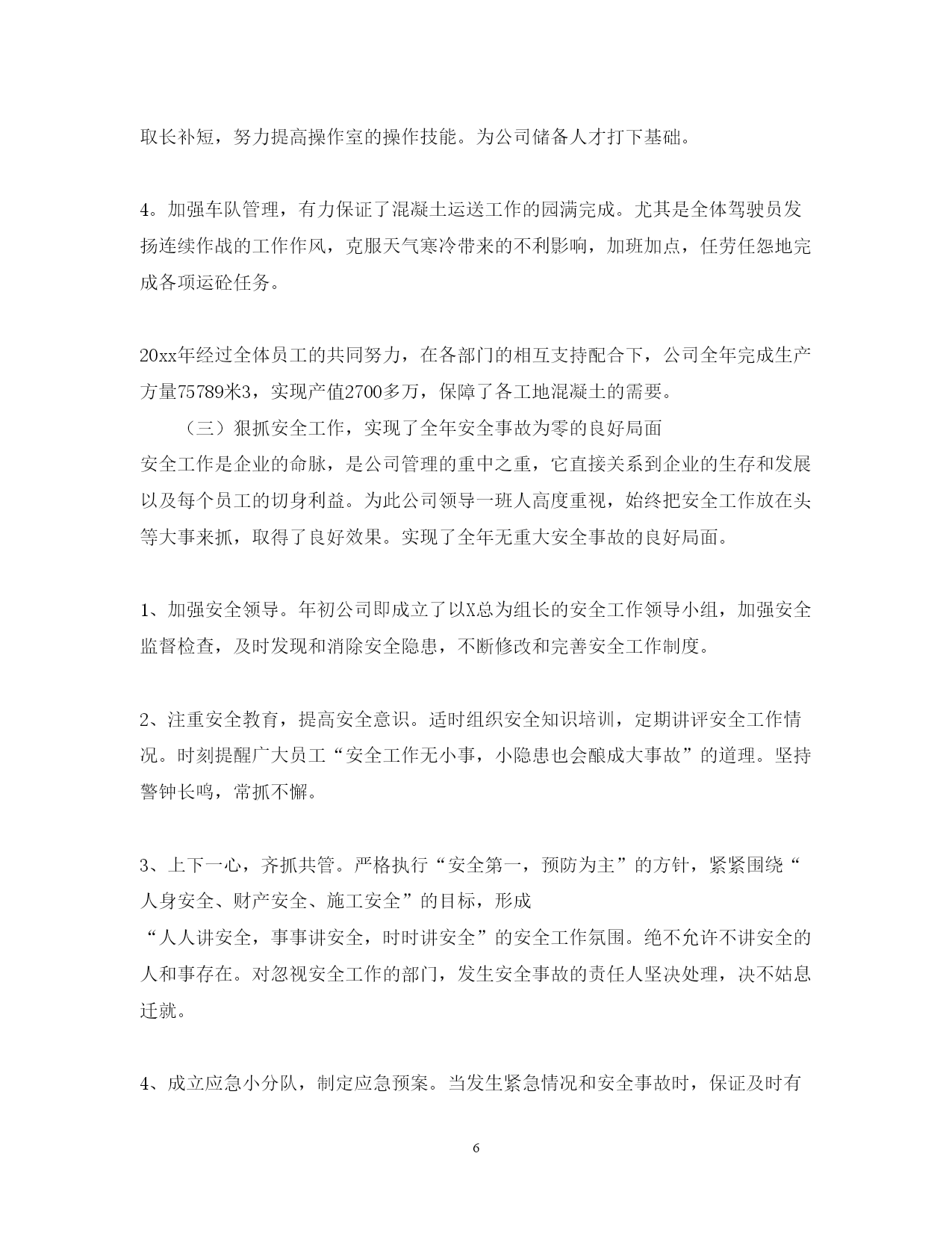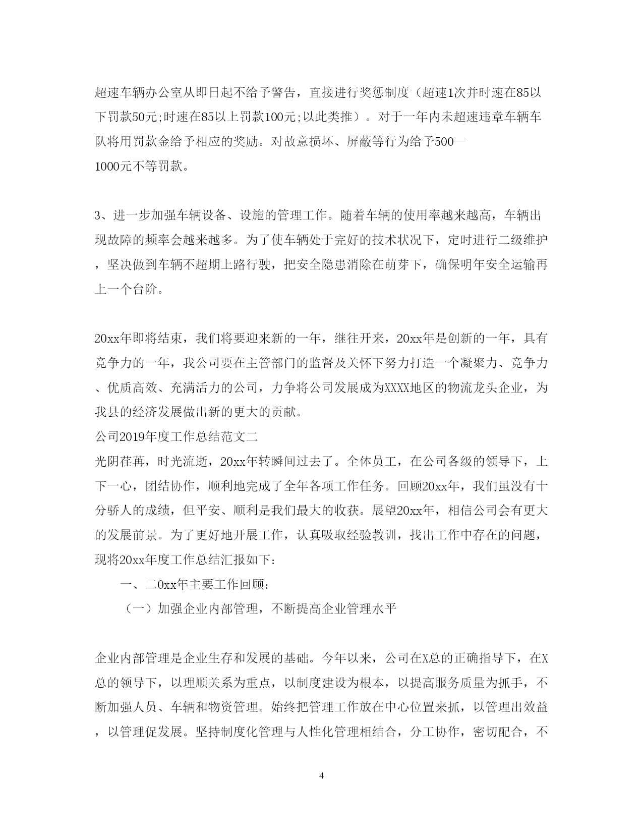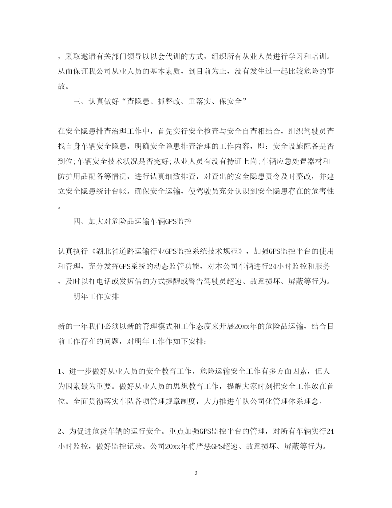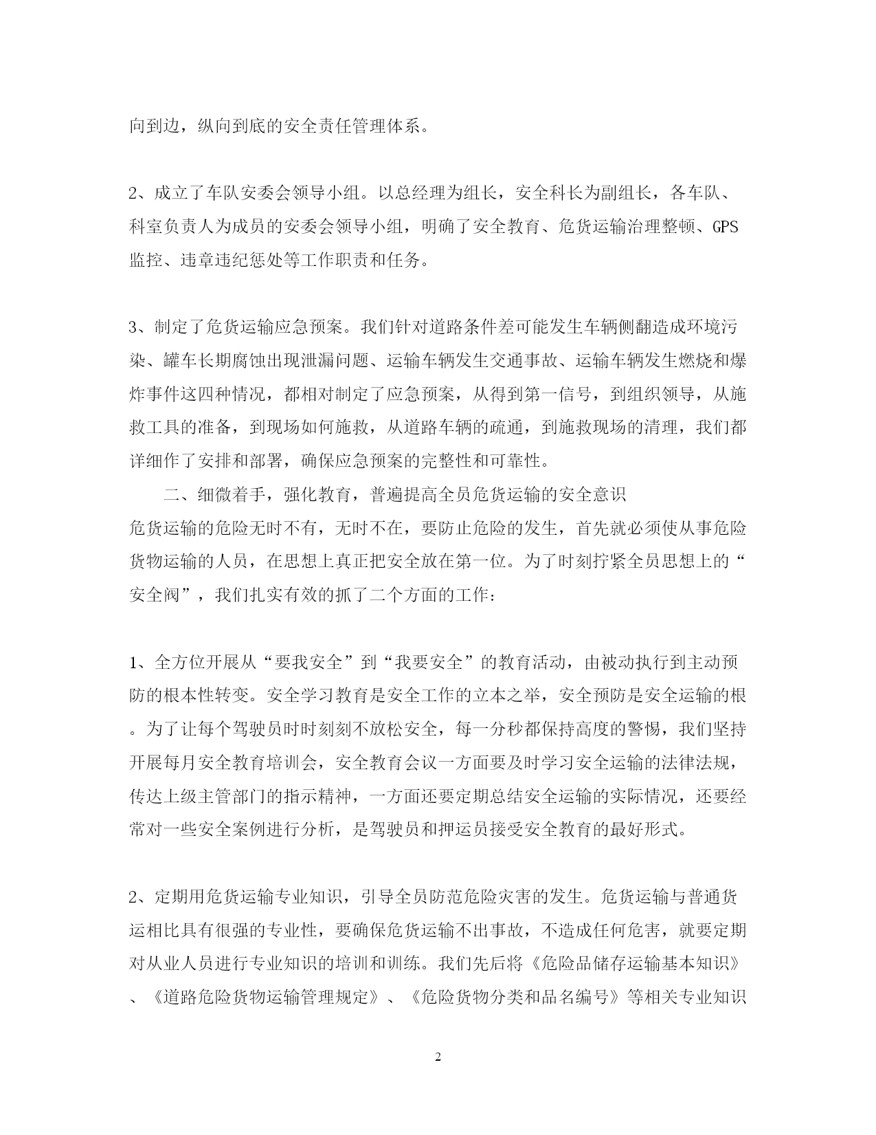 此资料由网络收集而来,如有侵权请告知上传者立即删除。资料共分享,我们负责传递知识。PAGEPAGE9公司20XX年度工作总结范本2019年即将结束,我们将要迎来新的一年,下面是小编搜集整理的公司2019年度工作总结范文,欢迎阅读。公司2019年度工作总结范文一20xx年度,我公司在县相关主管部门的监督和指导下,围绕“关爱生命,安全发展”的主题,坚持“安全第一、预防为主、综合治理”的方针,深入宣传贯彻落实《道路交通安全法实施条例》、《交通运输管理条例》及《安全生产法》。认真组织开展安全隐患排查治理工作,加强安全运输监督管理,消除安全隐患,进一步落实安全生产“一岗双责”。确保了公司的健康、稳定、和谐有序发展。通过严密组织,精心安排,全体员工团结一致,上下一心,努力拼搏,以不怕苦、不怕累、不怕脏的精神,实现了无重大交通事故、无火灾爆炸事故,安全运输形势保持稳定。现将20xx年工作总结如下:一、高标准、高起点,把危货运输安全工作做深做实今年我们根据危货运输的特性,从高标准、严要求做起,着手抓了三件事:1、制定出了高标准的安全工作目标。具体来讲就是“五个100%、三个杜绝”即:从业人员受教育面达到100%、各种证件年审率达到100%、持证上岗率达到100%、车辆警示标志齐全率达到100%、隐患整改率达到100%;杜绝违章违法事件发生、杜绝重大安全责任事故的发生;杜绝危险品泄漏、燃烧、爆炸等重大事故的发生。年初,公司及时组织召开了安全生产经营管理会,对20xx年度的安全工作作了详细的安排和部署,明确了全年安全生产工作的指导思想、目标任务、工作重点和措施。公司经理和各部门、车队、科室负责人签订了《20xx年度“一岗双责”目标考核责任书》。主管安全生产的副经理和各车驾驶员签订了《20xx年度“一岗双责”目标考核责任书》和《20xx年度驾驶员安全生产责任书》。签订率100%,并将安全目标指标量化,分解到各部门人员,并作为全年安全生产工作的重要考核内容,做到了横向到边,纵向到底的安全责任管理体系。2、成立了车队安委会领导小组。以总经理为组长,安全科长为副组长,各车队、科室负责人为成员的安委会领导小组,明确了安全教育、危货运输治理整顿、GPS监控、违章违纪惩处等工作职责和任务。3、制定了危货运输应急预案。我们针对道路条件差可能发生车辆侧翻造成环境污染、罐车长期腐蚀出现泄漏问题、运输车辆发生交通事故、运输车辆发生燃烧和爆炸事件这四种情况,都相对制定了应急预案,从得到第一信号,到组织领导,从施救工具的准备,到现场如何施救,从道路车辆的疏通,到施救现场的清理,我们都详细作了安排和部署,确保应急预案的完整性和可靠性。二、细微着手,强化教育,普遍提高全员危货运输的安全意识危货运输的危险无时不有,无时不在,要防止危险的发生,首先就必须使从事危险货物运输的人员,在思想上真正把安全放在第一位。为了时刻拧紧全员思想上的“安全阀”,我们扎实有效的抓了二个方面的工作:1、全方位开展从“要我安全”到“我要安全”的教育活动,由被动执行到主动预防的根本性转变。安全学习教育是安全工作的立本之举,安全预防是安全运输的根。为了让每个驾驶员时时刻刻不放松安全,每一分秒都保持高度的警惕,我们坚持开展每月安全教育培训会,安全教育会议一方面要及时学习安全运输的法律法规,传达上级主管部门的指示精神,一方面还要定期总结安全运输的实际情况,还要经常对一些安全案例进行分析,是驾驶员和押运员接受安全教育的最好形式。2、定期用危货运输专业知识,引导全员防范危险灾害的发生。危货运输与普通货运相比具有很强的专业性,要确保危货运输不出事故,不造成任何危害,就要定期对从业人员进行专业知识的培训和训练。我们先后将《危险品储存运输基本知识》、《道路危险货物运输管理规定》、《危险货物分类和品名编号》等相关专业知识,采取邀请有关部门领导以以会代训的方式,组织所有从业人员进行学习和培训。从而保证我公司从业人员的基本素质,到目前为止,没有发生过一起比较危险的事故。三、认真做好“查隐患、抓整改、重落实、保安全”在安全隐患排查治理工作中,首先实行安全检查与安全自查相结合,组织驾驶员查找自身车辆安全隐患,明确安全隐患排查治理的工作内容,即:安全设施配备是否到位;车辆安全技术状况是否完好;从业人员有没有持证上岗;车辆应急处置器材和防护用品配备等情况,进行认真细致排查,对查出的安全隐患责令及时整改,并建立安全隐患统计台帐。确保安全运输,使驾驶员充分认识到安全隐患存在的危害性。四、加大对危险品运输车辆GPS监控认真执行《湖北省道路运输行业GPS监控系统技术规范》,加强GPS监控平台的使用和管理,充分发挥GPS系统的动态监管功能,对本公司车辆进行24小时监控和服务,及时以打电话或发短