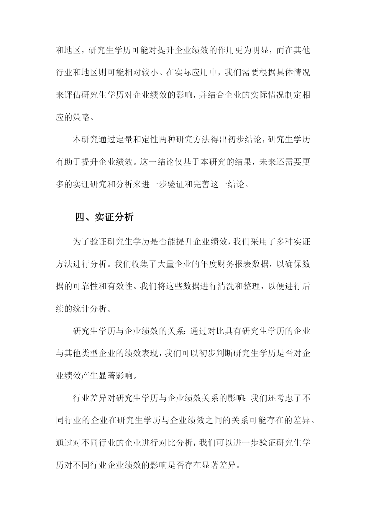 研究生学历能否提升企业绩效目录一、内容描述................................................11.背景介绍..............................................12.研究意义..............................................2二、文献综述................................................21.国内外研究现状........................................42.研究方法与数据来源....................................5三、研究内容与方法..........................................51.研究内容概述..........................................62.研究方法说明..........................................7四、实证分析................................................81.研究设计.............................................102.数据处理与分析.......................................113.结果展示.............................................12五、结论与建议.............................................131.研究结论概括.........................................152.对企业绩效提升的建议.................................153.研究不足与未来展望...................................17一、内容描述随着知识经济的崛起,企业对人才的需求逐渐从单一技能向多元化发展。为了在激烈的市场竞争中立于不败之地,越来越多的企业认识到研究生学历的重要性,并将其作为选拔和选拔条件之一。对于企业而言,拥有研究生学历的员工,无疑具备更高的知识水平和更强的学习能力。这不仅有助于企业适应市场变化,提高创新能力,同时也能为企业节省大量的培训和招聘成本。值得注意的是,虽然研究生学历能够为企业带来诸多优势,但并非所有企业都认为研究生学历能够直接提升企业绩效。这一观点取决于多种因素,如行业特点、企业文化、员工能力等。在评价研究生学历是否能提升企业绩效时,需要综合考虑各种因素。1.背景介绍随着市场竞争的加剧和企业对人才素质要求的提高,越来越多的企业开始关注员工的学历背景。研究生学历作为一种高学历水平,逐渐成为许多求职者追求的目标。关于研究生学历是否能提升企业绩效的问题,一直是业界和学术界争论的焦点。本文将从背景介绍、理论分析、实证研究和社会实践四个方面对这一问题进行探讨。2.研究意义在当今竞争激烈的商业环境中,企业要想长足发展,除了要有高效的运营和优质的产品服务外,还需要不断优化自身的管理体系和提高员工的综合素质。而研究生的学历,无疑为提升企业绩效提供了一种可能性。研究生学历的员工拥有更扎实的理论基础和更广泛的知识面,能够更快更好地理解和应用先进的管理理念、方法和技术。研究生学历的员工通常具有较强的创新能力和批判性思维,能够为企业带来新的思路和解决方案。这些员工更懂得如何进行有效的团队协作和沟通,有助于提高企业的整体协作效率。拥有研究生学历的员工在职业发展方面也具有更大的潜力,他们更容易获得晋升和加薪的机会,从而为企业创造更多的价值。投资于研究生的教育和培养,不仅有助于提高企业的核心竞争力,还能为企业的长远发展奠定坚实的人才基础。二、文献综述随着社会的不断发展和科技的日新月异,各行各业对人才的需求也在不断提升。在这种背景下,研究生的学历逐渐成为衡量一个人综合素质和能力的重要标准。越来越多的企业开始关注员工的学历背景,并将其作为选拔和晋升的重要依据。探讨研究生学历能否提升企业绩效具有重要的现实意义。许多学者就研究生学历与企业绩效之间的关系进行了深入研究。这些研究表明,拥有研究生学历的员工通常具有更高的知识水平和更强的创新能力,这对于企业来说是非常宝贵的资源。研究生学历的员工往往具有较强的专业技能和丰富的实践经验,能够迅速适应新环境和新挑战,为企业创造更多的价值。研究生学历的员工通常具备较高的创新能力和批判性思维,能够为企业带来新的思路和想法