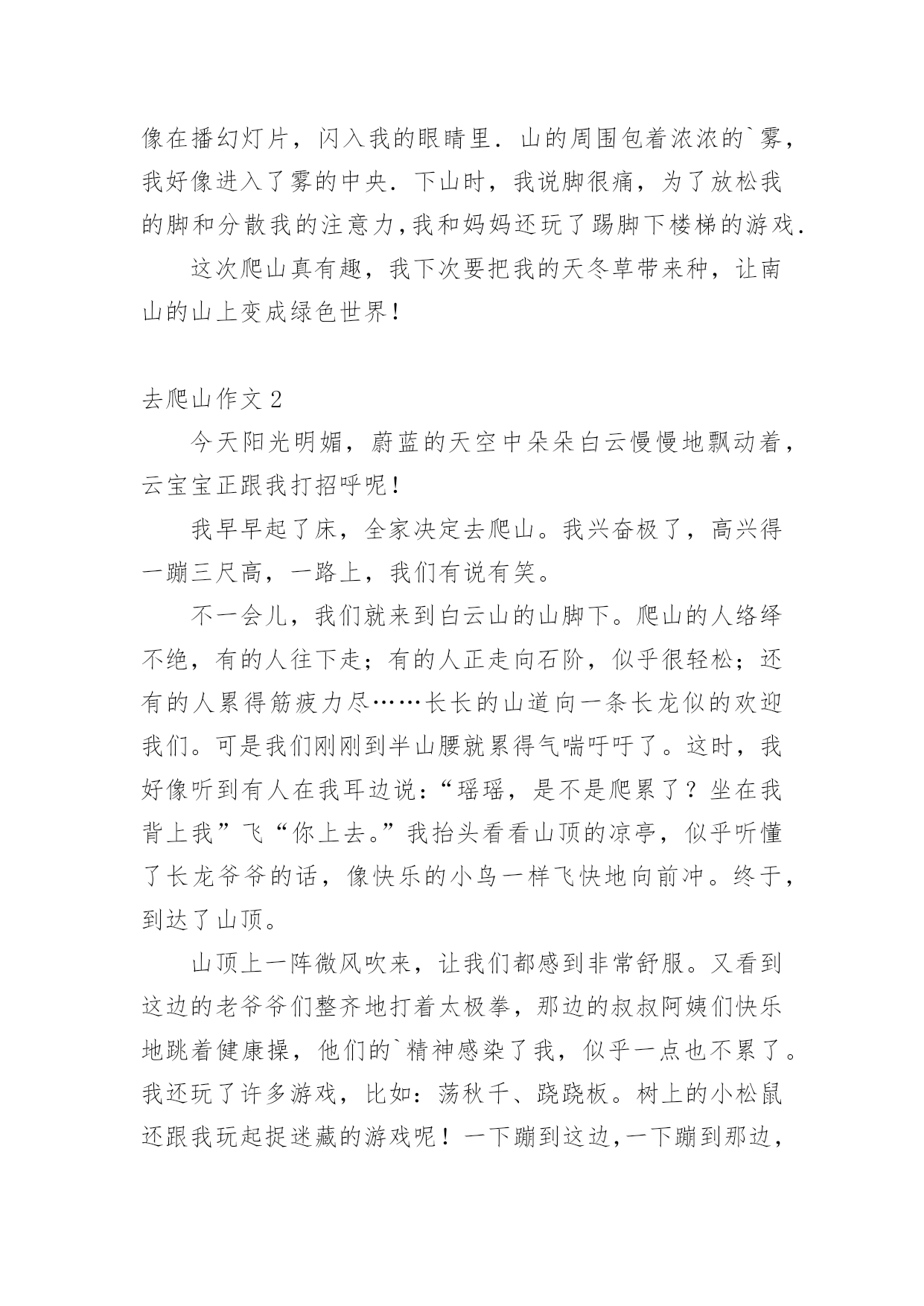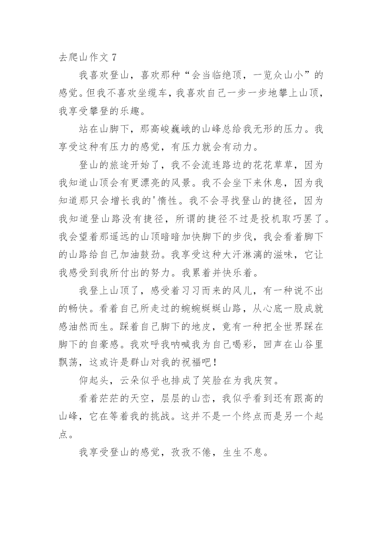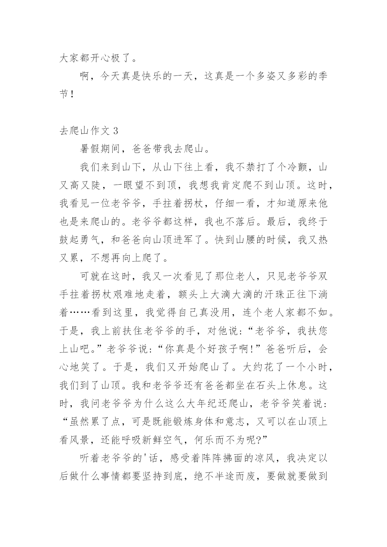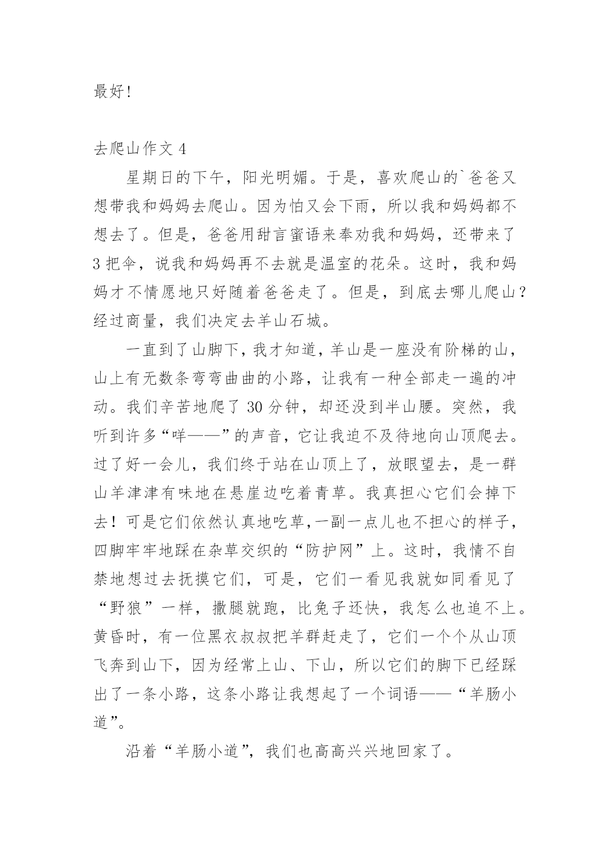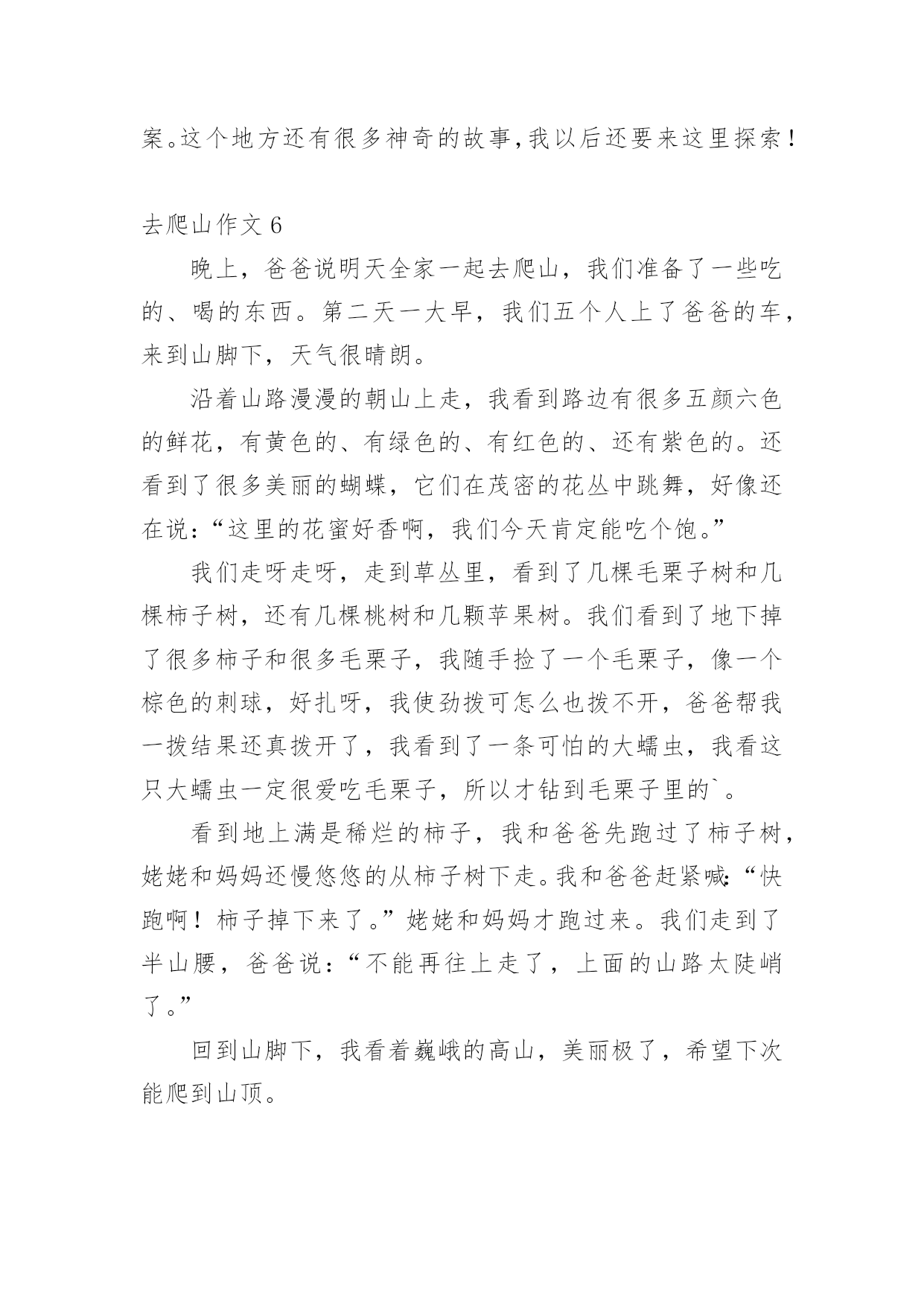 去爬山作文[通用]去爬山作文在平时的学习、工作或生活中,大家对作文都再熟悉不过了吧,写作文是培养人们的观察力、联想力、想象力、思考力和记忆力的重要手段。相信很多朋友都对写作文感到非常苦恼吧,下面是小编帮大家整理的去爬山作文,仅供参考,欢迎大家阅读。去爬山作文1到了南山,我迫不及待地说:"我们快爬山!"于是,我们一秒钟也不耽误,跑向通往山上的路口。这时,妈妈看见了瓜子,就买了一包。来到石梯旁,一只小"兔子"嗖地蹦了上去,那只兔子就是我。我兴奋地跑来跑去,不过一会儿就累了。我就慢慢地走着。过了一会儿,我往后面看,发现妈妈拼命抓住爸爸,无力地走着,我一看,哈哈大笑。这时,下起了蒙蒙细雨,山上雾蒙蒙的,前面的路好像是一扇门,人走进去,我就看不到他们的身影.终于有个亭子休息了.我刚要坐下,姐姐叫:"那里有水!"我一听,马上跳了起来.我没办法,只好垂头丧气地站在一边.我们又继续向前走.这时,我看见了两个哥哥姐姐正在喘气,不过已经快到山顶了,于是我和他们努力地向前爬,终于爬上了峰顶.从峰顶往下看,一片绿色映入我眼帘.我们一边观赏风景,一边吃瓜子.爬山的苦和累,乐和趣,一幕一幕的,好像在播幻灯片,闪入我的眼睛里.山的周围包着浓浓的`雾,我好像进入了雾的中央.下山时,我说脚很痛,为了放松我的脚和分散我的注意力,我和妈妈还玩了踢脚下楼梯的游戏.这次爬山真有趣,我下次要把我的天冬草带来种,让南山的山上变成绿色世界!去爬山作文2今天阳光明媚,蔚蓝的天空中朵朵白云慢慢地飘动着,云宝宝正跟我打招呼呢!我早早起了床,全家决定去爬山。我兴奋极了,高兴得一蹦三尺高,一路上,我们有说有笑。不一会儿,我们就来到白云山的山脚下。爬山的人络绎不绝,有的人往下走;有的人正走向石阶,似乎很轻松;还有的人累得筋疲力尽……长长的山道向一条长龙似的欢迎我们。可是我们刚刚到半山腰就累得气喘吁吁了。这时,我好像听到有人在我耳边说:“瑶瑶,是不是爬累了?坐在我背上我”飞“你上去。”我抬头看看山顶的凉亭,似乎听懂了长龙爷爷的话,像快乐的小鸟一样飞快地向前冲。终于,到达了山顶。山顶上一阵微风吹来,让我们都感到非常舒服。又看到这边的老爷爷们整齐地打着太极拳,那边的叔叔阿姨们快乐地跳着健康操,他们的`精神感染了我,似乎一点也不累了。我还玩了许多游戏,比如:荡秋千、跷跷板。树上的小松鼠还跟我玩起捉迷藏的游戏呢!一下蹦到这边,一下蹦到那边,大家都开心极了。啊,今天真是快乐的一天,这真是一个多姿又多彩的季节!去爬山作文3暑假期间,爸爸带我去爬山。我们来到山下,从山下往上看,我不禁打了个冷颤,山又高又陡,一眼望不到顶,我想我肯定爬不到山顶。这时,我看见一位老爷爷,手拄着拐杖,仔细一看,才知道原来他也是来爬山的。老爷爷都这样,我也不落后。最后,我终于鼓起勇气,和爸爸向山顶进军了。快到山腰的时候,我又热又累,不想再向上爬了。可就在这时,我又一次看见了那位老人,只见老爷爷双手拄着拐杖艰难地走着,额头上大滴大滴的汗珠正往下淌着……看到这里,我觉得自己真没用,连个老人家都不如。于是,我上前扶住老爷爷的手,对他说:“老爷爷,我扶您上山吧。”老爷爷说:“你真是个好孩子啊!”爸爸听后,会心地笑了。于是,我们又开始爬山了。大约花了一个小时,我们到了山顶。我和老爷爷还有爸爸都坐在石头上休息。这时,我问老爷爷为什么这么大年纪还爬山,老爷爷笑着说:“虽然累了点,可是既能锻炼身体和意志,又可以在山顶上看风景,还能呼吸新鲜空气,何乐而不为呢?”听着老爷爷的'话,感受着阵阵拂面的凉风,我决定以后做什么事情都要坚持到底,绝不半途而废,要做就要做到最好!去爬山作文4星期日的下午,阳光明媚。于是,喜欢爬山的`爸爸又想带我和妈妈去爬山。因为怕又会下雨,所以我和妈妈都不想去了。但是,爸爸用甜言蜜语来奉劝我和妈妈,还带来了3把伞,说我和妈妈再不去就是温室的花朵。这时,我和妈妈才不情愿地只好随着爸爸走了。但是,到底去哪儿爬山?经过商量,我们决定去羊山石城。一直到了山脚下,我才知道,羊山是一座没有阶梯的山,山上有无数条弯弯曲曲的小路,让我有一种全部走一遍的冲动。我们辛苦地爬了30分钟,却还没到半山腰。突然,我听到许多“咩——”的声音,它让我迫不及待地向山顶爬去。过了好一会儿,我们终于站在山顶上了,放眼望去,是一群山羊津津有味地在悬崖边吃着青草。我真担心它们会掉下去!可是它们依然认真地吃草,一副一点儿也不担心的样子,四脚牢牢地踩在杂草交织的“防护网”上。这时,我情不自禁地想过去抚摸它们,可是,它们一看见我就如同看见了“野狼”一样,撒腿就跑,比兔子还快,我怎么也追不上。黄昏时,有一位黑衣叔叔把羊群赶走了,它们一个个从山顶飞奔到山下,因为经常上山、下山,所以它们的脚下已经踩出了一条小路,这条小路让我想起了一个词语——“羊肠小道”。沿着“羊肠小道”