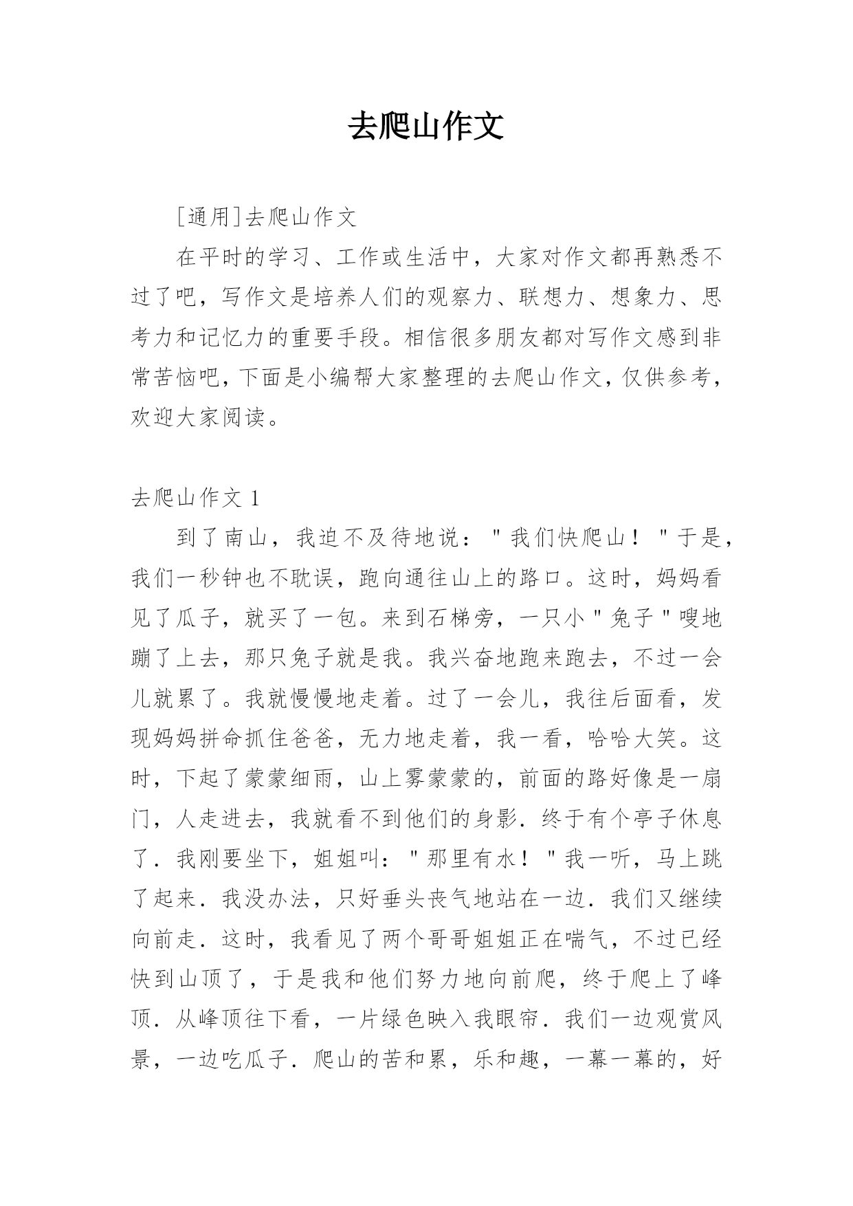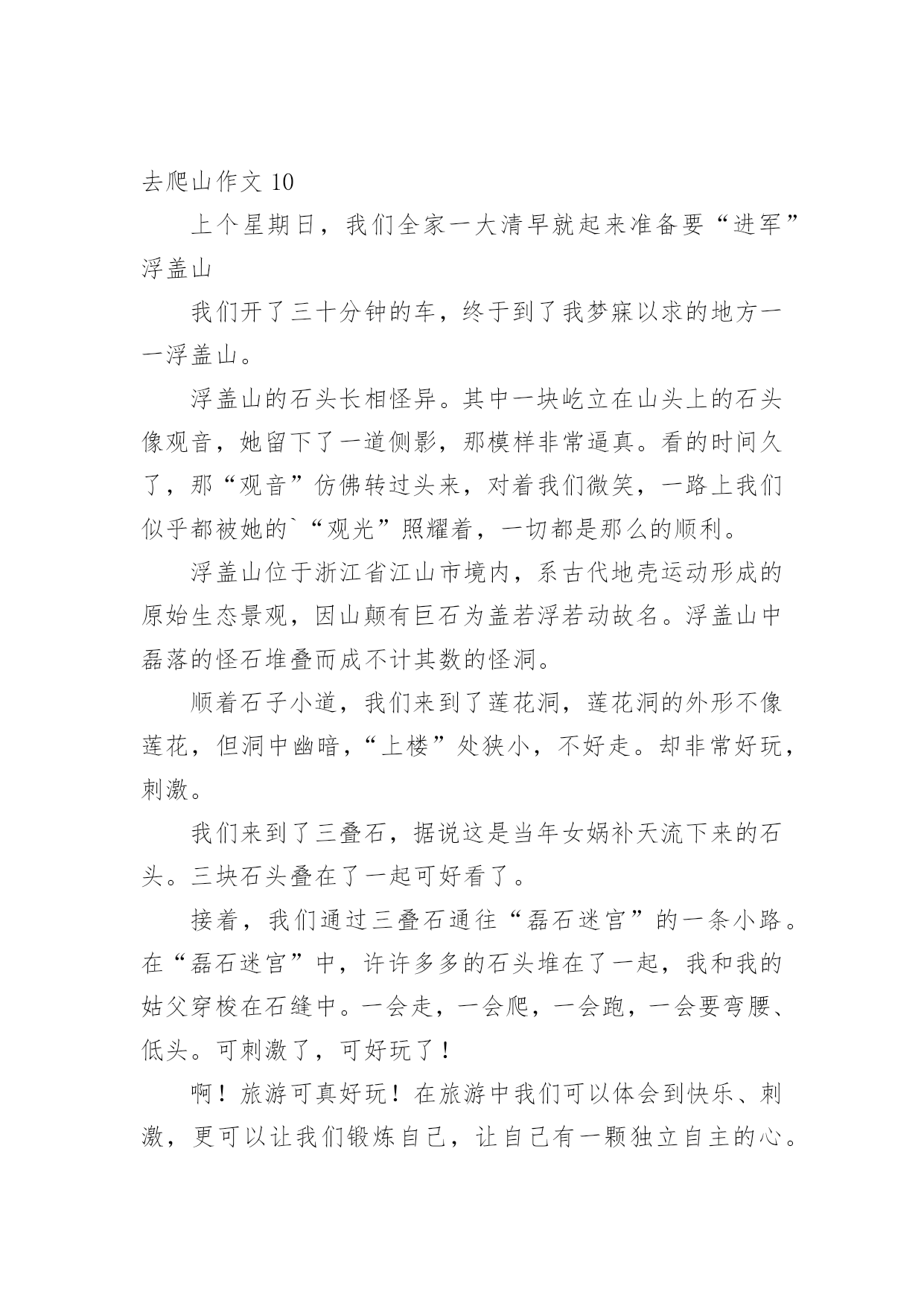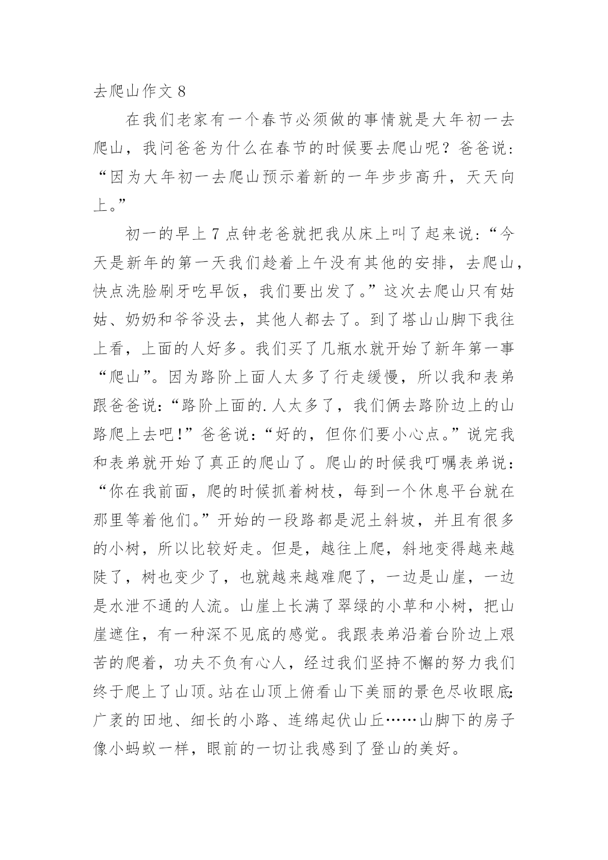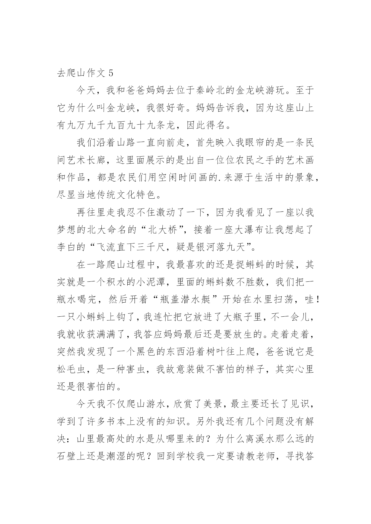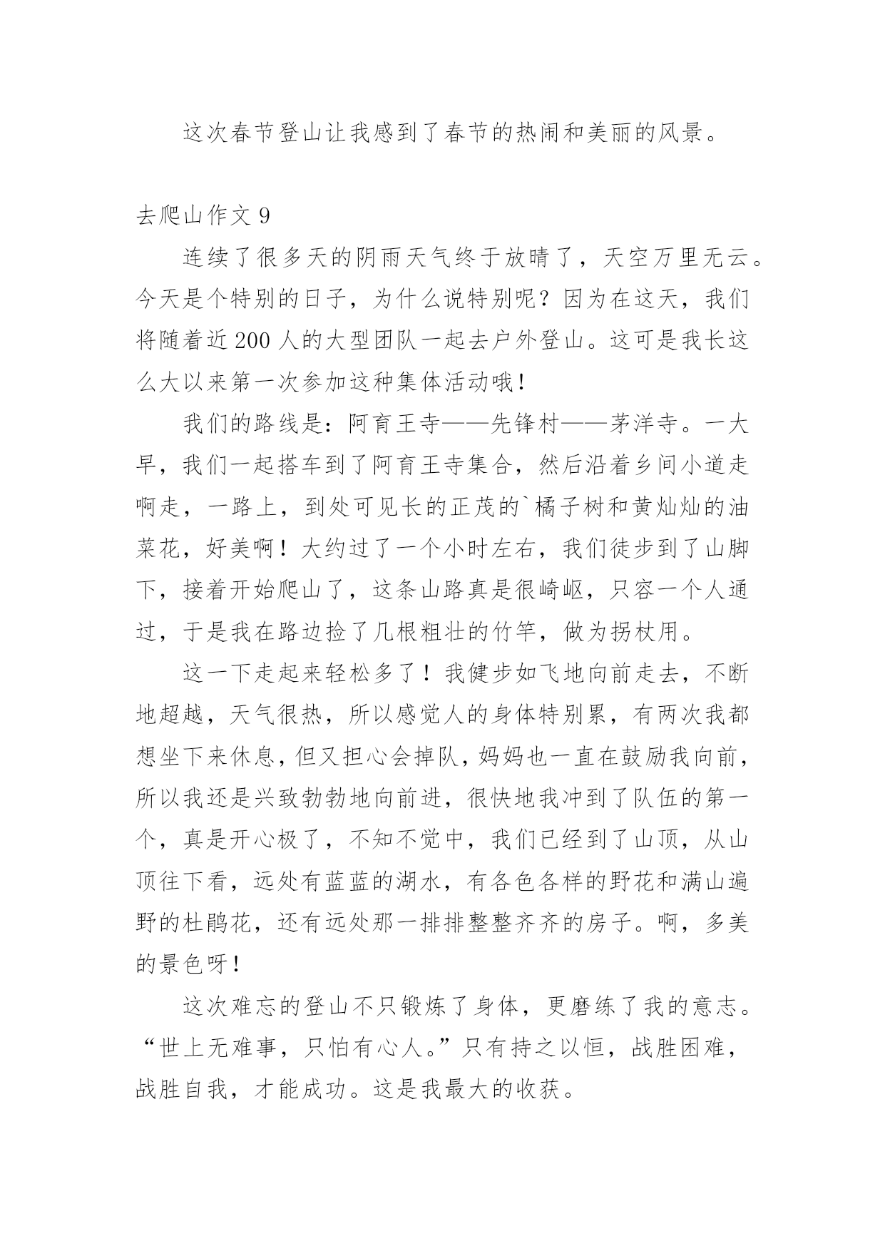 去爬山作文[通用]去爬山作文在平时的学习、工作或生活中,大家对作文都再熟悉不过了吧,写作文是培养人们的观察力、联想力、想象力、思考力和记忆力的重要手段。相信很多朋友都对写作文感到非常苦恼吧,下面是小编帮大家整理的去爬山作文,仅供参考,欢迎大家阅读。去爬山作文1到了南山,我迫不及待地说:"我们快爬山!"于是,我们一秒钟也不耽误,跑向通往山上的路口。这时,妈妈看见了瓜子,就买了一包。来到石梯旁,一只小"兔子"嗖地蹦了上去,那只兔子就是我。我兴奋地跑来跑去,不过一会儿就累了。我就慢慢地走着。过了一会儿,我往后面看,发现妈妈拼命抓住爸爸,无力地走着,我一看,哈哈大笑。这时,下起了蒙蒙细雨,山上雾蒙蒙的,前面的路好像是一扇门,人走进去,我就看不到他们的身影.终于有个亭子休息了.我刚要坐下,姐姐叫:"那里有水!"我一听,马上跳了起来.我没办法,只好垂头丧气地站在一边.我们又继续向前走.这时,我看见了两个哥哥姐姐正在喘气,不过已经快到山顶了,于是我和他们努力地向前爬,终于爬上了峰顶.从峰顶往下看,一片绿色映入我眼帘.我们一边观赏风景,一边吃瓜子.爬山的苦和累,乐和趣,一幕一幕的,好像在播幻灯片,闪入我的眼睛里.山的周围包着浓浓的`雾,我好像进入了雾的中央.下山时,我说脚很痛,为了放松我的脚和分散我的注意力,我和妈妈还玩了踢脚下楼梯的游戏.这次爬山真有趣,我下次要把我的天冬草带来种,让南山的山上变成绿色世界!去爬山作文2今天阳光明媚,蔚蓝的天空中朵朵白云慢慢地飘动着,云宝宝正跟我打招呼呢!我早早起了床,全家决定去爬山。我兴奋极了,高兴得一蹦三尺高,一路上,我们有说有笑。不一会儿,我们就来到白云山的山脚下。爬山的人络绎不绝,有的人往下走;有的人正走向石阶,似乎很轻松;还有的人累得筋疲力尽……长长的山道向一条长龙似的欢迎我们。可是我们刚刚到半山腰就累得气喘吁吁了。这时,我好像听到有人在我耳边说:“瑶瑶,是不是爬累了?坐在我背上我”飞“你上去。”我抬头看看山顶的凉亭,似乎听懂了长龙爷爷的话,像快乐的小鸟一样飞快地向前冲。终于,到达了山顶。山顶上一阵微风吹来,让我们都感到非常舒服。又看到这边的老爷爷们整齐地打着太极拳,那边的叔叔阿姨们快乐地跳着健康操,他们的`精神感染了我,似乎一点也不累了。我还玩了许多游戏,比如:荡秋千、跷跷板。树上的小松鼠还跟我玩起捉迷藏的游戏呢!一下蹦到这边,一下蹦到那边,大家都开心极了。啊,今天真是快乐的一天,这真是一个多姿又多彩的季节!去爬山作文3暑假期间,爸爸带我去爬山。我们来到山下,从山下往上看,我不禁打了个冷颤,山又高又陡,一眼望不到顶,我想我肯定爬不到山顶。这时,我看见一位老爷爷,手拄着拐杖,仔细一看,才知道原来他也是来爬山的。老爷爷都这样,我也不落后。最后,我终于鼓起勇气,和爸爸向山顶进军了。快到山腰的时候,我又热又累,不想再向上爬了。可就在这时,我又一次看见了那位老人,只见老爷爷双手拄着拐杖艰难地走着,额头上大滴大滴的汗珠正往下淌着……看到这里,我觉得自己真没用,连个老人家都不如。于是,我上前扶住老爷爷的手,对他说:“老爷爷,我扶您上山吧。”老爷爷说:“你真是个好孩子啊!”爸爸听后,会心地笑了。于是,我们又开始爬山了。大约花了一个小时,我们到了山顶。我和老爷爷还有爸爸都坐在石头上休息。这时,我问老爷爷为什么这么大年纪还爬山,老爷爷笑着说:“虽然累了点,可是既能锻炼身体和意志,又可以在山顶上看风景,还能呼吸新鲜空气,何乐而不为呢?”听着老爷爷的'话,感受着阵阵拂面的凉风,我决定以后做什么事情都要坚持到底,绝不半途而废,要做就要做到最好!去爬山作文4星期日的下午,阳光明媚。于是,喜欢爬山的`爸爸又想带我和妈妈去爬山。因为怕又会下雨,所以我和妈妈都不想去了。但是,爸爸用甜言蜜语来奉劝我和妈妈,还带来了3把伞,说我和妈妈再不去就是温室的花朵。这时,我和妈妈才不情愿地只好随着爸爸走了。但是,到底去哪儿爬山?经过商量,我们决定去羊山石城。一直到了山脚下,我才知道,羊山是一座没有阶梯的山,山上有无数条弯弯曲曲的小路,让我有一种全部走一遍的冲动。我们辛苦地爬了30分钟,却还没到半山腰。突然,我听到许多“咩——”的声音,它让我迫不及待地向山顶爬去。过了好一会儿,我们终于站在山顶上了,放眼望去,是一群山羊津津有味地在悬崖边吃着青草。我真担心它们会掉下去!可是它们依然认真地吃草,一副一点儿也不担心的样子,四脚牢牢地踩在杂草交织的“防护网”上。这时,我情不自禁地想过去抚摸它们,可是,它们一看见我就如同看见了“野狼”一样,撒腿就跑,比兔子还快,我怎么也追不上。黄昏时,有一位黑衣叔叔把羊群赶走了,它们一个个从山顶飞奔到山下,因为经常上山、下山,所以它们的脚下已经踩出了一条小路,这条小路让我想起了一个词语——“羊肠小道”。沿着“羊肠小道”