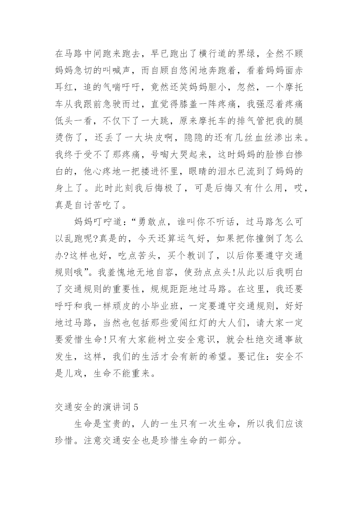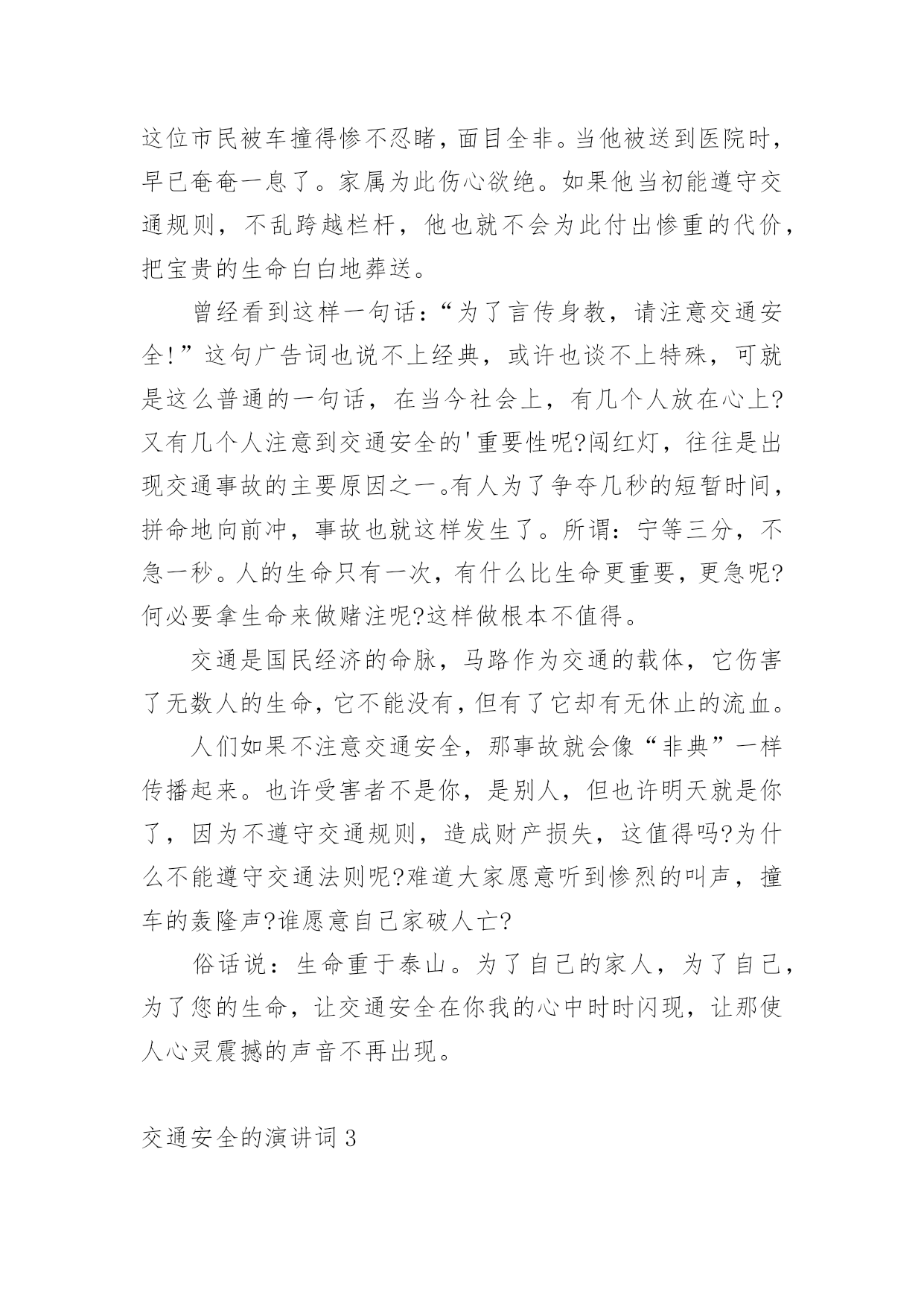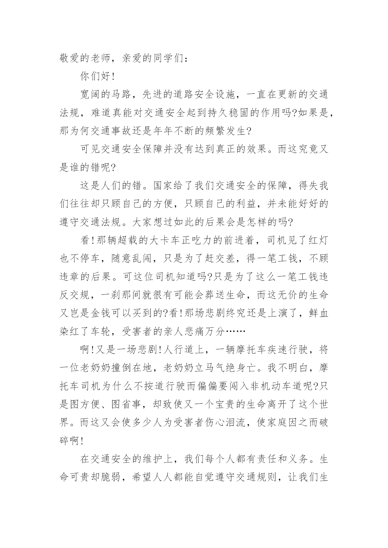 交通安全的演讲词交通安全的演讲词1亲爱的老师、同学们:大家好!大概是我这种迟钝的人也早已意识到了“平安创建”的开始,没有刻意地去想关注,“平安建设”便以渗入生活的一点一滴。对所谓这样的名词总是懵懵懂懂,打着官腔的生硬概念亦总归糊里糊涂。大抵也就囫囵地搪塞过去了,却不想这次动了真格,若是让我仔细的一点儿一点儿细数变化,我倒是讲不大完的,好像也没有再慌慌张张惊恐无措地走夜路,好像一人出行不必惊惶诚恐地害怕哪儿窜出个乱贼来,总归是感觉日子过得宁静安稳了许多。这大抵是最明显的一点了。生命,再熟悉不过的字眼。它如夏花般绚丽。生命之花是刚强的,它让人思索,让人感受,让人倾听,只要有毅力,它能克服任何困难;然而,它又宛如一棵弱不禁风的小草,如此脆弱,稍不留神,它便会从你的指缝中悄然溜走。从前听说过一个故事,一座学校的新校区坐落于郊外,由于缺乏严格的管理,交通秩序异常纷乱,司机超速行驶,学生交通安全意识模糊,在短短的两个月里三个年轻鲜活的生命灰飞烟灭,全校师生陷入了悲痛之中,而受害者的家长更是倍尝生死离别的巨大悲痛和创伤,谁之过?这三起事件引起了上级领导的高度重视,大力投资修建路面设施,给学生安上了一道生命的.防护线。此后,再也没有发生类似事件,每当看到那长长的防护栅栏,每个本校学生都深深地懂得那是用鲜血和生命换来的。为什么只有当事情发生了才想到去修治?防患于未然,它留给我们的不仅仅是思考。“高高兴兴上班来,平平安安回家去”一直以来是许多厂矿企业所倡导的口号,意喻人们能够安全顺利的完成一天的工作,平安的回到家中和家人团聚,同时也表达了各级重视安全、渴望安全的心愿。让我们紧握安全之舟,让安全伴我成长。交通安全的演讲词2亲爱的老师、同学们:大家好!生命是唯一的,是宝贵的,世界因为有了生命而变得精彩。您的生命,您珍惜吗?要想生命得到保障,请您遵守交通规则。交通事故时时刻刻都会发生,它像颗威力十足的炸弹,一时大意,这颗埋伏在我们生活中的炸弹就会爆炸,炸得家庭破碎,炸得人心悲苦。记得我曾经在报纸上看到这样一则报道,我当时惊呆了。一位市民,因为要赶着去上班,而他必须绕过栏杆才能坐车,无奈之下,他情非得已地跨过栏杆。这时,突然,一辆卡车直奔而来,在这千钧一发的时候,只听“啊”的一声尖叫,这位市民被车撞得惨不忍睹,面目全非。当他被送到医院时,早已奄奄一息了。家属为此伤心欲绝。如果他当初能遵守交通规则,不乱跨越栏杆,他也就不会为此付出惨重的代价,把宝贵的生命白白地葬送。曾经看到这样一句话:“为了言传身教,请注意交通安全!”这句广告词也说不上经典,或许也谈不上特殊,可就是这么普通的一句话,在当今社会上,有几个人放在心上?又有几个人注意到交通安全的'重要性呢?闯红灯,往往是出现交通事故的主要原因之一。有人为了争夺几秒的短暂时间,拼命地向前冲,事故也就这样发生了。所谓:宁等三分,不急一秒。人的生命只有一次,有什么比生命更重要,更急呢?何必要拿生命来做赌注呢?这样做根本不值得。交通是国民经济的命脉,马路作为交通的载体,它伤害了无数人的生命,它不能没有,但有了它却有无休止的流血。人们如果不注意交通安全,那事故就会像“非典”一样传播起来。也许受害者不是你,是别人,但也许明天就是你了,因为不遵守交通规则,造成财产损失,这值得吗?为什么不能遵守交通法则呢?难道大家愿意听到惨烈的叫声,撞车的轰隆声?谁愿意自己家破人亡?俗话说:生命重于泰山。为了自己的家人,为了自己,为了您的生命,让交通安全在你我的心中时时闪现,让那使人心灵震撼的声音不再出现。交通安全的演讲词3敬爱的老师,亲爱的同学们:你们好!宽阔的马路,先进的道路安全设施,一直在更新的交通法规,难道真能对交通安全起到持久稳固的作用吗?如果是,那为何交通事故还是年年不断的频繁发生?可见交通安全保障并没有达到真正的效果。而这究竟又是谁的错呢?这是人们的错。国家给了我们交通安全的保障,得失我们往往却只顾自己的方便,只顾自己的利益,并未能好好的遵守交通法规。大家想过如此的后果会是怎样的吗?看!那辆超载的大卡车正吃力的前进着,司机见了红灯也不停车,随意乱闯,只是为了赶交差,得一笔工钱,不顾违章的后果。可这位司机知道吗?只是为了这么一笔工钱违反交规,一刹那间就很有可能会葬送生命,而这无价的生命又岂是金钱可以买到的?看!那场悲剧终究还是上演了,鲜血染红了车轮,受害者的亲人悲痛万分……啊!又是一场悲剧!人行道上,一辆摩托车疾速行驶,将一位老奶奶撞倒在地,老奶奶立马气绝身亡。我不明白,摩托车司机为什么不按道行驶而偏偏要闯入非机动车道呢?只是图方便、图省事,却致使又一个宝贵的生命离开了这个世界。而这又会使多少人为受害者伤心泪流,使家庭因之而破碎啊!在交通安全的维护上,我们每个人都有责任和义务。生命可贵却脆弱,希望人人都能自觉遵守交通规则,让我