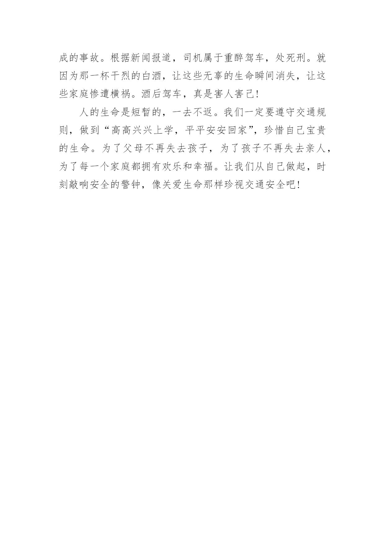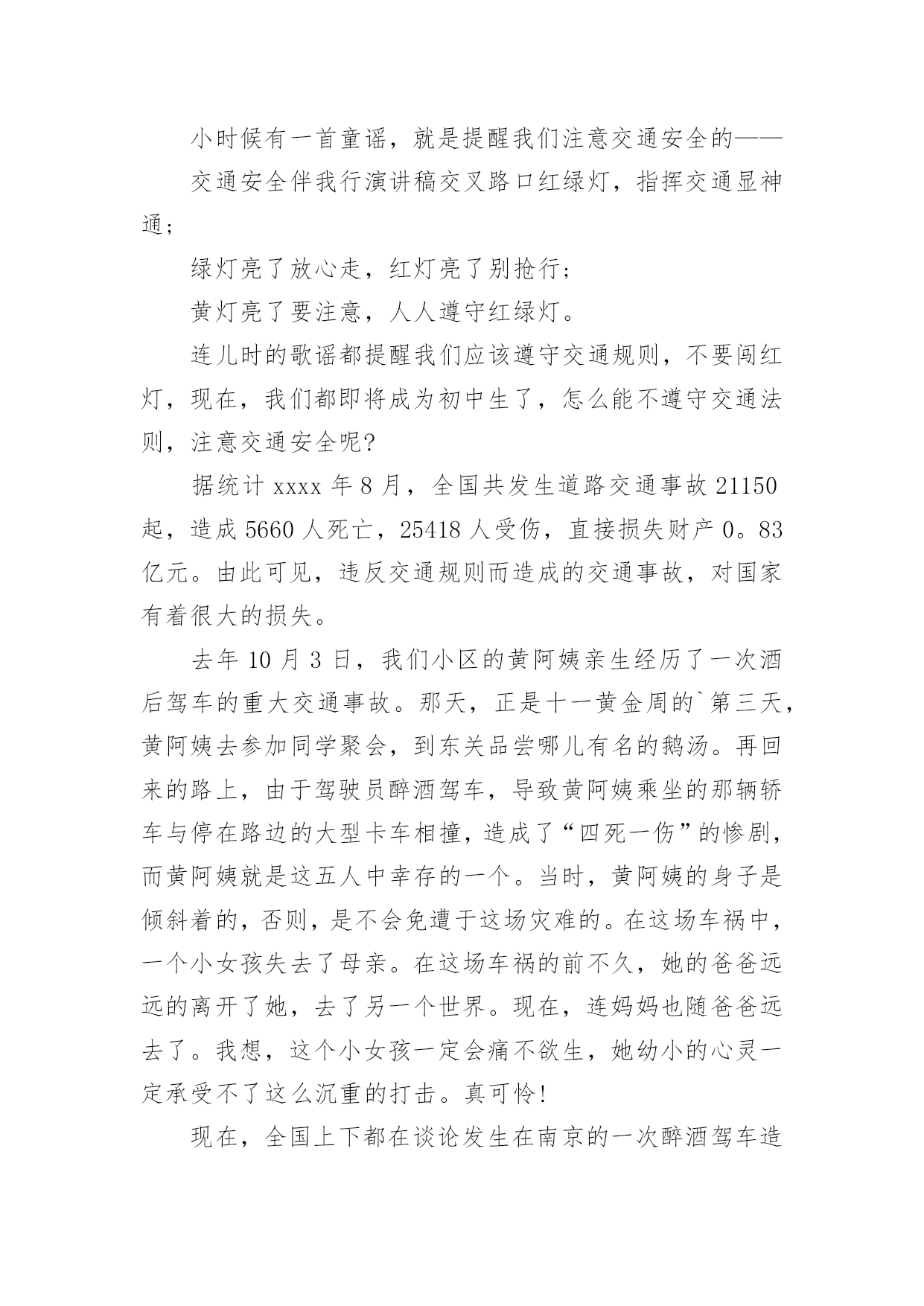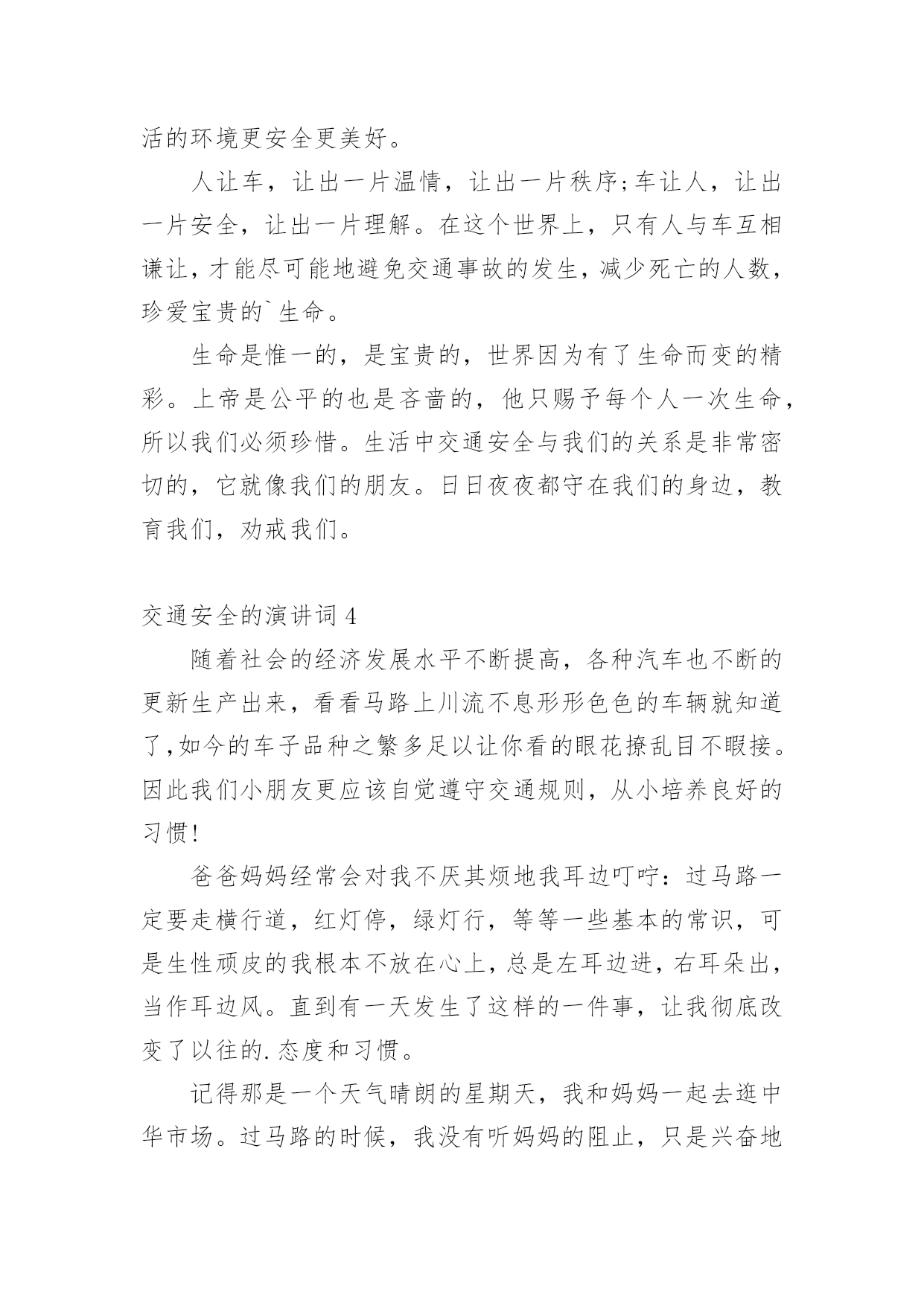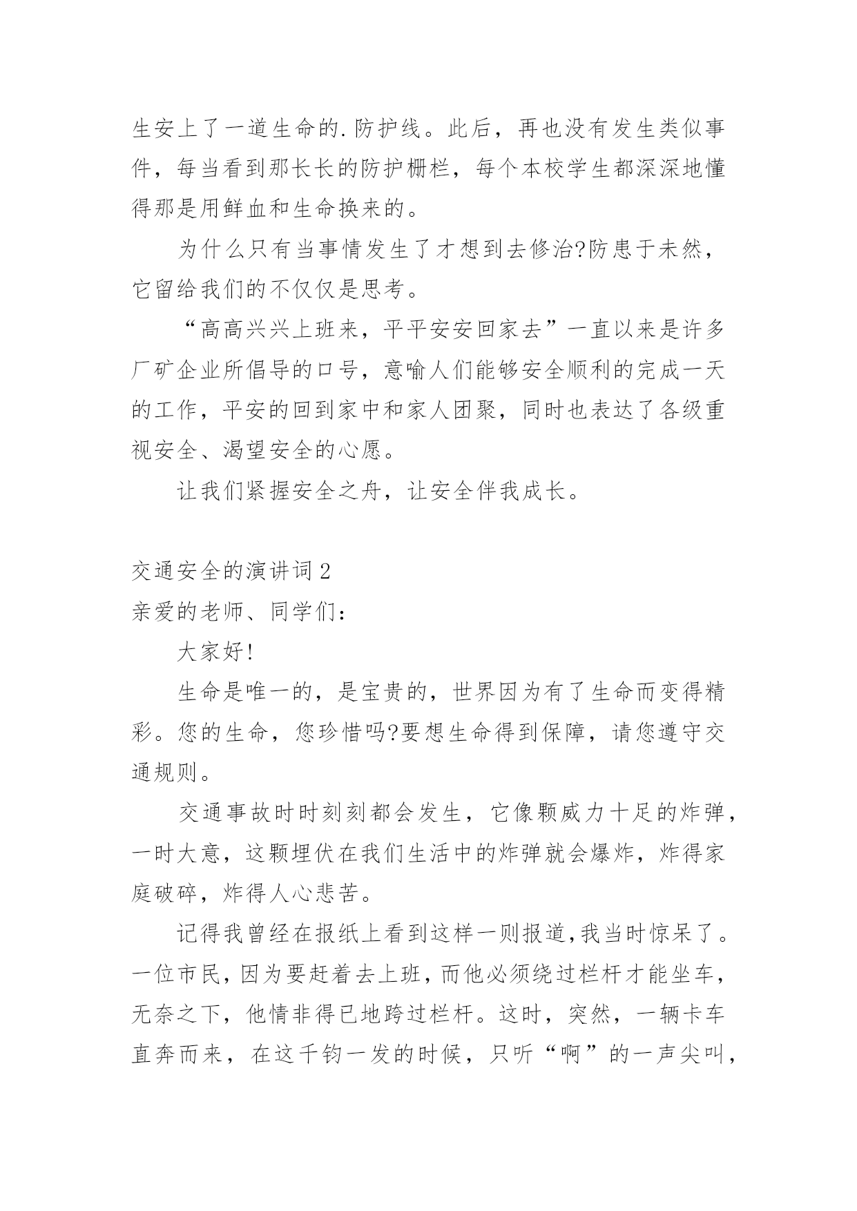 交通安全的演讲词交通安全的演讲词1亲爱的老师、同学们:大家好!大概是我这种迟钝的人也早已意识到了“平安创建”的开始,没有刻意地去想关注,“平安建设”便以渗入生活的一点一滴。对所谓这样的名词总是懵懵懂懂,打着官腔的生硬概念亦总归糊里糊涂。大抵也就囫囵地搪塞过去了,却不想这次动了真格,若是让我仔细的一点儿一点儿细数变化,我倒是讲不大完的,好像也没有再慌慌张张惊恐无措地走夜路,好像一人出行不必惊惶诚恐地害怕哪儿窜出个乱贼来,总归是感觉日子过得宁静安稳了许多。这大抵是最明显的一点了。生命,再熟悉不过的字眼。它如夏花般绚丽。生命之花是刚强的,它让人思索,让人感受,让人倾听,只要有毅力,它能克服任何困难;然而,它又宛如一棵弱不禁风的小草,如此脆弱,稍不留神,它便会从你的指缝中悄然溜走。从前听说过一个故事,一座学校的新校区坐落于郊外,由于缺乏严格的管理,交通秩序异常纷乱,司机超速行驶,学生交通安全意识模糊,在短短的两个月里三个年轻鲜活的生命灰飞烟灭,全校师生陷入了悲痛之中,而受害者的家长更是倍尝生死离别的巨大悲痛和创伤,谁之过?这三起事件引起了上级领导的高度重视,大力投资修建路面设施,给学生安上了一道生命的.防护线。此后,再也没有发生类似事件,每当看到那长长的防护栅栏,每个本校学生都深深地懂得那是用鲜血和生命换来的。为什么只有当事情发生了才想到去修治?防患于未然,它留给我们的不仅仅是思考。“高高兴兴上班来,平平安安回家去”一直以来是许多厂矿企业所倡导的口号,意喻人们能够安全顺利的完成一天的工作,平安的回到家中和家人团聚,同时也表达了各级重视安全、渴望安全的心愿。让我们紧握安全之舟,让安全伴我成长。交通安全的演讲词2亲爱的老师、同学们:大家好!生命是唯一的,是宝贵的,世界因为有了生命而变得精彩。您的生命,您珍惜吗?要想生命得到保障,请您遵守交通规则。交通事故时时刻刻都会发生,它像颗威力十足的炸弹,一时大意,这颗埋伏在我们生活中的炸弹就会爆炸,炸得家庭破碎,炸得人心悲苦。记得我曾经在报纸上看到这样一则报道,我当时惊呆了。一位市民,因为要赶着去上班,而他必须绕过栏杆才能坐车,无奈之下,他情非得已地跨过栏杆。这时,突然,一辆卡车直奔而来,在这千钧一发的时候,只听“啊”的一声尖叫,这位市民被车撞得惨不忍睹,面目全非。当他被送到医院时,早已奄奄一息了。家属为此伤心欲绝。如果他当初能遵守交通规则,不乱跨越栏杆,他也就不会为此付出惨重的代价,把宝贵的生命白白地葬送。曾经看到这样一句话:“为了言传身教,请注意交通安全!”这句广告词也说不上经典,或许也谈不上特殊,可就是这么普通的一句话,在当今社会上,有几个人放在心上?又有几个人注意到交通安全的'重要性呢?闯红灯,往往是出现交通事故的主要原因之一。有人为了争夺几秒的短暂时间,拼命地向前冲,事故也就这样发生了。所谓:宁等三分,不急一秒。人的生命只有一次,有什么比生命更重要,更急呢?何必要拿生命来做赌注呢?这样做根本不值得。交通是国民经济的命脉,马路作为交通的载体,它伤害了无数人的生命,它不能没有,但有了它却有无休止的流血。人们如果不注意交通安全,那事故就会像“非典”一样传播起来。也许受害者不是你,是别人,但也许明天就是你了,因为不遵守交通规则,造成财产损失,这值得吗?为什么不能遵守交通法则呢?难道大家愿意听到惨烈的叫声,撞车的轰隆声?谁愿意自己家破人亡?俗话说:生命重于泰山。为了自己的家人,为了自己,为了您的生命,让交通安全在你我的心中时时闪现,让那使人心灵震撼的声音不再出现。交通安全的演讲词3敬爱的老师,亲爱的同学们:你们好!宽阔的马路,先进的道路安全设施,一直在更新的交通法规,难道真能对交通安全起到持久稳固的作用吗?如果是,那为何交通事故还是年年不断的频繁发生?可见交通安全保障并没有达到真正的效果。而这究竟又是谁的错呢?这是人们的错。国家给了我们交通安全的保障,得失我们往往却只顾自己的方便,只顾自己的利益,并未能好好的遵守交通法规。大家想过如此的后果会是怎样的吗?看!那辆超载的大卡车正吃力的前进着,司机见了红灯也不停车,随意乱闯,只是为了赶交差,得一笔工钱,不顾违章的后果。可这位司机知道吗?只是为了这么一笔工钱违反交规,一刹那间就很有可能会葬送生命,而这无价的生命又岂是金钱可以买到的?看!那场悲剧终究还是上演了,鲜血染红了车轮,受害者的亲人悲痛万分……啊!又是一场悲剧!人行道上,一辆摩托车疾速行驶,将一位老奶奶撞倒在地,老奶奶立马气绝身亡。我不明白,摩托车司机为什么不按道行驶而偏偏要闯入非机动车道呢?只是图方便、图省事,却致使又一个宝贵的生命离开了这个世界。而这又会使多少人为受害者伤心泪流,使家庭因之而破碎啊!在交通安全的维护上,我们每个人都有责任和义务。生命可贵却脆弱,希望人人都能自觉遵守交通规则,让我