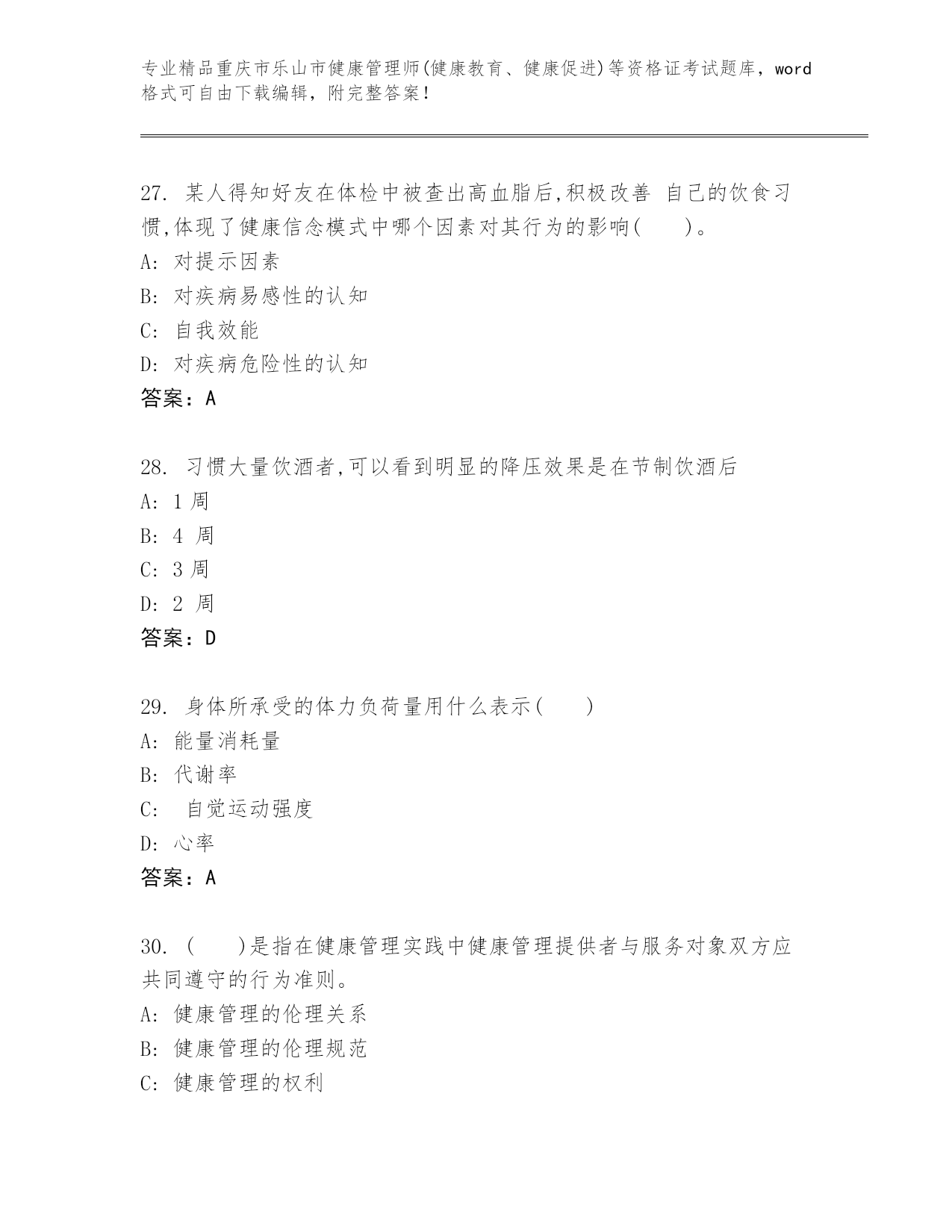 最新重庆市乐山市健康管理师(健康教育、健康促进)等资格证考试及答案【名师系列】.docx