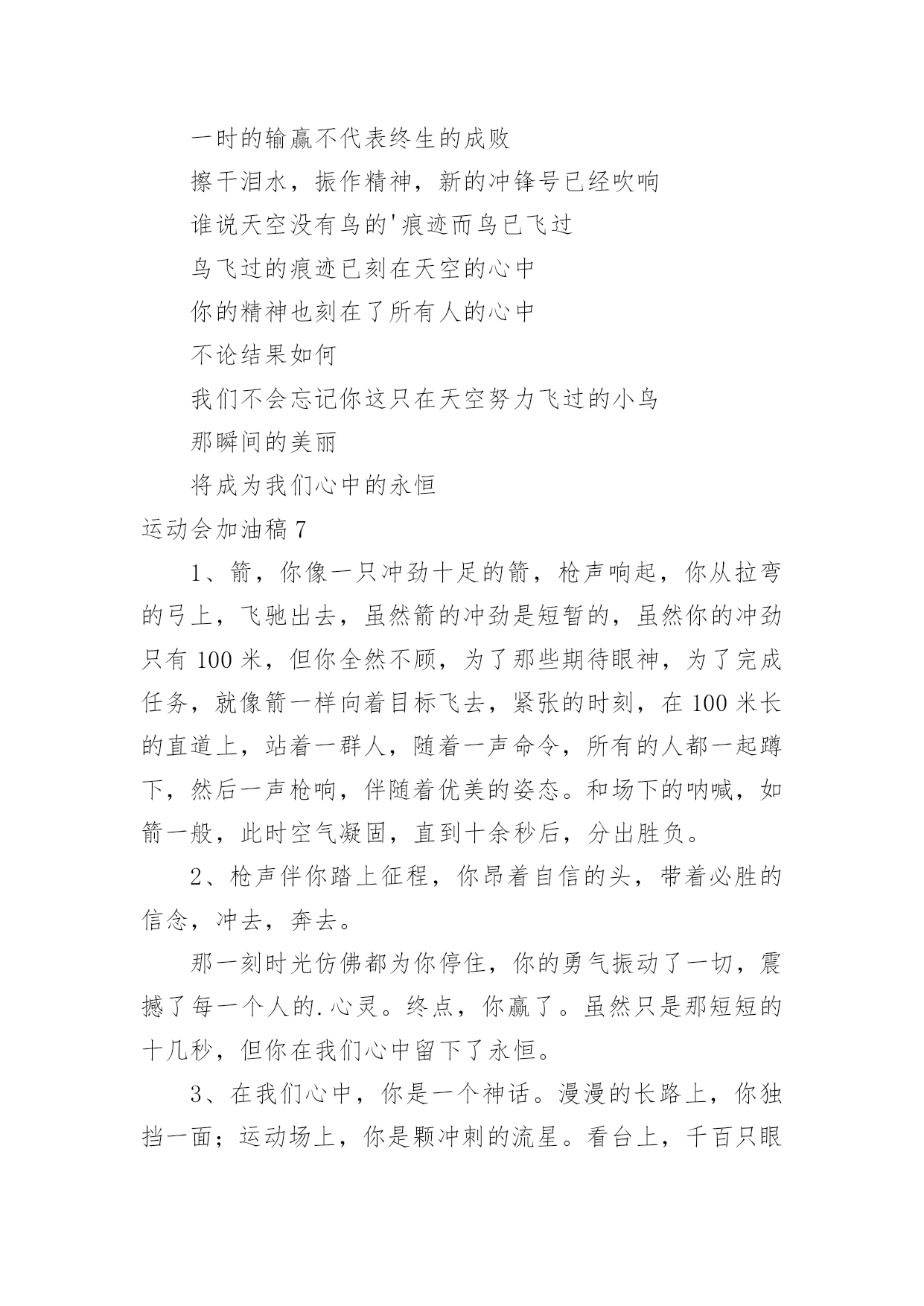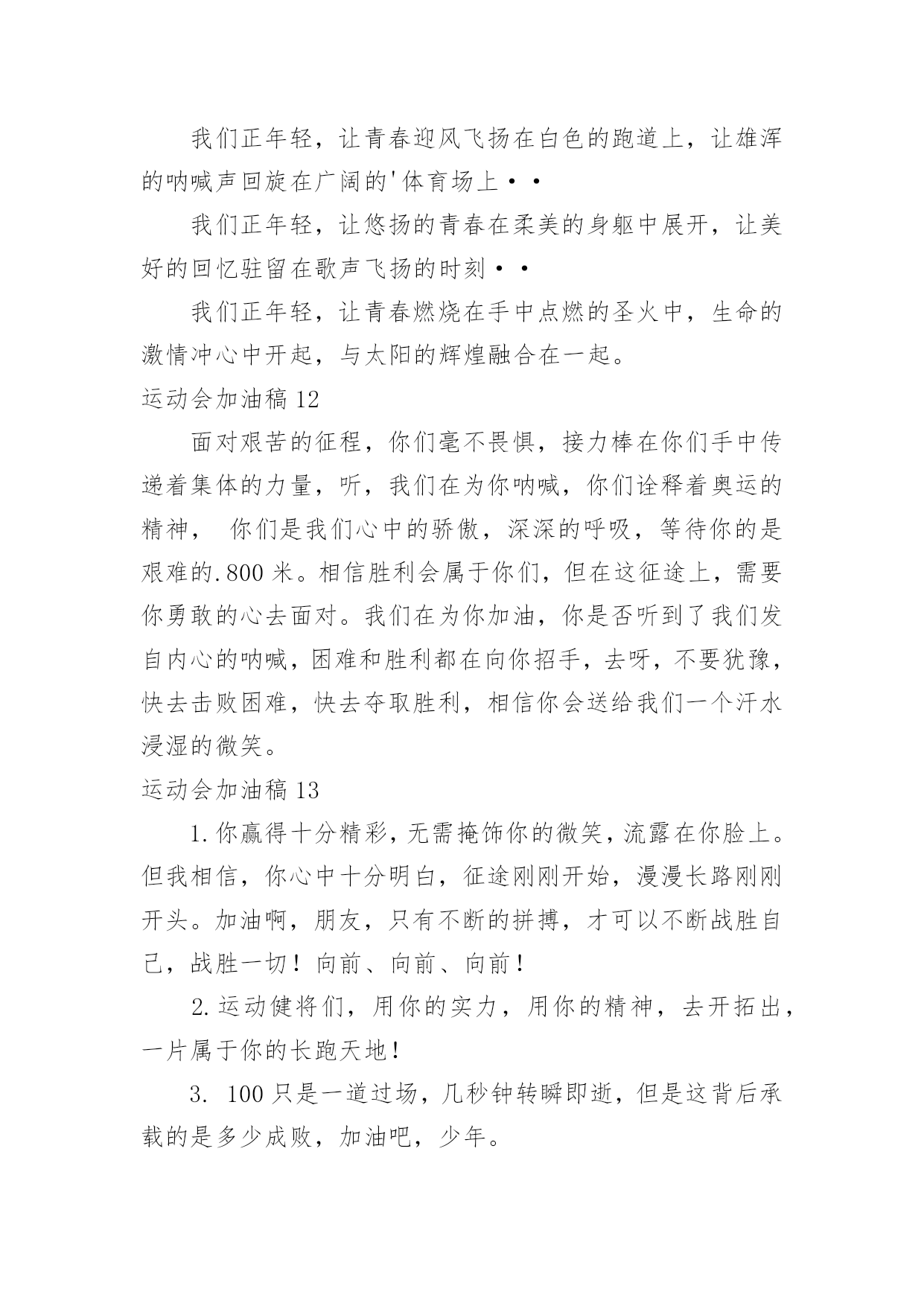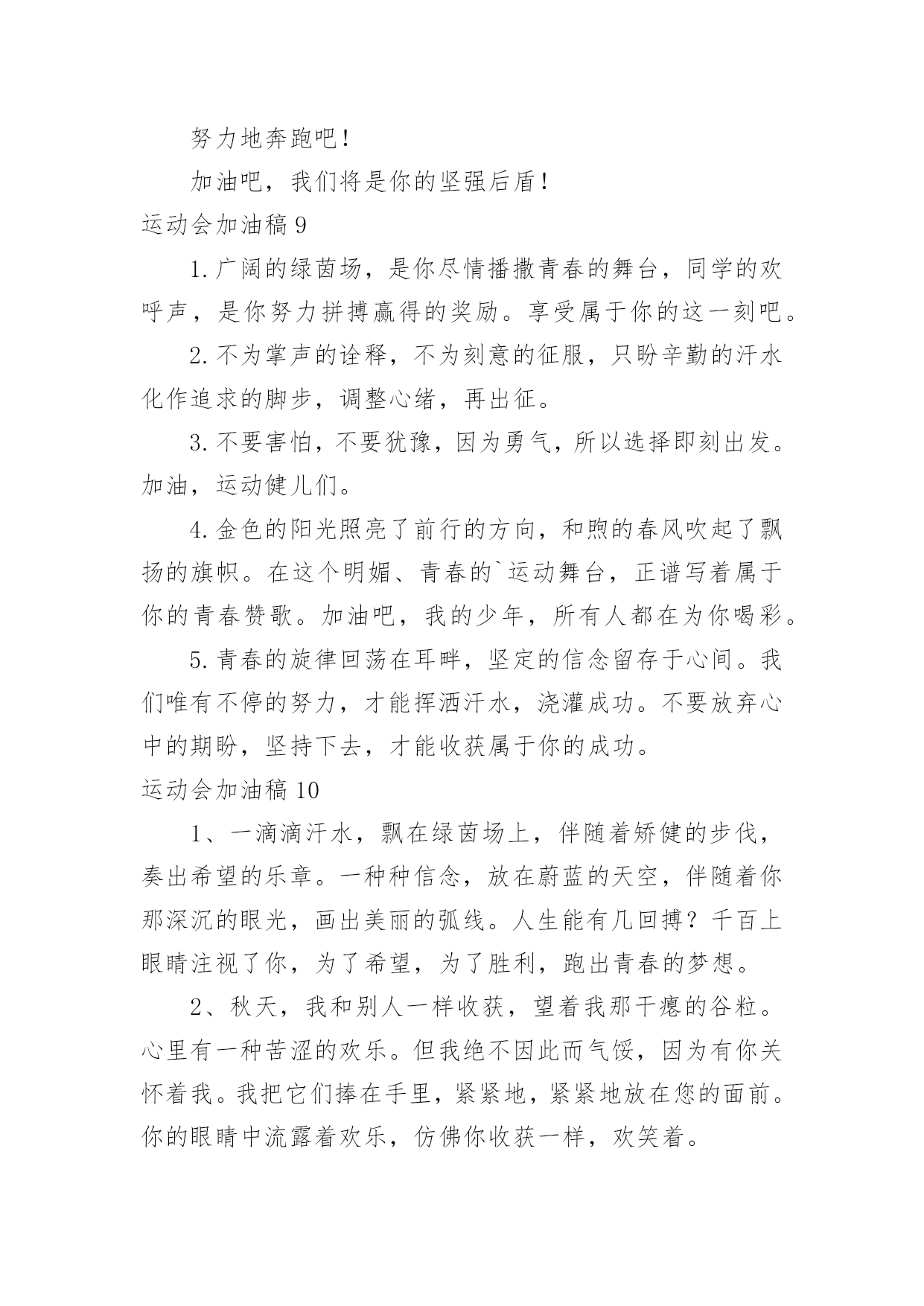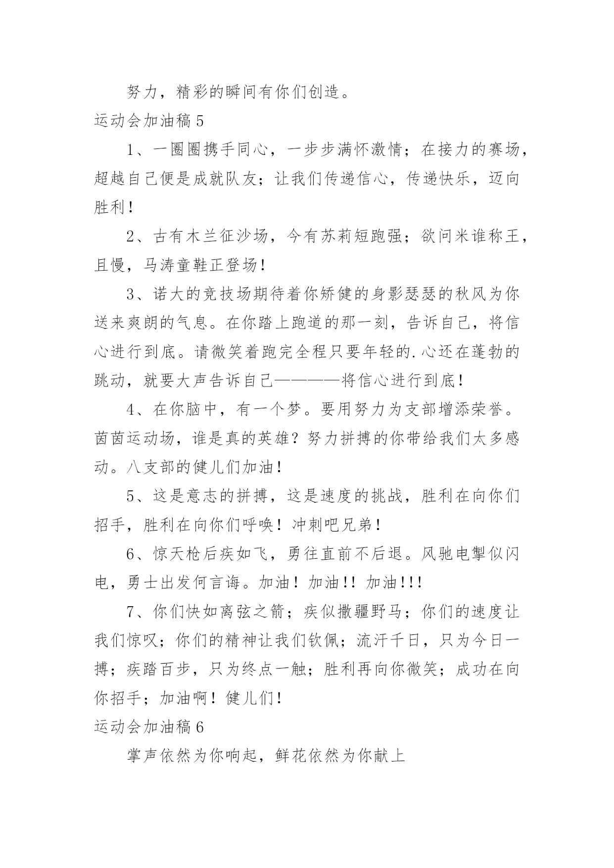 运动会加油稿运动会加油稿[合集15篇]在生活中,需要使用加油稿的情境愈发增多,加油稿是一种对他人有正向激励作用的文稿。相信许多人会觉得加油稿很难写吧,以下是小编为大家收集的运动会加油稿,希望对大家有所帮助。运动会加油稿1是种子就该有绿色的希望,是种子就该有金色的梦想,不要躺在封闭的暖房,怕什么秋日薄薄的风霜,既然已走上了运动场,心里就不要多想,跑道已洒满阳光,不要羞涩、不要紧张,听秋雁在空中为你歌唱,快去拾取片片金黄,充满信心,就有希望。一滴滴汗水,飘洒在绿茵场上,伴随着矫健的步伐,奏出希望的乐章。一种种信念,放在蔚蓝的天空,伴随着你那深沉的.眼光,画出美丽的弧线。人生能有几回搏?千百双眼睛注视着你,为了希望、为了胜利,跑出青春的梦想。磨炼的是非凡的毅力,较量的是超常的体力,拼搏的是出类拔萃的耐力。把长长的跑道跑成一段漫漫的征途,听!呼啸的风在为你喝彩,看!猎猎的彩旗在为你加油,加油吧!为了到达终点时那一刻的辉煌!运动会加油稿2漫漫征途,加油吧!运动健儿们。不要畏惧对手的强大,你的对手只有你自己。800米算不得什么,付出的.泪水就要得到回报。看,秋风在为你喝彩,和煦的阳光在为你加油。冲吧,运动健儿们。你所有的朋友在为你呐喊。勇敢的冲吧,勇士们。不要畏惧对手的强大。你的对手只有自己。勇敢的冲吧。800米算不得什么。付出的汗水就要得到回报。胜利的泪水就要顺颊而下!也许你心里忐忑不安。我们的心里早已热血沸腾。运动会加油稿3雷鼓阵阵旌旗展,宿将新英舞蹁跹,斩关夺隘夸佼子,捧冠膺奖誉人前。二次创业无言苦,赤心拳拳不畏难,他年若遂凌云志,敢教日月换新天。泥泞的路走过无数累了,告诉自己:快了,再坚持一会儿身上的伤流出血来疼了,告诉自己:别哭,会好的。摔到了,告诉自己:快爬起来,世上很少有坦途深深的呼吸,等待你的是艰难的5000米。相信胜利会属于你们。但在这征途上,需要你用勇敢的心去面对。我们在为你加油,你是否听到了我们发自心中的呐喊?困难和胜利都在向你招手,去呀,快去呀,不要犹豫。快去击败困难、快去夺取胜利!看迎风的`彩旗相正为你欢呼,呼呼的风声正为你加油,相信你会送给我们一个汗水浸湿的微笑!也许你并没有看到成功像你挥手,但你已奋斗。拼搏过,相信自己,力量就在心中。风雨中洒脱你的激情,阳光下释放你的希冀,没有你过去的过去,只有把握现在,没有你明天的明天,只有眼前的路。逝去的已经逝去,要明白,今天的才是真正的你,用你的真实,你的所有挥洒出心中的希望。。是种子就该有绿色的希望,是种子就该有金色的梦想,不要躺在封闭的暖房,怕什么秋日薄薄的风霜,既然已走上了运动场,心里就不要多想,跑道已洒满阳光,不要羞涩、不要紧张,听秋雁在空中为你歌唱,快去拾取片片金黄。运动会加油稿4黎明的曙光,照耀着神州。今天,我们修到了这熟悉的气息,熟悉的运动场记录了多少运动健儿的矫健身影,此刻又将留下多少华丽的瞬间。声声助威,把运动氛围装点。激昂的呐喊声是他们发自内心的欢呼,是的,胜利属于强者,属于在赛场上奋力拼搏,挥汗奔跑的'径赛运动员,也属于那放手一掷的田赛运动员。努力,精彩的瞬间有你们创造。运动会加油稿51、一圈圈携手同心,一步步满怀激情;在接力的赛场,超越自己便是成就队友;让我们传递信心,传递快乐,迈向胜利!2、古有木兰征沙场,今有苏莉短跑强;欲问米谁称王,且慢,马涛童鞋正登场!3、诺大的竞技场期待着你矫健的身影瑟瑟的秋风为你送来爽朗的气息。在你踏上跑道的那一刻,告诉自己,将信心进行到底。请微笑着跑完全程只要年轻的.心还在蓬勃的跳动,就要大声告诉自己————将信心进行到底!4、在你脑中,有一个梦。要用努力为支部增添荣誉。茵茵运动场,谁是真的英雄?努力拼搏的你带给我们太多感动。八支部的健儿们加油!5、这是意志的拼搏,这是速度的挑战,胜利在向你们招手,胜利在向你们呼唤!冲刺吧兄弟!6、惊天枪后疾如飞,勇往直前不后退。风驰电掣似闪电,勇士出发何言诲。加油!加油!!加油!!!7、你们快如离弦之箭;疾似撒疆野马;你们的速度让我们惊叹;你们的精神让我们钦佩;流汗千日,只为今日一搏;疾踏百步,只为终点一触;胜利再向你微笑;成功在向你招手;加油啊!健儿们!运动会加油稿6掌声依然为你响起,鲜花依然为你献上一时的输赢不代表终生的成败擦干泪水,振作精神,新的冲锋号已经吹响谁说天空没有鸟的'痕迹而鸟已飞过鸟飞过的痕迹已刻在天空的心中你的精神也刻在了所有人的心中不论结果如何我们不会忘记你这只在天空努力飞过的小鸟那瞬间的美丽将成为我们心中的永恒运动会加油稿71、箭,你像一只冲劲十足的箭,枪声响起,你从拉弯的弓上,飞驰出去,虽然箭的冲劲是短暂的,虽然你的冲劲只有100米,但你全然不顾,为了那些期待眼神,为了完成任务,就像箭一样向着目标飞去,紧张的时刻,在100米长的直道上,站着一群人,随着一