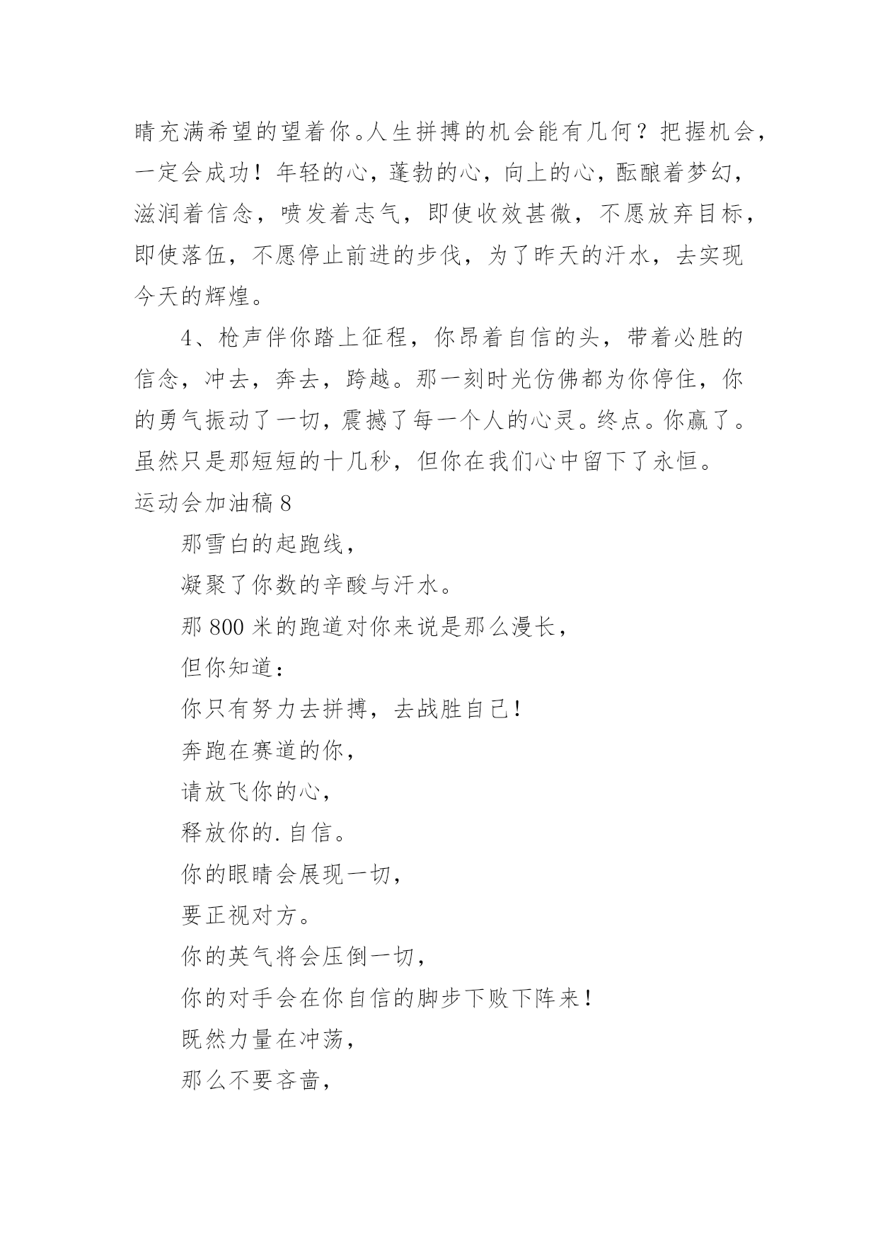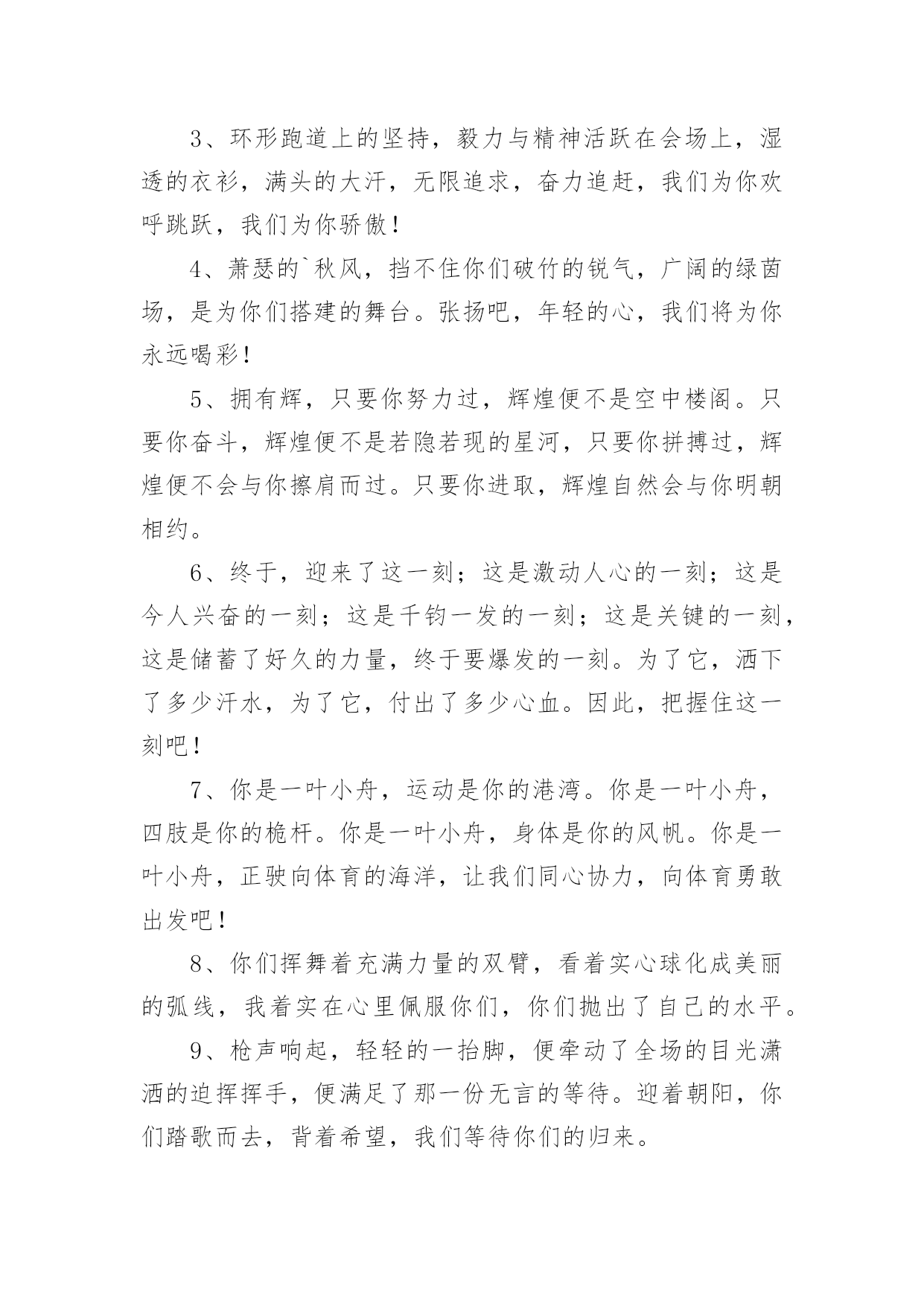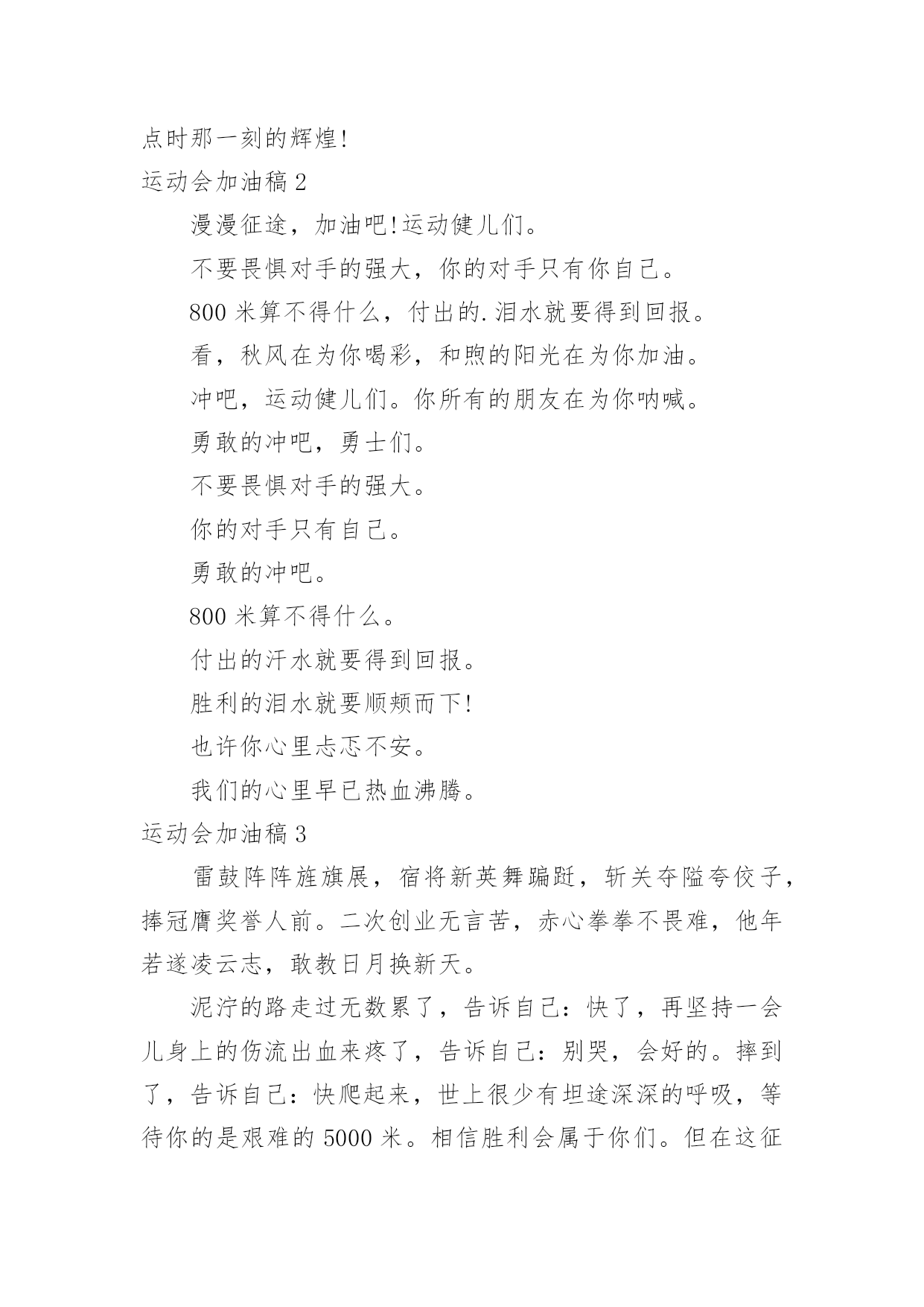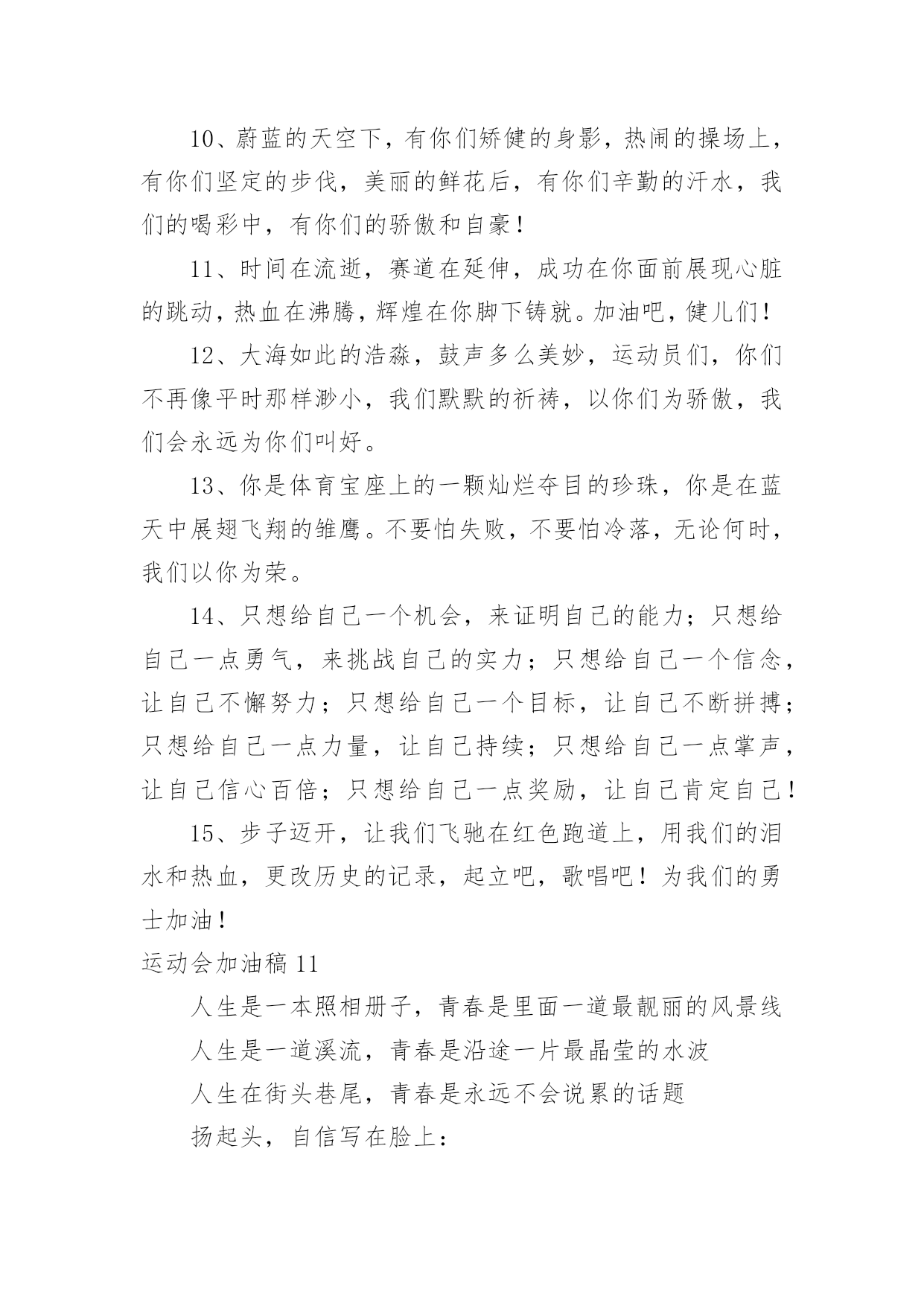 运动会加油稿运动会加油稿[合集15篇]在生活中,需要使用加油稿的情境愈发增多,加油稿是一种对他人有正向激励作用的文稿。相信许多人会觉得加油稿很难写吧,以下是小编为大家收集的运动会加油稿,希望对大家有所帮助。运动会加油稿1是种子就该有绿色的希望,是种子就该有金色的梦想,不要躺在封闭的暖房,怕什么秋日薄薄的风霜,既然已走上了运动场,心里就不要多想,跑道已洒满阳光,不要羞涩、不要紧张,听秋雁在空中为你歌唱,快去拾取片片金黄,充满信心,就有希望。一滴滴汗水,飘洒在绿茵场上,伴随着矫健的步伐,奏出希望的乐章。一种种信念,放在蔚蓝的天空,伴随着你那深沉的.眼光,画出美丽的弧线。人生能有几回搏?千百双眼睛注视着你,为了希望、为了胜利,跑出青春的梦想。磨炼的是非凡的毅力,较量的是超常的体力,拼搏的是出类拔萃的耐力。把长长的跑道跑成一段漫漫的征途,听!呼啸的风在为你喝彩,看!猎猎的彩旗在为你加油,加油吧!为了到达终点时那一刻的辉煌!运动会加油稿2漫漫征途,加油吧!运动健儿们。不要畏惧对手的强大,你的对手只有你自己。800米算不得什么,付出的.泪水就要得到回报。看,秋风在为你喝彩,和煦的阳光在为你加油。冲吧,运动健儿们。你所有的朋友在为你呐喊。勇敢的冲吧,勇士们。不要畏惧对手的强大。你的对手只有自己。勇敢的冲吧。800米算不得什么。付出的汗水就要得到回报。胜利的泪水就要顺颊而下!也许你心里忐忑不安。我们的心里早已热血沸腾。运动会加油稿3雷鼓阵阵旌旗展,宿将新英舞蹁跹,斩关夺隘夸佼子,捧冠膺奖誉人前。二次创业无言苦,赤心拳拳不畏难,他年若遂凌云志,敢教日月换新天。泥泞的路走过无数累了,告诉自己:快了,再坚持一会儿身上的伤流出血来疼了,告诉自己:别哭,会好的。摔到了,告诉自己:快爬起来,世上很少有坦途深深的呼吸,等待你的是艰难的5000米。相信胜利会属于你们。但在这征途上,需要你用勇敢的心去面对。我们在为你加油,你是否听到了我们发自心中的呐喊?困难和胜利都在向你招手,去呀,快去呀,不要犹豫。快去击败困难、快去夺取胜利!看迎风的`彩旗相正为你欢呼,呼呼的风声正为你加油,相信你会送给我们一个汗水浸湿的微笑!也许你并没有看到成功像你挥手,但你已奋斗。拼搏过,相信自己,力量就在心中。风雨中洒脱你的激情,阳光下释放你的希冀,没有你过去的过去,只有把握现在,没有你明天的明天,只有眼前的路。逝去的已经逝去,要明白,今天的才是真正的你,用你的真实,你的所有挥洒出心中的希望。。是种子就该有绿色的希望,是种子就该有金色的梦想,不要躺在封闭的暖房,怕什么秋日薄薄的风霜,既然已走上了运动场,心里就不要多想,跑道已洒满阳光,不要羞涩、不要紧张,听秋雁在空中为你歌唱,快去拾取片片金黄。运动会加油稿4黎明的曙光,照耀着神州。今天,我们修到了这熟悉的气息,熟悉的运动场记录了多少运动健儿的矫健身影,此刻又将留下多少华丽的瞬间。声声助威,把运动氛围装点。激昂的呐喊声是他们发自内心的欢呼,是的,胜利属于强者,属于在赛场上奋力拼搏,挥汗奔跑的'径赛运动员,也属于那放手一掷的田赛运动员。努力,精彩的瞬间有你们创造。运动会加油稿51、一圈圈携手同心,一步步满怀激情;在接力的赛场,超越自己便是成就队友;让我们传递信心,传递快乐,迈向胜利!2、古有木兰征沙场,今有苏莉短跑强;欲问米谁称王,且慢,马涛童鞋正登场!3、诺大的竞技场期待着你矫健的身影瑟瑟的秋风为你送来爽朗的气息。在你踏上跑道的那一刻,告诉自己,将信心进行到底。请微笑着跑完全程只要年轻的.心还在蓬勃的跳动,就要大声告诉自己————将信心进行到底!4、在你脑中,有一个梦。要用努力为支部增添荣誉。茵茵运动场,谁是真的英雄?努力拼搏的你带给我们太多感动。八支部的健儿们加油!5、这是意志的拼搏,这是速度的挑战,胜利在向你们招手,胜利在向你们呼唤!冲刺吧兄弟!6、惊天枪后疾如飞,勇往直前不后退。风驰电掣似闪电,勇士出发何言诲。加油!加油!!加油!!!7、你们快如离弦之箭;疾似撒疆野马;你们的速度让我们惊叹;你们的精神让我们钦佩;流汗千日,只为今日一搏;疾踏百步,只为终点一触;胜利再向你微笑;成功在向你招手;加油啊!健儿们!运动会加油稿6掌声依然为你响起,鲜花依然为你献上一时的输赢不代表终生的成败擦干泪水,振作精神,新的冲锋号已经吹响谁说天空没有鸟的'痕迹而鸟已飞过鸟飞过的痕迹已刻在天空的心中你的精神也刻在了所有人的心中不论结果如何我们不会忘记你这只在天空努力飞过的小鸟那瞬间的美丽将成为我们心中的永恒运动会加油稿71、箭,你像一只冲劲十足的箭,枪声响起,你从拉弯的弓上,飞驰出去,虽然箭的冲劲是短暂的,虽然你的冲劲只有100米,但你全然不顾,为了那些期待眼神,为了完成任务,就像箭一样向着目标飞去,紧张的时刻,在100米长的直道上,站着一群人,随着一