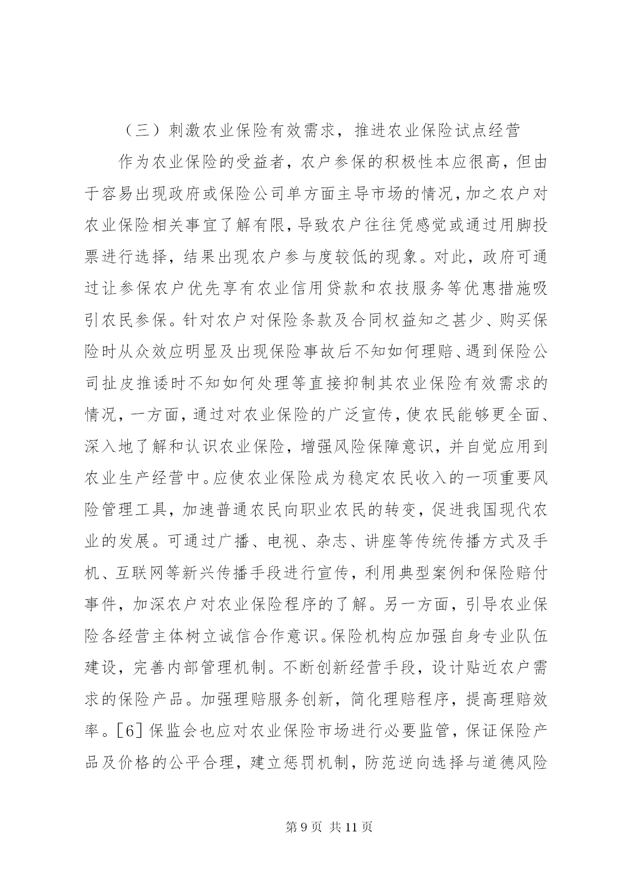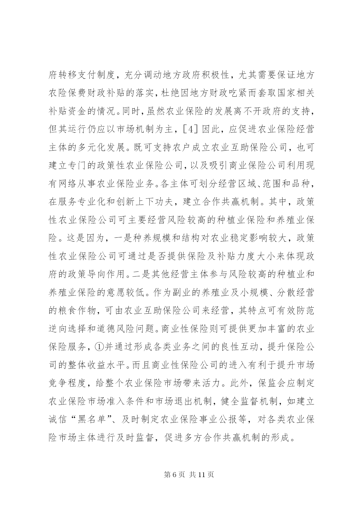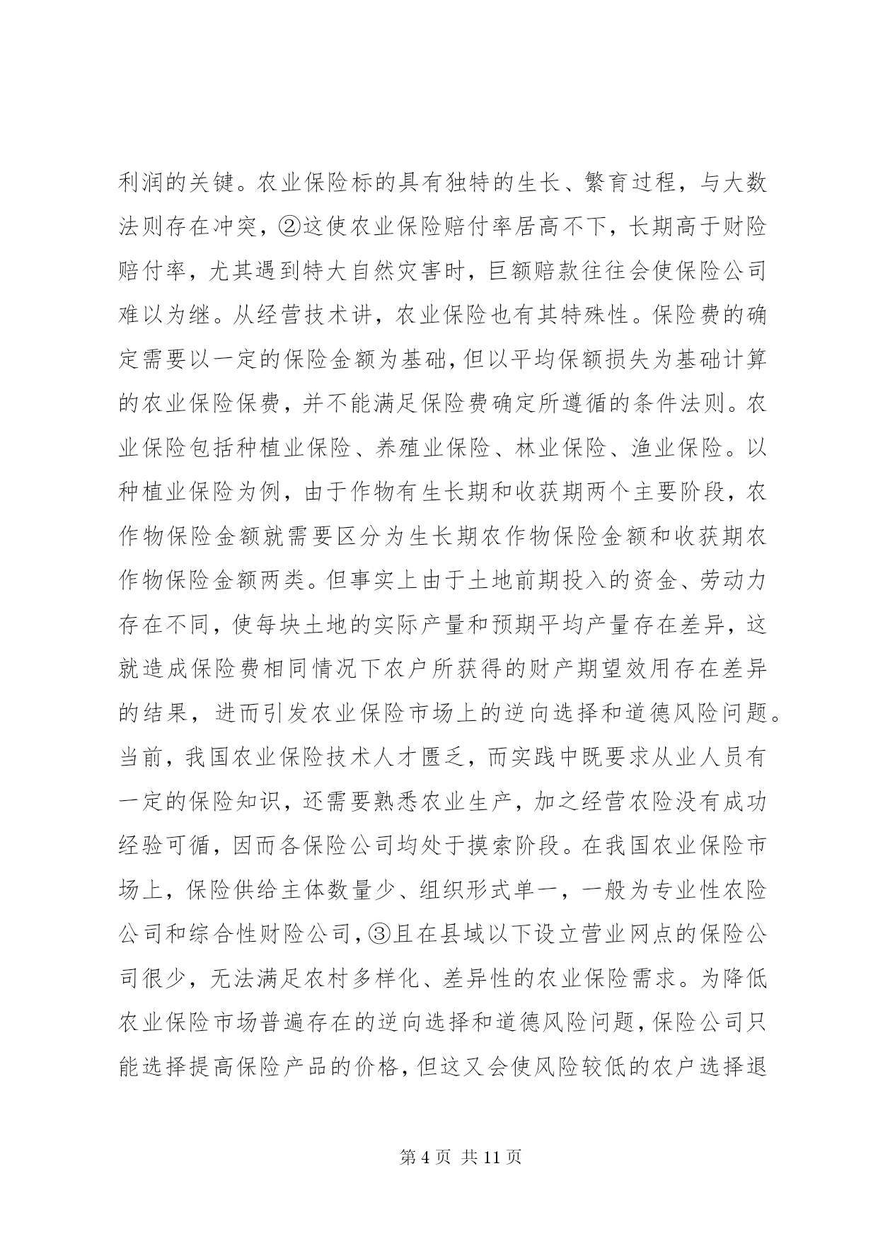 第PAGE\*Arabic\*MERGEFORMAT11页共NUMPAGES\*MERGEFORMAT11页农业保险发展问题研究摘要。当前,我国农业保险存在农户农业保险需求不高、保险公司从事农业保险业务积极性不高、政府引导作用有待增强等问题。应培育多元经营主体,建立合作共赢机制;发挥政府的主导作用,营造有利于农业保险发展的制度环境,建立健全农业保险法律法规体系,完善农业保险补贴支持政策,制定有利于农业保险发展的税收优惠政策;刺激农业保险有效需求,推进农业保险试点经营。关键词:农业保险;市场主体;合作机制由于农业生产具有季节性、周期性、地域性等特点,且易受自然灾害的影响,所以农业是风险较高行业。农业保险是现代农业风险规避的有效工具,在稳定农村社会生活、支持农业经济发展等方面具有重要作用。我国农业正处于发展变革的关键时期,建立适合我国国情的农业保险制度,既是促进金融更好支持农业发展的重要举措,也是充分利用农业保险的重要功能及其外部效应的必然选择。2004年,农业保险作为支农惠农政策列入我国中央一号文件。2007年,XX省、新疆、四川、湖南、江苏、吉林等6个省区分别开展了水稻、玉米、小麦、大豆、棉花等5个主要粮食作物品种的农业保险试点。[1]此后,农业保险试点范围不断扩大,保障水平不断提升,覆盖农产品品种不断增加。随着对农业保险认识的不断加深,农户的农业保险需求也逐步提升。然而,我国农业保险制度体系仍问题重重,从政府的补偿机制到市场监管,从保险公司操作的费率厘定难到高成本、高赔付问题的长期存在,农业保险如何实现更好发展已成为我国农业发展必须解决的重要课题。农户、保险公司和政府是农业保险市场的三大主体。应从三者各自不同的利益诉求出发,完善我国农业保险制度体系,更好促进我国农村经济发展。一、当前我国农业保险市场三大主体存在的主要问题(一)农业保险供求不平衡我国是农业大国,同时也是自然灾害频发的国家。据统计,全国年均约有3亿亩农作物受灾,有2亿多农村人口遭受不同程度的损失。[2]近些年,随着环境破坏和生态恶化,加剧了农业自然灾害的强度、频率及变异性,农户普遍渴望通过农业保险规避农业风险。但一直以来,由于农业比较收益较低、农业生产增收能力有限,加之近年来农业生产资料价格普遍上涨,导致农户的农业保险支付能力一直较低。在一家一户的小规模经营中,各个农户的经济行为独立、决策分散,导致羊群效应突出,即个别农户的购买行为很难起到有效的带头示范作用。随着非农收入在农民总收入中占比的增加,很多农民更愿意选择其他途径来增加收入,而只将土地通过流转获得基本的保障性收入。同时,从当前农业保险的补偿水平看,一般不超过当地之前几年平均产量的70%,补偿水平不高,与实际损失之间相差较大,不利于提升农户参保的积极性。此外,我国农村地区普遍信息建设滞后,农户对于农业保险及自然灾害预防等相关信息获取渠道有限,地方政府对于农业保险的宣传力度不够,导致农户对于农业保险发展的最新动态知之甚少,无法及时获取农业保险方面的最新惠农措施,加之农民大多根据自身的经验做出生产决策,导致通过农业保险降低风险的意识普遍不强。受到上述因素的影响,农户农业保险需求不足问题一直未能得到有效解决,导致农业经营风险大多由农户自己承担,而一旦发生自然灾害,必然导致农户遭到巨大的经济损失,结果只能是等待救灾援助。尽管近年来我国农业生产规模化发展趋势明显,各类新型农业经营主体不断涌现,农业保险需求也随之日益旺盛,但农户农业保险需求的制约因素仍有待解决。(二)保险公司从事农业保险业务积极性不高保险公司是农业保险经营的主体,因而其经营管理的水平及对农业保险的重视程度直接关系到农业保险能否实现健康、可持续发展。农业保险更偏重于政策性保险,①而商业性保险公司属于盈利机构,其重视的主要是能够获得足够经济利益的保险业务,因而对于无法获利或获利微薄、风险较大的保险业务,保险公司并没有主动参与的积极性。[3]因此,来自政府的补贴和引导是保险公司从事农业保险业务的重要前提。从经营原则讲,大数法则是保险公司业务选择的基础,是保险公司降低自身风险、实现利润的关键。农业保险标的具有独特的生长、繁育过程,与大数法则存在冲突,②这使农业保险赔付率居高不下,长期高于财险赔付率,尤其遇到特大自然灾害时,巨额赔款往往会使保险公司难以为继。从经营技术讲,农业保险也有其特殊性。保险费的确定需要以一定的保险金额为基础,但以平均保额损失为基础计算的农业保险保费,并不能满足保险费确定所遵循的条件法则。农业保险包括种植业保险、养殖业保险、林业保险、渔业保险。以种植业保险为例,由于作物有生长期和收获期两个主要阶段,农作物保险金额就需要区分为生长期农作物保险金额和收获期农作物保险金额两类。但事实上由于土地前期投入的资金、劳动力存在