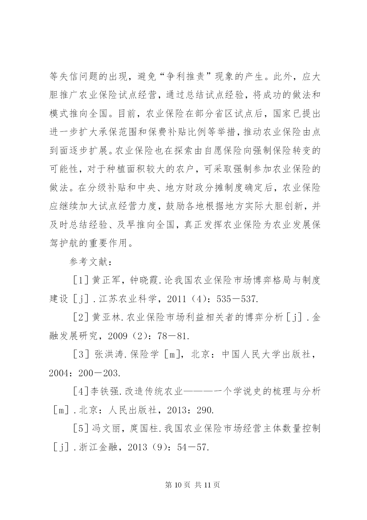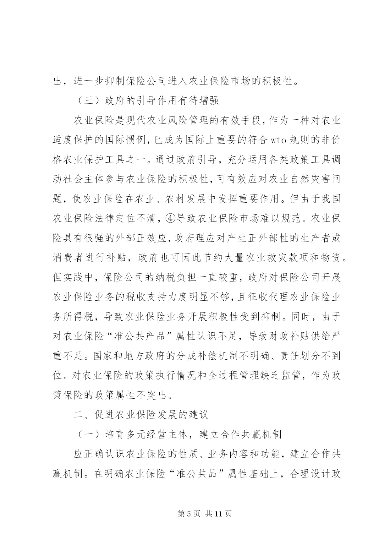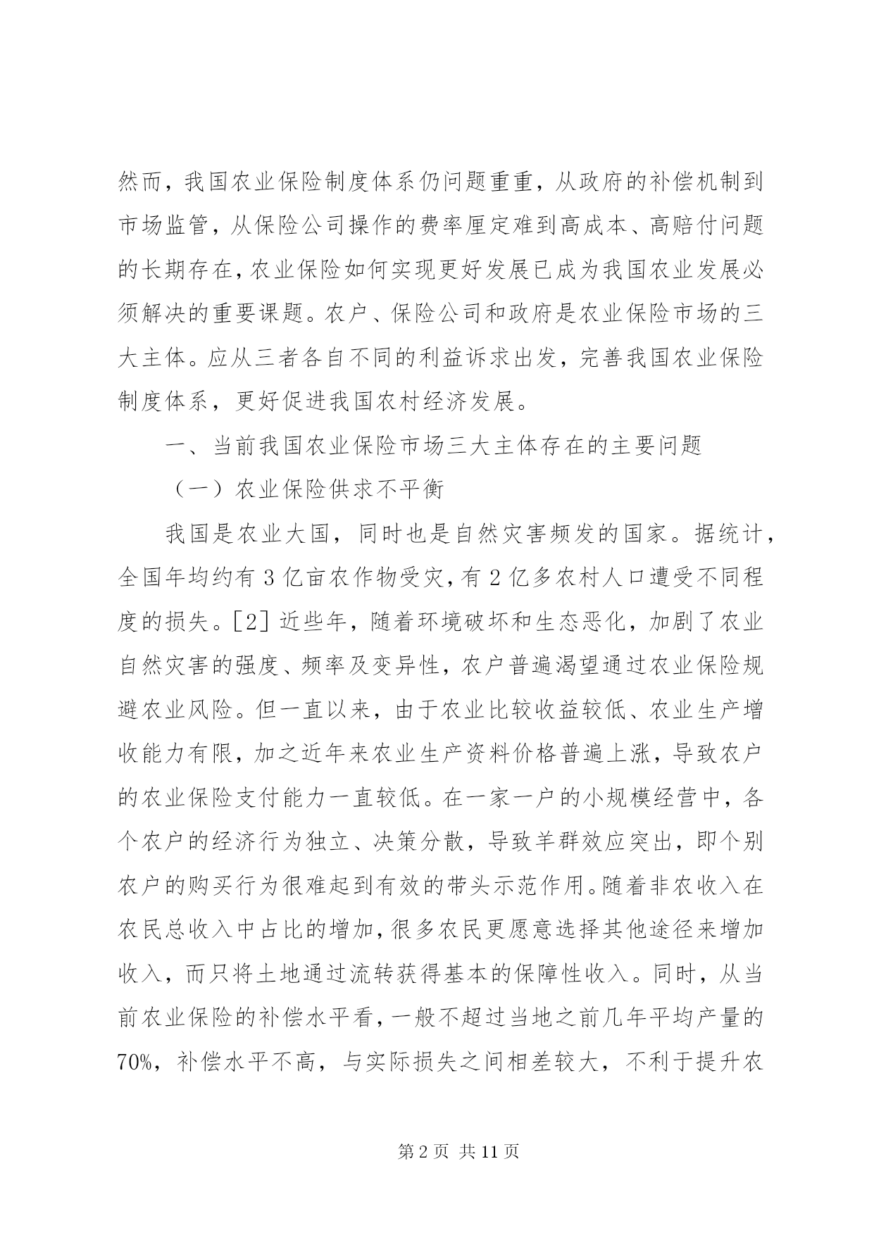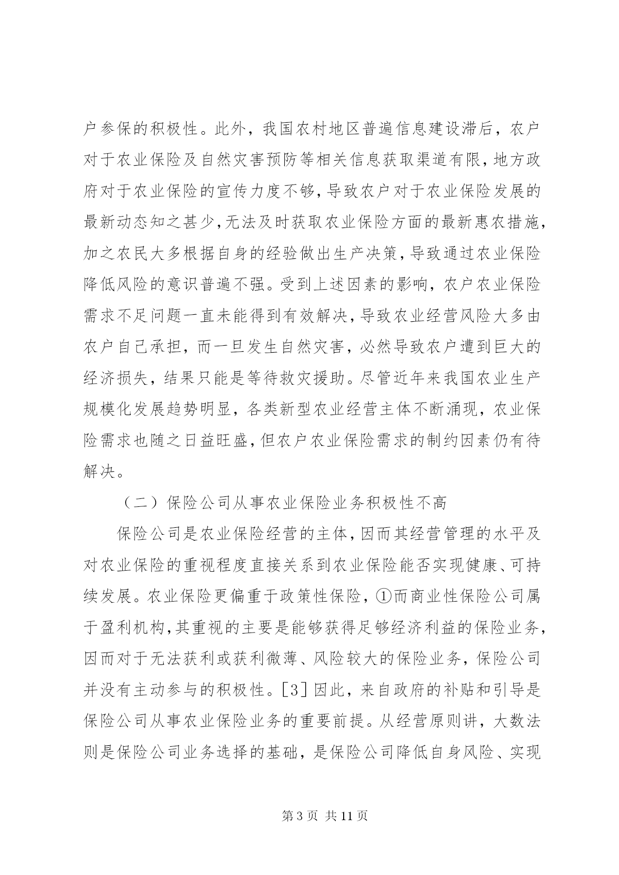 第PAGE\*Arabic\*MERGEFORMAT11页共NUMPAGES\*MERGEFORMAT11页农业保险发展问题研究摘要。当前,我国农业保险存在农户农业保险需求不高、保险公司从事农业保险业务积极性不高、政府引导作用有待增强等问题。应培育多元经营主体,建立合作共赢机制;发挥政府的主导作用,营造有利于农业保险发展的制度环境,建立健全农业保险法律法规体系,完善农业保险补贴支持政策,制定有利于农业保险发展的税收优惠政策;刺激农业保险有效需求,推进农业保险试点经营。关键词:农业保险;市场主体;合作机制由于农业生产具有季节性、周期性、地域性等特点,且易受自然灾害的影响,所以农业是风险较高行业。农业保险是现代农业风险规避的有效工具,在稳定农村社会生活、支持农业经济发展等方面具有重要作用。我国农业正处于发展变革的关键时期,建立适合我国国情的农业保险制度,既是促进金融更好支持农业发展的重要举措,也是充分利用农业保险的重要功能及其外部效应的必然选择。2004年,农业保险作为支农惠农政策列入我国中央一号文件。2007年,XX省、新疆、四川、湖南、江苏、吉林等6个省区分别开展了水稻、玉米、小麦、大豆、棉花等5个主要粮食作物品种的农业保险试点。[1]此后,农业保险试点范围不断扩大,保障水平不断提升,覆盖农产品品种不断增加。随着对农业保险认识的不断加深,农户的农业保险需求也逐步提升。然而,我国农业保险制度体系仍问题重重,从政府的补偿机制到市场监管,从保险公司操作的费率厘定难到高成本、高赔付问题的长期存在,农业保险如何实现更好发展已成为我国农业发展必须解决的重要课题。农户、保险公司和政府是农业保险市场的三大主体。应从三者各自不同的利益诉求出发,完善我国农业保险制度体系,更好促进我国农村经济发展。一、当前我国农业保险市场三大主体存在的主要问题(一)农业保险供求不平衡我国是农业大国,同时也是自然灾害频发的国家。据统计,全国年均约有3亿亩农作物受灾,有2亿多农村人口遭受不同程度的损失。[2]近些年,随着环境破坏和生态恶化,加剧了农业自然灾害的强度、频率及变异性,农户普遍渴望通过农业保险规避农业风险。但一直以来,由于农业比较收益较低、农业生产增收能力有限,加之近年来农业生产资料价格普遍上涨,导致农户的农业保险支付能力一直较低。在一家一户的小规模经营中,各个农户的经济行为独立、决策分散,导致羊群效应突出,即个别农户的购买行为很难起到有效的带头示范作用。随着非农收入在农民总收入中占比的增加,很多农民更愿意选择其他途径来增加收入,而只将土地通过流转获得基本的保障性收入。同时,从当前农业保险的补偿水平看,一般不超过当地之前几年平均产量的70%,补偿水平不高,与实际损失之间相差较大,不利于提升农户参保的积极性。此外,我国农村地区普遍信息建设滞后,农户对于农业保险及自然灾害预防等相关信息获取渠道有限,地方政府对于农业保险的宣传力度不够,导致农户对于农业保险发展的最新动态知之甚少,无法及时获取农业保险方面的最新惠农措施,加之农民大多根据自身的经验做出生产决策,导致通过农业保险降低风险的意识普遍不强。受到上述因素的影响,农户农业保险需求不足问题一直未能得到有效解决,导致农业经营风险大多由农户自己承担,而一旦发生自然灾害,必然导致农户遭到巨大的经济损失,结果只能是等待救灾援助。尽管近年来我国农业生产规模化发展趋势明显,各类新型农业经营主体不断涌现,农业保险需求也随之日益旺盛,但农户农业保险需求的制约因素仍有待解决。(二)保险公司从事农业保险业务积极性不高保险公司是农业保险经营的主体,因而其经营管理的水平及对农业保险的重视程度直接关系到农业保险能否实现健康、可持续发展。农业保险更偏重于政策性保险,①而商业性保险公司属于盈利机构,其重视的主要是能够获得足够经济利益的保险业务,因而对于无法获利或获利微薄、风险较大的保险业务,保险公司并没有主动参与的积极性。[3]因此,来自政府的补贴和引导是保险公司从事农业保险业务的重要前提。从经营原则讲,大数法则是保险公司业务选择的基础,是保险公司降低自身风险、实现利润的关键。农业保险标的具有独特的生长、繁育过程,与大数法则存在冲突,②这使农业保险赔付率居高不下,长期高于财险赔付率,尤其遇到特大自然灾害时,巨额赔款往往会使保险公司难以为继。从经营技术讲,农业保险也有其特殊性。保险费的确定需要以一定的保险金额为基础,但以平均保额损失为基础计算的农业保险保费,并不能满足保险费确定所遵循的条件法则。农业保险包括种植业保险、养殖业保险、林业保险、渔业保险。以种植业保险为例,由于作物有生长期和收获期两个主要阶段,农作物保险金额就需要区分为生长期农作物保险金额和收获期农作物保险金额两类。但事实上由于土地前期投入的资金、劳动力存在