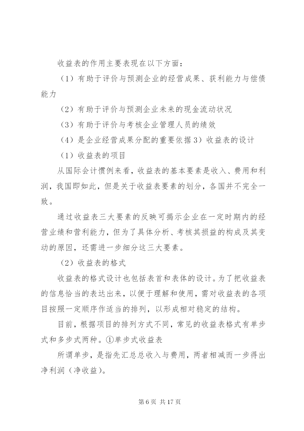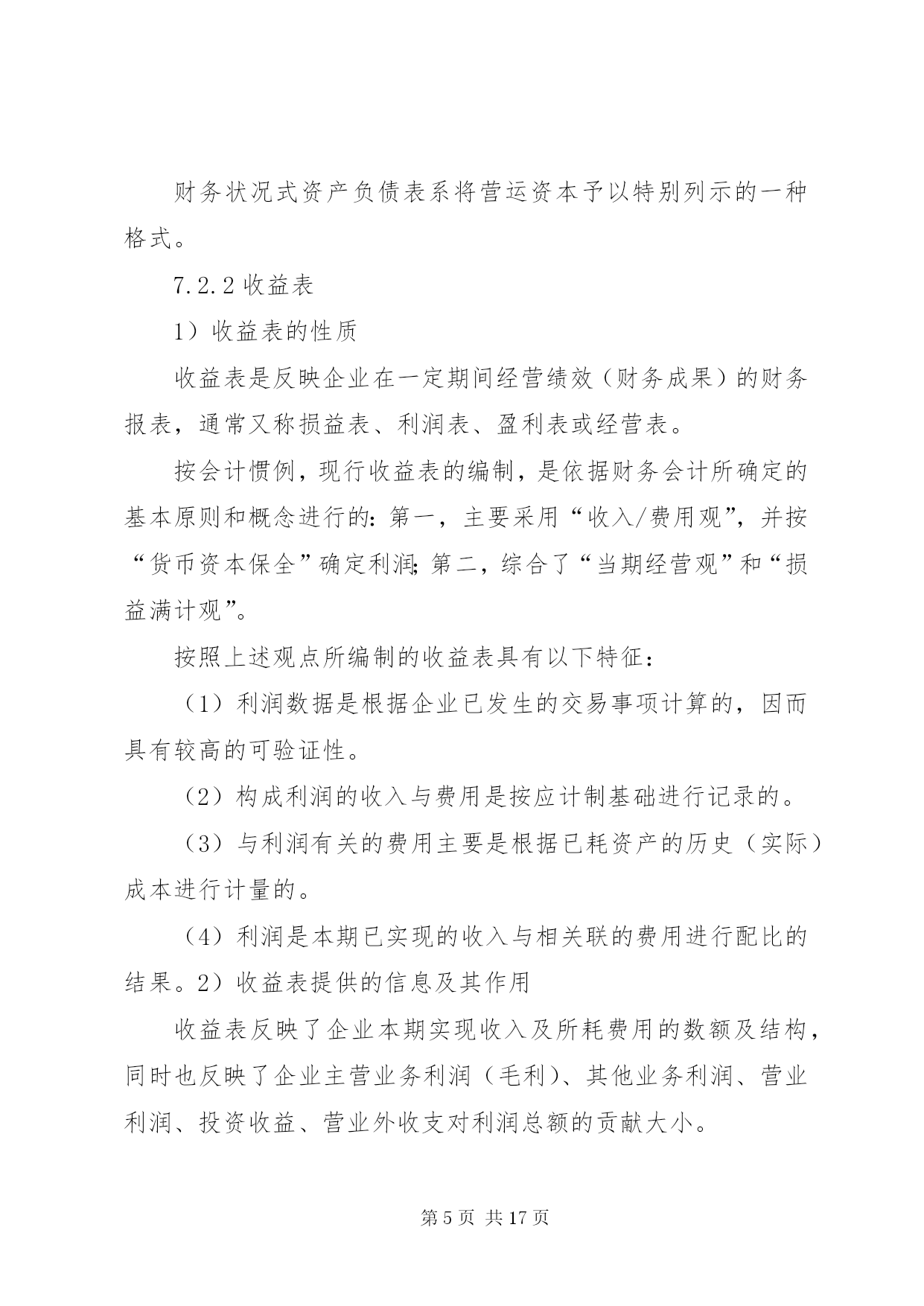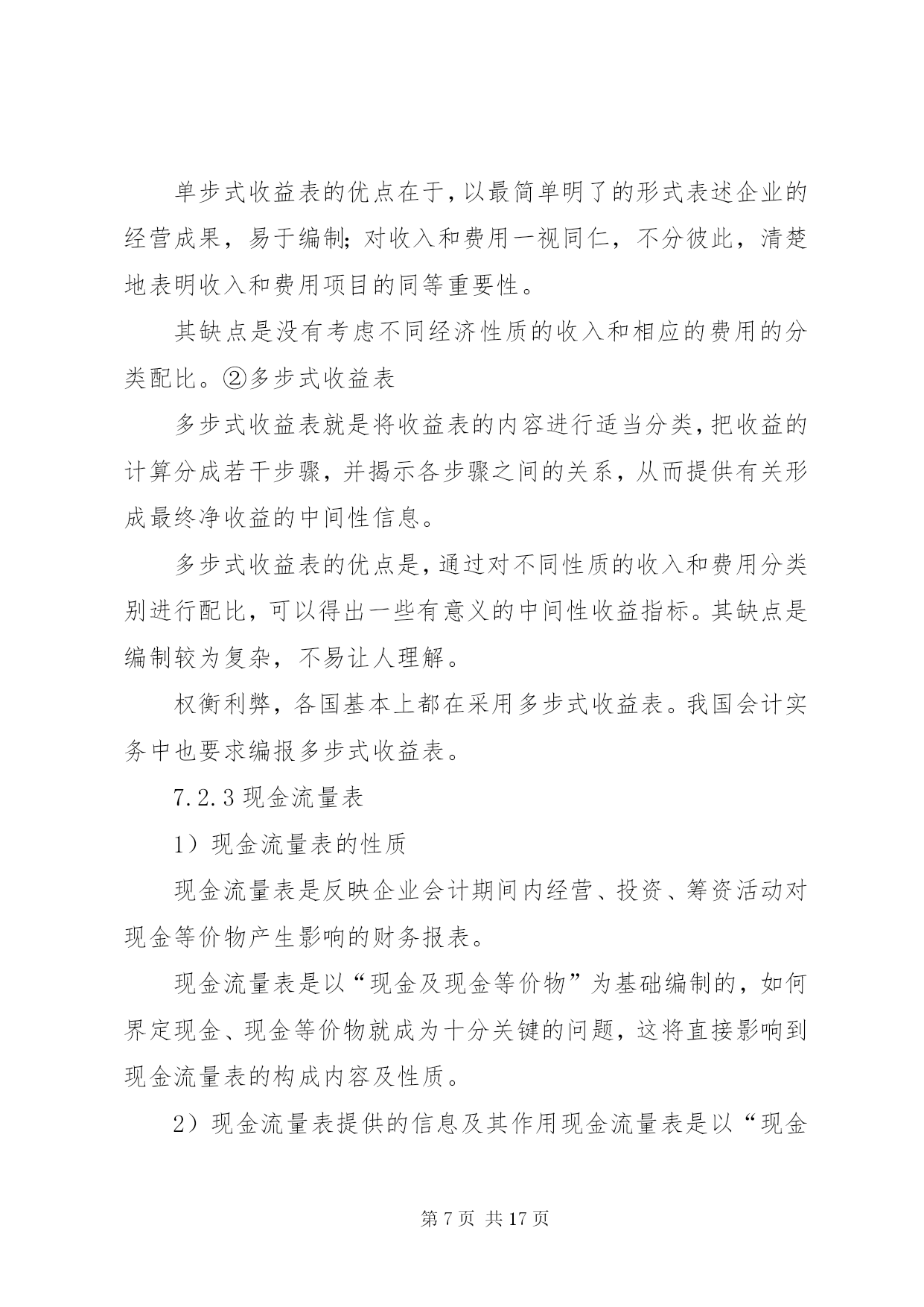 第PAGE\*Arabic\*MERGEFORMAT17页共NUMPAGES\*MERGEFORMAT17页第7章财务报告理论第7章财务报告理论学习目标知识目标:了解财务报告理论在财务会计理论中的重要地位、会计信息披露的理论模型。技能目标:掌握三大基本财务报表的性质、提供的信息、作用及设计,以及财务报表附注在信息披露方面的分工及优缺点。能力目标。正确看待和理解现行通用财务报表的局限,从而正确认识与评价人们对现行财务报表所做的改进。主要内容7.1财务报告体系7.2基本财务报表7.3表外披露7.4财务报告的发展7.1财务报告体系7.1.1充分披露原则所谓充分披露原则,也称财务报告原则,是指为了达到公允表达企业经济事项所必要的信息均应完整提供,并让用户易于理解,亦即财务报告应揭示所有对用户的理解及决策有用的重要信息。7.1.2财务报告体系财务报告是企业正式对外披露财务信息和非财务信息的书面文件。财务报告由财务报表和其他财务报告两大部分构成。在财务报告体系中,最重要、最可靠的财务信息是由财务报表提供的,财务报表的附注和其他财务报告是补充提供财务信息和非财务信息的重要手段。财务报表连同它的附注是财务报告的核心,其他财务报告则是财务报告的必要补充,它们共同构成一个完整的对外报告体系。7.1.3财务报告传递的信息及其作用1)财务报告传递的信息(1)关于企业经济资源(资产)、对这些资源的权利以及引起资源和资源上权利变动的各种经济业务事项的信息,即特定时日的财务状况信息。(2)关于企业在报告期内的经营绩效。(3)关于企业怎样取得和使用现金—现金流动的信息。(4)反映企业经营者向资源提供者报告如何利用受托使用的资源,进行资源的保值、增值活动并履行法律与合同规定的其他义务等有关受托责任的信息。(5)有关企业经营者的分析、评价和预测等方面的信息,以提高财务报告的有用性。2)财务报告信息的作用(1)报告并解除企业经营者(受托人)的受托责任。(2)为企业各利益相关者分配财富提供依据,也即签订与执行诸多经济合同(契约)的重要依据。(3)有助于投资者和债权人进行合理决策,也有助于企业的供应商、工会、证券分析师、税务机关等其他信息使用者进行各种决策。(4)能帮助企业经营者改善经营管理,协调企业与利益相关者的关系,促进企业快速、稳定地发展。(5)能帮助国家有关部门实现经济与社会目标,并进行必要的宏观调控,促进社会资源的有效配置。7.2基本财务报表7.2.1资产负债表1)资产负债表的性质资产负债表,也称财务报告表,是根据“资产=负债+所有者权益”这一基本会计恒等式编制而成的,反映企业在特定日期的财务状况的一种资源存量的报表。资产负债表的任务就是报告企业的财务状况,即其资产结构和财务结构的状况。2)资产负债表提供的信息及其作用(1)资产负债表提供的信息第一,从“总计”、“合计”、“小计”中,可以了解一个企业作为一个整体在编制资产负债表日的全部资源的“存量”和各大类、各小类资源存量的构成。第二,资产负债表中资产和负债项目通常按流动性分类,在每一类中又按流动性的强度排列。第三,某些有关联的项目被排列在一起,通过不同的计量,便能获得补充信息,可用于评估资产所承受的损失风险。第四,资产负债表中的负债和所有者权益项目反映了财务结构,可用于评估财务结构的合理性,从而判别财务风险大小,有助于进行破产预警分析。(2)资产负债表的作用第一,有助于评价与预测企业的偿债能力。第二,有助于评价与预测企业的经营绩效。第三,有助于评价与预测企业未来创造现金流量的能力。3)资产负债表的设计(1)资产负债表项目的分类资产负债表项目的分类,是指在编制资产负债表时,按照一定的标准,对所有资产、负债、所有者权益项目加以归类,形成资产负债表的各项目在内容上的有机联系。目前资产负债表项目的分类标准主要有两种。一种是按货币与非货币性分类;另一种是按流动性分类。在会计实务上,绝大多数企业采用这一分类方法。(2)资产负债表的格式账户式资产负债表又称横式或水平式资产负债表,分左方、右方进行项目排列,左方列示资产项目,右方按上、下分别列示负债和所有者权益项目,形成左右对称结构。报告式资产负债表又称竖式或垂直式资产负债表,它是从上而下按资产、负债和所有者权益项目垂直排列。财务状况式资产负债表系将营运资本予以特别列示的一种格式。7.2.2收益表1)收益表的性质收益表是反映企业在一定期间经营绩效(财务成果)的财务报表,通常又称损益表、利润表、盈利表或经营表。按会计惯例,现行收益表的编制,是依据财务会计所确定的基本原则和概念进行的:第一,主要采用“收入/费用观”,并按“货币资本保全”确定利润;第二,综合了“当期经营观”和“损益满计观”。按照上述观点所编制的收益表具有以下特征:(1)利润数据是根据企业