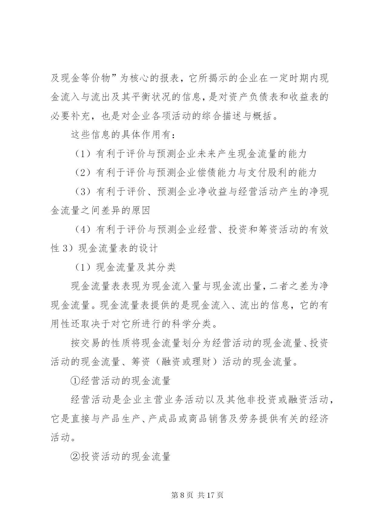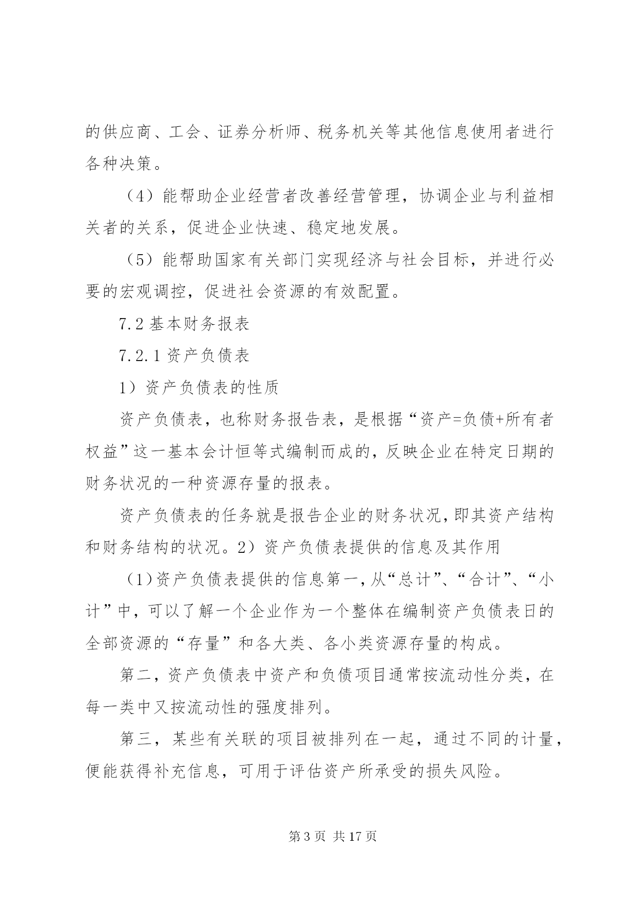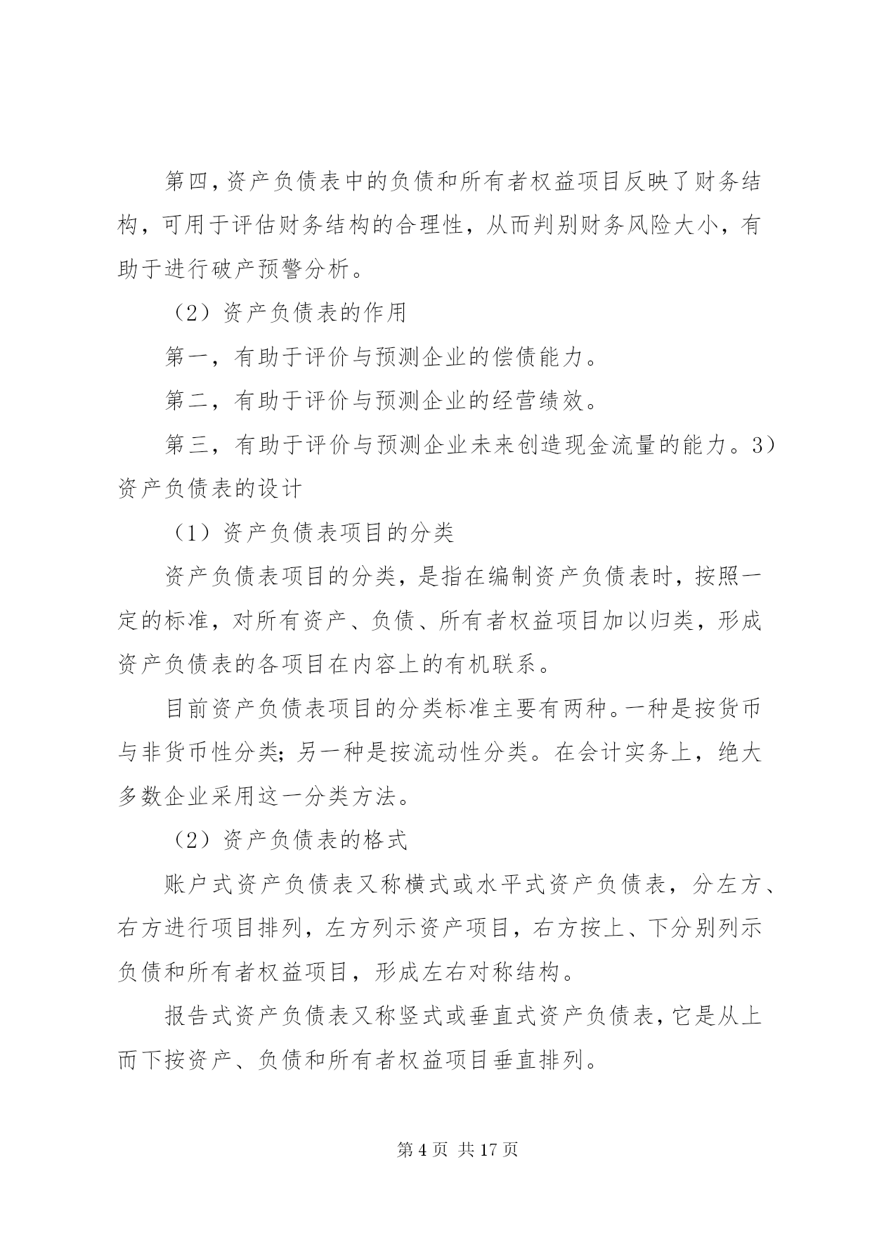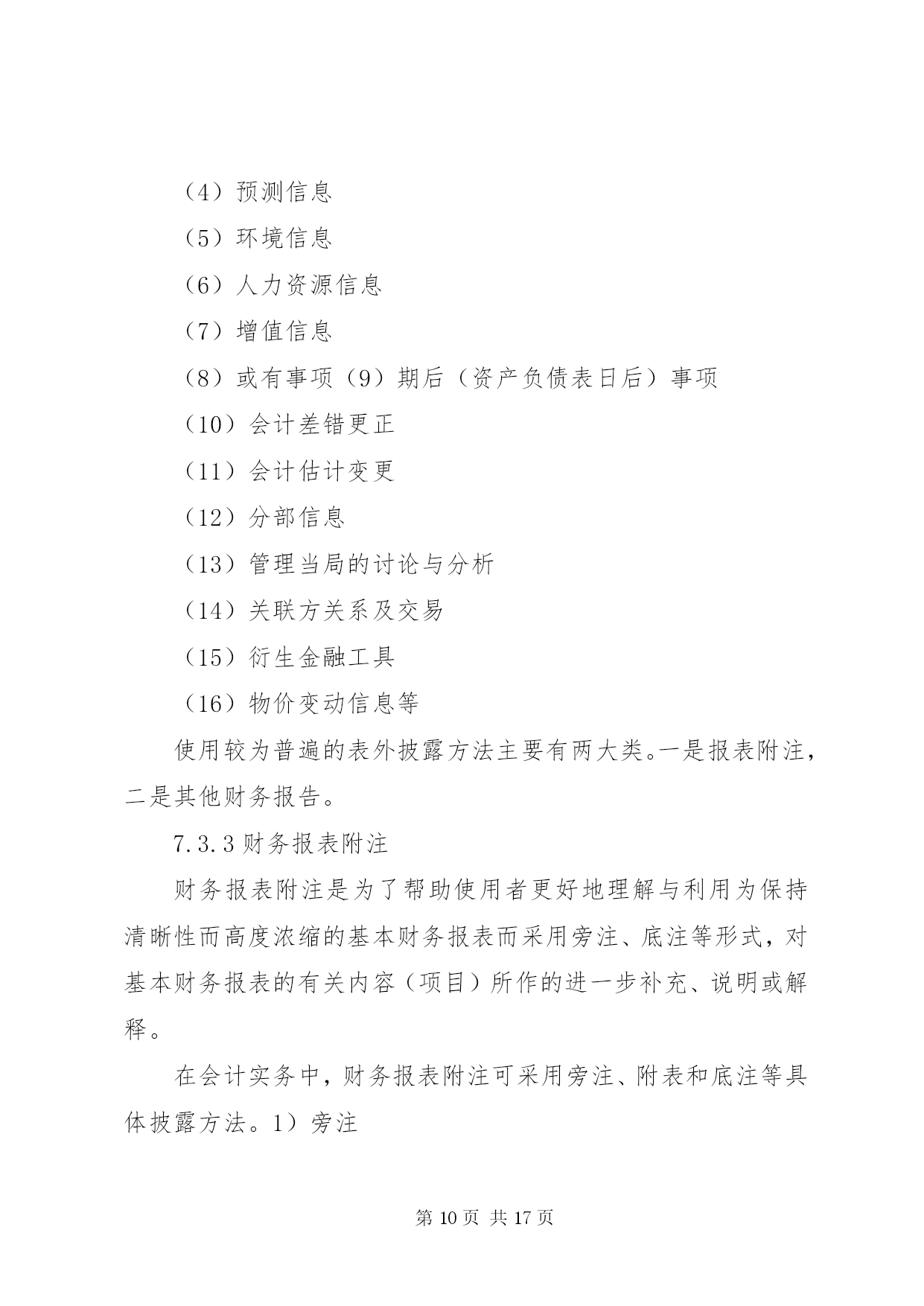 第PAGE\*Arabic\*MERGEFORMAT17页共NUMPAGES\*MERGEFORMAT17页第7章财务报告理论第7章财务报告理论学习目标知识目标:了解财务报告理论在财务会计理论中的重要地位、会计信息披露的理论模型。技能目标:掌握三大基本财务报表的性质、提供的信息、作用及设计,以及财务报表附注在信息披露方面的分工及优缺点。能力目标。正确看待和理解现行通用财务报表的局限,从而正确认识与评价人们对现行财务报表所做的改进。主要内容7.1财务报告体系7.2基本财务报表7.3表外披露7.4财务报告的发展7.1财务报告体系7.1.1充分披露原则所谓充分披露原则,也称财务报告原则,是指为了达到公允表达企业经济事项所必要的信息均应完整提供,并让用户易于理解,亦即财务报告应揭示所有对用户的理解及决策有用的重要信息。7.1.2财务报告体系财务报告是企业正式对外披露财务信息和非财务信息的书面文件。财务报告由财务报表和其他财务报告两大部分构成。在财务报告体系中,最重要、最可靠的财务信息是由财务报表提供的,财务报表的附注和其他财务报告是补充提供财务信息和非财务信息的重要手段。财务报表连同它的附注是财务报告的核心,其他财务报告则是财务报告的必要补充,它们共同构成一个完整的对外报告体系。7.1.3财务报告传递的信息及其作用1)财务报告传递的信息(1)关于企业经济资源(资产)、对这些资源的权利以及引起资源和资源上权利变动的各种经济业务事项的信息,即特定时日的财务状况信息。(2)关于企业在报告期内的经营绩效。(3)关于企业怎样取得和使用现金—现金流动的信息。(4)反映企业经营者向资源提供者报告如何利用受托使用的资源,进行资源的保值、增值活动并履行法律与合同规定的其他义务等有关受托责任的信息。(5)有关企业经营者的分析、评价和预测等方面的信息,以提高财务报告的有用性。2)财务报告信息的作用(1)报告并解除企业经营者(受托人)的受托责任。(2)为企业各利益相关者分配财富提供依据,也即签订与执行诸多经济合同(契约)的重要依据。(3)有助于投资者和债权人进行合理决策,也有助于企业的供应商、工会、证券分析师、税务机关等其他信息使用者进行各种决策。(4)能帮助企业经营者改善经营管理,协调企业与利益相关者的关系,促进企业快速、稳定地发展。(5)能帮助国家有关部门实现经济与社会目标,并进行必要的宏观调控,促进社会资源的有效配置。7.2基本财务报表7.2.1资产负债表1)资产负债表的性质资产负债表,也称财务报告表,是根据“资产=负债+所有者权益”这一基本会计恒等式编制而成的,反映企业在特定日期的财务状况的一种资源存量的报表。资产负债表的任务就是报告企业的财务状况,即其资产结构和财务结构的状况。2)资产负债表提供的信息及其作用(1)资产负债表提供的信息第一,从“总计”、“合计”、“小计”中,可以了解一个企业作为一个整体在编制资产负债表日的全部资源的“存量”和各大类、各小类资源存量的构成。第二,资产负债表中资产和负债项目通常按流动性分类,在每一类中又按流动性的强度排列。第三,某些有关联的项目被排列在一起,通过不同的计量,便能获得补充信息,可用于评估资产所承受的损失风险。第四,资产负债表中的负债和所有者权益项目反映了财务结构,可用于评估财务结构的合理性,从而判别财务风险大小,有助于进行破产预警分析。(2)资产负债表的作用第一,有助于评价与预测企业的偿债能力。第二,有助于评价与预测企业的经营绩效。第三,有助于评价与预测企业未来创造现金流量的能力。3)资产负债表的设计(1)资产负债表项目的分类资产负债表项目的分类,是指在编制资产负债表时,按照一定的标准,对所有资产、负债、所有者权益项目加以归类,形成资产负债表的各项目在内容上的有机联系。目前资产负债表项目的分类标准主要有两种。一种是按货币与非货币性分类;另一种是按流动性分类。在会计实务上,绝大多数企业采用这一分类方法。(2)资产负债表的格式账户式资产负债表又称横式或水平式资产负债表,分左方、右方进行项目排列,左方列示资产项目,右方按上、下分别列示负债和所有者权益项目,形成左右对称结构。报告式资产负债表又称竖式或垂直式资产负债表,它是从上而下按资产、负债和所有者权益项目垂直排列。财务状况式资产负债表系将营运资本予以特别列示的一种格式。7.2.2收益表1)收益表的性质收益表是反映企业在一定期间经营绩效(财务成果)的财务报表,通常又称损益表、利润表、盈利表或经营表。按会计惯例,现行收益表的编制,是依据财务会计所确定的基本原则和概念进行的:第一,主要采用“收入/费用观”,并按“货币资本保全”确定利润;第二,综合了“当期经营观”和“损益满计观”。按照上述观点所编制的收益表具有以下特征:(1)利润数据是根据企业