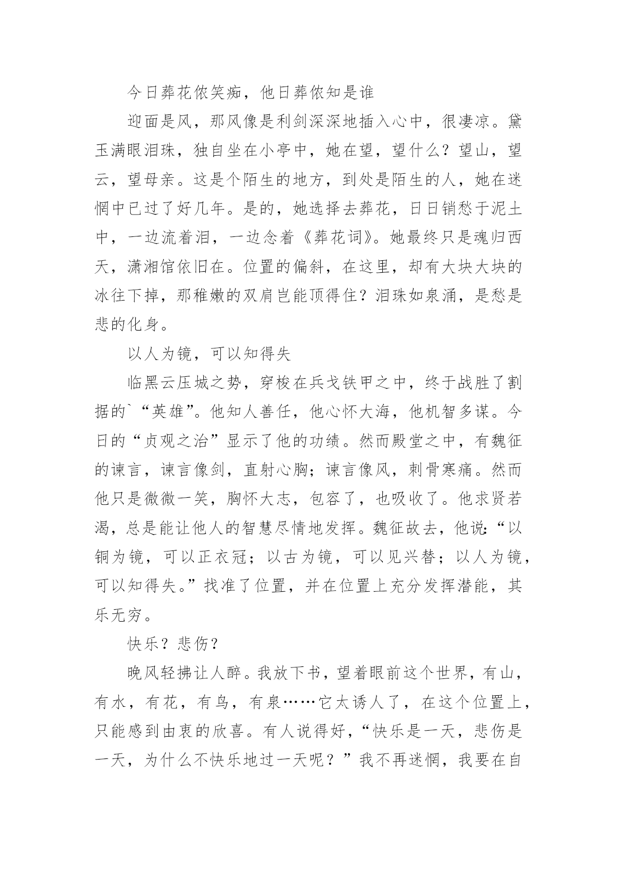 快乐悲伤高考作文在日常的学习、工作、生活中,大家都写过作文,肯定对各类作文都很熟悉吧,根据写作命题的特点,作文可以分为命题作文和非命题作文。那要怎么写好作文呢?下面是小编帮大家整理的快乐悲伤高考作文,希望能够帮助到大家。剪不断,理还乱我曾放开心扉,在绿树旁奔跑;我曾蕴意怀愁,在竹林下哭泣。今天我又看到了李煜的愁丝,我细细地翻开诗词,我细细地阅读史书。李煜是“作个才子真绝代,可怜薄命作君主”。在那雕栏玉砌之中,他与小周后饮酒赋诗,颇有桃艳之色,然而今日他却被锁在深楼之中,只叹“梧桐寂寞深院锁清秋”,终是“问君能有几多愁,恰似一江春水向东流”。他死了,清秋依旧,我只惋惜,为什么他不尝试着舍弃富贵,去做乡间竹林中的骚人呢?出师未捷身先死,长使英雄泪满襟柏树茂盛繁密,我飞上树梢,在清明的空气中,闻到了英雄的气息。他是卧龙,身居山林之间,也很清高。但是后来他离开了,去了战场,他运筹帷幄之中,决胜千里之外。他很快乐,因为他帮助了朋友,帮助了那个三顾茅庐以真情把他请出了山的人。他在战争之中,感到自己活得很充实,终于留下了“出师一表真名世,千载谁堪伯仲间”的美名。位置的正确与他的坚守位置,让他在阳光中感受到快乐。今日葬花侬笑痴,他日葬侬知是谁迎面是风,那风像是利剑深深地插入心中,很凄凉。黛玉满眼泪珠,独自坐在小亭中,她在望,望什么?望山,望云,望母亲。这是个陌生的地方,到处是陌生的人,她在迷惘中已过了好几年。是的,她选择去葬花,日日销愁于泥土中,一边流着泪,一边念着《葬花词》。她最终只是魂归西天,潇湘馆依旧在。位置的偏斜,在这里,却有大块大块的冰往下掉,那稚嫩的双肩岂能顶得住?泪珠如泉涌,是愁是悲的化身。以人为镜,可以知得失临黑云压城之势,穿梭在兵戈铁甲之中,终于战胜了割据的`“英雄”。他知人善任,他心怀大海,他机智多谋。今日的“贞观之治”显示了他的功绩。然而殿堂之中,有魏征的谏言,谏言像剑,直射心胸;谏言像风,刺骨寒痛。然而他只是微微一笑,胸怀大志,包容了,也吸收了。他求贤若渴,总是能让他人的智慧尽情地发挥。魏征故去,他说:“以铜为镜,可以正衣冠;以古为镜,可以见兴替;以人为镜,可以知得失。”找准了位置,并在位置上充分发挥潜能,其乐无穷。快乐?悲伤?晚风轻拂让人醉。我放下书,望着眼前这个世界,有山,有水,有花,有鸟,有泉……它太诱人了,在这个位置上,只能感到由衷的欣喜。有人说得好,“快乐是一天,悲伤是一天,为什么不快乐地过一天呢?”我不再迷惘,我要在自己的位置上演绎人生最美的故事,让苦难中总有快乐相随。