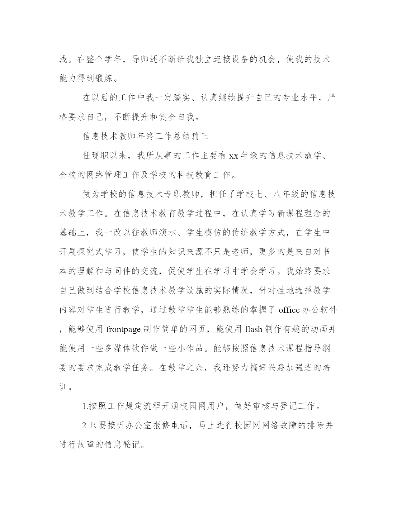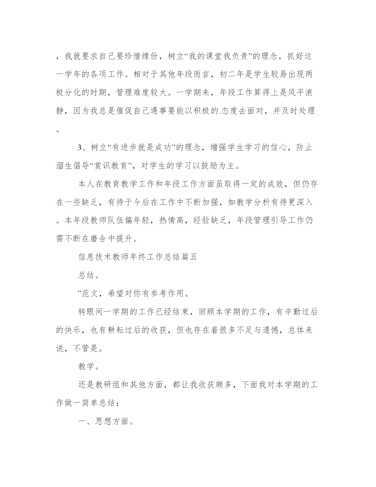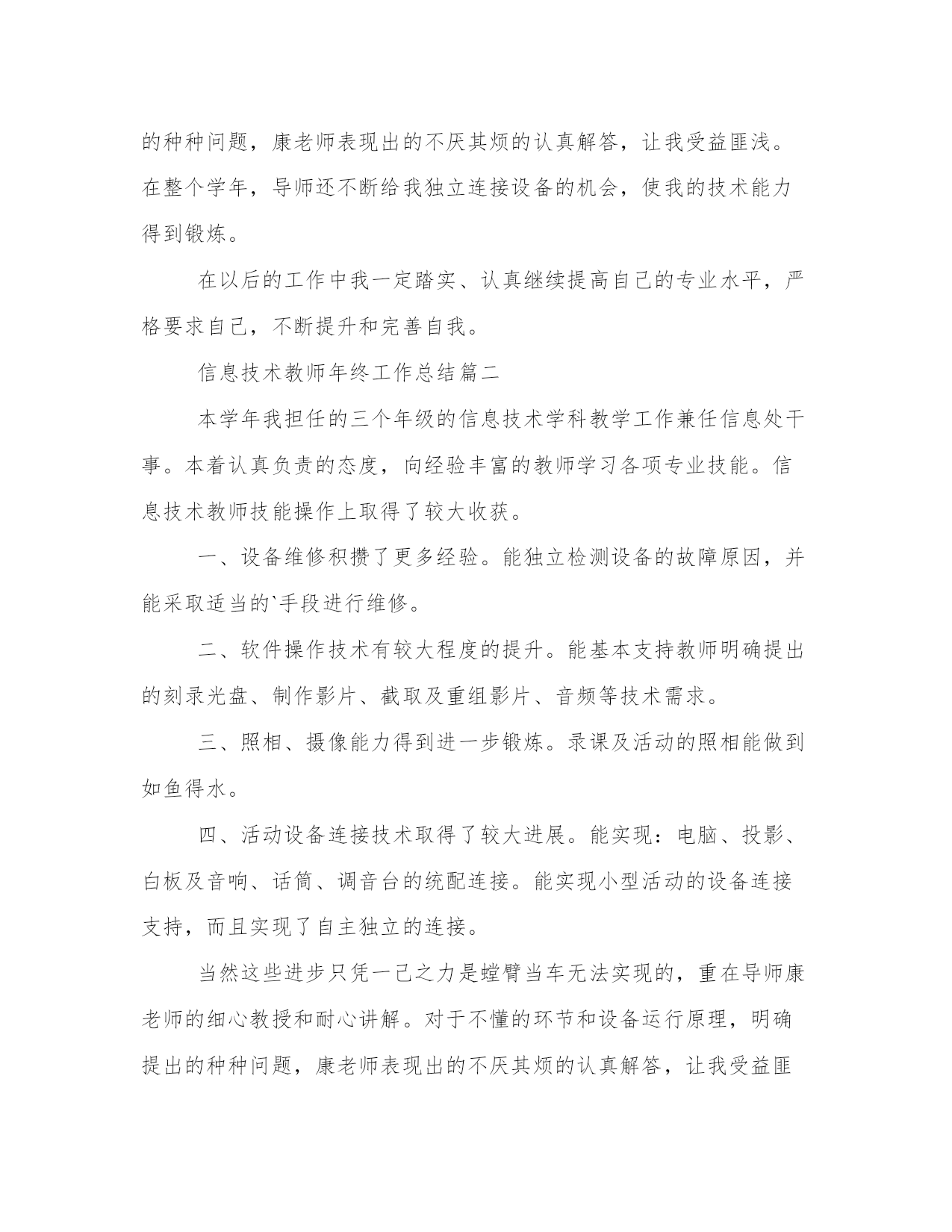 信息技术教师年终工作总结(优质13篇)围绕工作中的某一方面或某一问题进行的专门性总结,总结某一方面的成绩、经验。那么我们该如何写一篇较为完美的总结呢?以下是小编收集整理的工作总结书范文,仅供参考,希望能够帮助到大家。信息技术教师年终工作总结篇一本学年我担任的.三个年级的信息技术学科教学工作兼任信息处干事。本着认真负责的态度,向经验丰富的教师学习各项专业技能。信息技术教师技能操作上取得了较大收获。一、设备维修积攒了更多经验。能独立检测设备的故障原因,并能采取适当的手段进行维修。二、软件操作技术有很大程度的提高。能基本支持教师提出的刻录光盘、制作影片、截取及重组影片、音频等技术需求。三、照相、摄像能力得到进一步锻炼。录课及活动的照相能做到如鱼得水。四、活动设备连接技术取得了很大进展。能实现:电脑、投影、白板及音响、话筒、调音台的统配连接。能实现小型活动的设备连接支持,而且实现了自主独立的连接。当然这些进步只凭一己之力是螳臂当车无法实现的,重在导师康老师的细心教授和耐心讲解。对于不懂的环节和设备运行原理,提出的种种问题,康老师表现出的不厌其烦的认真解答,让我受益匪浅。在整个学年,导师还不断给我独立连接设备的机会,使我的技术能力得到锻炼。在以后的工作中我一定踏实、认真继续提高自己的专业水平,严格要求自己,不断提升和完善自我。信息技术教师年终工作总结篇二本学年我担任的三个年级的信息技术学科教学工作兼任信息处干事。本着认真负责的态度,向经验丰富的教师学习各项专业技能。信息技术教师技能操作上取得了较大收获。一、设备维修积攒了更多经验。能独立检测设备的故障原因,并能采取适当的`手段进行维修。二、软件操作技术有较大程度的提升。能基本支持教师明确提出的刻录光盘、制作影片、截取及重组影片、音频等技术需求。三、照相、摄像能力得到进一步锻炼。录课及活动的照相能做到如鱼得水。四、活动设备连接技术取得了较大进展。能实现:电脑、投影、白板及音响、话筒、调音台的统配连接。能实现小型活动的设备连接支持,而且实现了自主独立的连接。当然这些进步只凭一己之力是螳臂当车无法实现的,重在导师康老师的细心教授和耐心讲解。对于不懂的环节和设备运行原理,明确提出的种种问题,康老师表现出的不厌其烦的认真解答,让我受益匪浅。在整个学年,导师还不断给我独立连接设备的机会,使我的技术能力得到锻炼。在以后的工作中我一定踏实、认真继续提升自己的专业水平,严格要求自己,不断提升和健全自我。信息技术教师年终工作总结篇三任现职以来,我所从事的工作主要有xx年级的信息技术教学、全校的网络管理工作及学校的科技教育工作。做为学校的信息技术专职教师,担任了学校七、八年级的信息技术教学工作。在信息技术教育教学过程中,在认真学习新课程理念的基础上,我一改以往教师演示、学生模仿的传统教学方式,在学生中开展探究式学习,使学生的知识来源不只是老师,更多的是来自对书本的理解和与同伴的交流,促使学生在学习中学会学习。我始终要求自己做到结合学校信息技术教学设施的实际情况,针对性地选择教学内容对学生进行教学,通过教学学生能够熟练的掌握了office办公软件,能够使用frontpage制作简单的网页,能使用flash制作有趣的动画并能使用一些多媒体软件做一些小作品。能够按照信息技术课程指导纲要的要求完成教学任务。在教学之余,我还努力搞好兴趣加强班的培训。1.按照工作规定流程开通校园网用户,做好审核与登记工作。2.只要接听办公室报修电话,马上进行校园网网络故障的排除并进行故障的信息登记。3.经常性地浏览、监控校园网络运行状况,确保校园网正常运行。4.定期检查楼内中心机房设备,做到防水、防尘、防静电,严格执行网络中心机房出入制度工作。现在我校的校园网络初具规模,包括图文、文件共享、学籍管理、资源共享等均可在网络上实现。同时内网和外网可互通。同时为了激励每个学生成材,激发科技创新热情,让每个学生体验成功的喜悦,我从学校的师生中选出一批乐于学习,勇于创新的科技团队,开展丰富多彩的科技活动,通过以点带面和不懈努力,科技教育初见成效。我们的创新工作室被评为“兵团青少年创新工作室”和“兵团知识产权试点学校”。论文xxx在第x届“xxxx”全国中小学教师论文大赛中获得兵团三等奖、所撰写的论文xxxx获全国一等奖,并在国家级专业刊物xxx上发表。所参与的课例xxx在“基础教育跨越式发展创新试验分析”项目第十一届全国研讨会作品评比中获二等奖。所撰写的xxx获国家一等奖,本人撰写的教学设计地球的自转与公转—白天与昼夜获国家级教学设计一等奖。还利用自身的技术优势,帮助同事制作多媒体课件,在制作过程中吸收他们好的教学理念,力求做到技术与思想的完美结合。在学校教研活动中,能够积极指导年轻老师的信