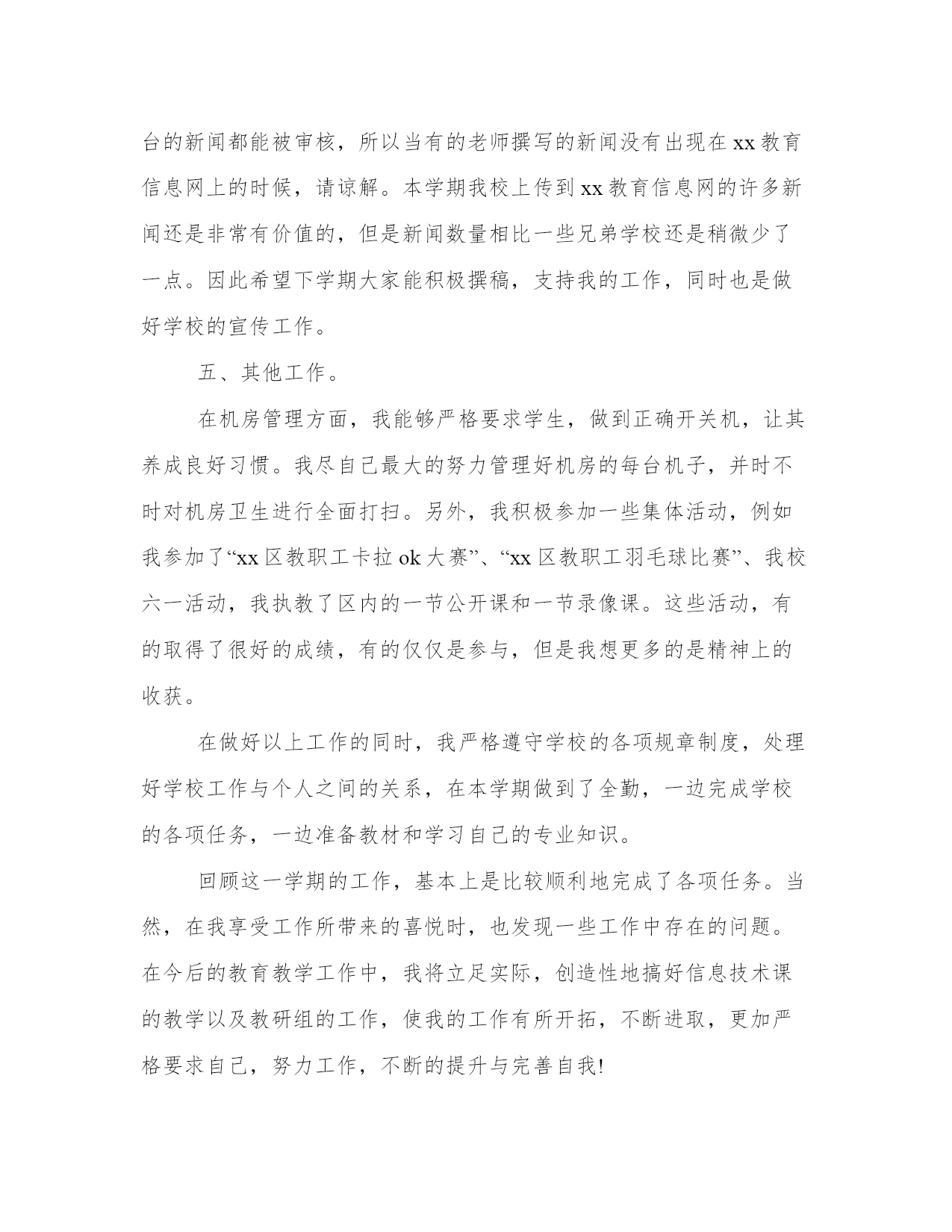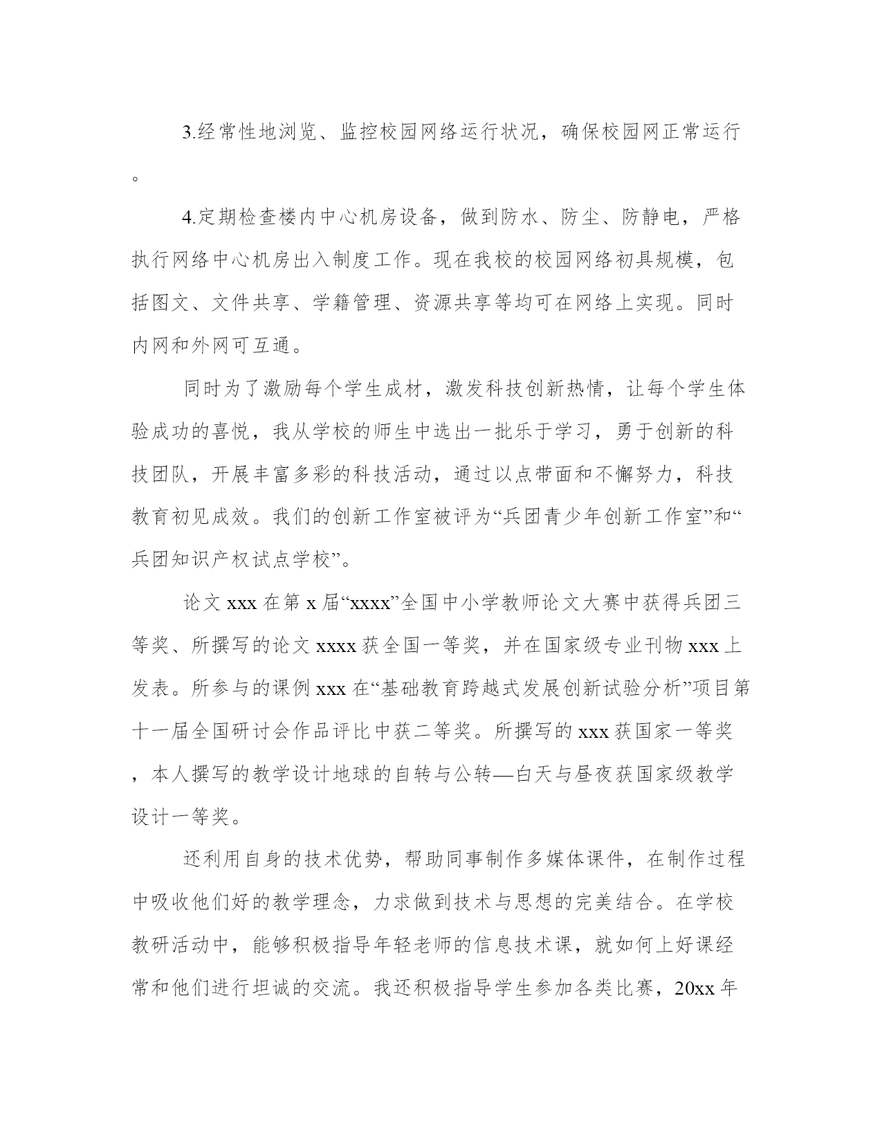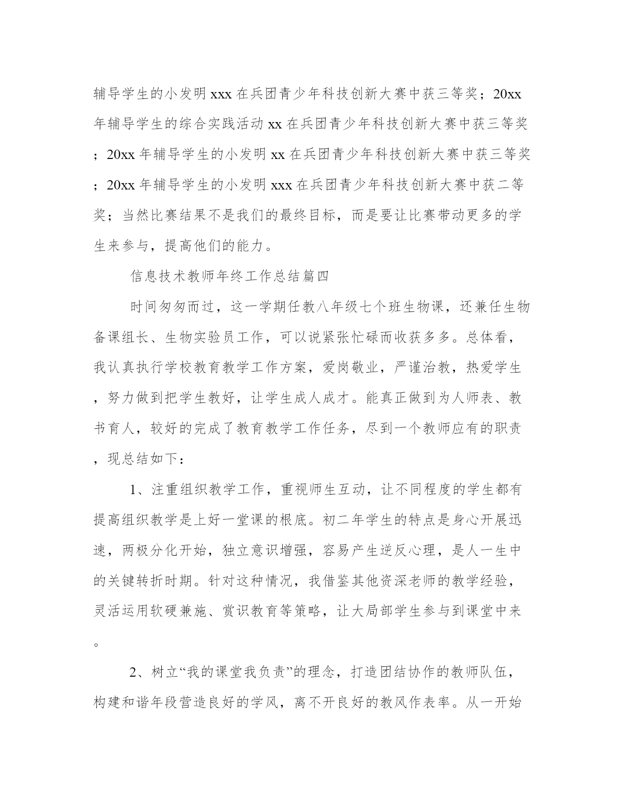 信息技术教师年终工作总结(优质13篇)围绕工作中的某一方面或某一问题进行的专门性总结,总结某一方面的成绩、经验。那么我们该如何写一篇较为完美的总结呢?以下是小编收集整理的工作总结书范文,仅供参考,希望能够帮助到大家。信息技术教师年终工作总结篇一本学年我担任的.三个年级的信息技术学科教学工作兼任信息处干事。本着认真负责的态度,向经验丰富的教师学习各项专业技能。信息技术教师技能操作上取得了较大收获。一、设备维修积攒了更多经验。能独立检测设备的故障原因,并能采取适当的手段进行维修。二、软件操作技术有很大程度的提高。能基本支持教师提出的刻录光盘、制作影片、截取及重组影片、音频等技术需求。三、照相、摄像能力得到进一步锻炼。录课及活动的照相能做到如鱼得水。四、活动设备连接技术取得了很大进展。能实现:电脑、投影、白板及音响、话筒、调音台的统配连接。能实现小型活动的设备连接支持,而且实现了自主独立的连接。当然这些进步只凭一己之力是螳臂当车无法实现的,重在导师康老师的细心教授和耐心讲解。对于不懂的环节和设备运行原理,提出的种种问题,康老师表现出的不厌其烦的认真解答,让我受益匪浅。在整个学年,导师还不断给我独立连接设备的机会,使我的技术能力得到锻炼。在以后的工作中我一定踏实、认真继续提高自己的专业水平,严格要求自己,不断提升和完善自我。信息技术教师年终工作总结篇二本学年我担任的三个年级的信息技术学科教学工作兼任信息处干事。本着认真负责的态度,向经验丰富的教师学习各项专业技能。信息技术教师技能操作上取得了较大收获。一、设备维修积攒了更多经验。能独立检测设备的故障原因,并能采取适当的`手段进行维修。二、软件操作技术有较大程度的提升。能基本支持教师明确提出的刻录光盘、制作影片、截取及重组影片、音频等技术需求。三、照相、摄像能力得到进一步锻炼。录课及活动的照相能做到如鱼得水。四、活动设备连接技术取得了较大进展。能实现:电脑、投影、白板及音响、话筒、调音台的统配连接。能实现小型活动的设备连接支持,而且实现了自主独立的连接。当然这些进步只凭一己之力是螳臂当车无法实现的,重在导师康老师的细心教授和耐心讲解。对于不懂的环节和设备运行原理,明确提出的种种问题,康老师表现出的不厌其烦的认真解答,让我受益匪浅。在整个学年,导师还不断给我独立连接设备的机会,使我的技术能力得到锻炼。在以后的工作中我一定踏实、认真继续提升自己的专业水平,严格要求自己,不断提升和健全自我。信息技术教师年终工作总结篇三任现职以来,我所从事的工作主要有xx年级的信息技术教学、全校的网络管理工作及学校的科技教育工作。做为学校的信息技术专职教师,担任了学校七、八年级的信息技术教学工作。在信息技术教育教学过程中,在认真学习新课程理念的基础上,我一改以往教师演示、学生模仿的传统教学方式,在学生中开展探究式学习,使学生的知识来源不只是老师,更多的是来自对书本的理解和与同伴的交流,促使学生在学习中学会学习。我始终要求自己做到结合学校信息技术教学设施的实际情况,针对性地选择教学内容对学生进行教学,通过教学学生能够熟练的掌握了office办公软件,能够使用frontpage制作简单的网页,能使用flash制作有趣的动画并能使用一些多媒体软件做一些小作品。能够按照信息技术课程指导纲要的要求完成教学任务。在教学之余,我还努力搞好兴趣加强班的培训。1.按照工作规定流程开通校园网用户,做好审核与登记工作。2.只要接听办公室报修电话,马上进行校园网网络故障的排除并进行故障的信息登记。3.经常性地浏览、监控校园网络运行状况,确保校园网正常运行。4.定期检查楼内中心机房设备,做到防水、防尘、防静电,严格执行网络中心机房出入制度工作。现在我校的校园网络初具规模,包括图文、文件共享、学籍管理、资源共享等均可在网络上实现。同时内网和外网可互通。同时为了激励每个学生成材,激发科技创新热情,让每个学生体验成功的喜悦,我从学校的师生中选出一批乐于学习,勇于创新的科技团队,开展丰富多彩的科技活动,通过以点带面和不懈努力,科技教育初见成效。我们的创新工作室被评为“兵团青少年创新工作室”和“兵团知识产权试点学校”。论文xxx在第x届“xxxx”全国中小学教师论文大赛中获得兵团三等奖、所撰写的论文xxxx获全国一等奖,并在国家级专业刊物xxx上发表。所参与的课例xxx在“基础教育跨越式发展创新试验分析”项目第十一届全国研讨会作品评比中获二等奖。所撰写的xxx获国家一等奖,本人撰写的教学设计地球的自转与公转—白天与昼夜获国家级教学设计一等奖。还利用自身的技术优势,帮助同事制作多媒体课件,在制作过程中吸收他们好的教学理念,力求做到技术与思想的完美结合。在学校教研活动中,能够积极指导年轻老师的信