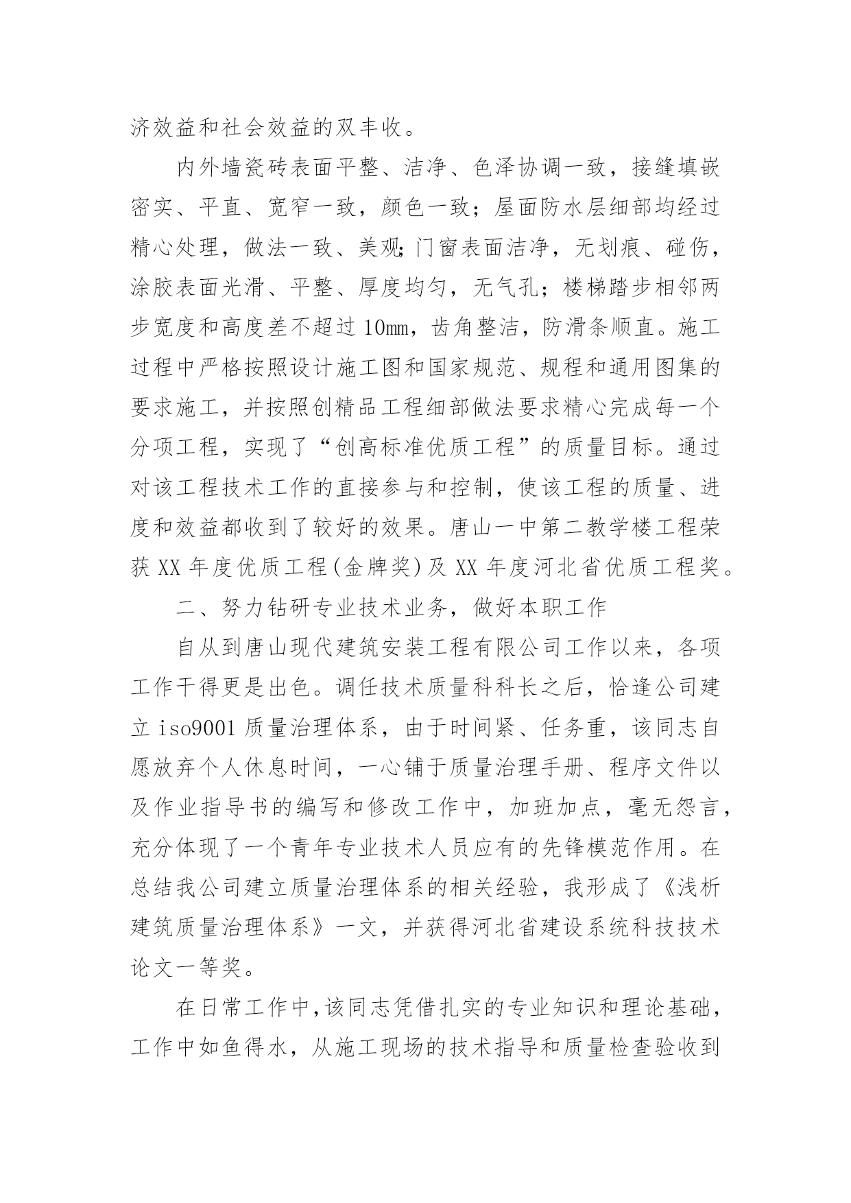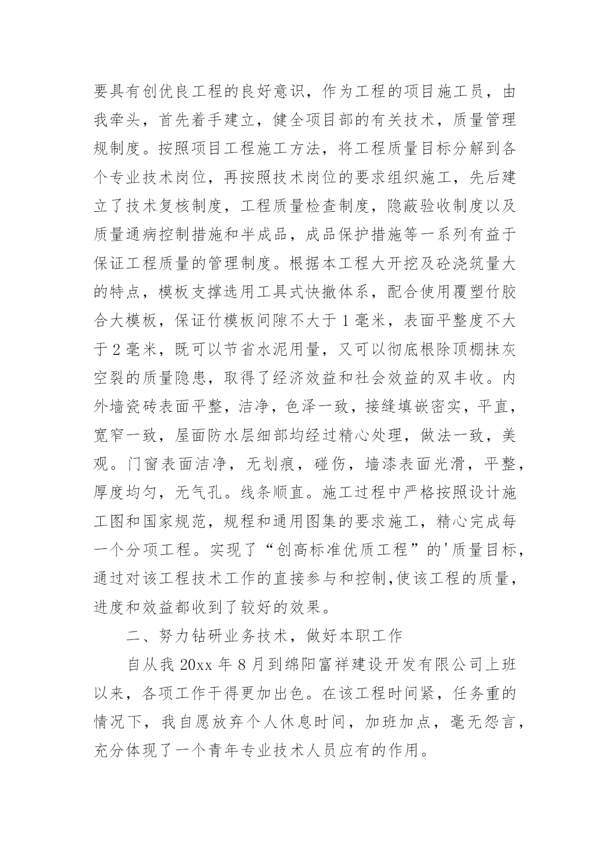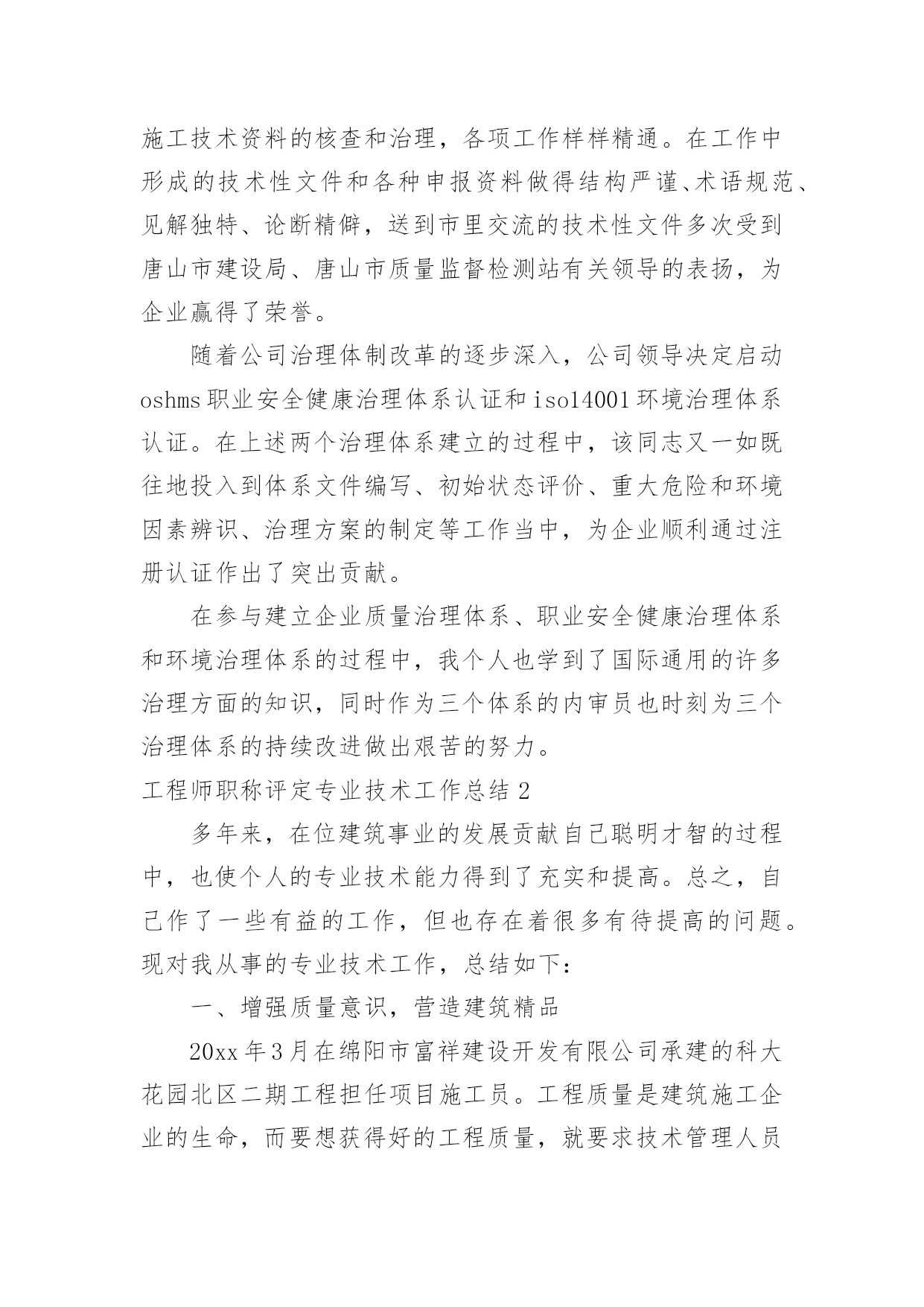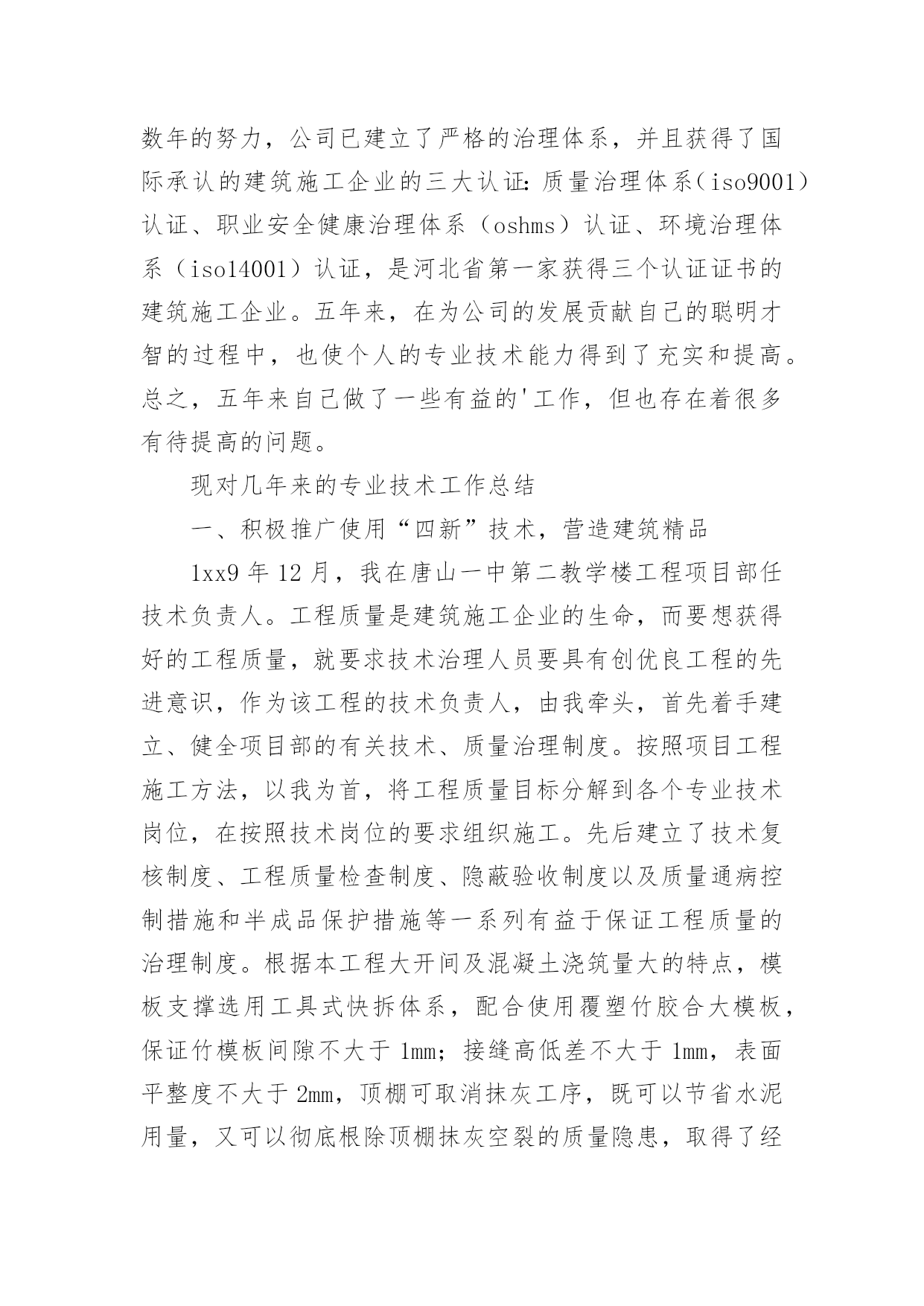 工程师职称评定专业技术工作总结工程师职称评定专业技术工作总结总结是事后对某一时期、某一项目或某些工作进行回顾和分析,从而做出带有规律性的结论,它能够使头脑更加清醒,目标更加明确,是时候写一份总结了。总结怎么写才能发挥它的作用呢?下面是小编收集整理的工程师职称评定专业技术工作总结,欢迎阅读,希望大家能够喜欢。工程师职称评定专业技术工作总结1我,1xx9年12月认定为助理工程师,先后工作于河北省第二工程建设有限公司、唐山现代建筑工程有限公司,XX年9月在唐山现代建筑安装工程有限公司技术质量科任科长。在此期间,我努力钻研专业技术知识,在技术治理过程中努力推行“新工艺、新结构、新材料、新设备”,对科技创新和技术进步倾注了满腔热情。任助理工程师专业技术职务以后,先后在丰南市国税局群体住宅小区工程和唐山一中第二教学楼工程中担任技术负责人,这两个工程竣工以后均被评为唐山市优质工程,而且唐山一中第二教学楼工程在评为市优工程的基础上又被评为XX年度河北省优质工程。在施工一线锻炼的几年中,通过理论联系实际,在大学期间所学的专业理论知识迅速转化为了业务能力。作为公司的技术和质量治理部门,在公司经理和公司总工程师的直接领导下,对技术治理一丝不苟,对工程质量从严控制。经过数年的努力,公司已建立了严格的治理体系,并且获得了国际承认的建筑施工企业的三大认证:质量治理体系(iso9001)认证、职业安全健康治理体系(oshms)认证、环境治理体系(iso14001)认证,是河北省第一家获得三个认证证书的建筑施工企业。五年来,在为公司的发展贡献自己的聪明才智的过程中,也使个人的专业技术能力得到了充实和提高。总之,五年来自己做了一些有益的'工作,但也存在着很多有待提高的问题。现对几年来的专业技术工作总结一、积极推广使用“四新”技术,营造建筑精品1xx9年12月,我在唐山一中第二教学楼工程项目部任技术负责人。工程质量是建筑施工企业的生命,而要想获得好的工程质量,就要求技术治理人员要具有创优良工程的先进意识,作为该工程的技术负责人,由我牵头,首先着手建立、健全项目部的有关技术、质量治理制度。按照项目工程施工方法,以我为首,将工程质量目标分解到各个专业技术岗位,在按照技术岗位的要求组织施工。先后建立了技术复核制度、工程质量检查制度、隐蔽验收制度以及质量通病控制措施和半成品保护措施等一系列有益于保证工程质量的治理制度。根据本工程大开间及混凝土浇筑量大的特点,模板支撑选用工具式快拆体系,配合使用覆塑竹胶合大模板,保证竹模板间隙不大于1mm;接缝高低差不大于1mm,表面平整度不大于2mm,顶棚可取消抹灰工序,既可以节省水泥用量,又可以彻底根除顶棚抹灰空裂的质量隐患,取得了经济效益和社会效益的双丰收。内外墙瓷砖表面平整、洁净、色泽协调一致,接缝填嵌密实、平直、宽窄一致,颜色一致;屋面防水层细部均经过精心处理,做法一致、美观;门窗表面洁净,无划痕、碰伤,涂胶表面光滑、平整、厚度均匀,无气孔;楼梯踏步相邻两步宽度和高度差不超过10mm,齿角整洁,防滑条顺直。施工过程中严格按照设计施工图和国家规范、规程和通用图集的要求施工,并按照创精品工程细部做法要求精心完成每一个分项工程,实现了“创高标准优质工程”的质量目标。通过对该工程技术工作的直接参与和控制,使该工程的质量、进度和效益都收到了较好的效果。唐山一中第二教学楼工程荣获XX年度优质工程(金牌奖)及XX年度河北省优质工程奖。二、努力钻研专业技术业务,做好本职工作自从到唐山现代建筑安装工程有限公司工作以来,各项工作干得更是出色。调任技术质量科科长之后,恰逢公司建立iso9001质量治理体系,由于时间紧、任务重,该同志自愿放弃个人休息时间,一心铺于质量治理手册、程序文件以及作业指导书的编写和修改工作中,加班加点,毫无怨言,充分体现了一个青年专业技术人员应有的先锋模范作用。在总结我公司建立质量治理体系的相关经验,我形成了《浅析建筑质量治理体系》一文,并获得河北省建设系统科技技术论文一等奖。在日常工作中,该同志凭借扎实的专业知识和理论基础,工作中如鱼得水,从施工现场的技术指导和质量检查验收到施工技术资料的核查和治理,各项工作样样精通。在工作中形成的技术性文件和各种申报资料做得结构严谨、术语规范、见解独特、论断精僻,送到市里交流的技术性文件多次受到唐山市建设局、唐山市质量监督检测站有关领导的表扬,为企业赢得了荣誉。随着公司治理体制改革的逐步深入,公司领导决定启动oshms职业安全健康治理体系认证和iso14001环境治理体系认证。在上述两个治理体系建立的过程中,该同志又一如既往地投入到体系文件编写、初始状态评价、重大危险和环境因素辨识、治理方案的制定等工作当中,为企业顺利通过注册认证作出了突出贡献。在参与建立企业质量治理体系、职业安全健康