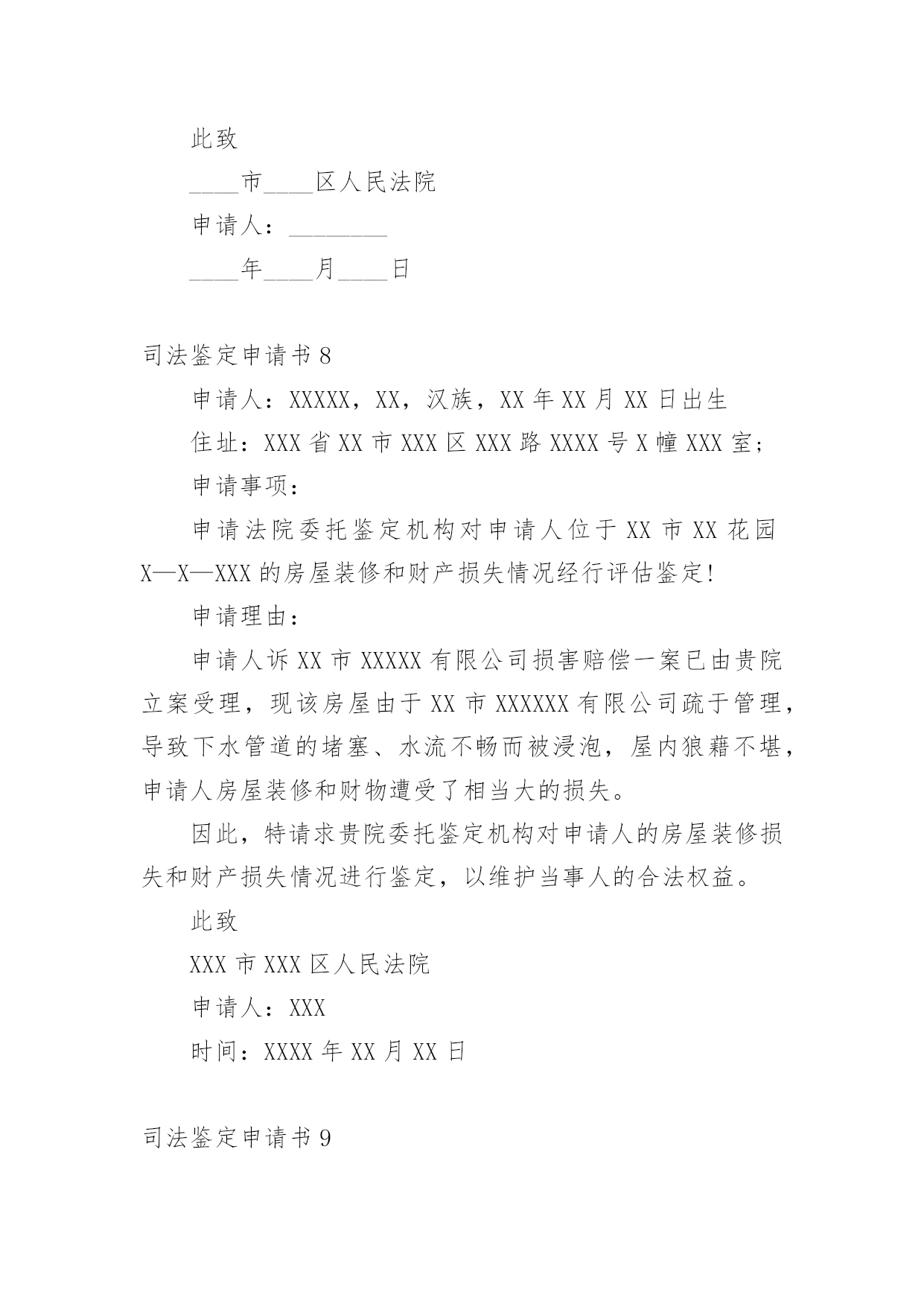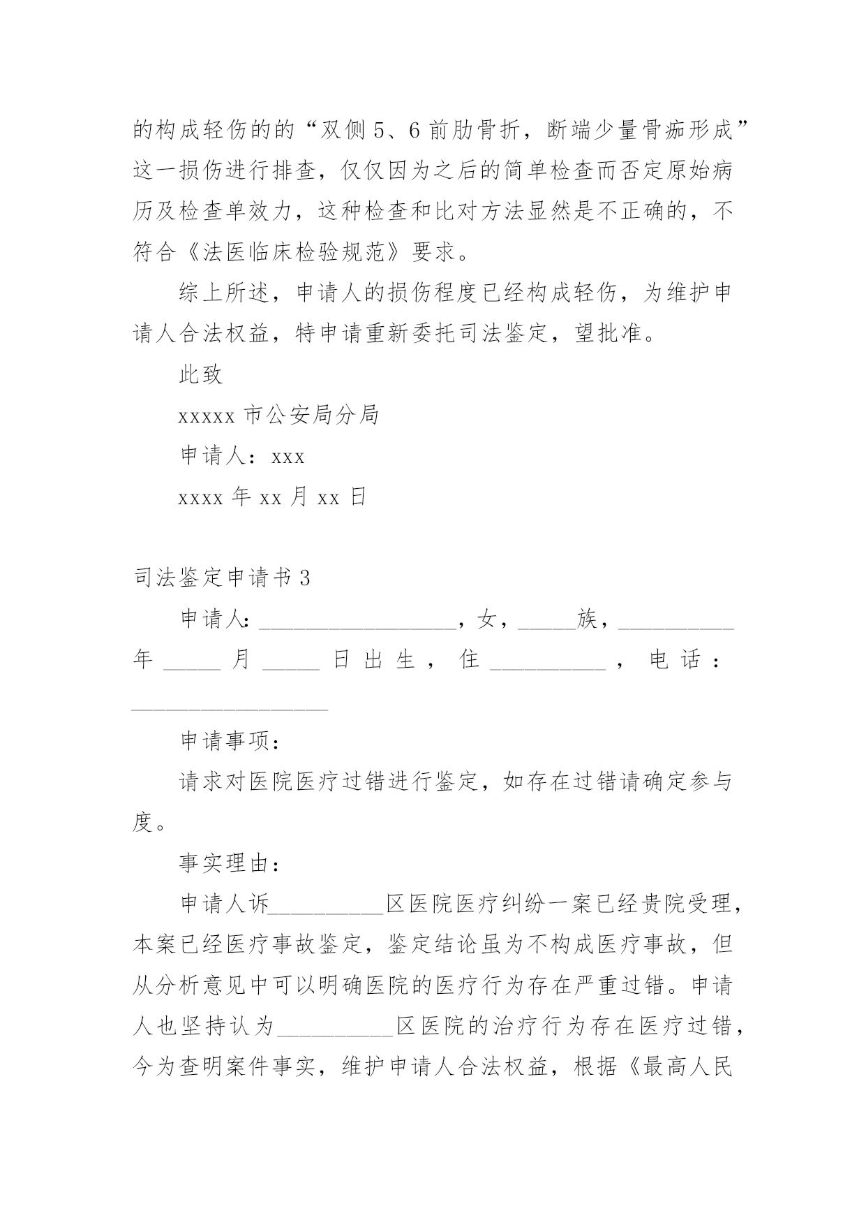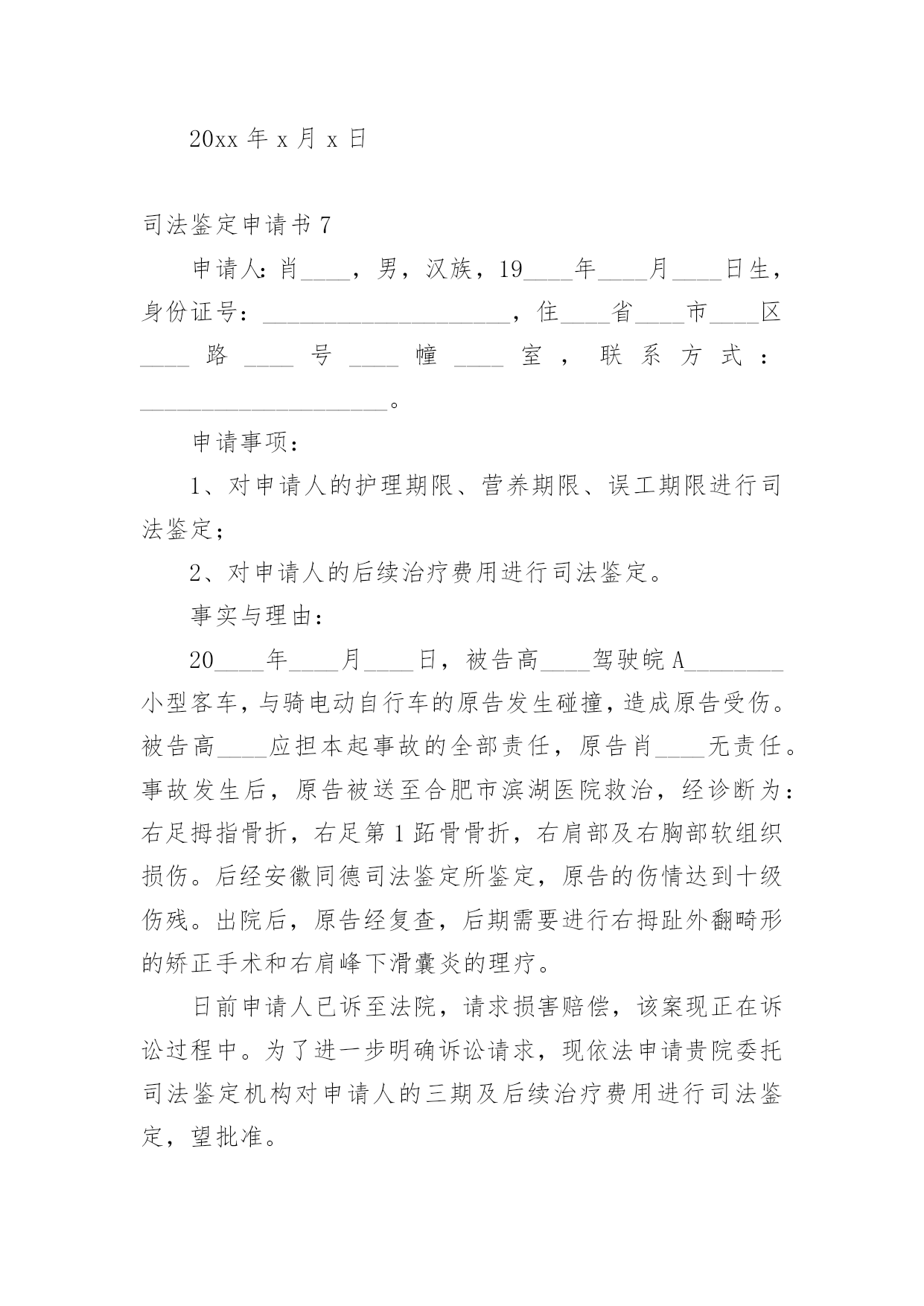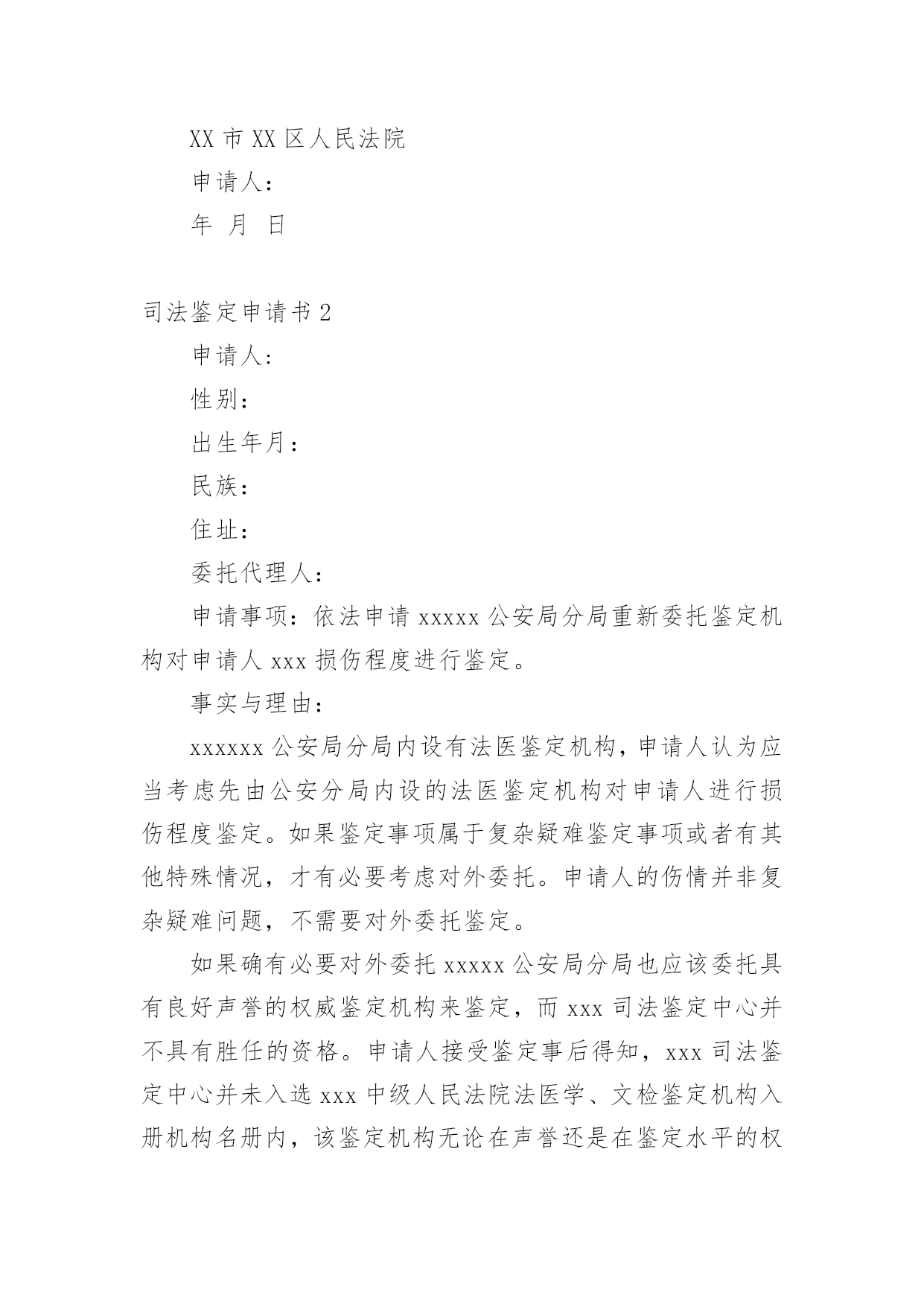 司法鉴定申请书司法鉴定申请书(集合15篇)在一步步向前发展的社会中,申请书使用的次数愈发增长,在写作上,申请书也具有一定的格式。大家知道申请书的格式吗?以下是小编为大家整理的司法鉴定申请书,欢迎阅读,希望大家能够喜欢。司法鉴定申请书1申请人:某某某,男,XXXX年XX月XX日出生,汉族,住XX市XX区XX路XX号楼XX单元XX室,电话:86763XXX委托代理人:XXX被申请人:XXX,女,XXXX年XX月XX日出生,汉族,住XX市XX区XX路XX号楼XX单元XX室,电话:1366195XXXX请求事项:请求法院依法指定司法鉴定机构对被申请人进行司法精神病鉴定事实和理由被申请人诉申请人离婚纠纷一案中,因被申请人患有精神分裂症,系无民事行为能力人,其精神健康状况直接关系到本案的实体审理以及被申请人对其代理律师的授权是否有效,故依法向贵院提出司法精神病鉴定申请,以便查清相关事实,请予批准。此致XX市XX区人民法院申请人:年月日司法鉴定申请书2申请人:性别:出生年月:民族:住址:委托代理人:申请事项:依法申请xxxxx公安局分局重新委托鉴定机构对申请人xxx损伤程度进行鉴定。事实与理由:xxxxxx公安局分局内设有法医鉴定机构,申请人认为应当考虑先由公安分局内设的法医鉴定机构对申请人进行损伤程度鉴定。如果鉴定事项属于复杂疑难鉴定事项或者有其他特殊情况,才有必要考虑对外委托。申请人的伤情并非复杂疑难问题,不需要对外委托鉴定。如果确有必要对外委托xxxxx公安局分局也应该委托具有良好声誉的权威鉴定机构来鉴定,而xxx司法鉴定中心并不具有胜任的资格。申请人接受鉴定事后得知,xxx司法鉴定中心并未入选xxx中级人民法院法医学、文检鉴定机构入册机构名册内,该鉴定机构无论在声誉还是在鉴定水平的权威性方面都是不入流的鉴定机构,其不正规的做事风格一度受到业界诟病,其权威性并未得到司法机关、保险公司、律师事务所、受害人等广泛认可。申请人认为鉴定涉及刑事责任追究,xxxxx公安局灞桥分局委托的司法鉴定中心对鉴定申请人损伤程度鉴定考虑不周,应重新委托鉴定机构鉴定。xx司法鉴定中心向申请人收取司法鉴定费用1000元整,远远超过法律规定的费用标准。根据《司法鉴定收费管理办法》的相关规定,损伤程度鉴定,300/700,只涉及体表损伤程度鉴定的,每例300元。含活体检验、活体照相,不含医学辅助检查费用。xxx司法鉴定中心向申请人超标准收取1000元整,属于违法违规行为,这种行为绝不能姑息,xxxxx公安分局应另行委托正规合法的鉴定机构重新鉴定。xxx司法鉴定中心做出的鉴定意见不客观、不全面、不合法,不公正,申请人不予认可。首先,鉴定意见认为只构成轻微伤,与事实不符,申请人原始病历及检查资料明确显示申请人肋骨骨折两处以上(双侧5、6前肋骨折,断端少量骨痂形成),这正是此次伤害的受伤部位,根据xxxx年x月x日《人体损伤程度鉴定标准》申请人损伤程度足以鉴定为轻伤,xxx司法鉴定中心对于原始病历及检查单视而不见,最终鉴定为轻微伤与事实不符;其次,鉴定意见中对于原始病历中陈述的肺挫伤等多处伤害部位并没有做出损伤程度鉴定,鉴定意见不全面,这显然不符合《司法鉴定程序通则》对鉴定文书的严格要求。再次,鉴定没有针对性,方法不正确,鉴定中的新的检查没有针对原始病历材料及检查中较重的构成轻伤的的“双侧5、6前肋骨折,断端少量骨痂形成”这一损伤进行排查,仅仅因为之后的简单检查而否定原始病历及检查单效力,这种检查和比对方法显然是不正确的,不符合《法医临床检验规范》要求。综上所述,申请人的损伤程度已经构成轻伤,为维护申请人合法权益,特申请重新委托司法鉴定,望批准。此致xxxxx市公安局分局申请人:xxxxxxx年xx月xx日司法鉴定申请书3申请人:_________________,女,_____族,__________年_____月_____日出生,住__________,电话:_________________申请事项:请求对医院医疗过错进行鉴定,如存在过错请确定参与度。事实理由:申请人诉__________区医院医疗纠纷一案已经贵院受理,本案已经医疗事故鉴定,鉴定结论虽为不构成医疗事故,但从分析意见中可以明确医院的医疗行为存在严重过错。申请人也坚持认为__________区医院的治疗行为存在医疗过错,今为查明案件事实,维护申请人合法权益,根据《最高人民法院关于民事诉讼证据的若干规定》第二十七条第四项、《高级人民法院关于审理医疗损害赔偿纠纷案件若干问题的意见》第16条之规定特申请进行司法过错鉴定,请予准许。此致__________区人民法院申请人:______________申请日期:_________________司法鉴定申请书4申请人:______________被申请人: