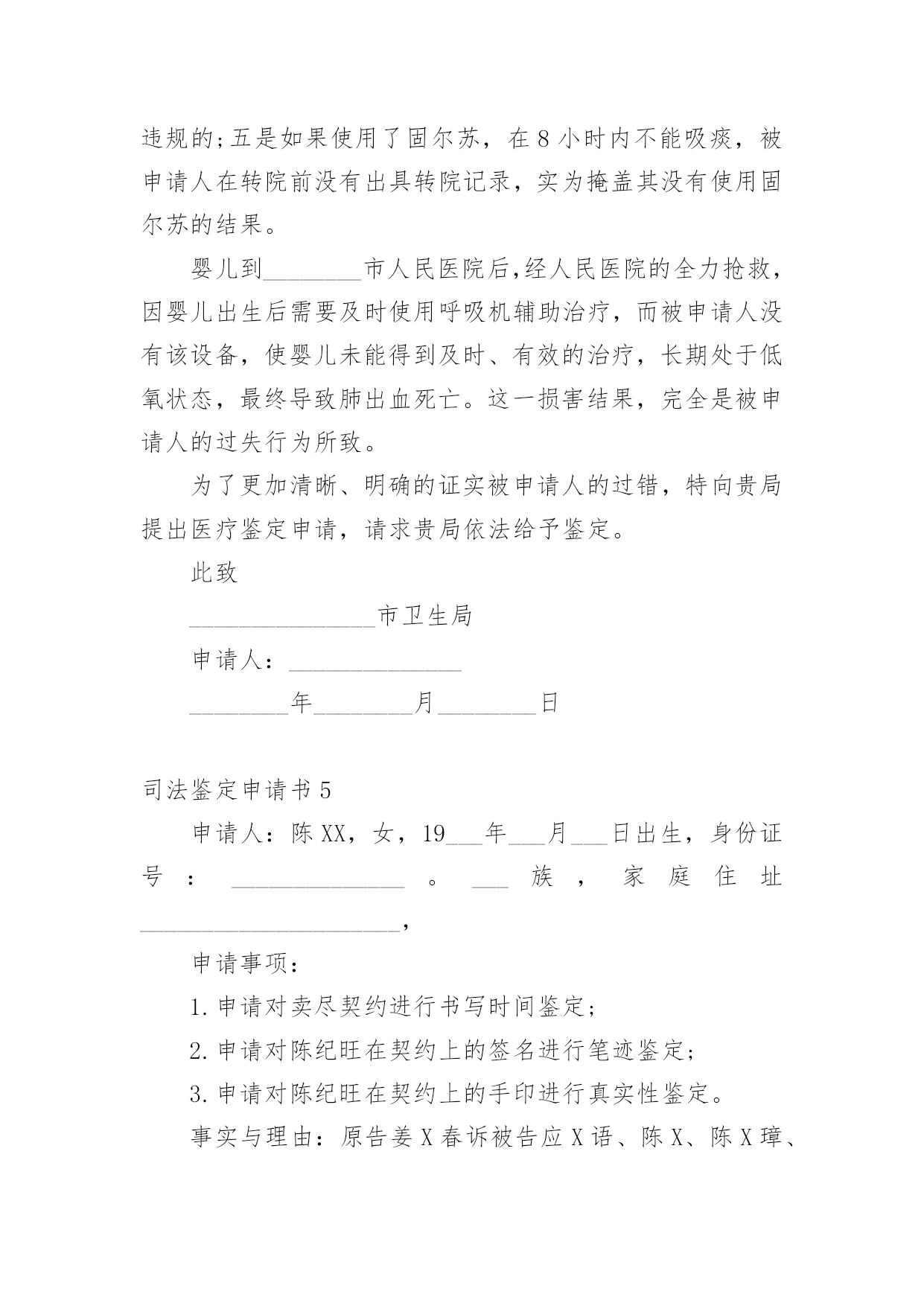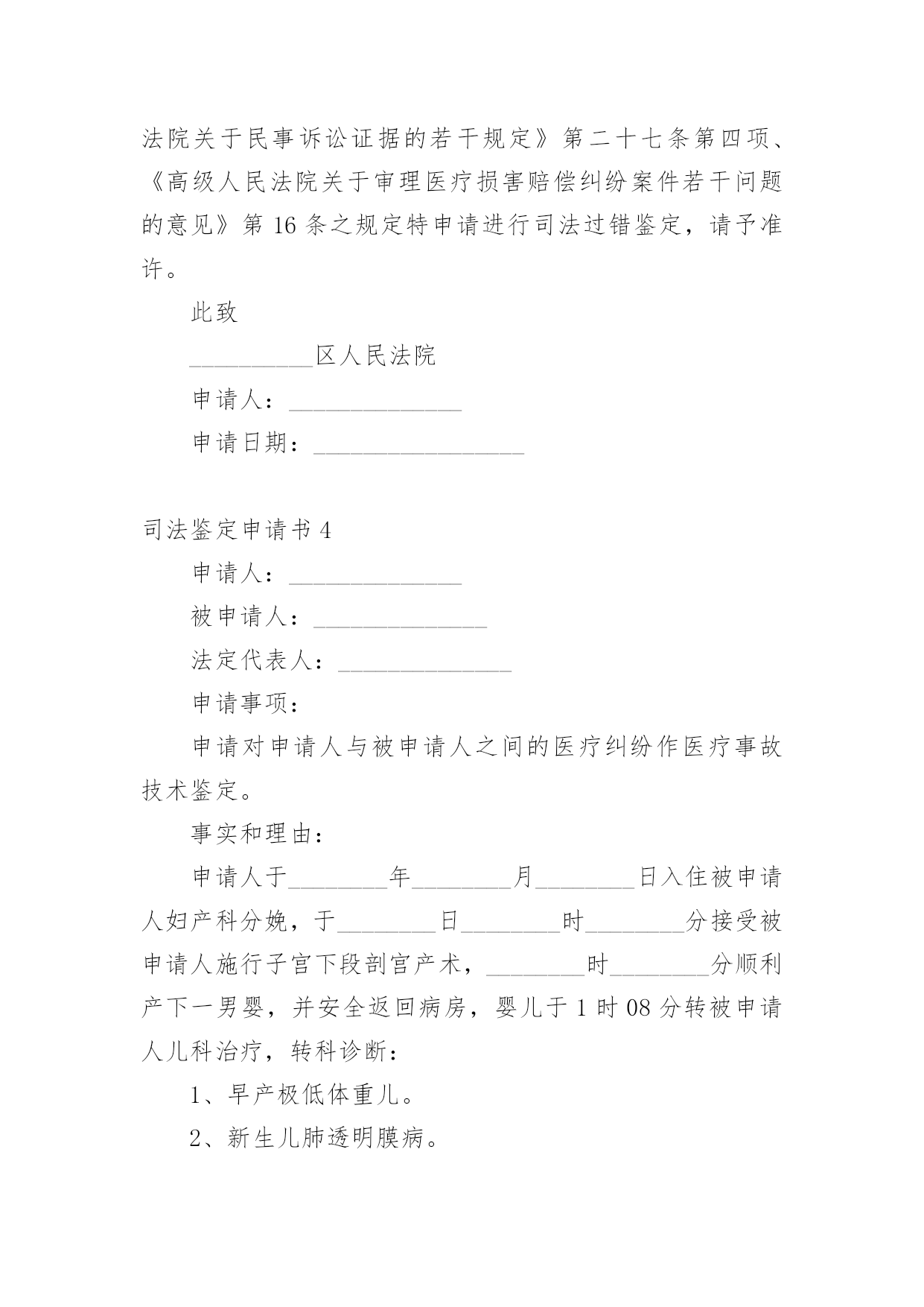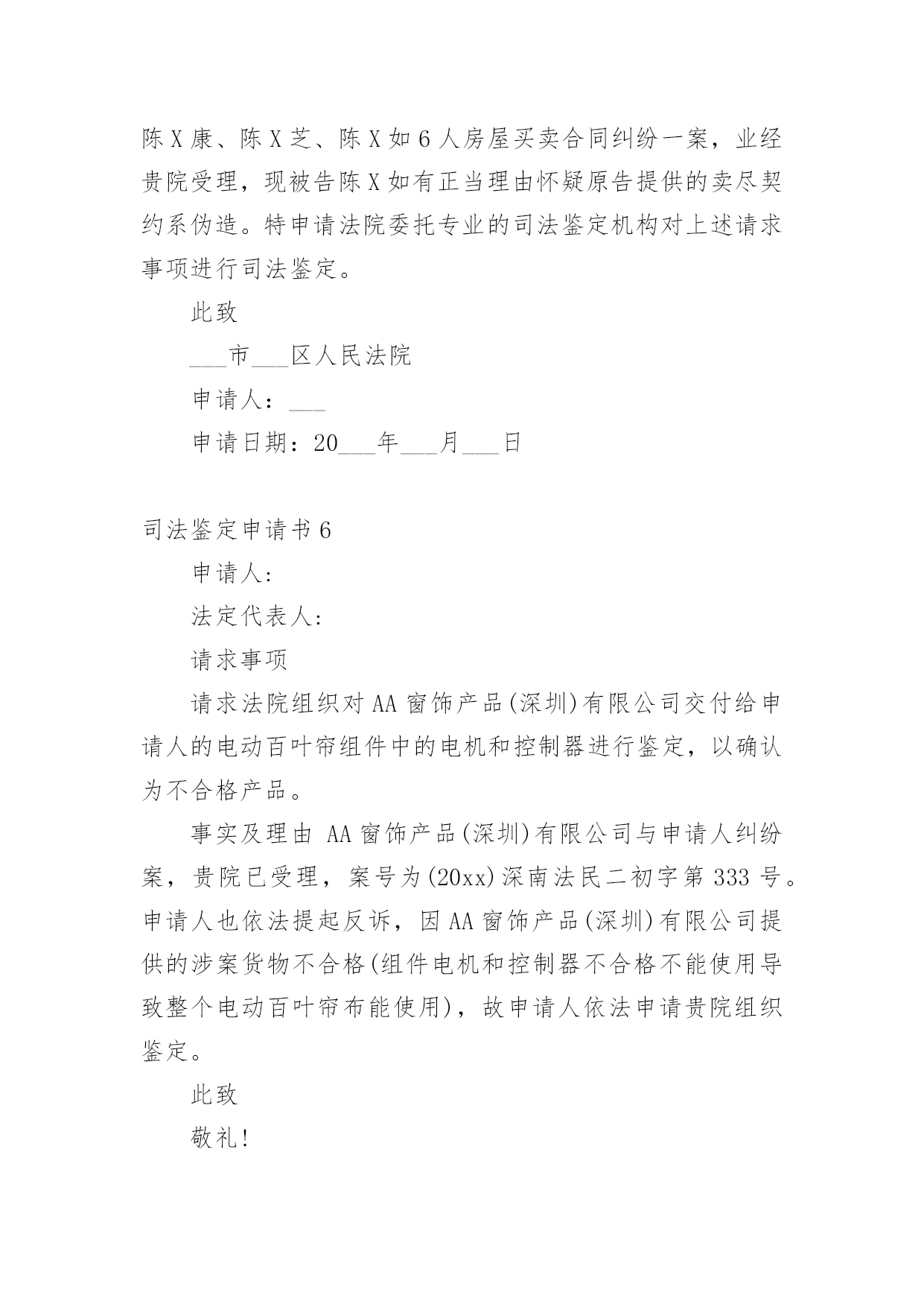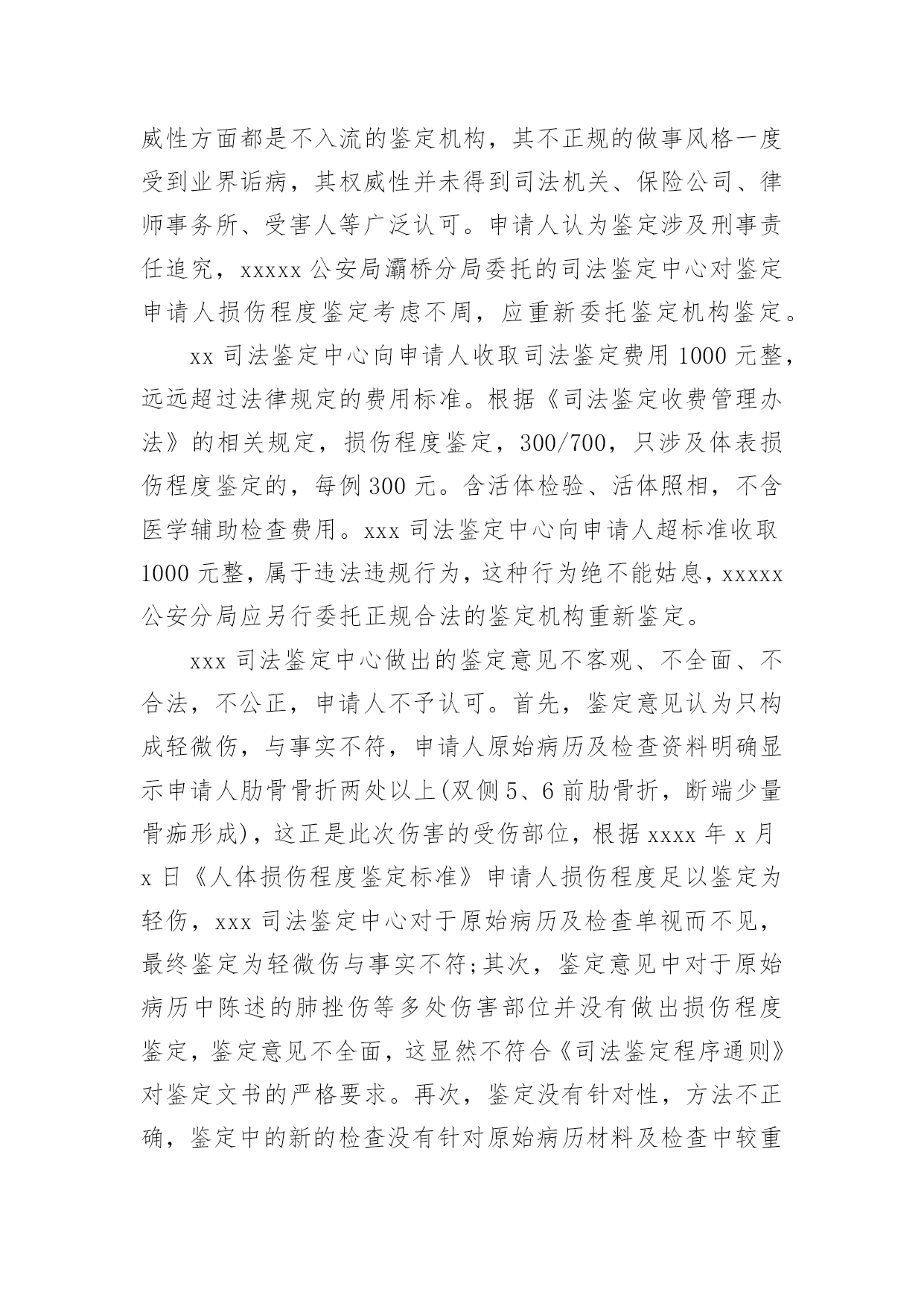 司法鉴定申请书司法鉴定申请书(集合15篇)在一步步向前发展的社会中,申请书使用的次数愈发增长,在写作上,申请书也具有一定的格式。大家知道申请书的格式吗?以下是小编为大家整理的司法鉴定申请书,欢迎阅读,希望大家能够喜欢。司法鉴定申请书1申请人:某某某,男,XXXX年XX月XX日出生,汉族,住XX市XX区XX路XX号楼XX单元XX室,电话:86763XXX委托代理人:XXX被申请人:XXX,女,XXXX年XX月XX日出生,汉族,住XX市XX区XX路XX号楼XX单元XX室,电话:1366195XXXX请求事项:请求法院依法指定司法鉴定机构对被申请人进行司法精神病鉴定事实和理由被申请人诉申请人离婚纠纷一案中,因被申请人患有精神分裂症,系无民事行为能力人,其精神健康状况直接关系到本案的实体审理以及被申请人对其代理律师的授权是否有效,故依法向贵院提出司法精神病鉴定申请,以便查清相关事实,请予批准。此致XX市XX区人民法院申请人:年月日司法鉴定申请书2申请人:性别:出生年月:民族:住址:委托代理人:申请事项:依法申请xxxxx公安局分局重新委托鉴定机构对申请人xxx损伤程度进行鉴定。事实与理由:xxxxxx公安局分局内设有法医鉴定机构,申请人认为应当考虑先由公安分局内设的法医鉴定机构对申请人进行损伤程度鉴定。如果鉴定事项属于复杂疑难鉴定事项或者有其他特殊情况,才有必要考虑对外委托。申请人的伤情并非复杂疑难问题,不需要对外委托鉴定。如果确有必要对外委托xxxxx公安局分局也应该委托具有良好声誉的权威鉴定机构来鉴定,而xxx司法鉴定中心并不具有胜任的资格。申请人接受鉴定事后得知,xxx司法鉴定中心并未入选xxx中级人民法院法医学、文检鉴定机构入册机构名册内,该鉴定机构无论在声誉还是在鉴定水平的权威性方面都是不入流的鉴定机构,其不正规的做事风格一度受到业界诟病,其权威性并未得到司法机关、保险公司、律师事务所、受害人等广泛认可。申请人认为鉴定涉及刑事责任追究,xxxxx公安局灞桥分局委托的司法鉴定中心对鉴定申请人损伤程度鉴定考虑不周,应重新委托鉴定机构鉴定。xx司法鉴定中心向申请人收取司法鉴定费用1000元整,远远超过法律规定的费用标准。根据《司法鉴定收费管理办法》的相关规定,损伤程度鉴定,300/700,只涉及体表损伤程度鉴定的,每例300元。含活体检验、活体照相,不含医学辅助检查费用。xxx司法鉴定中心向申请人超标准收取1000元整,属于违法违规行为,这种行为绝不能姑息,xxxxx公安分局应另行委托正规合法的鉴定机构重新鉴定。xxx司法鉴定中心做出的鉴定意见不客观、不全面、不合法,不公正,申请人不予认可。首先,鉴定意见认为只构成轻微伤,与事实不符,申请人原始病历及检查资料明确显示申请人肋骨骨折两处以上(双侧5、6前肋骨折,断端少量骨痂形成),这正是此次伤害的受伤部位,根据xxxx年x月x日《人体损伤程度鉴定标准》申请人损伤程度足以鉴定为轻伤,xxx司法鉴定中心对于原始病历及检查单视而不见,最终鉴定为轻微伤与事实不符;其次,鉴定意见中对于原始病历中陈述的肺挫伤等多处伤害部位并没有做出损伤程度鉴定,鉴定意见不全面,这显然不符合《司法鉴定程序通则》对鉴定文书的严格要求。再次,鉴定没有针对性,方法不正确,鉴定中的新的检查没有针对原始病历材料及检查中较重的构成轻伤的的“双侧5、6前肋骨折,断端少量骨痂形成”这一损伤进行排查,仅仅因为之后的简单检查而否定原始病历及检查单效力,这种检查和比对方法显然是不正确的,不符合《法医临床检验规范》要求。综上所述,申请人的损伤程度已经构成轻伤,为维护申请人合法权益,特申请重新委托司法鉴定,望批准。此致xxxxx市公安局分局申请人:xxxxxxx年xx月xx日司法鉴定申请书3申请人:_________________,女,_____族,__________年_____月_____日出生,住__________,电话:_________________申请事项:请求对医院医疗过错进行鉴定,如存在过错请确定参与度。事实理由:申请人诉__________区医院医疗纠纷一案已经贵院受理,本案已经医疗事故鉴定,鉴定结论虽为不构成医疗事故,但从分析意见中可以明确医院的医疗行为存在严重过错。申请人也坚持认为__________区医院的治疗行为存在医疗过错,今为查明案件事实,维护申请人合法权益,根据《最高人民法院关于民事诉讼证据的若干规定》第二十七条第四项、《高级人民法院关于审理医疗损害赔偿纠纷案件若干问题的意见》第16条之规定特申请进行司法过错鉴定,请予准许。此致__________区人民法院申请人:______________申请日期:_________________司法鉴定申请书4申请人:______________被申请人: