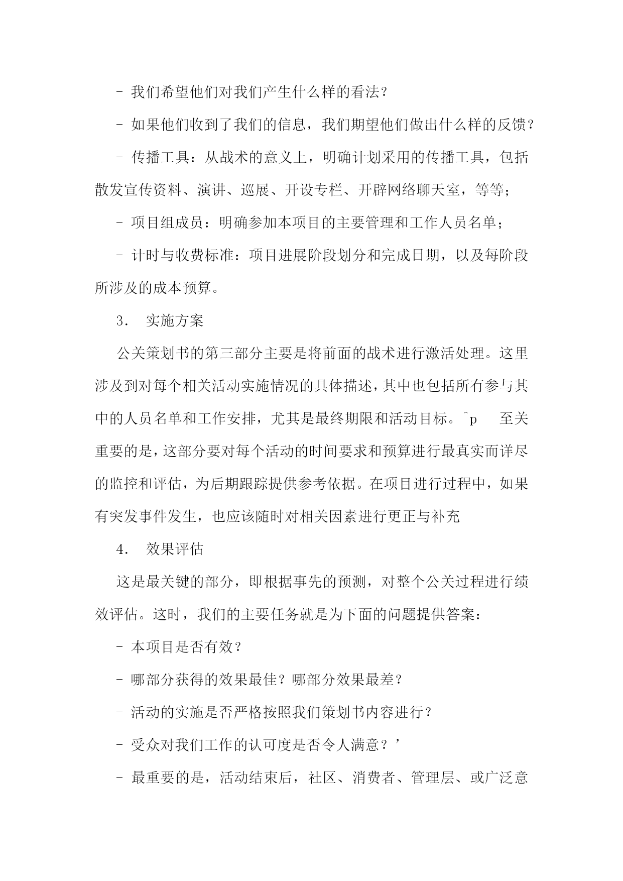 公共关系活动策划方案(优秀6篇)公共关系策划书篇一a:公关策划书包括:1.背景分析:这部分主要目的在于就公关传播中存在的问题进行陈述与分析,并阐明公关计划的首要目标。这部分陈述是制定项目策划案和实施计划的基础。背景分析中可以包括以下几方面,如目标受众、最新调查结果、企业立场、行业发展历史、以及要实现既定目标需要克服的障碍,等等。在公关策划书中,我们可以将最终的公关传播目标分成几个小目标,每个小目标都要能够回答同一个问题:我们希望获得什么样的结果?[2.项目策划书策划书的第二部分就是准备公关项目策划书的制定,这将为我们有效解决问题提供一个大的框架。这部分主要是从战略角度对策划案进行阐述,内容包括实现传播目标所必须采取的方法和手段。虽然每一份公关策划案的内容都不尽相同,但通常情况下,它应该包括以下几部分:-任务实施范围和目标:也就是对任务性质的描述,要明确项目要实现的目标是什么;-目标受众:明确目标受众群体,并根据某一标准将其分成几组,以便于管理;-调研方法:明确将采用的具体的调查手段;-主要信息:明确主要诉求。在确定诉求之前,不妨先问自己这样几个问题:-我们想向受众传达什么信息?-我们希望他们对我们产生什么样的看法?-如果他们收到了我们的信息,我们期望他们做出什么样的反馈?-传播工具:从战术的意义上,明确计划采用的传播工具,包括散发宣传资料、演讲、巡展、开设专栏、开辟网络聊天室,等等;-项目组成员:明确参加本项目的主要管理和工作人员名单;-计时与收费标准:项目进展阶段划分和完成日期,以及每阶段所涉及的成本预算。3.实施方案公关策划书的第三部分主要是将前面的战术进行激活处理。这里涉及到对每个相关活动实施情况的具体描述,其中也包括所有参与其中的人员名单和工作安排,尤其是最终期限和活动目标。^p至关重要的是,这部分要对每个活动的时间要求和预算进行最真实而详尽的监控和评估,为后期跟踪提供参考依据。在项目进行过程中,如果有突发事件发生,也应该随时对相关因素进行更正与补充4.效果评估这是最关键的部分,即根据事先的预测,对整个公关过程进行绩效评估。这时,我们的主要任务就是为下面的问题提供答案:-本项目是否有效?-哪部分获得的效果最佳?哪部分效果最差?-活动的实施是否严格按照我们策划书内容进行?-受众对我们工作的认可度是否令人满意?’-最重要的是,活动结束后,社区、消费者、管理层、或广泛意义上的公众,是否像我们最初策划时所期望的那样,对我们的态度有所改观?b:公关策划范文某公司五周年庆典活动策划(3862字)一、调查与策划策划一个成功的公关活动要考虑许多因素。我们公司五周年庆典活动是这样策划实施的:创新有新意的活动才有好的效果。在构思公司五周年庆典活动方案时,我们设计的大致构架是:以公司全体员工上街拜访公司的所有客户和广大消费者为开头,晚上在西湖上施放烟火,感谢全体市民。为了使施放烟火成为可能,我们先后设计了三套方案。时机时机往往会影响到活动的效果,时机选择得不好,活动就达不到预期的效果,如果抓住了适当的时机,活动就会显得有声势。我们把活动时间定在11月8日。一方面11月8日是公司的成立纪念日,如果这个庆典活动办好了,既可以利用这个时机来提高员的士气,树立公司的良好印象,又可以加深公众对公司及其产品的良好印象,他们会逐渐地把11月8日看成是一个特别的日子,使我们的客户和广大消费者与我们共同分享欢乐,这是一个很好的感情融和手段。地点室内活动的地点比较容易确定,比较困难的是确定室外活动的地点。在确定室外活动地点的时候要考虑诸多方面的问题,如交通,安全,观赏性、场内设施、人数与场内空间的比例、气象、通讯、电力。照明等等。对活动地点几经选择,最后确定在靠近西湖的一个公园内,这个公园地处风景区的繁华地带,可以吸引公众来观霞。内容活动是手段,目的是让公众接受活动中所包含的意图。这样就要精心设计活动的内容,使活动既能充分包含设计意图,又容易让大众接受。活动内容我们是这样设计的:1、11月8,9日两天,公司组成80多对拜访小组,分别拜访全市3400家客户,征求他们的意见,感谢他们一年来对公司业务的大力支持。2、11月8日一天,派出四辆广告送货车,分别慰问全市的交警,感谢他们长期对公司的支持和为全市交通所作出的贡献;3、11月9日,在全市20个点开展现调赠送活动,并向广大消费者发放感谢信,以感谢广大消费者对公司的厚爱;4、11月9日晚,举办庆祝活动,进行员工卡拉ok比赛,并评出优秀员工家属,公司领导感谢广大员工和员工家属为公司发展所作出的努力。晚会结束后,施放烟火,与全市人民同乐。媒介举办一个大型的活动一定要考虑到媒介的作用,通过媒介可以扩大活动的影响范围。利用媒介的关键是要为活动