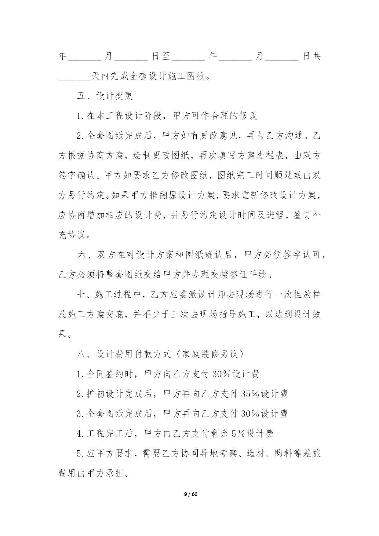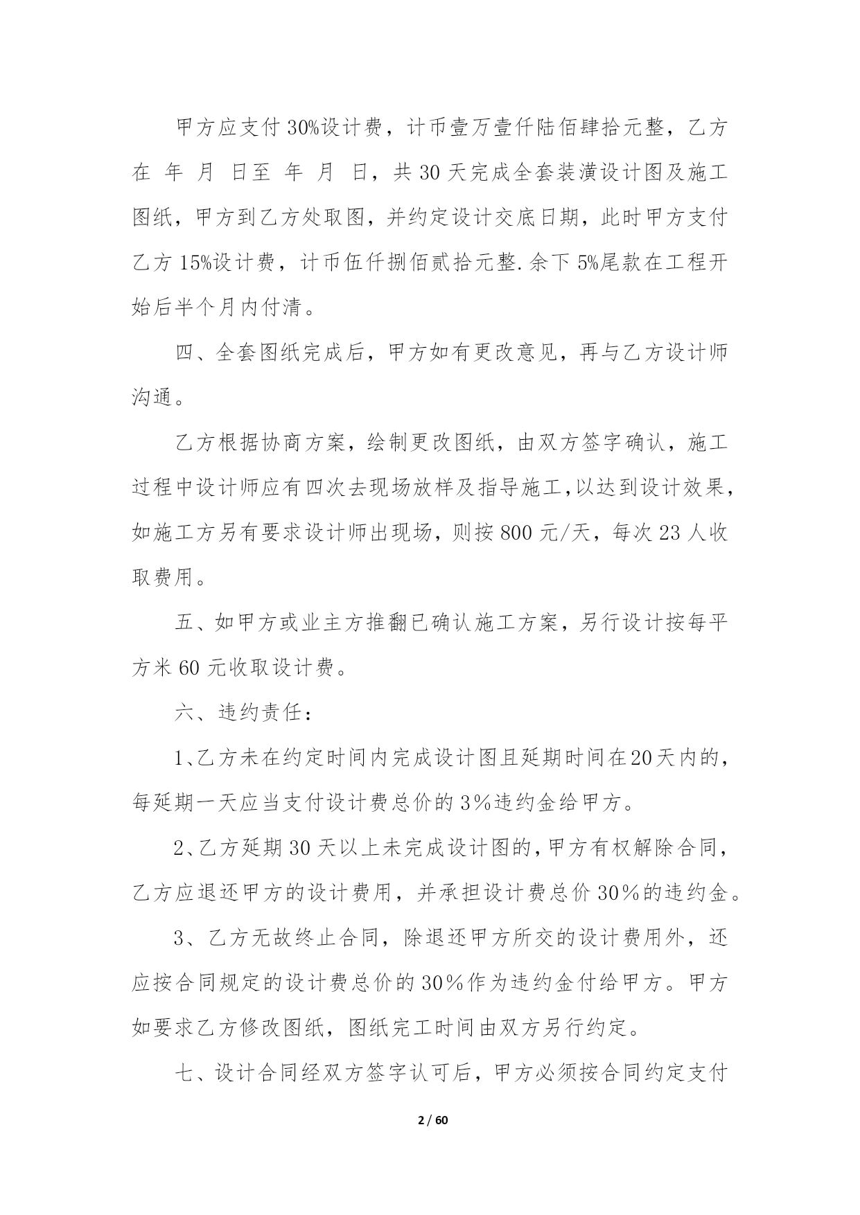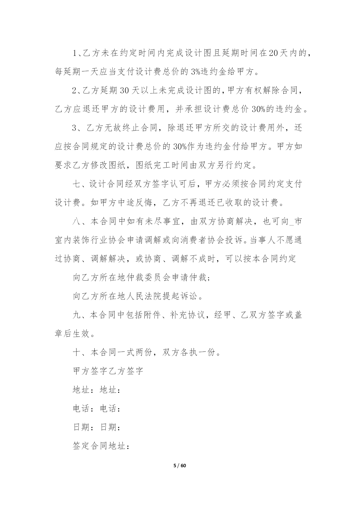 PAGE60/NUMPAGES60室内设计合同(室内装饰设计合同)下面是我编写的室内设计合同(室内装饰设计合同),供大家阅读。室内设计合同1委托方(甲方):有限公司承接方(乙方):空间环境设计工程有限公司根据《中华人民共和国合同法》以及其他有关法律、法规规定的原则,结合室内装饰的特点,经甲、乙双方友好协商,甲方委托乙方承担室内装饰设计,并达成如下协议(包括本合同附件和所有补充合同),以便共同遵守.一、甲方委托室内设计的地址:省公司办公大楼设计内容:一层大厅、三层中型会议室、四层经理办公区、五层大会议室建筑面积约1200平方米。二、经双方协商,甲方委托乙方室内设计,乙方收取设计费共计人民币38800元。计币叁万捌仟捌佰元整。甲方应在年月日首期付50%设计费,计币壹万玖仟肆佰元整。并与乙方约定上门测量的时间和地点(年月日)。乙方设计师在测量后8天内完成平面布置图、顶面布置图和效果图。三、乙方完成初步设计方案后,甲方至乙方处看图,与设计师经过沟通同意,由双方签字确认。甲方应支付30%设计费,计币壹万壹仟陆佰肆拾元整,乙方在年月日至年月日,共30天完成全套装潢设计图及施工图纸,甲方到乙方处取图,并约定设计交底日期,此时甲方支付乙方15%设计费,计币伍仟捌佰贰拾元整.余下5%尾款在工程开始后半个月内付清。四、全套图纸完成后,甲方如有更改意见,再与乙方设计师沟通。乙方根据协商方案,绘制更改图纸,由双方签字确认,施工过程中设计师应有四次去现场放样及指导施工,以达到设计效果,如施工方另有要求设计师出现场,则按800元/天,每次23人收取费用。五、如甲方或业主方推翻已确认施工方案,另行设计按每平方米60元收取设计费。六、违约责任:1、乙方未在约定时间内完成设计图且延期时间在20天内的,每延期一天应当支付设计费总价的3%违约金给甲方。2、乙方延期30天以上未完成设计图的,甲方有权解除合同,乙方应退还甲方的设计费用,并承担设计费总价30%的违约金。3、乙方无故终止合同,除退还甲方所交的设计费用外,还应按合同规定的设计费总价的30%作为违约金付给甲方。甲方如要求乙方修改图纸,图纸完工时间由双方另行约定。七、设计合同经双方签字认可后,甲方必须按合同约定支付设计费。如甲方中途反悔,乙方不再退还已收取的设计费。八、本合同中如有未尽事宜,由双方协商解决,也可向市室内装饰行业协会申请调解或向消费者协会投诉。当事人不愿通过协商、调解解决,或协商、调解不成时,可以按本合同约定(将以下不选定的解决方式划去):(1)向乙方所在地仲裁委员会申请仲裁;(2)向乙方所在地人民法院提起诉讼。九、本合同中包括附件、补充协议,经甲、乙双方签字或盖章后生效。十、本合同一式两份,双方各执一份。甲方签字(盖章):乙方签字(盖章):地址:地址:电话:电话:日期:日期:签定合同地址:室内设计合同2委托方承接方根据《中华人民共和国合同法》以及其他有关法律、法规规定的原则,结合室内装饰的特点,经甲、乙双方友好协商,甲方委托乙方承担室内装饰设计,并达成如下协议,以便共同遵守。一、甲方委托室内设计的地址:设计内容:建筑面积约______平方米。二、经双方协商,甲方委托乙方室内设计,乙方收取设计费共计人民币______元。计币______元整。甲方应在______年______月______日首期付______%设计费,计币____________元整。并与乙方约定上门测量的时间和地点乙方设计师在测量后8天内完成平面布置图、顶面布置图和效果图。三、乙方完成初步设计方案后,甲方至乙方处看图,与设计师经过沟通同意,由双方签字确认。甲方应支付30%设计费,计币壹万壹仟陆佰肆拾元整,乙方在年月日至______年______月______日,共30天完成全套装潢设计图及施工图纸,甲方到乙方处取图,并约定设计交底日期,此时甲方支付乙方15%设计费,计币伍仟捌佰贰拾元整。余下5%尾款在工程开始后半个月内付清。四、全套图纸完成后,甲方如有更改意见,再与乙方设计师沟通。乙方根据协商方案,绘制更改图纸,由双方签字确认,施工过程中设计师应有四次去现场放样及指导施工,以达到设计效果,如施工方另有要求设计师出现场,则按800元/天,每次2—3人收取费用。五、如甲方或业主方推翻已确认施工方案,另行设计按每平方米60元收取设计费。六、违约责任:1、乙方未在约定时间内完成设计图且延期时间在20天内的,每延期一天应当支付设计费总价的3%违约金给甲方。2、乙方延期30天以上未完成设计图的,甲方有权解除合同,乙方应退还甲方的设计费用,并承担设计费总价30%的违约金。3、乙方无故终止合同,除退还甲方所交的设计费用外,还应按合同规定的设计费总价的30%作为违约金付给甲方。甲方如要求乙方修改图纸,图纸完工时间由双方另行约定