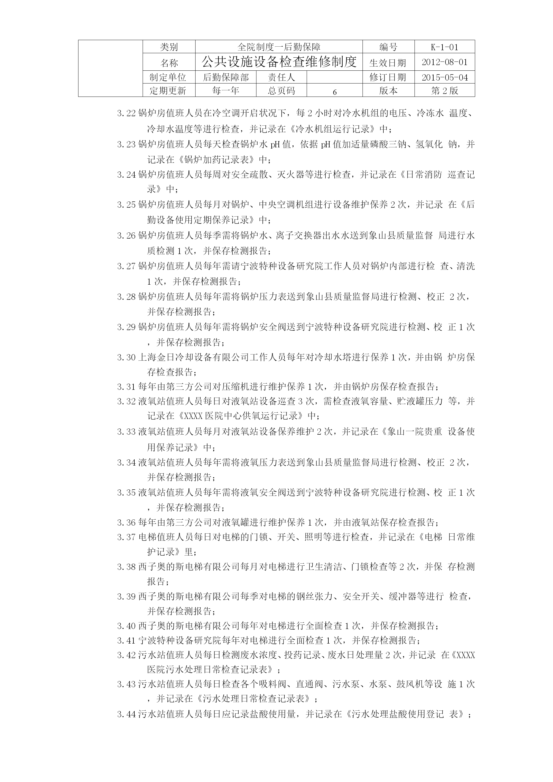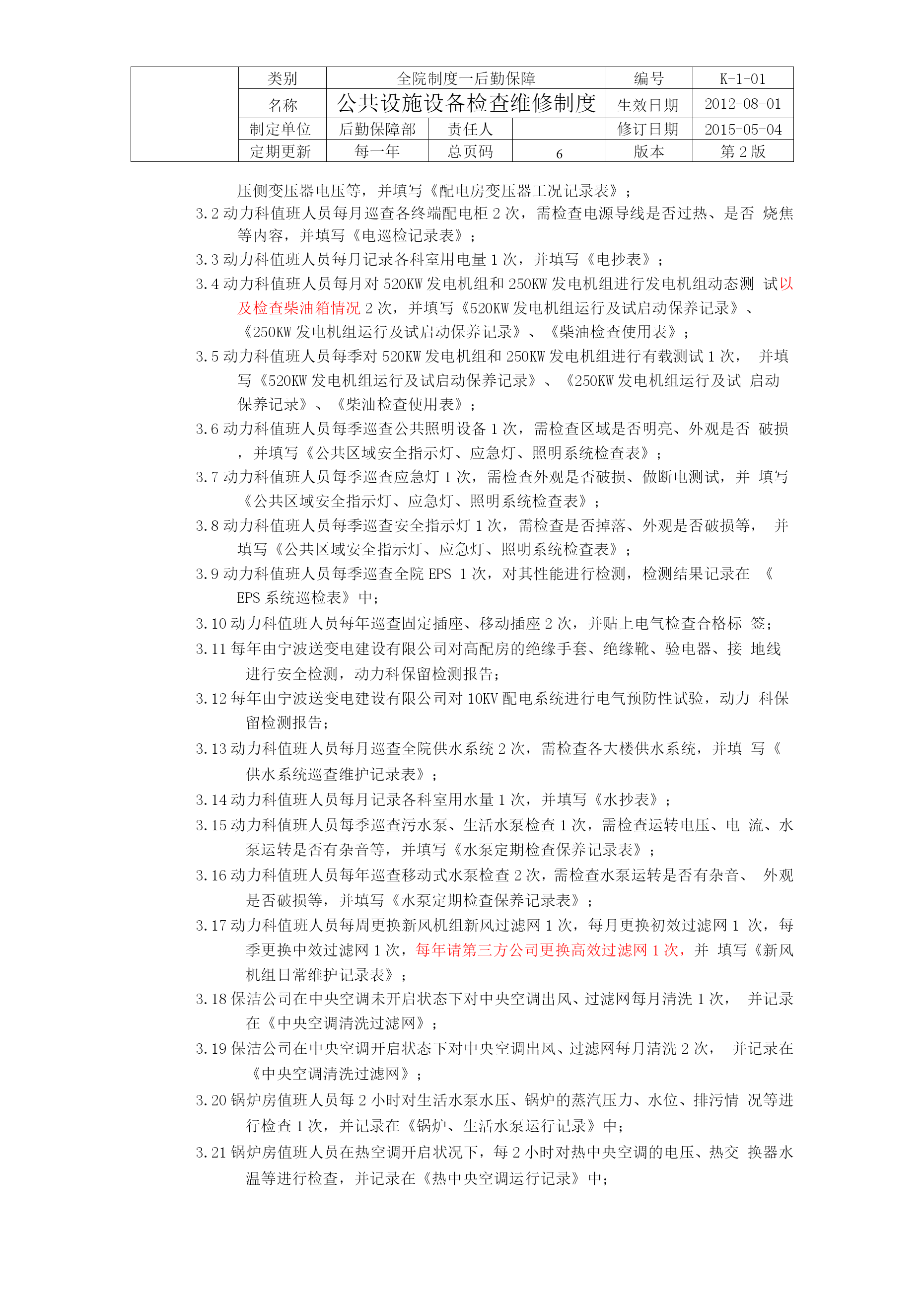 类别全院制度一后勤保障编号K-1-01名称公共设施设备检查维修制度生效日期2012-08-01制定单位后勤保障部责任人修订日期2015-05-04定期更新每一年总页码6版本第2版一目的1医院工作的正常运行离不开安全可靠的公共设施设备,为保障医院公共的设施设备能安全稳定的运行,明确全院公共设施设备的检查、维修周期,规范检查作业程序,特制定本检查程序。二范围1适用范围:全院有使用到公共设施设备的区域2流程范围:发现问题一上报问题一处理问题一维护记录三定义1公用设施系统:是指支持安全医疗所需的基本服务的系统和设备。此类设施包括配电、水、通风和通气、医用气体、管道、供暖、废弃物以及通讯和数据系统。2照明系统包括走廊灯、厕所灯、吸顶灯、LED灯、路灯。3弱电系统指电话、电视。4供水系统包括生活用水、茶水缸、水龙头。四权责1责任科室:后勤保障部五参考文献1法律法规1.1《中华人民共和国特种设备安全法》主席令第4号,2014年2月1日实施。1.2《特种设备安全监察条例》国务院令549号;29年5月1日实施。1.3《特种设备作业人员监督管理办法》质检总局第140号令);实施时间2011.07.011.4《浙江省特种设备安全管理条例》;实施时间23.09.012评价条文1.1依据《JCI国际医院评审标准》第五版,FMS.4。1.2依据《三级综合性医院评审标准实施细则》2011版,第六章医院服务(八、后勤保障管理),6.8.1、6.8.2.1。六政策1动力科负责全院照明系统、高低配电房、弱电系统、供水系统、新风机组、热泵机组、污水处理、锅炉设备、中央空调系统的日常维护和检查。2公共设施设备故障维修流程如下:2.1各科室若发现照明系统、供水系统、中央空调系统、弱电系统发生异常,应立即拨打综合服务中心(6666)电话,并告知具体信息;2.2综合服务中心通知动力科所需维修的地点及内容;2.3动力科维修人员根据情况到总务仓库领取相应耗材,并记录;2.3.1若仓库无存货,动力科维修人员需向申请维修的科室报告具体情况,并由仓库联系商家及时补充材料,材料补充后应及时维修;2.3.2若该材料不是仓库日常配备,则需联系采购员采购相应材料,并通知申请维修科室维修延后,当材料买到后,应及时维修;2.4动力科工作人员去现场解决异常情况;2.5处理完毕后在维修单上写明维修地点、维修时间、维修内容,双方签字。3公共设施设备检查内容如下:3.1动力科值班人员每日巡查配电房变压器2次,需检查高压进线变压器电压、低类别全院制度一后勤保障编号K-1-01名称公共设施设备检查维修制度生效日期2012-08-01制定单位后勤保障部责任人修订日期2015-05-04定期更新每一年总页码6版本第2版压侧变压器电压等,并填写《配电房变压器工况记录表》;3.2动力科值班人员每月巡查各终端配电柜2次,需检查电源导线是否过热、是否烧焦等内容,并填写《电巡检记录表》;3.3动力科值班人员每月记录各科室用电量1次,并填写《电抄表》;3.4动力科值班人员每月对520KW发电机组和250KW发电机组进行发电机组动态测试以及检查柴油箱情况2次,并填写《520KW发电机组运行及试启动保养记录》、《250KW发电机组运行及试启动保养记录》、《柴油检查使用表》;3.5动力科值班人员每季对520KW发电机组和250KW发电机组进行有载测试1次,并填写《520KW发电机组运行及试启动保养记录》、《250KW发电机组运行及试启动保养记录》、《柴油检查使用表》;3.6动力科值班人员每季巡查公共照明设备1次,需检查区域是否明亮、外观是否破损,并填写《公共区域安全指示灯、应急灯、照明系统检查表》;3.7动力科值班人员每季巡查应急灯1次,需检查外观是否破损、做断电测试,并填写《公共区域安全指示灯、应急灯、照明系统检查表》;3.8动力科值班人员每季巡查安全指示灯1次,需检查是否掉落、外观是否破损等,并填写《公共区域安全指示灯、应急灯、照明系统检查表》;3.9动力科值班人员每季巡查全院EPS1次,对其性能进行检测,检测结果记录在《EPS系统巡检表》中;3.10动力科值班人员每年巡查固定插座、移动插座2次,并贴上电气检查合格标签;3.11每年由宁波送变电建设有限公司对高配房的绝缘手套、绝缘靴、验电器、接地线进行安全检测,动力科保留检测报告;3.12每年由宁波送变电建设有限公司对10KV配电系统进行电气预防性试验,动力科保留检测报告;3.13动力科值班人员每月巡查全院供水系统2次,需检查各大楼供水系统,并填写《供水系统巡查维护记录表》;3.14动力科值班人员每月记录各科室用水量1次,并填写《水抄表》;3.15动力科值班人员每季巡查污水泵、