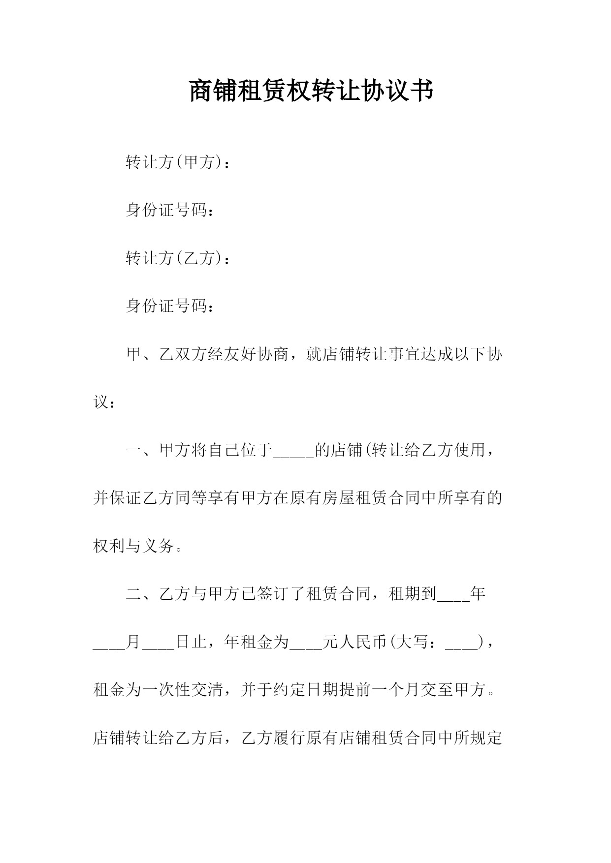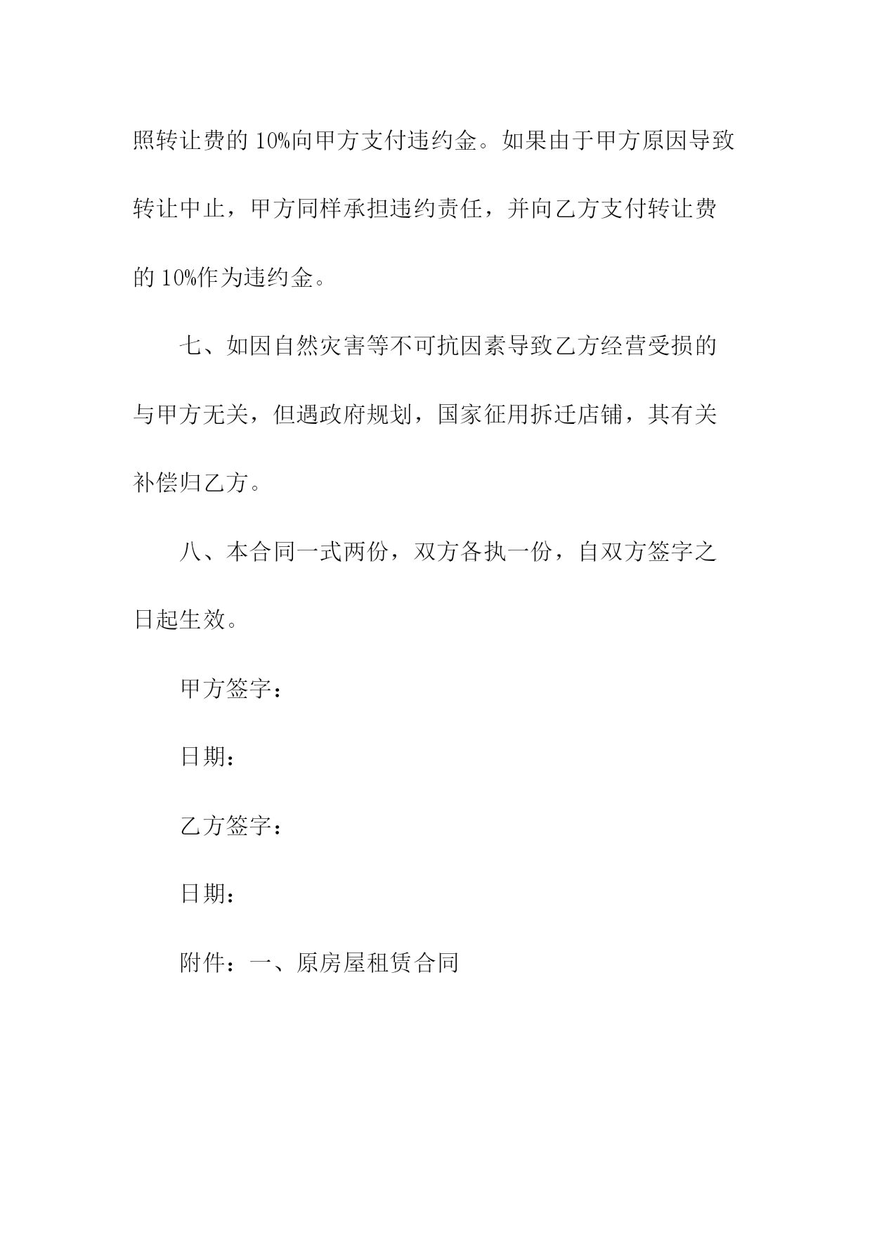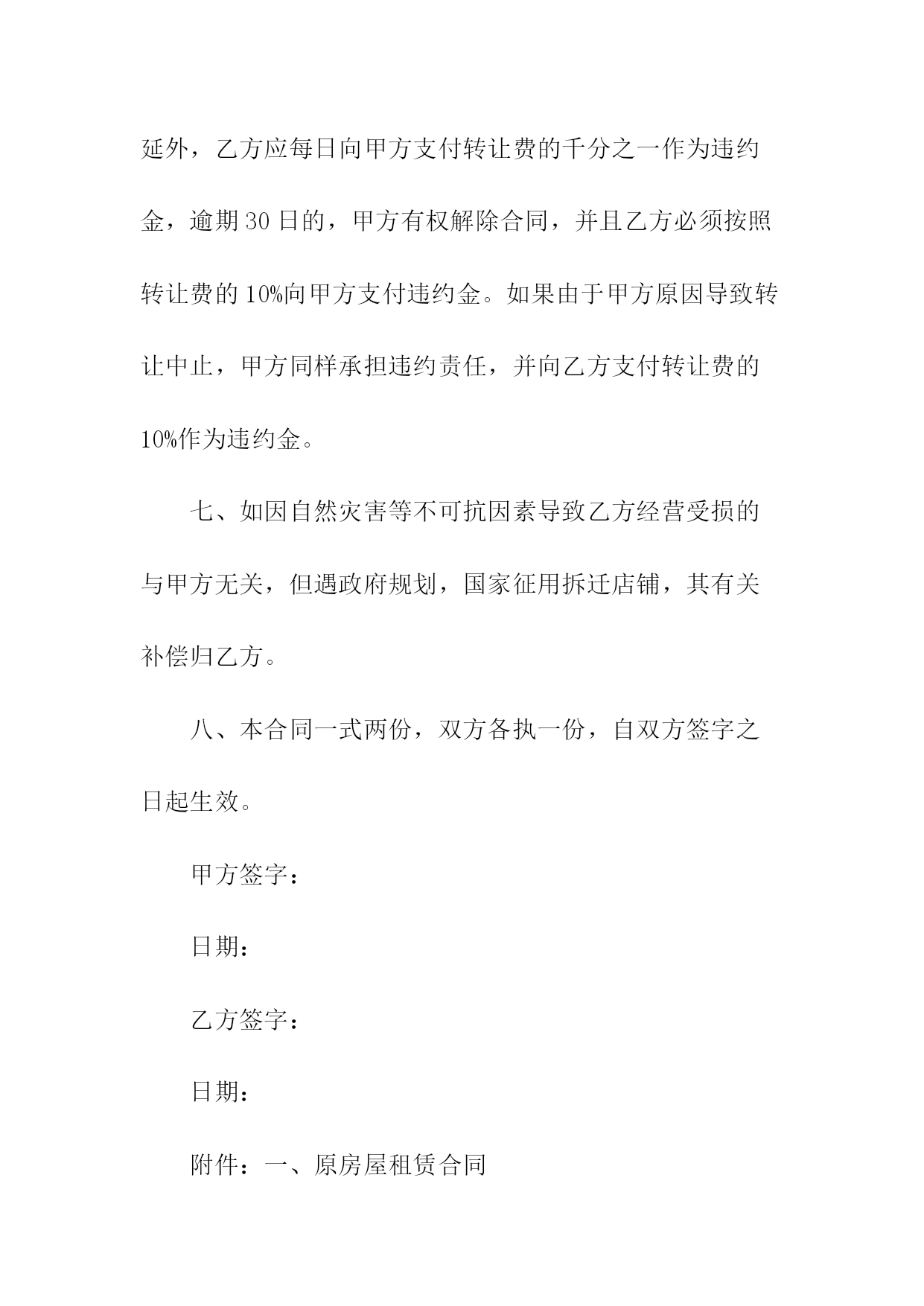 商铺转让协议书转让方(甲方):身份证号码:转让方(乙方):身份证号码:甲、乙双方经友好协商,就店铺转让事宜达成以下协议:一、甲方将自己位于_____的店铺(转让给乙方使用,并保证乙方同等享有甲方在原有房屋租赁合同中所享有的权利与义务。二、乙方与甲方已签订了租赁合同,租期到_____年____月____日止,年租金为____元人民币(大写:____),租金为一次性交清,并于约定日期提前一个月交至甲方。店铺转让给乙方后,乙方履行原有店铺租赁合同中所规定的条款,并且定期交纳租金及该合同所约定的应由甲方交纳的水电费及其他各项费用。三、转让后店铺现有的装修、装饰及其他所有设备全部归乙方所有,租赁期满后房屋装修等不动产归出租方所有,营业设备等动产归乙方(动产与不动产的划分按原有租赁合同执行)。四、乙方在_____年月____日前一次性向甲方支付转让费共计人民币____,(大写:____),上述费用已包括第三条所述的装修、装饰、设备及其他相关费用,此外甲方不得再向乙方索取任何其他费用。五、甲方应该协助乙方办理该店铺的工商营业执照等相关证件的过户手续,但相关费用由乙方负责;乙方接手前该店铺所有的一切债权、债务均由甲方负责;接手后的一切经营行为及产生的债权、债务由乙方负责。六、如乙方逾期交付转让金,除甲方交铺日期相应顺延外,乙方应每日向甲方支付转让费的千分之一作为违约金,逾期____日的,甲方有权解除合同,并且乙方必须按照转让费的10%向甲方支付违约金。如果由于甲方原因导致转让中止,甲方同样承担违约责任,并向乙方支付转让费的10%作为违约金。七、如因自然灾害等不可抗因素导致乙方经营受损的与甲方无关,但遇政府规划,国家征用拆迁店铺,其有关补偿归乙方。八、本合同一式两份,双方各执一份,自双方签字之日起生效。甲方签字:日期:乙方签字:日期:附件:一、原房屋租赁合同商铺租赁权转让协议书转让方(甲方):身份证号码:转让方(乙方):身份证号码:甲、乙双方经友好协商,就店铺转让事宜达成以下协议:一、甲方将自己位于_____的店铺(转让给乙方使用,并保证乙方同等享有甲方在原有房屋租赁合同中所享有的权利与义务。二、乙方与甲方已签订了租赁合同,租期到____年____月____日止,年租金为____元人民币(大写:____),租金为一次性交清,并于约定日期提前一个月交至甲方。店铺转让给乙方后,乙方履行原有店铺租赁合同中所规定的条款,并且定期交纳租金及该合同所约定的应由甲方交纳的水电费及其他各项费用。三、转让后店铺现有的装修、装饰及其他所有设备全部归乙方所有,租赁期满后房屋装修等不动产归出租方所有,营业设备等动产归乙方(动产与不动产的划分按原有租赁合同执行)。四、乙方在____年月日前一次性向甲方支付转让费共计人民币____,(大写:____),上述费用已包括第三条所述的装修、装饰、设备及其他相关费用,此外甲方不得再向乙方索取任何其他费用。五、甲方应该协助乙方办理该店铺的工商营业执照等相关证件的过户手续,但相关费用由乙方负责;乙方接手前该店铺所有的一切债权、债务均由甲方负责;接手后的一切经营行为及产生的债权、债务由乙方负责。六、如乙方逾期交付转让金,除甲方交铺日期相应顺延外,乙方应每日向甲方支付转让费的千分之一作为违约金,逾期30日的,甲方有权解除合同,并且乙方必须按照转让费的10%向甲方支付违约金。如果由于甲方原因导致转让中止,甲方同样承担违约责任,并向乙方支付转让费的10%作为违约金。七、如因自然灾害等不可抗因素导致乙方经营受损的与甲方无关,但遇政府规划,国家征用拆迁店铺,其有关补偿归乙方。八、本合同一式两份,双方各执一份,自双方签字之日起生效。甲方签字:日期:乙方签字:日期:附件:一、原房屋租赁合同商铺转让协议书转让方(甲方):身份证号码:转让方(乙方):身份证号码:甲、乙双方经友好协商,就店铺转让事宜达成以下协议:一、甲方将自己位于_____的店铺(转让给乙方使用,并保证乙方同等享有甲方在原有房屋租赁合同中所享有的权利与义务。二、乙方与甲方已签订了租赁合同,租期到_____年____月____日止,年租金为____元人民币(大写:____),租金为一次性交清,并于约定日期提前一个月交至甲方。店铺转让给乙方后,乙方履行原有店铺租赁合同中所规定的条款,并且定期交纳租金及该合同所约定的应由甲方交纳的水电费及其他各项费用。三、转让后店铺现有的装修、装饰及其他所有设备全部归乙方所有,租赁期满后房屋装修等不动产归出租方所有,营业设备等动产归乙方(动产与不动产的划分按原有租赁合同执行)。四、乙方在_____年月____日前一次性向甲方支付转让费共计人民币____,(大写:____),上述费用已包括第三条所述的装修、装饰、设备及其他相关费用,此外甲方不得再