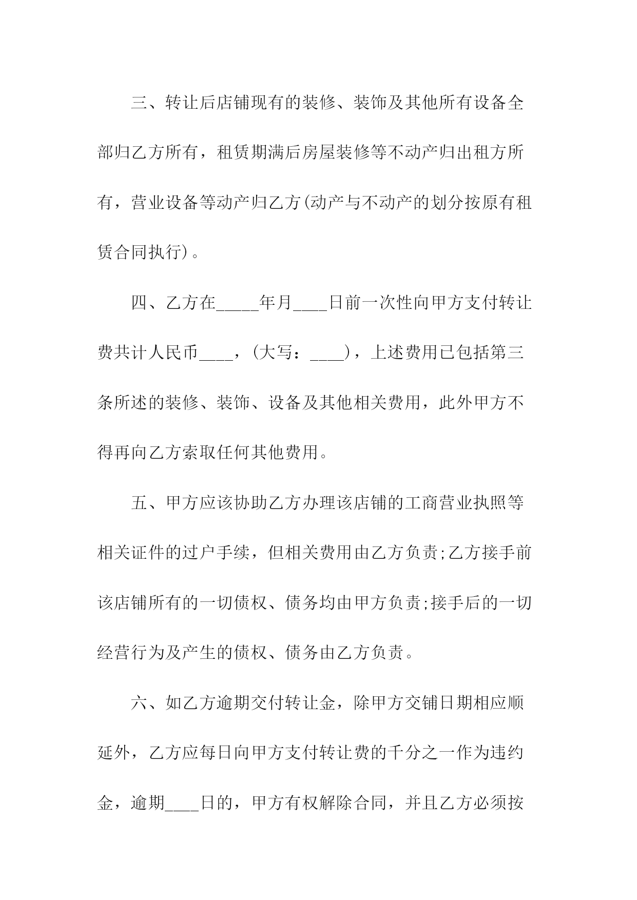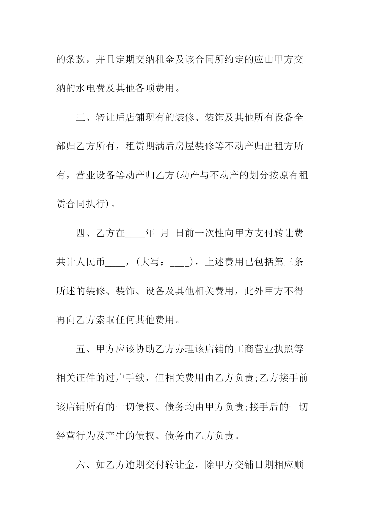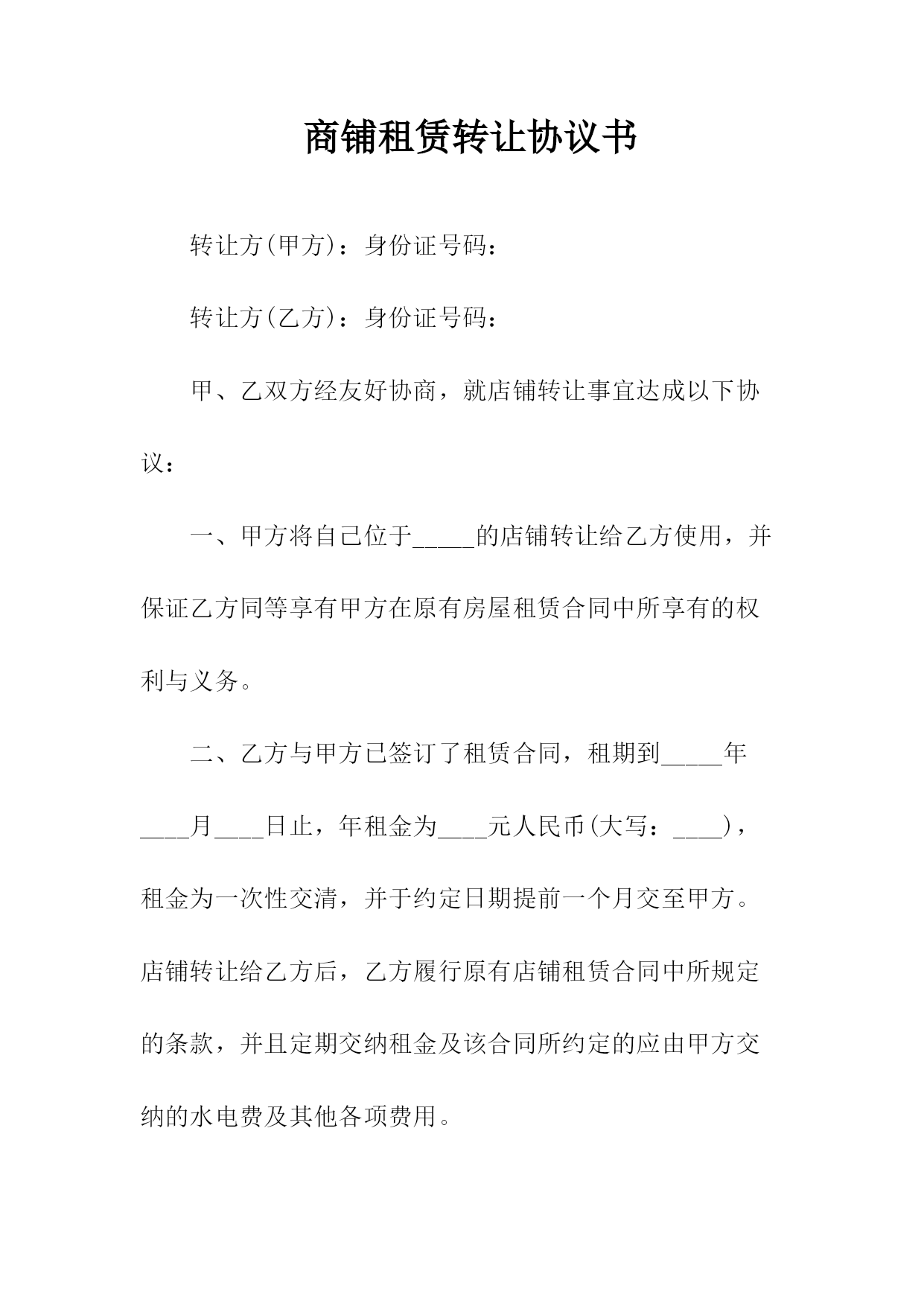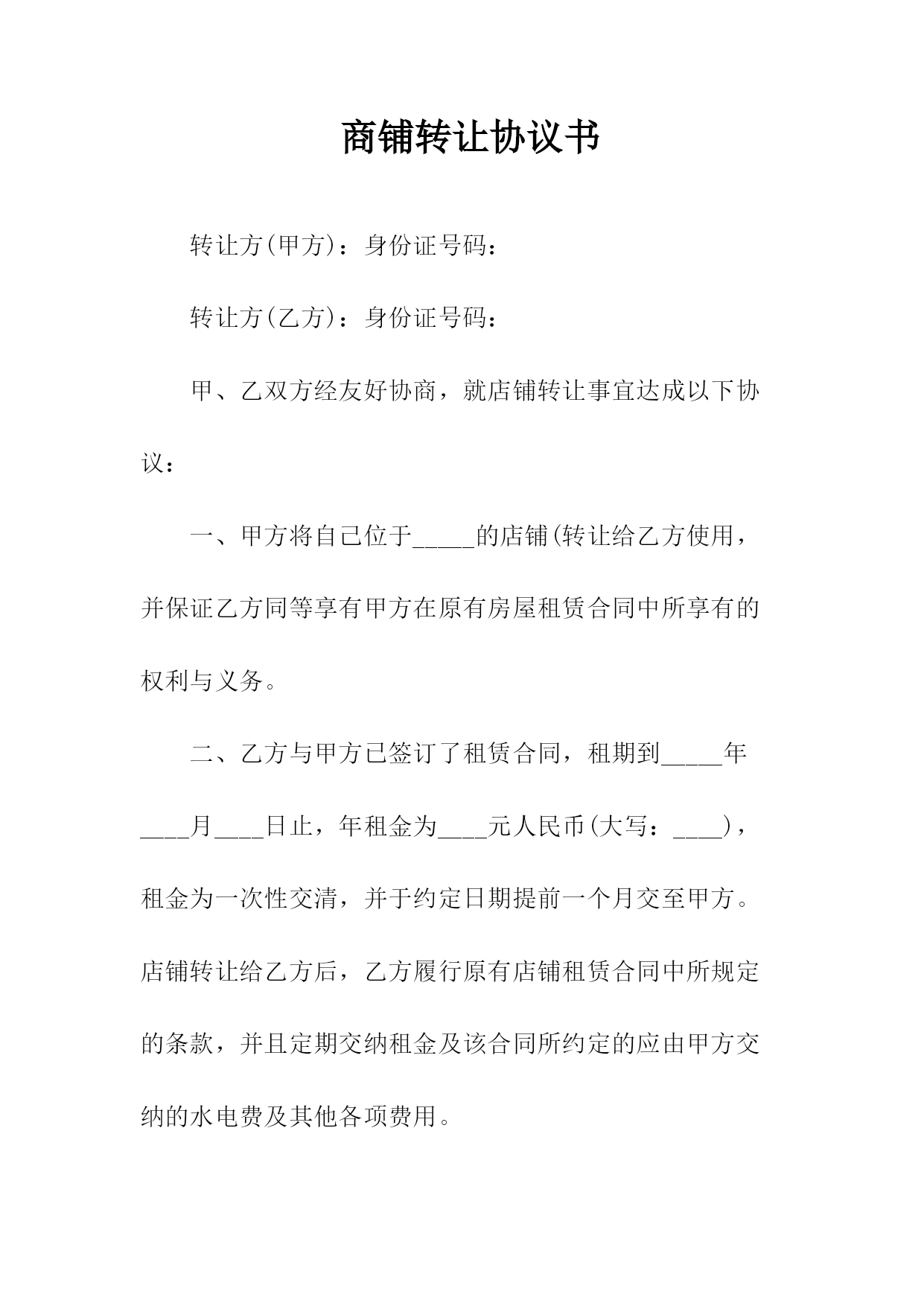 商铺转让协议书转让方(甲方):身份证号码:转让方(乙方):身份证号码:甲、乙双方经友好协商,就店铺转让事宜达成以下协议:一、甲方将自己位于_____的店铺(转让给乙方使用,并保证乙方同等享有甲方在原有房屋租赁合同中所享有的权利与义务。二、乙方与甲方已签订了租赁合同,租期到_____年____月____日止,年租金为____元人民币(大写:____),租金为一次性交清,并于约定日期提前一个月交至甲方。店铺转让给乙方后,乙方履行原有店铺租赁合同中所规定的条款,并且定期交纳租金及该合同所约定的应由甲方交纳的水电费及其他各项费用。三、转让后店铺现有的装修、装饰及其他所有设备全部归乙方所有,租赁期满后房屋装修等不动产归出租方所有,营业设备等动产归乙方(动产与不动产的划分按原有租赁合同执行)。四、乙方在_____年月____日前一次性向甲方支付转让费共计人民币____,(大写:____),上述费用已包括第三条所述的装修、装饰、设备及其他相关费用,此外甲方不得再向乙方索取任何其他费用。五、甲方应该协助乙方办理该店铺的工商营业执照等相关证件的过户手续,但相关费用由乙方负责;乙方接手前该店铺所有的一切债权、债务均由甲方负责;接手后的一切经营行为及产生的债权、债务由乙方负责。六、如乙方逾期交付转让金,除甲方交铺日期相应顺延外,乙方应每日向甲方支付转让费的千分之一作为违约金,逾期____日的,甲方有权解除合同,并且乙方必须按照转让费的10%向甲方支付违约金。如果由于甲方原因导致转让中止,甲方同样承担违约责任,并向乙方支付转让费的10%作为违约金。七、如因自然灾害等不可抗因素导致乙方经营受损的与甲方无关,但遇政府规划,国家征用拆迁店铺,其有关补偿归乙方。八、本合同一式两份,双方各执一份,自双方签字之日起生效。甲方签字:日期:乙方签字:日期:附件:一、原房屋租赁合同商铺租赁权转让协议书转让方(甲方):身份证号码:转让方(乙方):身份证号码:甲、乙双方经友好协商,就店铺转让事宜达成以下协议:一、甲方将自己位于_____的店铺(转让给乙方使用,并保证乙方同等享有甲方在原有房屋租赁合同中所享有的权利与义务。二、乙方与甲方已签订了租赁合同,租期到____年____月____日止,年租金为____元人民币(大写:____),租金为一次性交清,并于约定日期提前一个月交至甲方。店铺转让给乙方后,乙方履行原有店铺租赁合同中所规定的条款,并且定期交纳租金及该合同所约定的应由甲方交纳的水电费及其他各项费用。三、转让后店铺现有的装修、装饰及其他所有设备全部归乙方所有,租赁期满后房屋装修等不动产归出租方所有,营业设备等动产归乙方(动产与不动产的划分按原有租赁合同执行)。四、乙方在____年月日前一次性向甲方支付转让费共计人民币____,(大写:____),上述费用已包括第三条所述的装修、装饰、设备及其他相关费用,此外甲方不得再向乙方索取任何其他费用。五、甲方应该协助乙方办理该店铺的工商营业执照等相关证件的过户手续,但相关费用由乙方负责;乙方接手前该店铺所有的一切债权、债务均由甲方负责;接手后的一切经营行为及产生的债权、债务由乙方负责。六、如乙方逾期交付转让金,除甲方交铺日期相应顺延外,乙方应每日向甲方支付转让费的千分之一作为违约金,逾期30日的,甲方有权解除合同,并且乙方必须按照转让费的10%向甲方支付违约金。如果由于甲方原因导致转让中止,甲方同样承担违约责任,并向乙方支付转让费的10%作为违约金。七、如因自然灾害等不可抗因素导致乙方经营受损的与甲方无关,但遇政府规划,国家征用拆迁店铺,其有关补偿归乙方。八、本合同一式两份,双方各执一份,自双方签字之日起生效。甲方签字:日期:乙方签字:日期:附件:一、原房屋租赁合同商铺转让协议书转让方(甲方):身份证号码:转让方(乙方):身份证号码:甲、乙双方经友好协商,就店铺转让事宜达成以下协议:一、甲方将自己位于_____的店铺(转让给乙方使用,并保证乙方同等享有甲方在原有房屋租赁合同中所享有的权利与义务。二、乙方与甲方已签订了租赁合同,租期到_____年____月____日止,年租金为____元人民币(大写:____),租金为一次性交清,并于约定日期提前一个月交至甲方。店铺转让给乙方后,乙方履行原有店铺租赁合同中所规定的条款,并且定期交纳租金及该合同所约定的应由甲方交纳的水电费及其他各项费用。三、转让后店铺现有的装修、装饰及其他所有设备全部归乙方所有,租赁期满后房屋装修等不动产归出租方所有,营业设备等动产归乙方(动产与不动产的划分按原有租赁合同执行)。四、乙方在_____年月____日前一次性向甲方支付转让费共计人民币____,(大写:____),上述费用已包括第三条所述的装修、装饰、设备及其他相关费用,此外甲方不得再