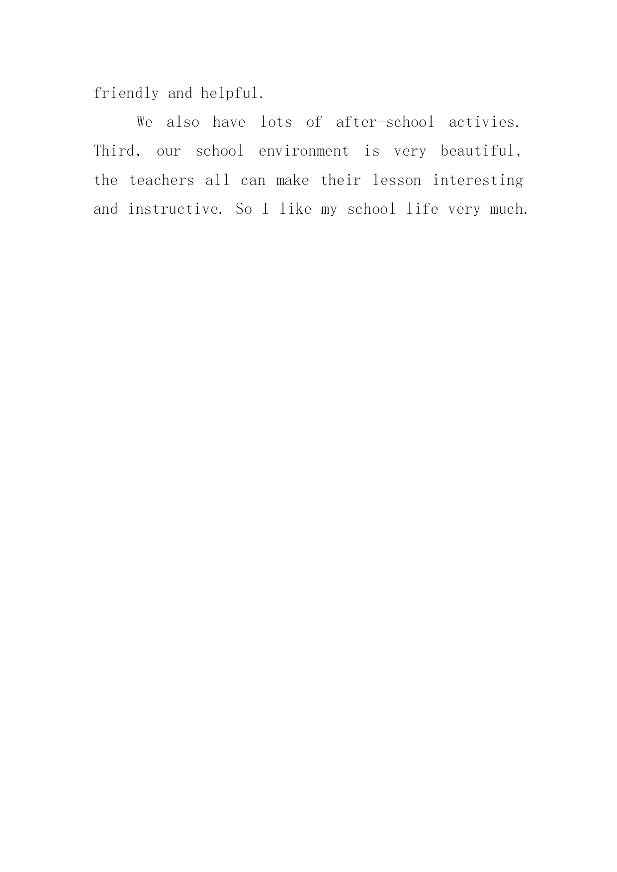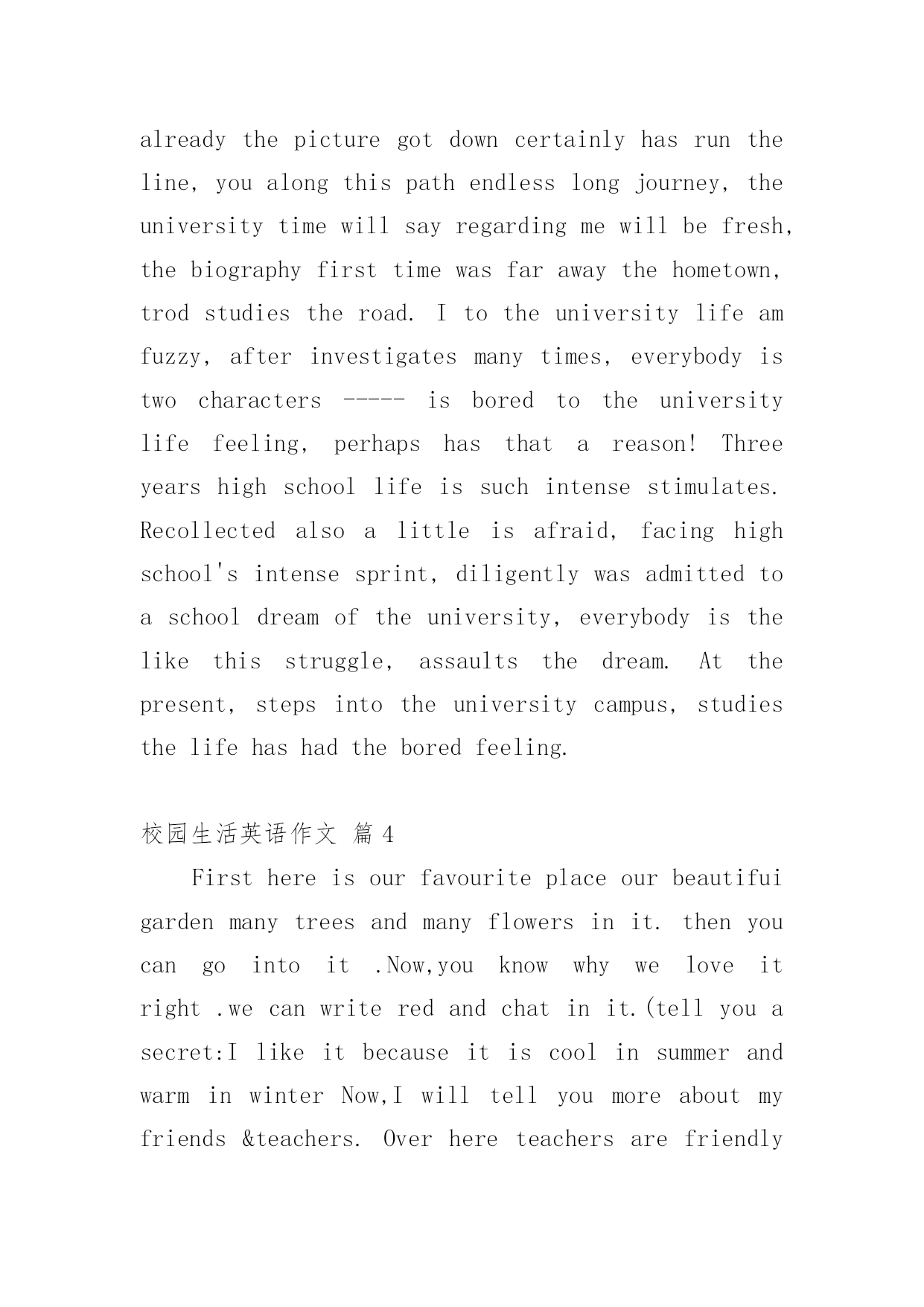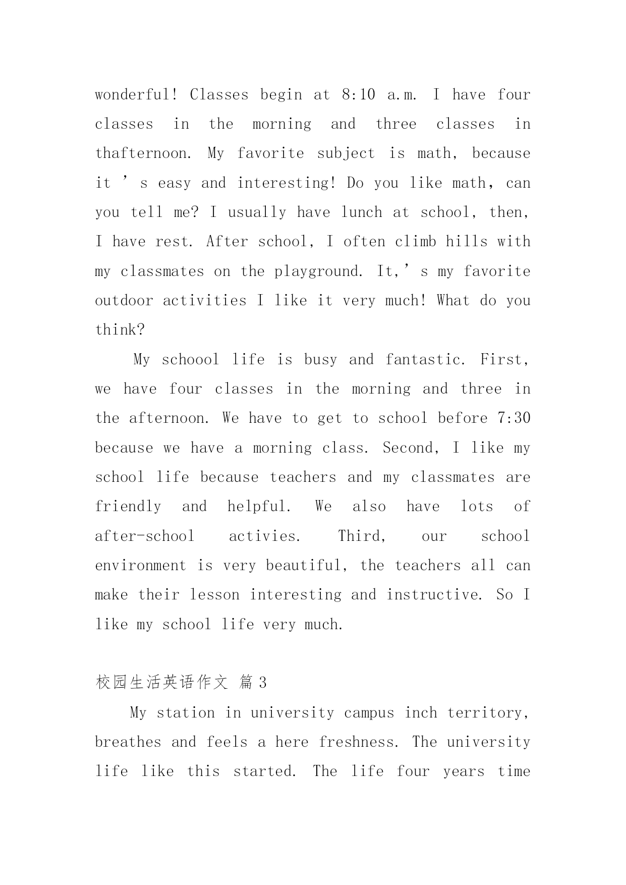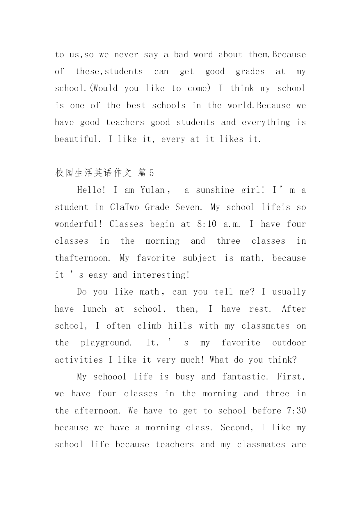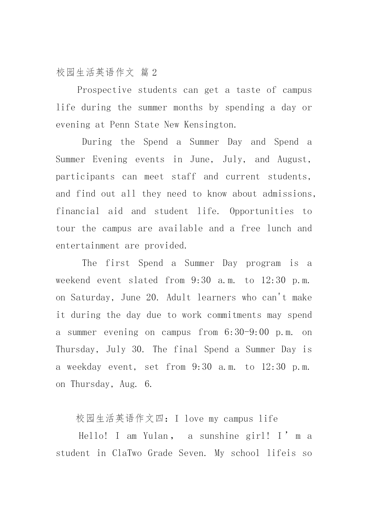校园生活英语作文实用的校园生活英语作文五篇在日常生活或是工作学习中,大家都经常看到作文的身影吧,作文是从内部言语向外部言语的过渡,即从经过压缩的简要的、自己能明白的语言,向开展的、具有规范语法结构的、能为他人所理解的外部语言形式的转化。怎么写作文才能避免踩雷呢?以下是小编为大家收集的校园生活英语作文5篇,欢迎大家借鉴与参考,希望对大家有所帮助。校园生活英语作文篇1WhenIfirstwentintotheschoolgate,seemynewclassroomandteachers,IthoughtIwouldhaveanewstart.Theschoollifeisverybusyandexciting.Therearemanyactivitiesinourschool,suchassportsmeeting,scienceweekandartweek.Wealltakeanactivepartinit.Ihavemademanynewfriends,andweoftenhelpandlearnfromeachother,inthestudyof.Ourteachertoldusalotof.Theynotonlyteachushowtolearn,butalsoteachushowtobeausefulpersoninsociety.Theytellus,isathingisworthdoing,itisworthdoingwellandmanyotherthings.校园生活英语作文篇2ProspectivestudentscangetatasteofcampuslifeduringthesummermonthsbyspendingadayoreveningatPennStateNewKensington.DuringtheSpendaSummerDayandSpendaSummerEveningeventsinJune,July,andAugust,participantscanmeetstaffandcurrentstudents,andfindoutalltheyneedtoknowaboutadmissions,financialaidandstudentlife.Opportunitiestotourthecampusareavailableandafreelunchandentertainmentareprovided.ThefirstSpendaSummerDayprogramisaweekendeventslatedfrom9:30a.m.to12:30p.m.onSaturday,June20.Adultlearnerswhocan'tmakeitduringthedayduetoworkcommitmentsmayspendasummereveningoncampusfrom6:30-9:00p.m.onThursday,July30.ThefinalSpendaSummerDayisaweekdayevent,setfrom9:30a.m.to12:30p.m.onThursday,Aug.6.校园生活英语作文四:IlovemycampuslifeHello!IamYulan,asunshinegirl!I’mastudentinClaTwoGradeSeven.Myschoollifeissowonderful!Classesbeginat8:10a.m.Ihavefourclassesinthemorningandthreeclassesinthafternoon.Myfavoritesubjectismath,becauseit’seasyandinteresting!Doyoulikemath,canyoutellme?Iusuallyhavelunchatschool,then,Ihaverest.Afterschool,Ioftenclimbhillswithmyclassmatesontheplayground.It,’smyfavoriteoutdooractivitiesIlikeitverymuch!Whatdoyouthink?Myschooollifeisbusyandfantastic.First,wehavefourclassesinthemorningandthreeintheafternoon.Wehavetogettoschoolbefore7:30becausewehaveamorningclass.Second,Ilikemyschoollifebecauseteachersandmyclassmatesarefriendlyandhelpful.Weals