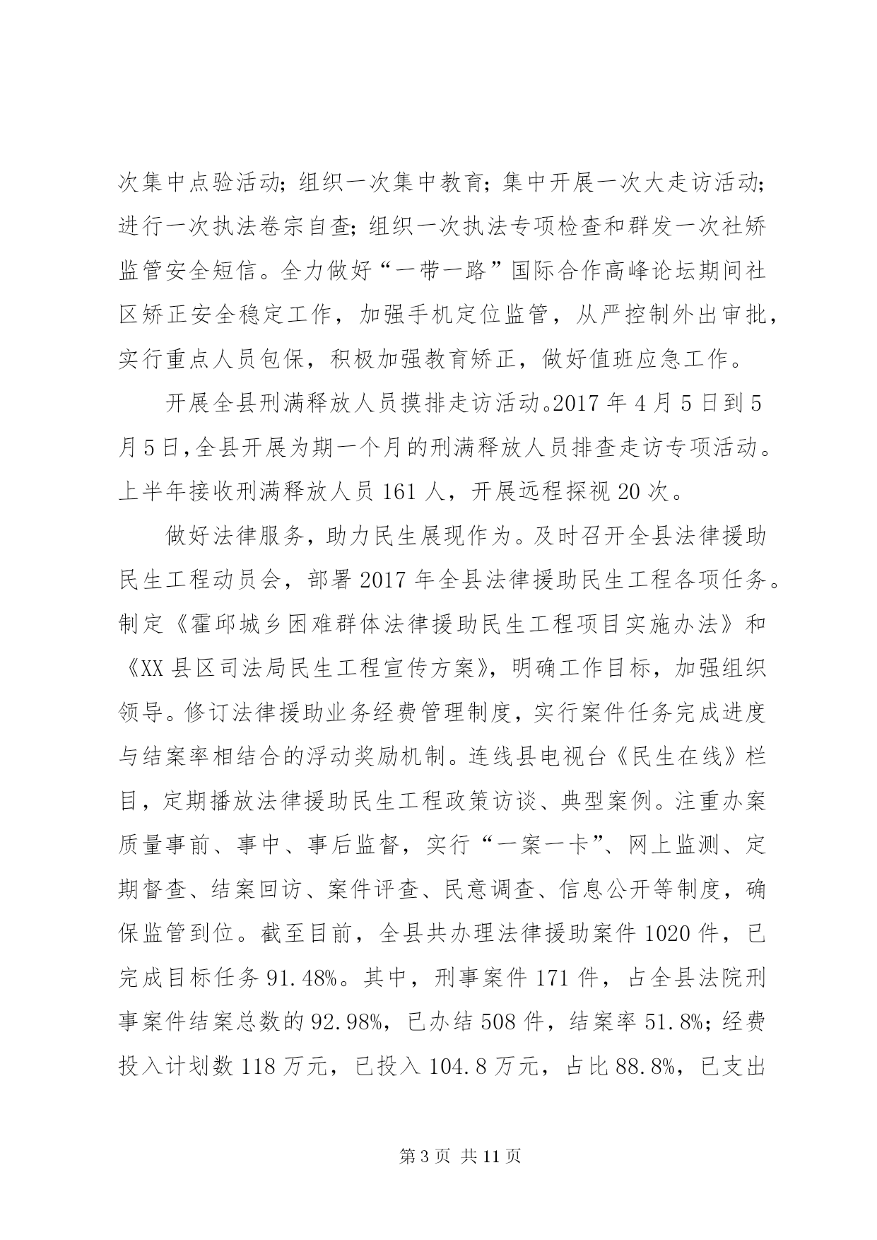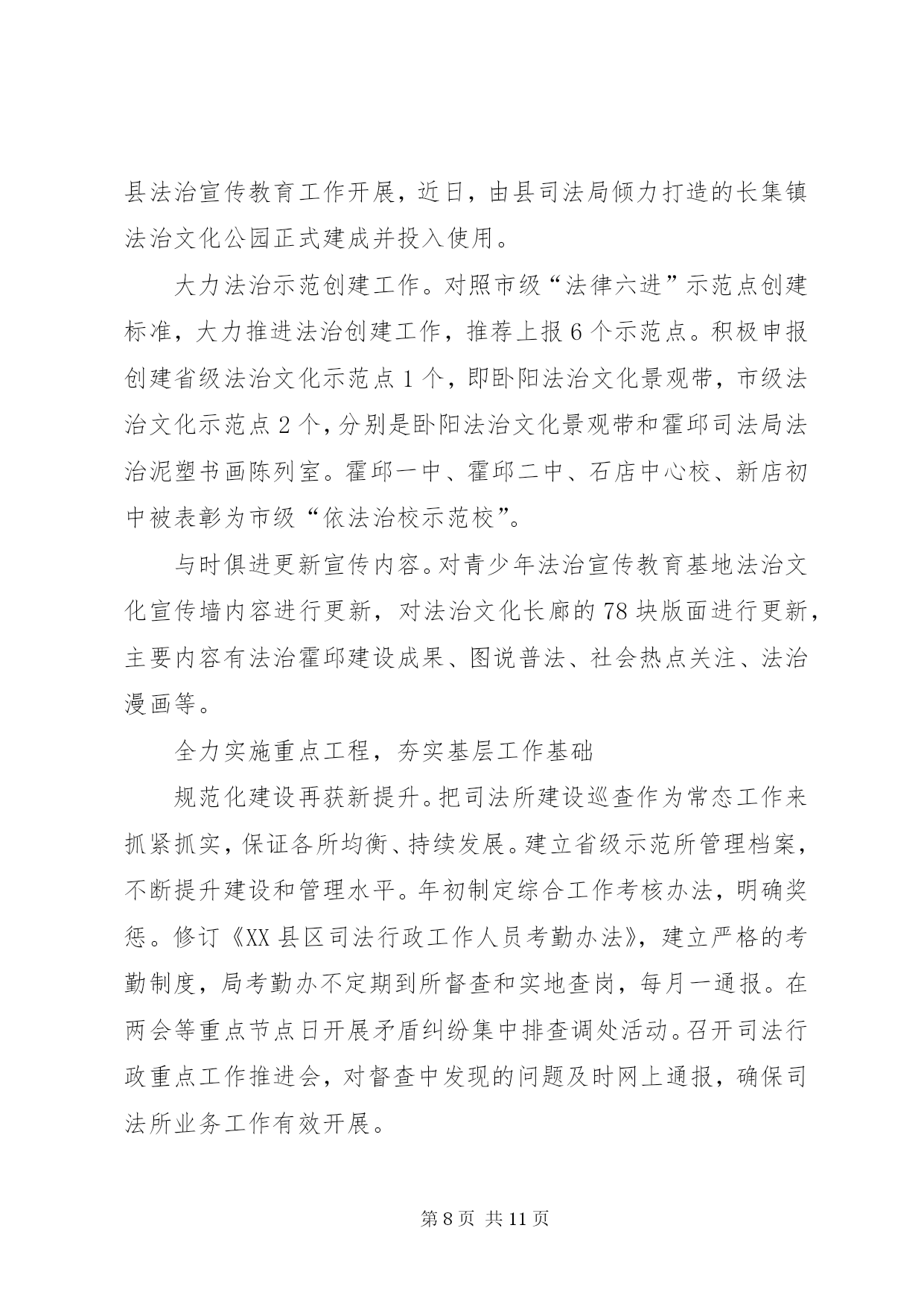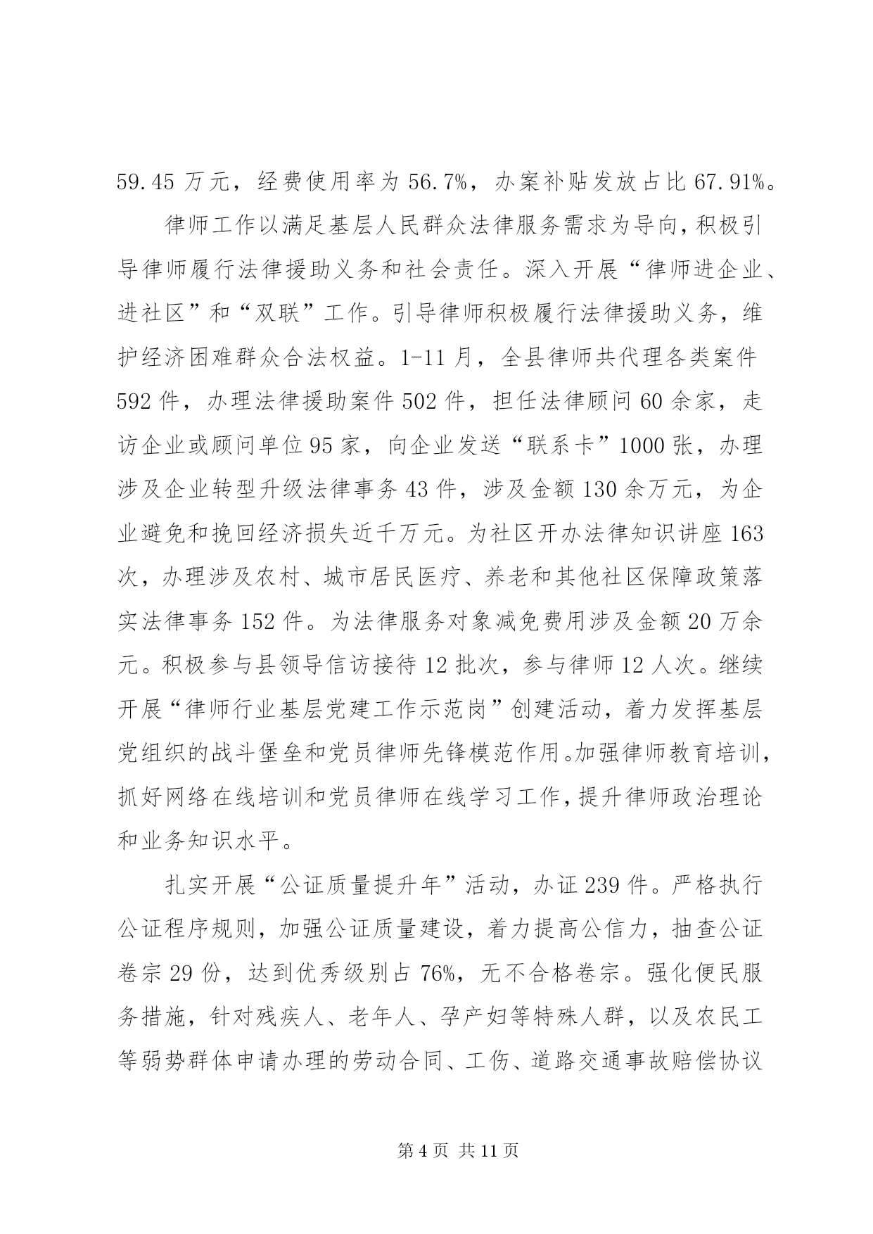 第PAGE\*Arabic\*MERGEFORMAT11页共NUMPAGES\*MERGEFORMAT11页县司法局XX年工作总结今年以来,全县司法行政系统紧紧围绕为迎接党的十九大胜利召开营造安全稳定社会环境的要求XX县区委县政府决策部署,按照局党组“四抓四做”工作思路,抢抓机遇、乘势而上,科学谋划、深入推进,工作取得了新成绩,实现了新发展,迈上了新台阶,为服务经济平稳较快发展,维护社会和谐稳定,推进平安霍邱、法治霍邱建设作出了新贡献。全力推进“四做”工程,业务工作有声有色做强社矫安帮,教育监管安全有效。1-11月,新接收社区服刑人员235人,解矫255人,在矫641人,无一人重新违法犯罪。每周向社区服刑人员发送手机短信开展监管教育,宣传法律法规、社区矫正相关规定及全县社区矫正工作重大举措等。今年来,发送短信20次近2万条。每月与县检察院、公安局联合,对当月新入矫社区服刑人员进行集中宣告教育,宣读各项社区矫正管理规定,增强服刑在矫意识,组织观看《XX省社区服刑人员监督管理规范教育片》并现场测试,提高社区服刑人员对社区矫正知识。聘请3名心理咨询师,每月开展社区服刑人员心理健康知识讲座,及时为有需求的服刑人员提供心理咨询和心理治疗。拍摄“在创新中前行”社区矫正电视宣传片,与省厅社区矫正规范教育片每天在县局显示屏播放,着力宣传社区矫正知识和我县社区矫正工作成效。严格落实社矫人员外出管理规定,对重点人员实行手机定位监控。每季度根据定位服刑人员表现,适时更换手机定位人员,坚持手机定位每日必巡查、巡查必记录、记录必详实、越界必处罚。截止目前,我县手机定位315人,手机定位比例近50%。年初制定计划,规定31个司法所(分局)每月开展集中教育、社区服务时间,每月县局派员现场督查,按照社区服刑人员花名册点名,确保每人参加。制定了《XX县区社区服刑人员暗访、点验暂行规定》,每月不定期对社区服刑人员进行暗访、点验,发现违规人员,依据《社区矫正实施办法》、《XX省社区矫正工作实施细则》进行严惩,并对监管疏忽的司法所和工作责任人进行处罚。每月制作《社区矫正简报》,从社区矫正集中教育、社区服务、暗访点验、手机定位、系统使用等8个方面对全县社区矫正工作开展情况进行通报,切实推进全县社区矫正工作规范开展。对不服从管理人员坚决出现一例打击一例,确保社区矫正工作非监禁型刑罚执行的威慑力。今年以来共建议撤销缓刑4人,已收监3人,1人正在办理中,警告43人次。开展社区矫正安全监管整治月专项活动确保“一带一路”国际合作高峰论坛期间社区矫正安全稳定。2月20日—4月初,在全县范围内开展了社区矫正安全监管整治月专项活动,落实重点人员分类管控制度,开展了“八个一”活动,即召开一次廉政专题培训会;组织一次社区矫正业务培训会;在全县范围内开展一次集中点验活动;组织一次集中教育;集中开展一次大走访活动;进行一次执法卷宗自查;组织一次执法专项检查和群发一次社矫监管安全短信。全力做好“一带一路”国际合作高峰论坛期间社区矫正安全稳定工作,加强手机定位监管,从严控制外出审批,实行重点人员包保,积极加强教育矫正,做好值班应急工作。开展全县刑满释放人员摸排走访活动。2017年4月5日到5月5日,全县开展为期一个月的刑满释放人员排查走访专项活动。上半年接收刑满释放人员161人,开展远程探视20次。做好法律服务,助力民生展现作为。及时召开全县法律援助民生工程动员会,部署2017年全县法律援助民生工程各项任务。制定《霍邱城乡困难群体法律援助民生工程项目实施办法》和《XX县区司法局民生工程宣传方案》,明确工作目标,加强组织领导。修订法律援助业务经费管理制度,实行案件任务完成进度与结案率相结合的浮动奖励机制。连线县电视台《民生在线》栏目,定期播放法律援助民生工程政策访谈、典型案例。注重办案质量事前、事中、事后监督,实行“一案一卡”、网上监测、定期督查、结案回访、案件评查、民意调查、信息公开等制度,确保监管到位。截至目前,全县共办理法律援助案件1020件,已完成目标任务91.48%。其中,刑事案件171件,占全县法院刑事案件结案总数的92.98%,已办结508件,结案率51.8%;经费投入计划数118万元,已投入104.8万元,占比88.8%,已支出59.45万元,经费使用率为56.7%,办案补贴发放占比67.91%。律师工作以满足基层人民群众法律服务需求为导向,积极引导律师履行法律援助义务和社会责任。深入开展“律师进企业、进社区”和“双联”工作。引导律师积极履行法律援助义务,维护经济困难群众合法权益。1-11月,全县律师共代理各类案件592件,办理法律援助案件502件,担任法律顾问60余家,走访企业或顾问单位95家,向企业发送“联系卡”1000张,办理涉及企业转型升级法律事务