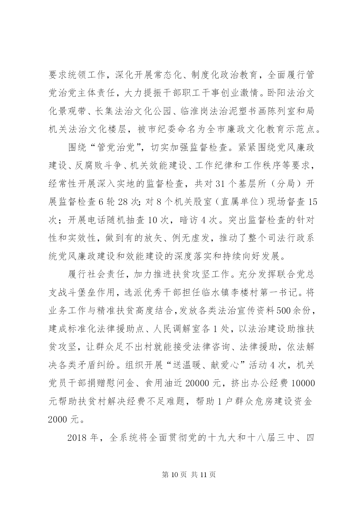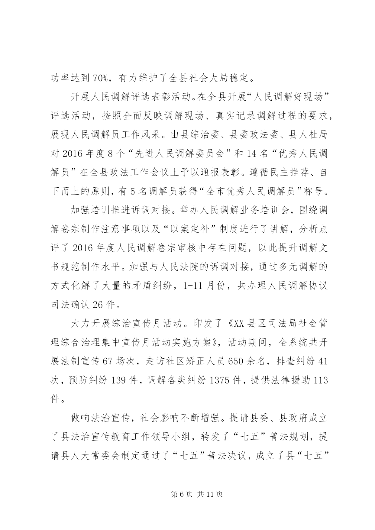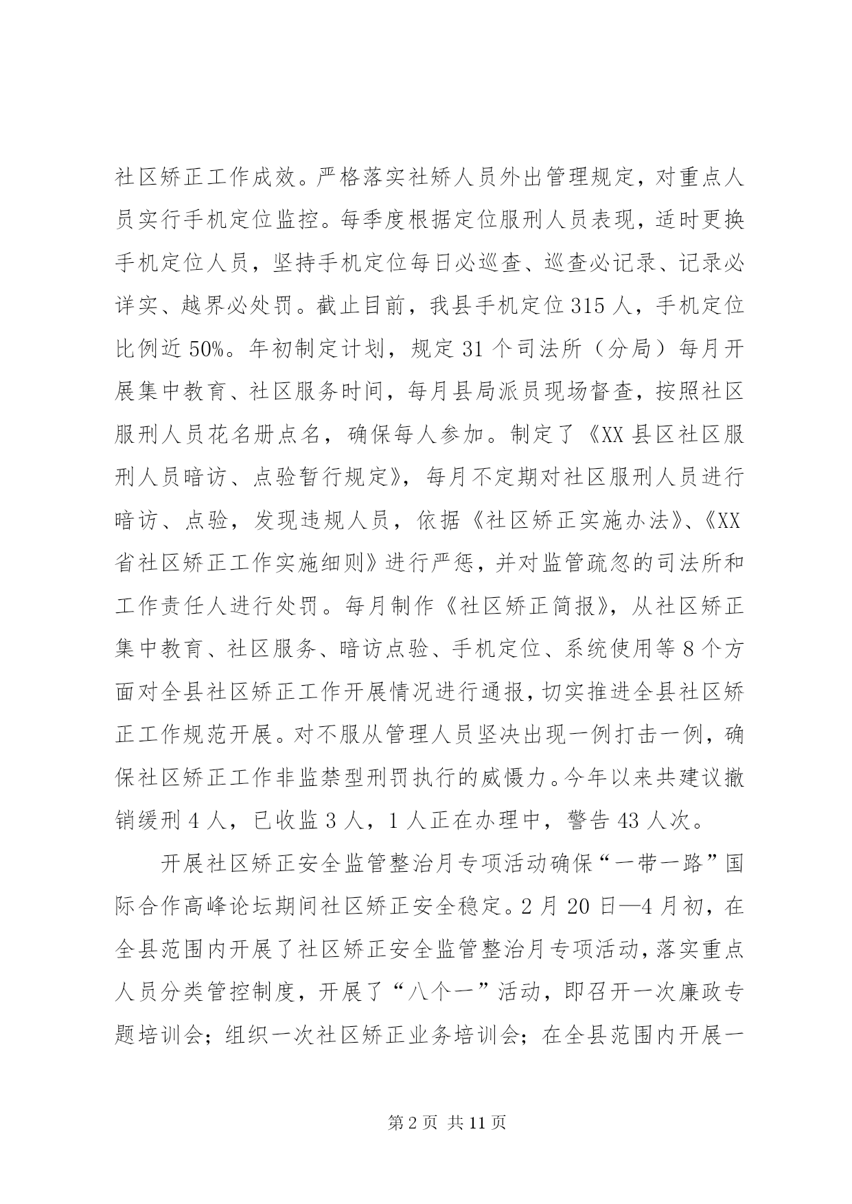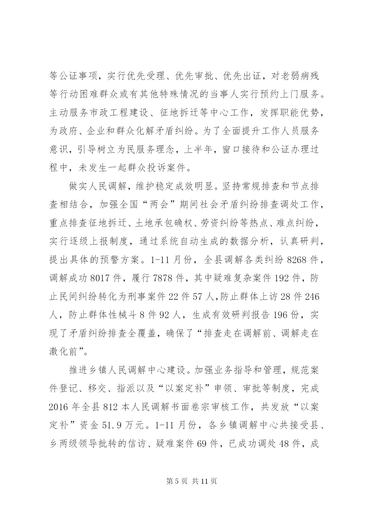 第PAGE\*Arabic\*MERGEFORMAT11页共NUMPAGES\*MERGEFORMAT11页县司法局XX年工作总结今年以来,全县司法行政系统紧紧围绕为迎接党的十九大胜利召开营造安全稳定社会环境的要求XX县区委县政府决策部署,按照局党组“四抓四做”工作思路,抢抓机遇、乘势而上,科学谋划、深入推进,工作取得了新成绩,实现了新发展,迈上了新台阶,为服务经济平稳较快发展,维护社会和谐稳定,推进平安霍邱、法治霍邱建设作出了新贡献。全力推进“四做”工程,业务工作有声有色做强社矫安帮,教育监管安全有效。1-11月,新接收社区服刑人员235人,解矫255人,在矫641人,无一人重新违法犯罪。每周向社区服刑人员发送手机短信开展监管教育,宣传法律法规、社区矫正相关规定及全县社区矫正工作重大举措等。今年来,发送短信20次近2万条。每月与县检察院、公安局联合,对当月新入矫社区服刑人员进行集中宣告教育,宣读各项社区矫正管理规定,增强服刑在矫意识,组织观看《XX省社区服刑人员监督管理规范教育片》并现场测试,提高社区服刑人员对社区矫正知识。聘请3名心理咨询师,每月开展社区服刑人员心理健康知识讲座,及时为有需求的服刑人员提供心理咨询和心理治疗。拍摄“在创新中前行”社区矫正电视宣传片,与省厅社区矫正规范教育片每天在县局显示屏播放,着力宣传社区矫正知识和我县社区矫正工作成效。严格落实社矫人员外出管理规定,对重点人员实行手机定位监控。每季度根据定位服刑人员表现,适时更换手机定位人员,坚持手机定位每日必巡查、巡查必记录、记录必详实、越界必处罚。截止目前,我县手机定位315人,手机定位比例近50%。年初制定计划,规定31个司法所(分局)每月开展集中教育、社区服务时间,每月县局派员现场督查,按照社区服刑人员花名册点名,确保每人参加。制定了《XX县区社区服刑人员暗访、点验暂行规定》,每月不定期对社区服刑人员进行暗访、点验,发现违规人员,依据《社区矫正实施办法》、《XX省社区矫正工作实施细则》进行严惩,并对监管疏忽的司法所和工作责任人进行处罚。每月制作《社区矫正简报》,从社区矫正集中教育、社区服务、暗访点验、手机定位、系统使用等8个方面对全县社区矫正工作开展情况进行通报,切实推进全县社区矫正工作规范开展。对不服从管理人员坚决出现一例打击一例,确保社区矫正工作非监禁型刑罚执行的威慑力。今年以来共建议撤销缓刑4人,已收监3人,1人正在办理中,警告43人次。开展社区矫正安全监管整治月专项活动确保“一带一路”国际合作高峰论坛期间社区矫正安全稳定。2月20日—4月初,在全县范围内开展了社区矫正安全监管整治月专项活动,落实重点人员分类管控制度,开展了“八个一”活动,即召开一次廉政专题培训会;组织一次社区矫正业务培训会;在全县范围内开展一次集中点验活动;组织一次集中教育;集中开展一次大走访活动;进行一次执法卷宗自查;组织一次执法专项检查和群发一次社矫监管安全短信。全力做好“一带一路”国际合作高峰论坛期间社区矫正安全稳定工作,加强手机定位监管,从严控制外出审批,实行重点人员包保,积极加强教育矫正,做好值班应急工作。开展全县刑满释放人员摸排走访活动。2017年4月5日到5月5日,全县开展为期一个月的刑满释放人员排查走访专项活动。上半年接收刑满释放人员161人,开展远程探视20次。做好法律服务,助力民生展现作为。及时召开全县法律援助民生工程动员会,部署2017年全县法律援助民生工程各项任务。制定《霍邱城乡困难群体法律援助民生工程项目实施办法》和《XX县区司法局民生工程宣传方案》,明确工作目标,加强组织领导。修订法律援助业务经费管理制度,实行案件任务完成进度与结案率相结合的浮动奖励机制。连线县电视台《民生在线》栏目,定期播放法律援助民生工程政策访谈、典型案例。注重办案质量事前、事中、事后监督,实行“一案一卡”、网上监测、定期督查、结案回访、案件评查、民意调查、信息公开等制度,确保监管到位。截至目前,全县共办理法律援助案件1020件,已完成目标任务91.48%。其中,刑事案件171件,占全县法院刑事案件结案总数的92.98%,已办结508件,结案率51.8%;经费投入计划数118万元,已投入104.8万元,占比88.8%,已支出59.45万元,经费使用率为56.7%,办案补贴发放占比67.91%。律师工作以满足基层人民群众法律服务需求为导向,积极引导律师履行法律援助义务和社会责任。深入开展“律师进企业、进社区”和“双联”工作。引导律师积极履行法律援助义务,维护经济困难群众合法权益。1-11月,全县律师共代理各类案件592件,办理法律援助案件502件,担任法律顾问60余家,走访企业或顾问单位95家,向企业发送“联系卡”1000张,办理涉及企业转型升级法律事务