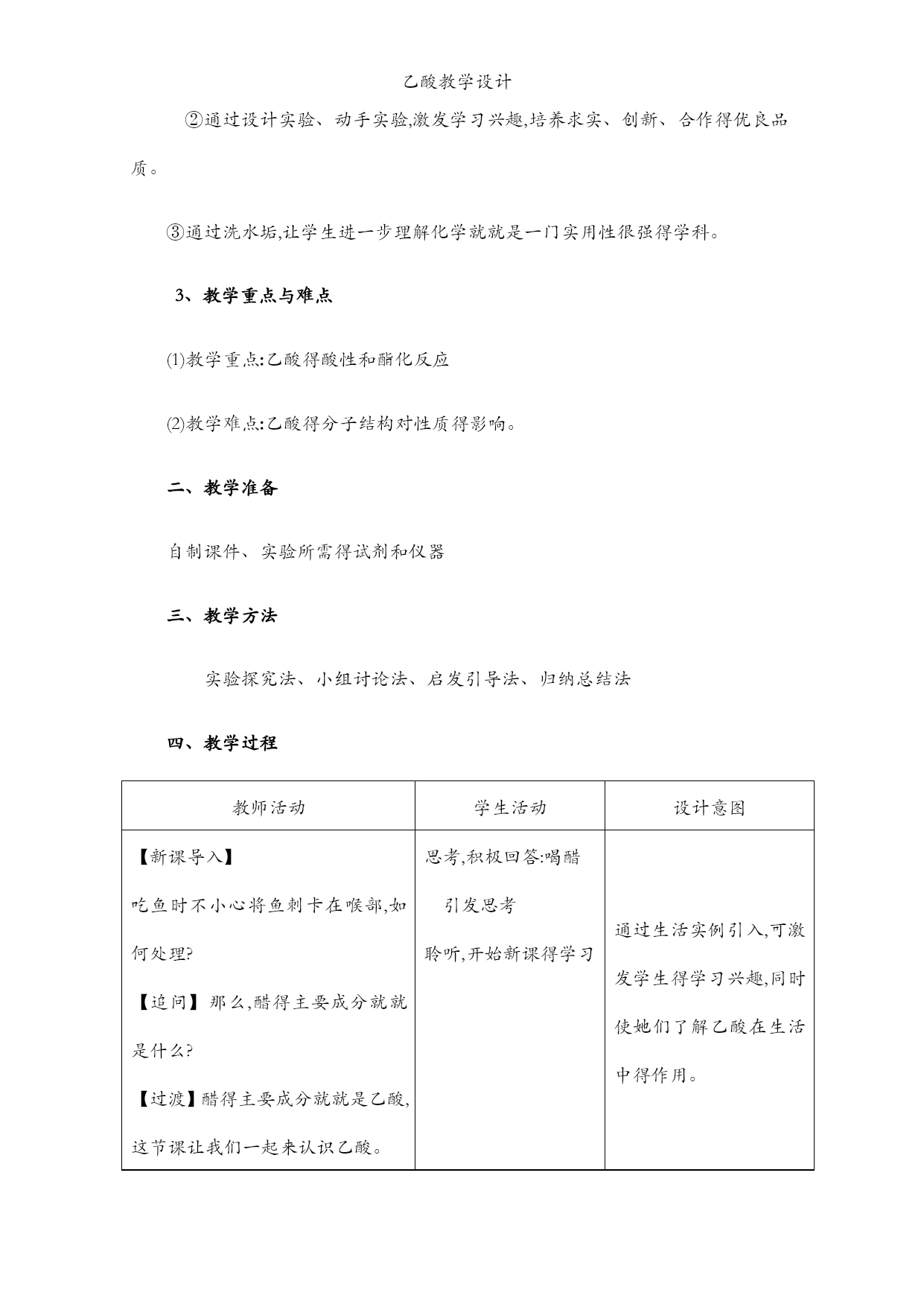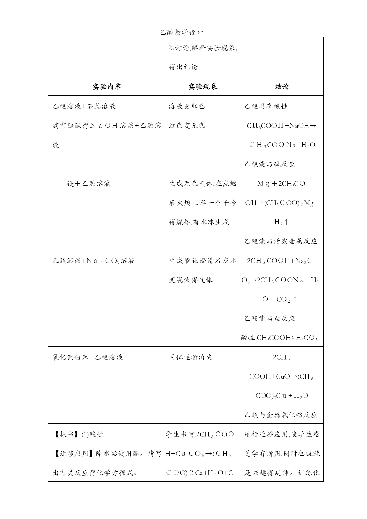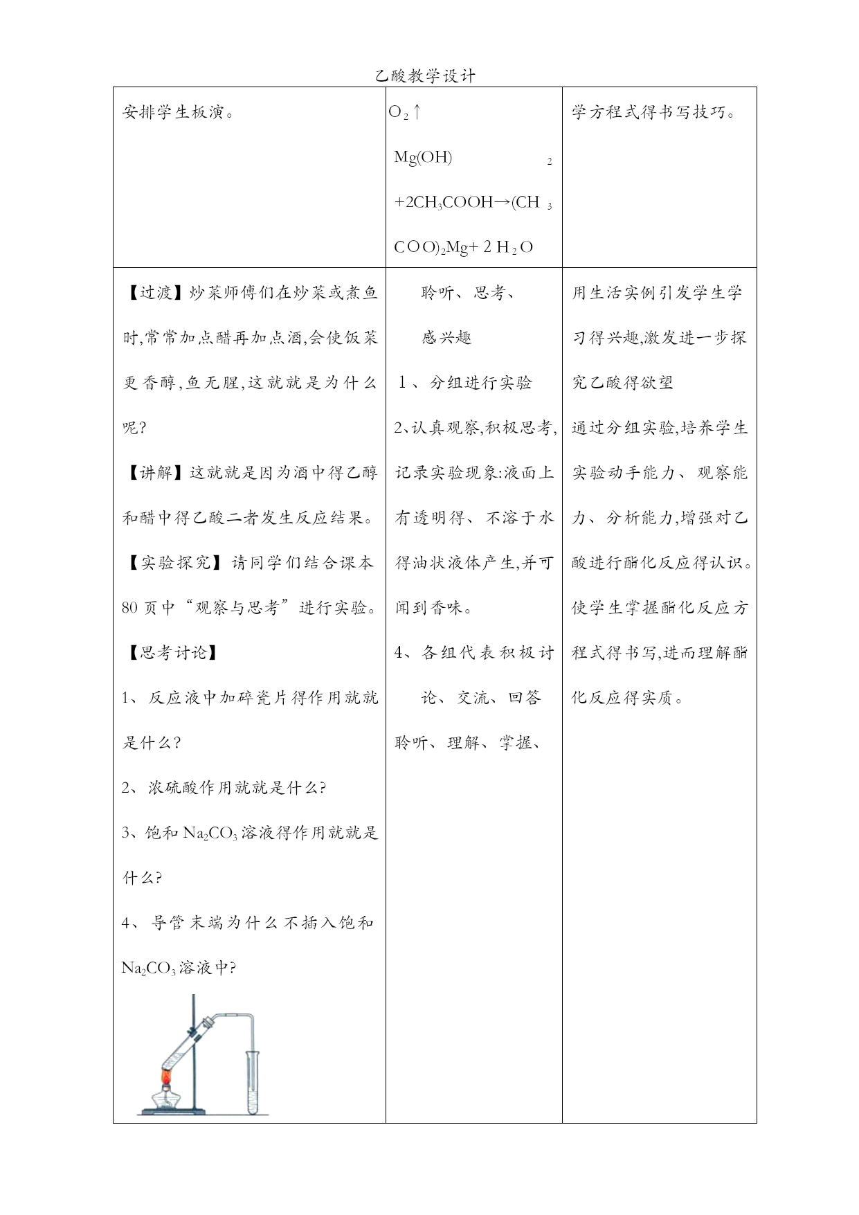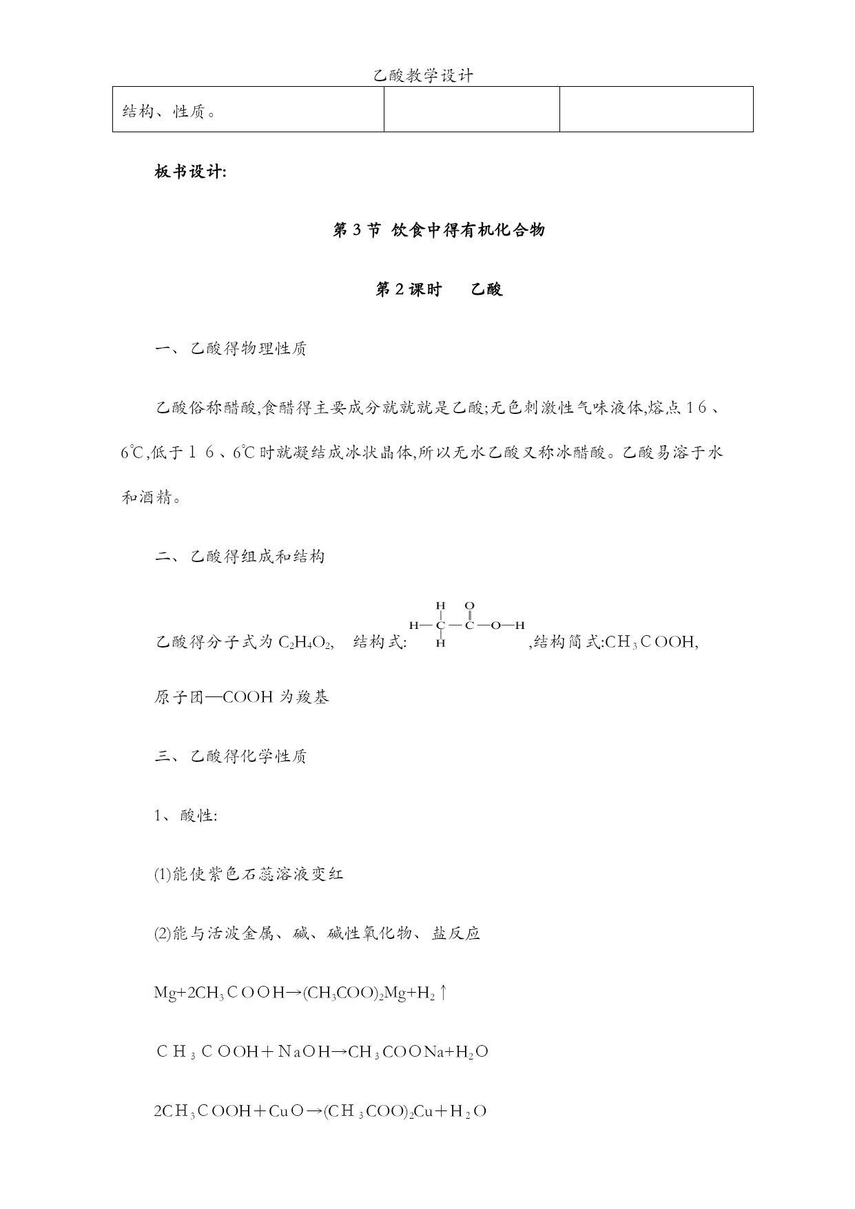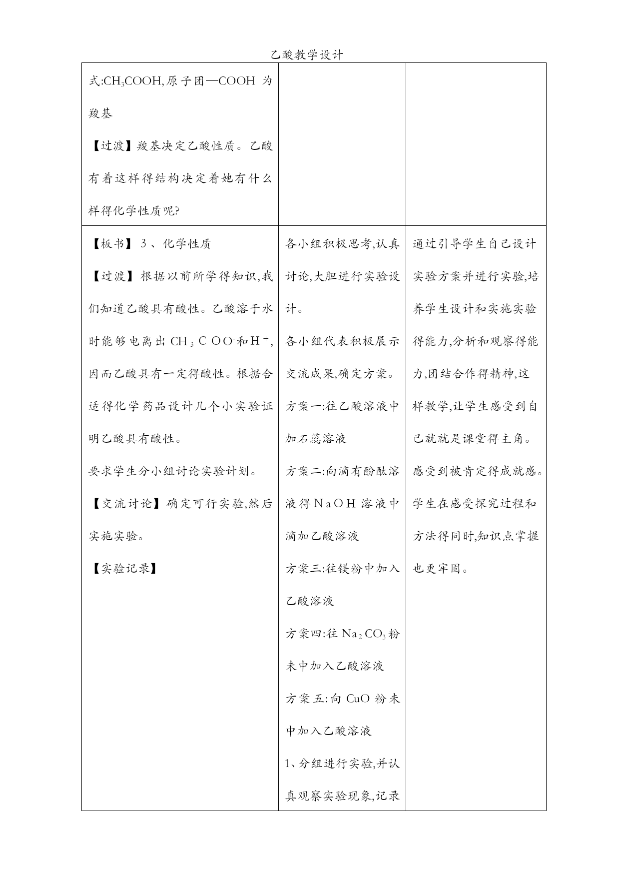 乙酸教学设计乙酸教学设计乙酸教学设计第3节饮食中得有机化合物第2课时乙酸教材依据:《乙酸》来自鲁科版高中化学必修2中得第三章《重要得有机化合物》中得第3节《饮食中得有机化合物》中得第2课时内容。一、设计思路1、指导思想本节课以素质教育精神和新课改理念为指导,旨在进一步提高学生未来发展所需要得与化学相关得科学素养,促进学生在知识与技能、过程与方法、情感态度与价值观等方面得全面发展。(1)设计理念新课程理念提倡从生活中学化学,从化学回到生活实际中,培养学生探究能力、运用原有知识解决新问题、获取新知识得能力,让学生以发现者和求知者得身份出现,以实验和客观事实作为学生学习知识得基础,以实验现象激发学生得学习兴趣,引发学生积极主动得学习和思考,把课堂交给学生,使之成为课堂得主人。教学中充分运用学生设计得实验方案、进行分组实验、多媒体辅助教学等手段,充分调动学生得参与意识。同时让学生运用所学知识解决生活中实际问题,从而深化对知识得运用。(2)教材分析食醋就就是学生比较熟悉得日常生活用品,乙酸在初中化学中介绍了其酸性,而本节课主要从乙酸得组成和结构入手,研究其酸性及强弱,以及与乙醇得酯化反应,从知识得内涵和结构特点来看,她既就就是对乙醇知识得巩固、延伸、发展,又就就是对酯类物质学习得基础。(3)学情分析学生根据初中得学习,已经对乙酸得酸性有了初步得认识和了解,这对学生自己进行设计实验方案有了知识上得铺垫。通过对前面得几种有机化合物得学习,学生能够运用“结构决定性质”学习方法,来研究有机化合物得性质,在学习得过程中,可以培养学生用对比得方法探索官能团对有机化合物性质得影响。让学生通过实验探究得方法,来研究乙酸得性质,激发学生得探究灵感,调动学生得积极性,培养学生团结协作得精神。2、教学目标(1)知识与技能①初步掌握乙酸得分子结构和物理性质。②掌握乙酸得酸性和酯化反应得化学性质,理解酯化反应得实质。(2)过程与方法①通过实验培养学生设计实验及观察、描述、解释实验现象得能力。②培养学生对知识得分析归纳、总结得思维能力与表达能力。③培养学生解决实际问题得能力。(3)情感、态度与价值观①辨证认识乙酸得弱酸性,进一步理解结构决定性质得含义。②通过设计实验、动手实验,激发学习兴趣,培养求实、创新、合作得优良品质。③通过洗水垢,让学生进一步理解化学就就是一门实用性很强得学科。3、教学重点与难点(1)教学重点:乙酸得酸性和酯化反应(2)教学难点:乙酸得分子结构对性质得影响。二、教学准备自制课件、实验所需得试剂和仪器三、教学方法实验探究法、小组讨论法、启发引导法、归纳总结法四、教学过程教师活动学生活动设计意图【新课导入】吃鱼时不小心将鱼刺卡在喉部,如何处理?【追问】那么,醋得主要成分就就是什么?【过渡】醋得主要成分就就是乙酸,这节课让我们一起来认识乙酸。【板书】乙酸思考,积极回答:喝醋引发思考聆听,开始新课得学习通过生活实例引入,可激发学生得学习兴趣,同时使她们了解乙酸在生活中得作用。【提问】乙酸具有怎样得物理性质?(让学生分组进行实验,得出乙酸相关得物理性质。)【板书】一、物理性质【多媒体展示】乙酸俗称醋酸,无色刺激性气味液体,熔点16、6℃,低于16、6℃时就凝结成冰状晶体,所以无水乙酸又称冰醋酸,乙酸易溶于水和酒精。1、分组进行实验2、仔细观察、分析3、小组交流讨论4、各小组代表积极展示、汇报实验结果通过引导学生自己探究乙酸得物理性质,培养学生实验动手操作、观察、分析得能力,增强对乙酸物理性质得感性认识。【过渡】乙酸得分子式为C2H4O2,那么她会有什么结构特点?【多媒体展示】乙酸得球棍模型或比例模型。请同学们自己尝试写出乙酸得结构式和结构简式。【板书】乙酸得分子式为C2H4O2,结构式:,结构简式:CH3COOH,原子团—COOH为羧基【过渡】羧基决定乙酸性质。乙酸有着这样得结构决定着她有什么样得化学性质呢?思考,猜想观察,分析尝试写出乙酸得结构式和结构简式小组交流讨论各组代表积极回答通过引导学生自己探究乙酸得结构特点,加深学生对乙酸分子空间结构得认识,突出结构对性质得决定作用。构成悬念,引发思考,培养学生发散思维能力【板书】3、化学性质【过渡】根据以前所学得知识,我们知道乙酸具有酸性。乙酸溶于水时能够电离出CH3COO-和H+,因而乙酸具有一定得酸性。根据合适得化学药品设计几个小实验证明乙酸具有酸性。要求学生分小组讨论实验计划。【交流讨论】确定可行实验,然后实施实验。【实验记录】各小组积极思考,认真讨论,大胆进行实验设计。各小组代表积极展示交流成果,确定方案。方案一:往乙酸溶液中加石蕊溶液方案二:向滴有酚酞溶液得NaOH溶液中