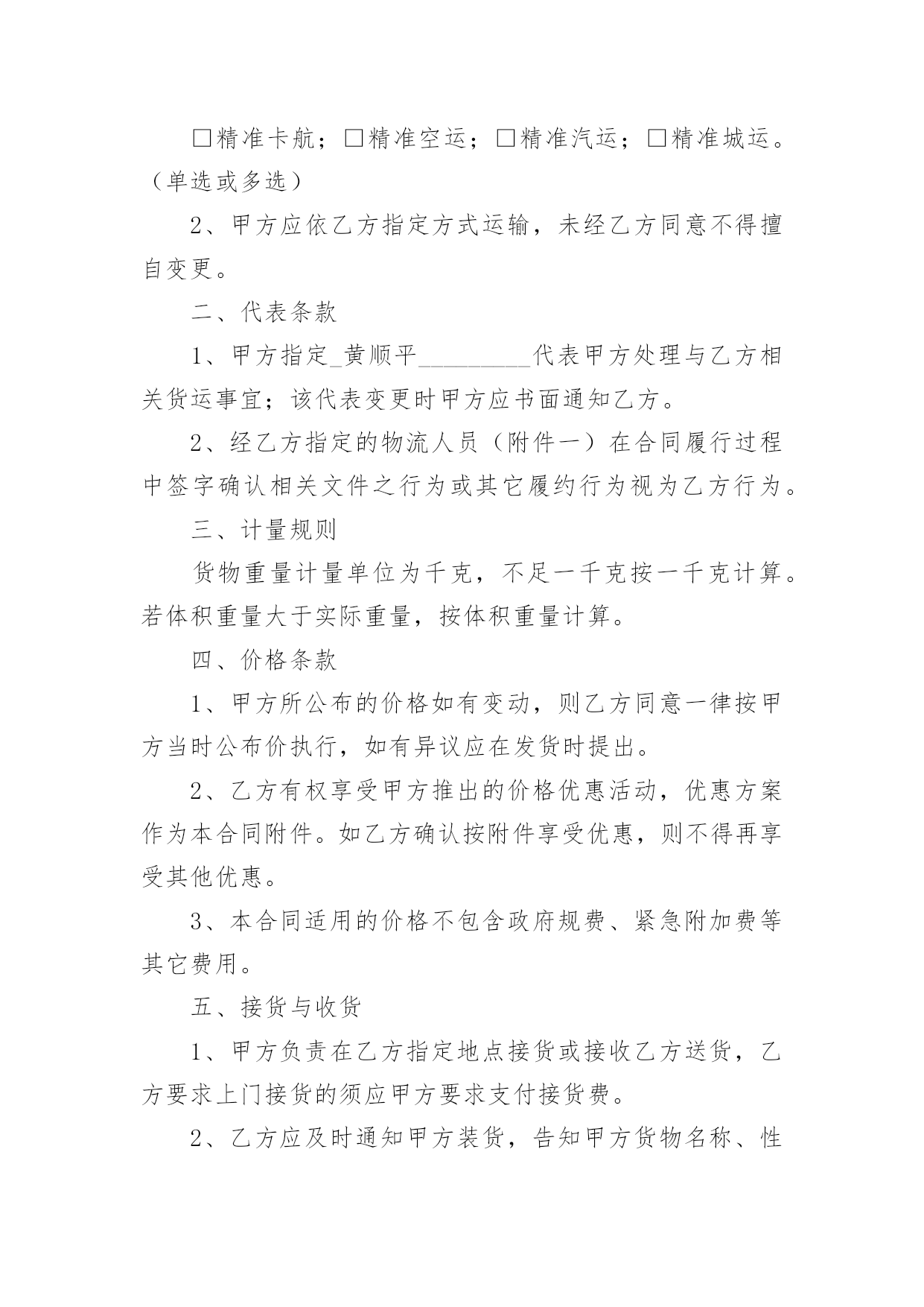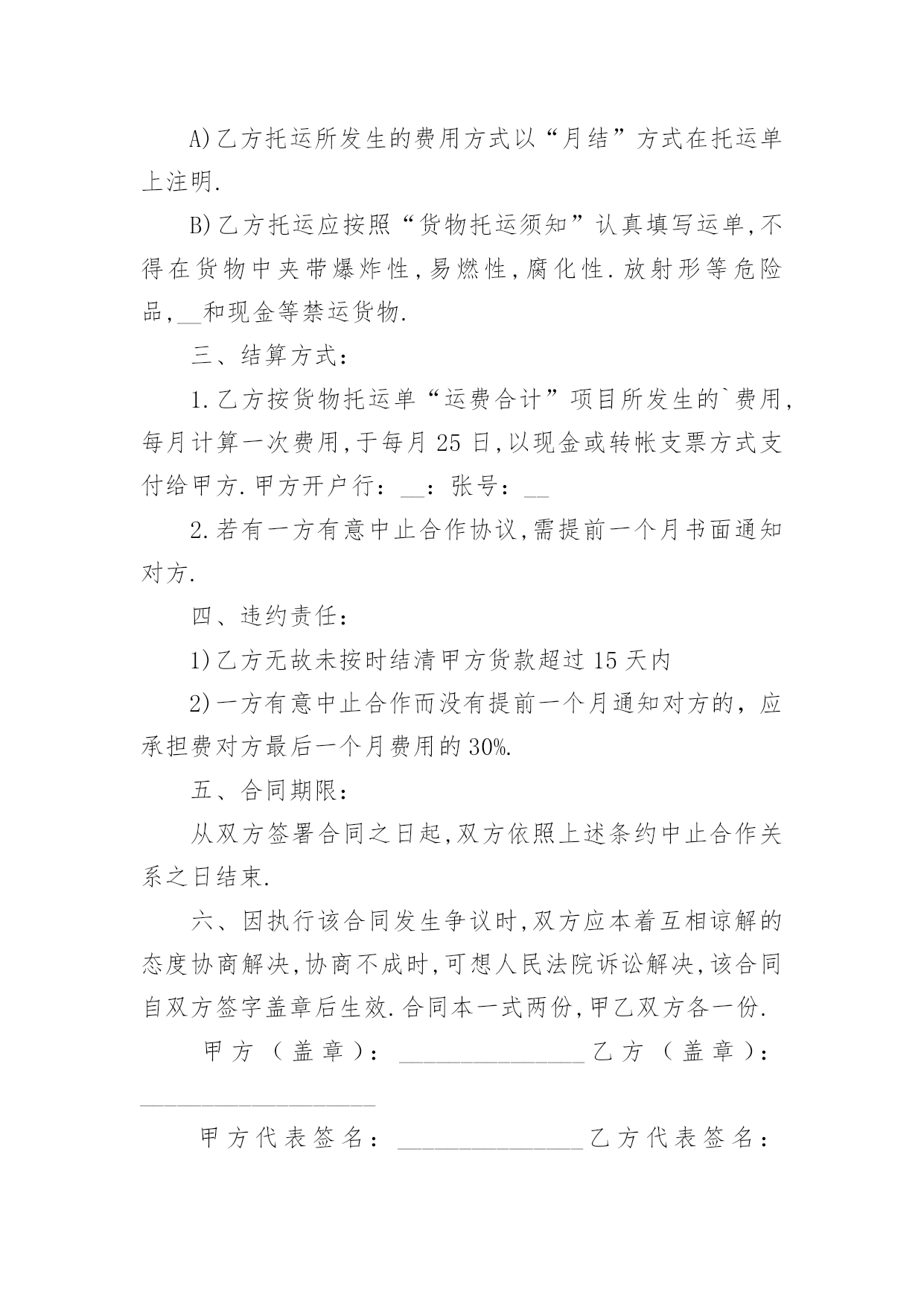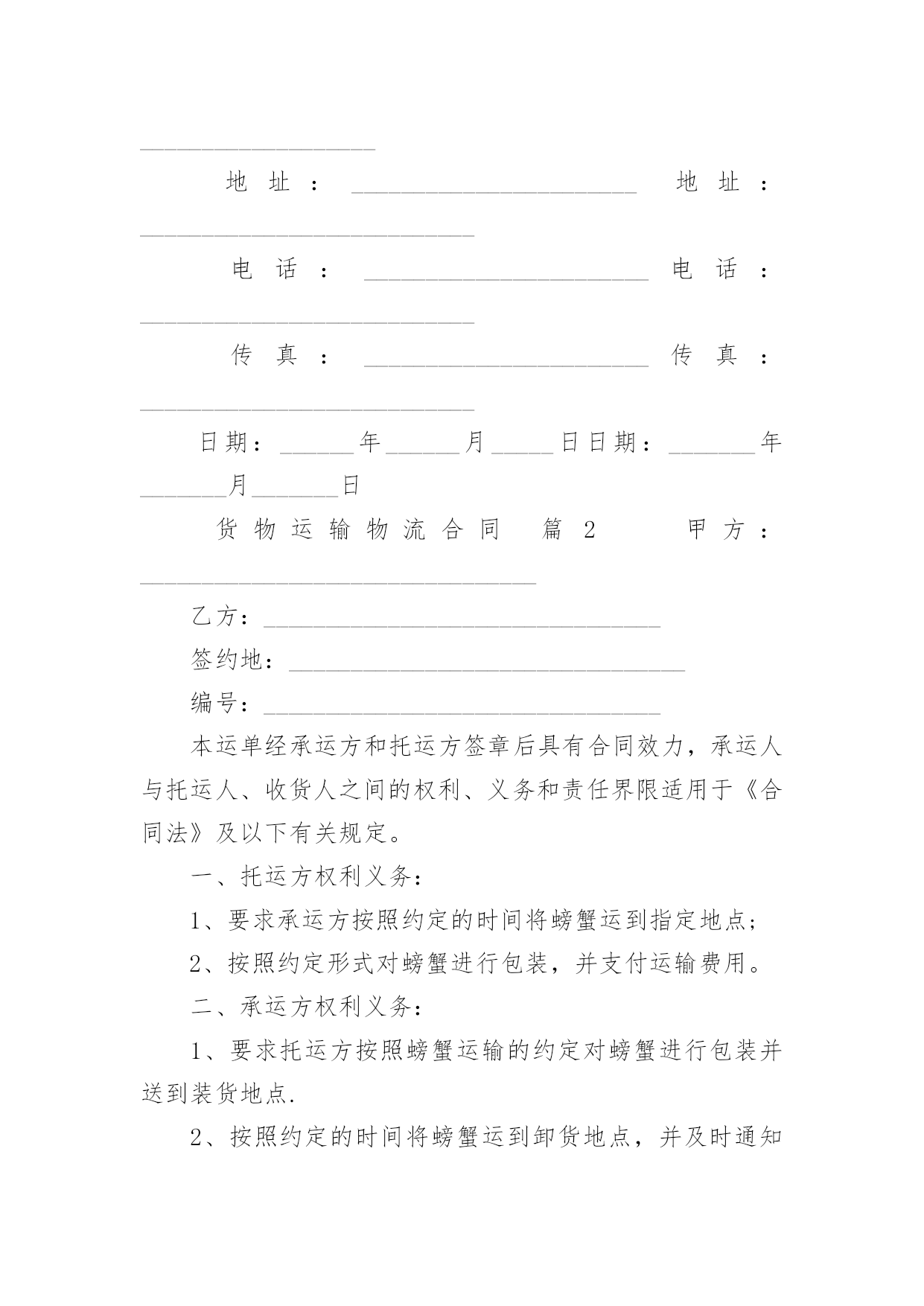 货物运输物流合同货物运输物流合同14篇现今很多公民的维权意识在不断增强,合同起到的作用越来越大,它也是减少和防止发生争议的重要措施。那么问题来了,到底应如何拟定合同呢?以下是小编帮大家整理的货物运输物流合同,欢迎大家分享。货物运输物流合同篇1承运单位:(以下简称甲方)地址:托运单位:(以下简称乙方)地址:本着友好合作的精神,经共同协商,达成如下协议:一、根据《中华人民共和国合同法》及其他有关法律规定,双方就完成货物运输,采用批次结帐方式事宜,承运方式:1)甲方根据货物托运单,按乙方要求,采用公路运输形式,将货物运送至目的地。2)乙方按运输规定将货物包装好,捆扎劳固.并安全装车二、双方的权利及义务:1.甲方权利义务:A)甲方按“货物托运单”要求完成托运任务.B)以托运单为依据,甲方承运所发生的运费及相关费用依法向乙方收取2.乙方权利及义务:A)乙方托运所发生的费用方式以“月结”方式在托运单上注明.B)乙方托运应按照“货物托运须知”认真填写运单,不得在货物中夹带爆炸性,易燃性,腐化性.放射形等危险品,__和现金等禁运货物.三、结算方式:1.乙方按货物托运单“运费合计”项目所发生的`费用,每月计算一次费用,于每月25日,以现金或转帐支票方式支付给甲方.甲方开户行:__:张号:__2.若有一方有意中止合作协议,需提前一个月书面通知对方.四、违约责任:1)乙方无故未按时结清甲方货款超过15天内2)一方有意中止合作而没有提前一个月通知对方的,应承担费对方最后一个月费用的30%.五、合同期限:从双方签署合同之日起,双方依照上述条约中止合作关系之日结束.六、因执行该合同发生争议时,双方应本着互相谅解的态度协商解决,协商不成时,可想人民法院诉讼解决,该合同自双方签字盖章后生效.合同本一式两份,甲乙双方各一份.甲方(盖章):_______________乙方(盖章):___________________甲方代表签名:_______________乙方代表签名:___________________地址:_______________________地址:___________________________电话:_______________________电话:___________________________传真:_______________________传真:___________________________日期:______年______月_____日日期:_______年_______月_______日货物运输物流合同篇2甲方:________________________________乙方:________________________________签约地:________________________________编号:________________________________本运单经承运方和托运方签章后具有合同效力,承运人与托运人、收货人之间的权利、义务和责任界限适用于《合同法》及以下有关规定。一、托运方权利义务:1、要求承运方按照约定的时间将螃蟹运到指定地点;2、按照约定形式对螃蟹进行包装,并支付运输费用。二、承运方权利义务:1、要求托运方按照螃蟹运输的约定对螃蟹进行包装并送到装货地点.2、按照约定的时间将螃蟹运到卸货地点,并及时通知收货人凭有效证件提取螃蟹。收货人未及时提取螃蟹的,须及时通知托运人。三、违约责任。1、托运方责任:由于托运方的原因造成螃蟹死亡的,或收货人在接到承运方提取螃蟹通知后未及时提取螃蟹造成的损失由托运方承担;2、承运方责任:未按照约定的时间将螃蟹运到卸货地点(遇有大雾天可合理延迟)、或运输过程中发生交通事故造成托运方螃蟹损失的,承运方应赔偿托运方的实际损失(按签约当日的收购价)并退还运输费用。3、承运人对运输过程中货物的毁损、灭失承担损害赔偿责任。四、其它约定:由于下列原因,承运方不承担违约责任:1、承运人证明螃蟹短少、毁损、死亡、灭失、运输时间延迟,是因不可抗力、货物本身的.自然属性或者合理损耗以及托运人、收货人过错造成的,不承担损害赔偿责任;2、他人交通事故等造成高速公路封闭不能按时履约;3、托运方、收货方本身的过错;五、生效条件:托运方、承运方约定,本合同经双方签署后生效。本合同一式三份,合同双方各执一份,合同副本一份,报合同指导站备案。六、纠纷处理办法:因本合同的订立、效力、履行、变更、终止等发生争议的,双方应协商解决,协商不成的,可书面向合同指导站申请调解或向高淳县人民法院提起诉讼。甲方(盖章):_______________乙方(盖章):___________________甲方代表签名:_______________乙方代表签名:_____________