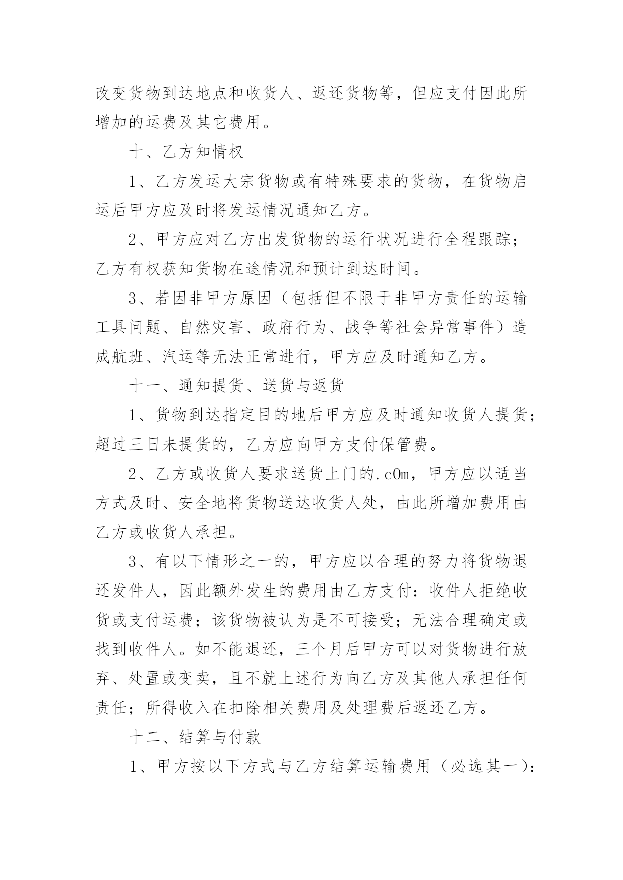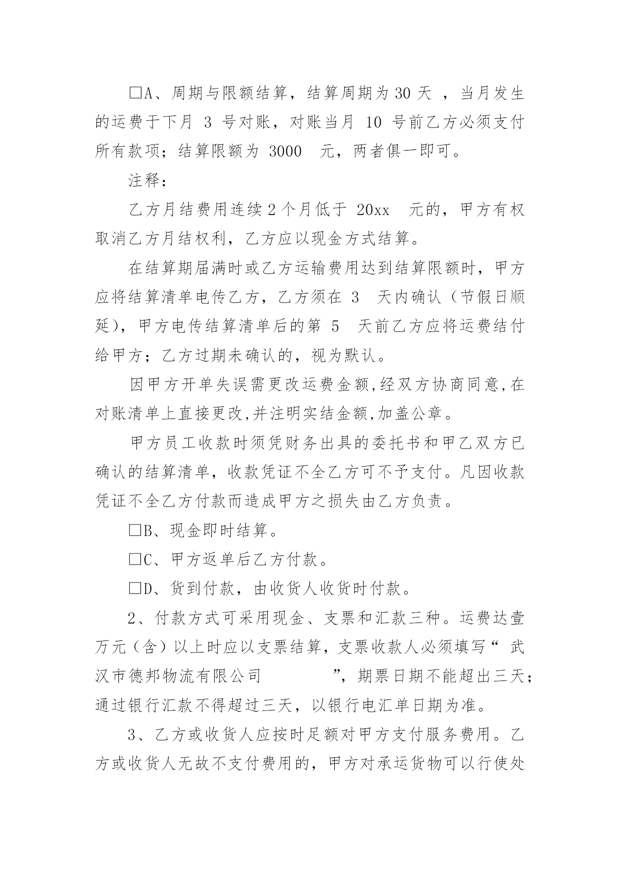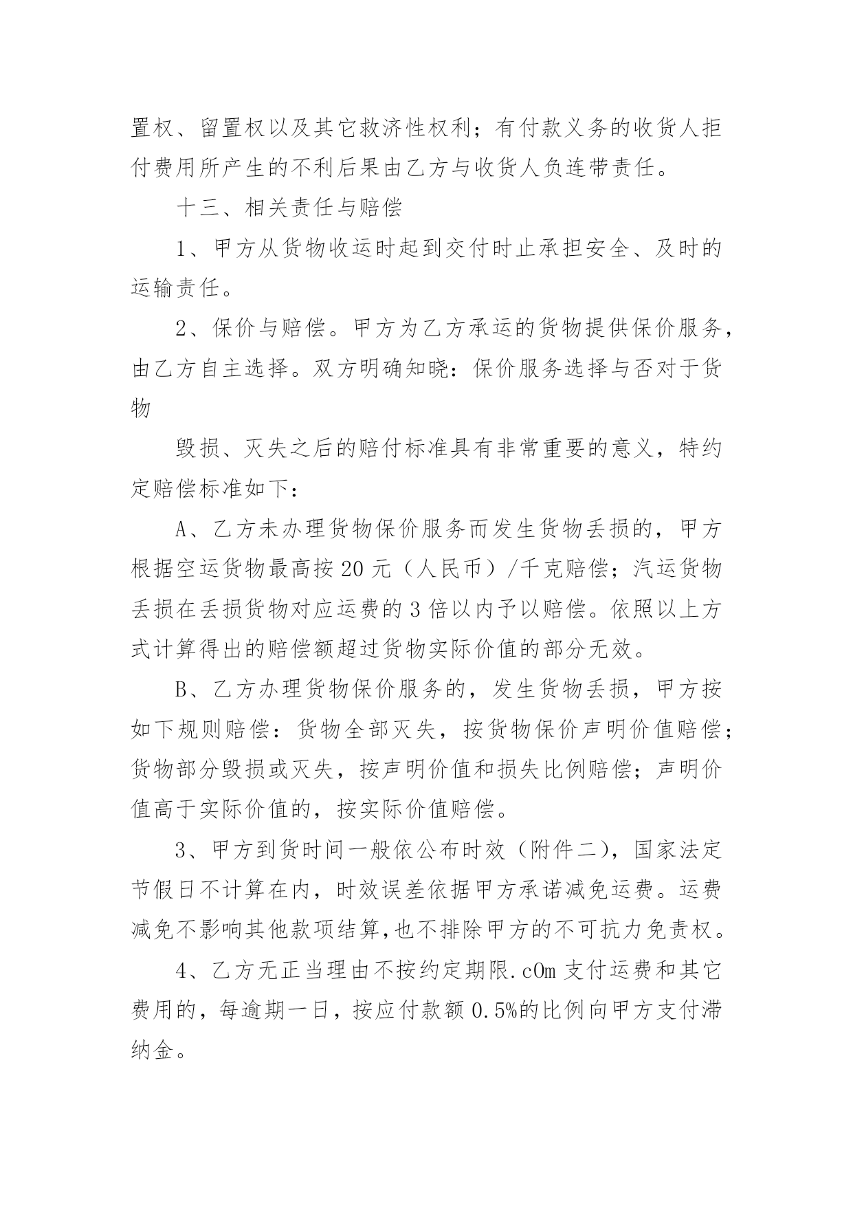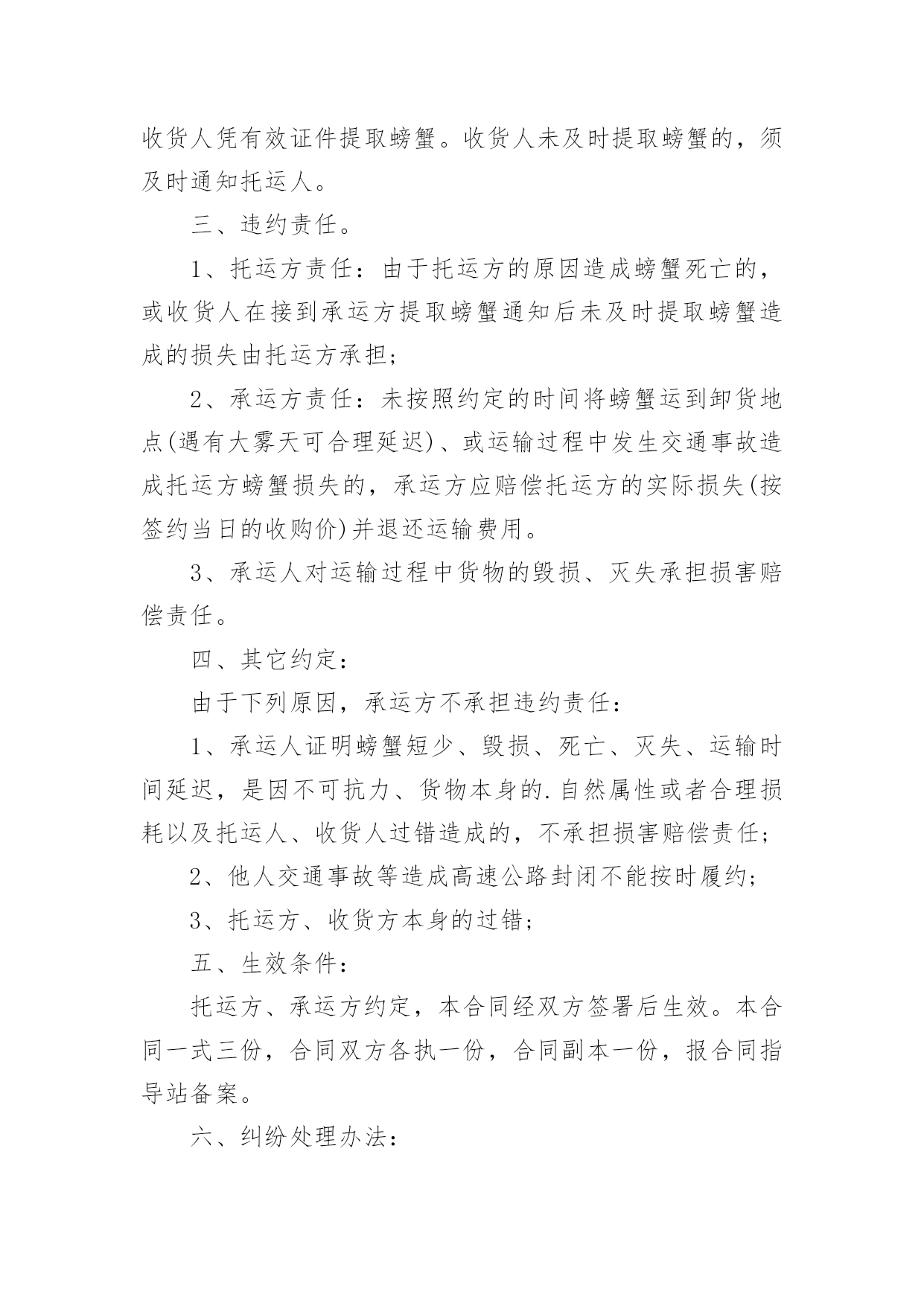 货物运输物流合同货物运输物流合同14篇现今很多公民的维权意识在不断增强,合同起到的作用越来越大,它也是减少和防止发生争议的重要措施。那么问题来了,到底应如何拟定合同呢?以下是小编帮大家整理的货物运输物流合同,欢迎大家分享。货物运输物流合同篇1承运单位:(以下简称甲方)地址:托运单位:(以下简称乙方)地址:本着友好合作的精神,经共同协商,达成如下协议:一、根据《中华人民共和国合同法》及其他有关法律规定,双方就完成货物运输,采用批次结帐方式事宜,承运方式:1)甲方根据货物托运单,按乙方要求,采用公路运输形式,将货物运送至目的地。2)乙方按运输规定将货物包装好,捆扎劳固.并安全装车二、双方的权利及义务:1.甲方权利义务:A)甲方按“货物托运单”要求完成托运任务.B)以托运单为依据,甲方承运所发生的运费及相关费用依法向乙方收取2.乙方权利及义务:A)乙方托运所发生的费用方式以“月结”方式在托运单上注明.B)乙方托运应按照“货物托运须知”认真填写运单,不得在货物中夹带爆炸性,易燃性,腐化性.放射形等危险品,__和现金等禁运货物.三、结算方式:1.乙方按货物托运单“运费合计”项目所发生的`费用,每月计算一次费用,于每月25日,以现金或转帐支票方式支付给甲方.甲方开户行:__:张号:__2.若有一方有意中止合作协议,需提前一个月书面通知对方.四、违约责任:1)乙方无故未按时结清甲方货款超过15天内2)一方有意中止合作而没有提前一个月通知对方的,应承担费对方最后一个月费用的30%.五、合同期限:从双方签署合同之日起,双方依照上述条约中止合作关系之日结束.六、因执行该合同发生争议时,双方应本着互相谅解的态度协商解决,协商不成时,可想人民法院诉讼解决,该合同自双方签字盖章后生效.合同本一式两份,甲乙双方各一份.甲方(盖章):_______________乙方(盖章):___________________甲方代表签名:_______________乙方代表签名:___________________地址:_______________________地址:___________________________电话:_______________________电话:___________________________传真:_______________________传真:___________________________日期:______年______月_____日日期:_______年_______月_______日货物运输物流合同篇2甲方:________________________________乙方:________________________________签约地:________________________________编号:________________________________本运单经承运方和托运方签章后具有合同效力,承运人与托运人、收货人之间的权利、义务和责任界限适用于《合同法》及以下有关规定。一、托运方权利义务:1、要求承运方按照约定的时间将螃蟹运到指定地点;2、按照约定形式对螃蟹进行包装,并支付运输费用。二、承运方权利义务:1、要求托运方按照螃蟹运输的约定对螃蟹进行包装并送到装货地点.2、按照约定的时间将螃蟹运到卸货地点,并及时通知收货人凭有效证件提取螃蟹。收货人未及时提取螃蟹的,须及时通知托运人。三、违约责任。1、托运方责任:由于托运方的原因造成螃蟹死亡的,或收货人在接到承运方提取螃蟹通知后未及时提取螃蟹造成的损失由托运方承担;2、承运方责任:未按照约定的时间将螃蟹运到卸货地点(遇有大雾天可合理延迟)、或运输过程中发生交通事故造成托运方螃蟹损失的,承运方应赔偿托运方的实际损失(按签约当日的收购价)并退还运输费用。3、承运人对运输过程中货物的毁损、灭失承担损害赔偿责任。四、其它约定:由于下列原因,承运方不承担违约责任:1、承运人证明螃蟹短少、毁损、死亡、灭失、运输时间延迟,是因不可抗力、货物本身的.自然属性或者合理损耗以及托运人、收货人过错造成的,不承担损害赔偿责任;2、他人交通事故等造成高速公路封闭不能按时履约;3、托运方、收货方本身的过错;五、生效条件:托运方、承运方约定,本合同经双方签署后生效。本合同一式三份,合同双方各执一份,合同副本一份,报合同指导站备案。六、纠纷处理办法:因本合同的订立、效力、履行、变更、终止等发生争议的,双方应协商解决,协商不成的,可书面向合同指导站申请调解或向高淳县人民法院提起诉讼。甲方(盖章):_______________乙方(盖章):___________________甲方代表签名:_______________乙方代表签名:_____________