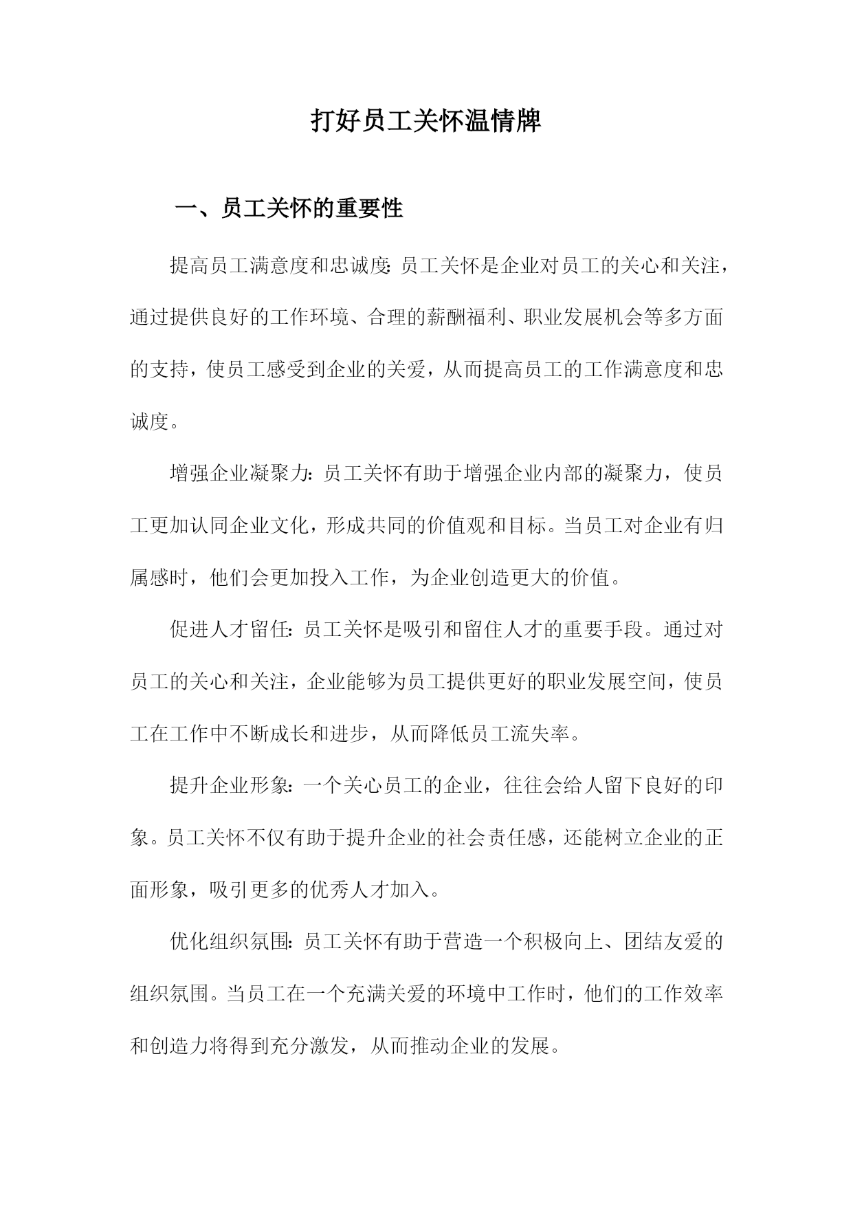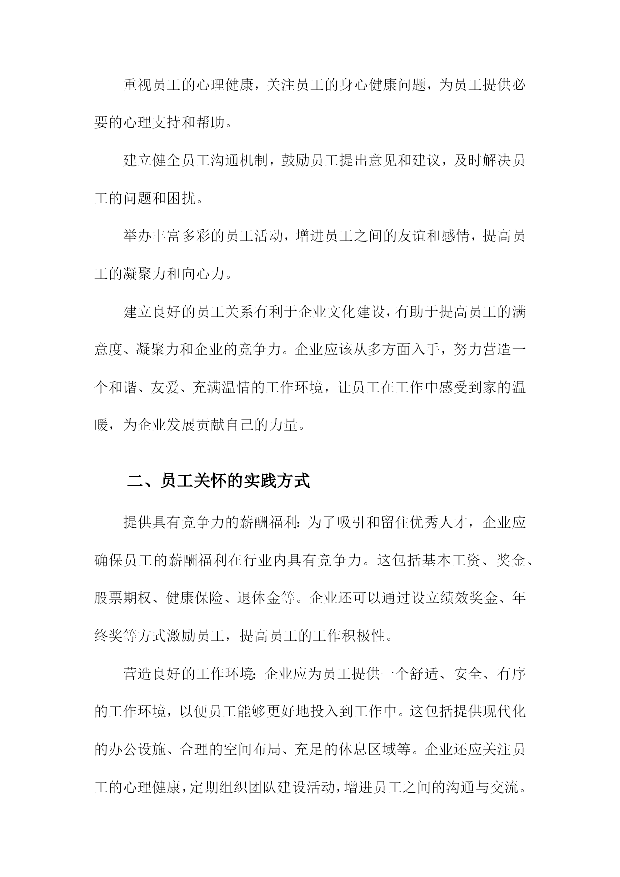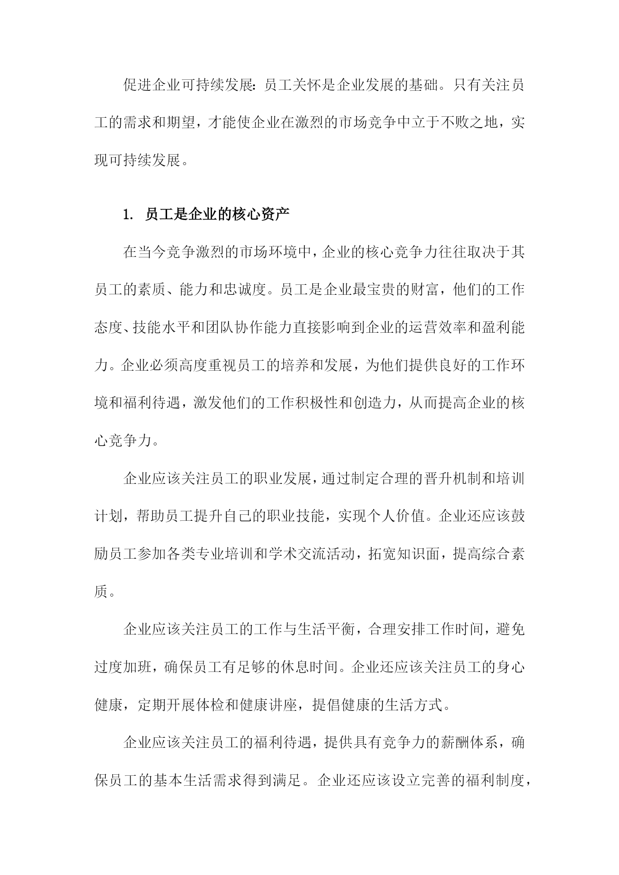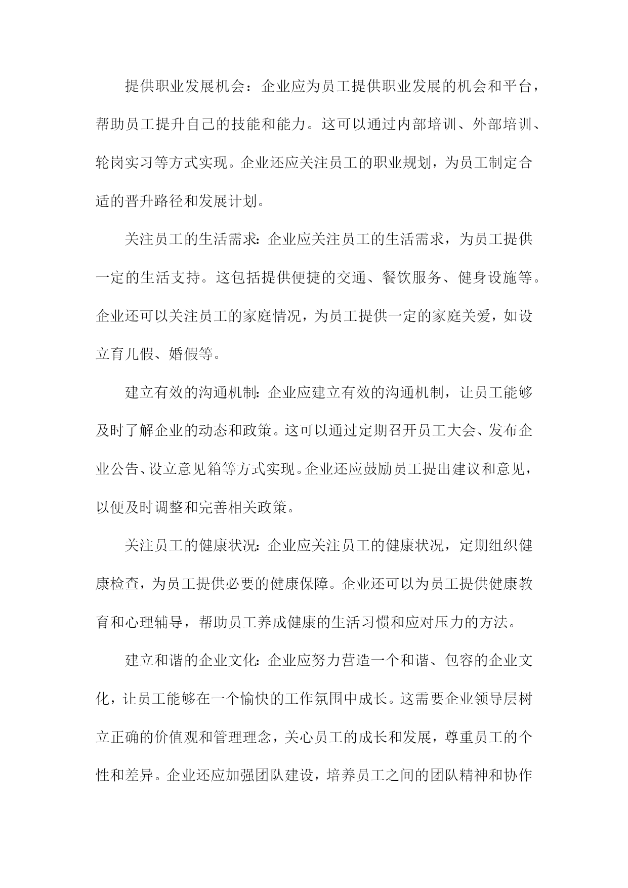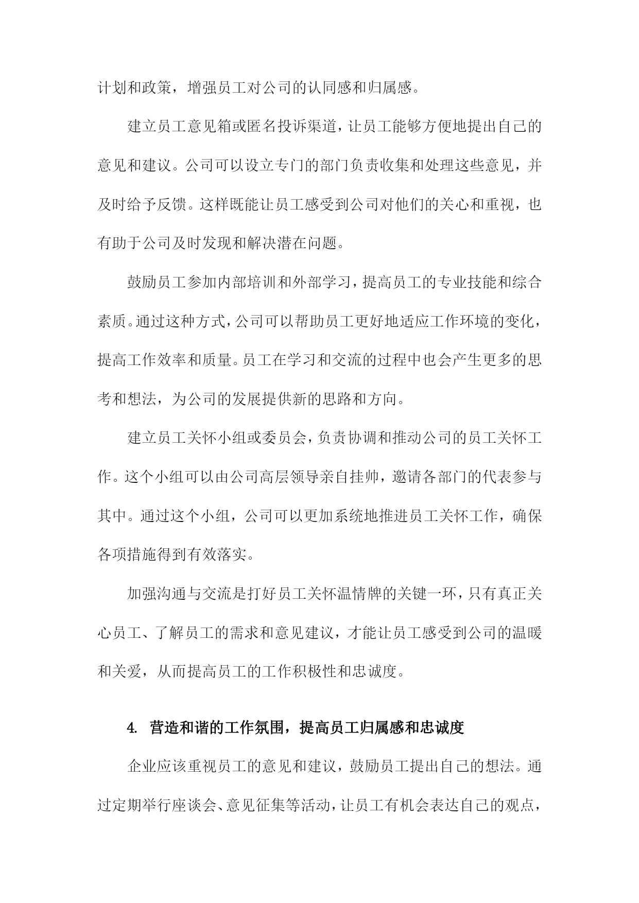 打好员工关怀温情牌一、员工关怀的重要性提高员工满意度和忠诚度:员工关怀是企业对员工的关心和关注,通过提供良好的工作环境、合理的薪酬福利、职业发展机会等多方面的支持,使员工感受到企业的关爱,从而提高员工的工作满意度和忠诚度。增强企业凝聚力:员工关怀有助于增强企业内部的凝聚力,使员工更加认同企业文化,形成共同的价值观和目标。当员工对企业有归属感时,他们会更加投入工作,为企业创造更大的价值。促进人才留任:员工关怀是吸引和留住人才的重要手段。通过对员工的关心和关注,企业能够为员工提供更好的职业发展空间,使员工在工作中不断成长和进步,从而降低员工流失率。提升企业形象:一个关心员工的企业,往往会给人留下良好的印象。员工关怀不仅有助于提升企业的社会责任感,还能树立企业的正面形象,吸引更多的优秀人才加入。优化组织氛围:员工关怀有助于营造一个积极向上、团结友爱的组织氛围。当员工在一个充满关爱的环境中工作时,他们的工作效率和创造力将得到充分激发,从而推动企业的发展。促进企业可持续发展:员工关怀是企业发展的基础。只有关注员工的需求和期望,才能使企业在激烈的市场竞争中立于不败之地,实现可持续发展。1.员工是企业的核心资产在当今竞争激烈的市场环境中,企业的核心竞争力往往取决于其员工的素质、能力和忠诚度。员工是企业最宝贵的财富,他们的工作态度、技能水平和团队协作能力直接影响到企业的运营效率和盈利能力。企业必须高度重视员工的培养和发展,为他们提供良好的工作环境和福利待遇,激发他们的工作积极性和创造力,从而提高企业的核心竞争力。企业应该关注员工的职业发展,通过制定合理的晋升机制和培训计划,帮助员工提升自己的职业技能,实现个人价值。企业还应该鼓励员工参加各类专业培训和学术交流活动,拓宽知识面,提高综合素质。企业应该关注员工的工作与生活平衡,合理安排工作时间,避免过度加班,确保员工有足够的休息时间。企业还应该关注员工的身心健康,定期开展体检和健康讲座,提倡健康的生活方式。企业应该关注员工的福利待遇,提供具有竞争力的薪酬体系,确保员工的基本生活需求得到满足。企业还应该设立完善的福利制度,如五险一金、带薪休假、节日福利等,让员工感受到企业的关爱和温暖。企业应该关注员工的情感需求,建立健全的企业文化,营造和谐愉悦的工作氛围,让员工在工作中感受到归属感和认同感。企业还应该注重员工之间的沟通和交流,加强团队建设,提高员工的凝聚力和向心力。员工是企业的核心资产,只有关注员工的需求,才能激发他们的潜能,提高企业的竞争力。企业必须将员工关怀作为一项重要的战略任务来抓,努力打好“员工关怀温情牌”,为企业的持续发展奠定坚实的基础。2.员工满意度直接影响企业绩效和竞争力员工满意度是衡量企业内部管理和员工福利的重要指标,它对企业的绩效和竞争力具有直接的影响。一个高度满意的员工团队往往能够带来更高的工作效率、更强的工作凝聚力和更好的企业形象,从而提高企业的竞争力。员工满意度较低的企业往往容易出现员工流失、工作积极性低下等问题,这些问题不仅会影响企业的生产效率,还会降低企业的竞争力。企业应该重视员工满意度的提升,通过改善员工的工作环境、提高薪酬福利待遇、加强员工培训等措施,不断提高员工的满意度,从而提升企业的绩效和竞争力。3.建立良好的员工关系有利于企业文化建设良好的员工关系是企业文化建设的重要组成部分,对于提高员工的工作积极性、凝聚力和企业的竞争力具有重要意义。建立良好的员工关系有助于提高员工的满意度,当员工感受到企业对他们的关心和尊重时,他们会更加投入工作,从而提高工作效率和质量。良好的员工关系有助于培养团队精神,通过加强员工之间的沟通和交流,可以增进彼此的了解和信任,形成共同的目标和价值观,从而提高团队协作能力。良好的员工关系还有助于降低员工流失率,当员工感受到企业的关爱和支持时,他们更愿意留在企业,为企业的发展做出贡献。公平公正地对待每一位员工,消除职场歧视,让每位员工都能在公平的环境中发挥自己的才能。建立健全员工培训体系,提高员工的专业技能和综合素质,使员工能够不断提升自己,为企业创造价值。关注员工的成长和发展,为员工提供晋升和发展的机会,让员工看到自己在企业中的发展前景。建立有效的激励机制,让员工在努力工作的同时,也能得到应有的回报。加强企业文化建设,营造积极向上的企业氛围,让员工在轻松愉快的环境中工作。重视员工的心理健康,关注员工的身心健康问题,为员工提供必要的心理支持和帮助。建立健全员工沟通机制,鼓励员工提出意见和建议,及时解决员工的问题和困扰。举办丰富多彩的员工活动,增进员工之间的友谊和感情,提高员工的凝聚力和向心力。建立良好的员工关系有利于企业文化建设,有助于提高员工的满意度、凝聚力和企业的竞争力。企业应该从多方面入