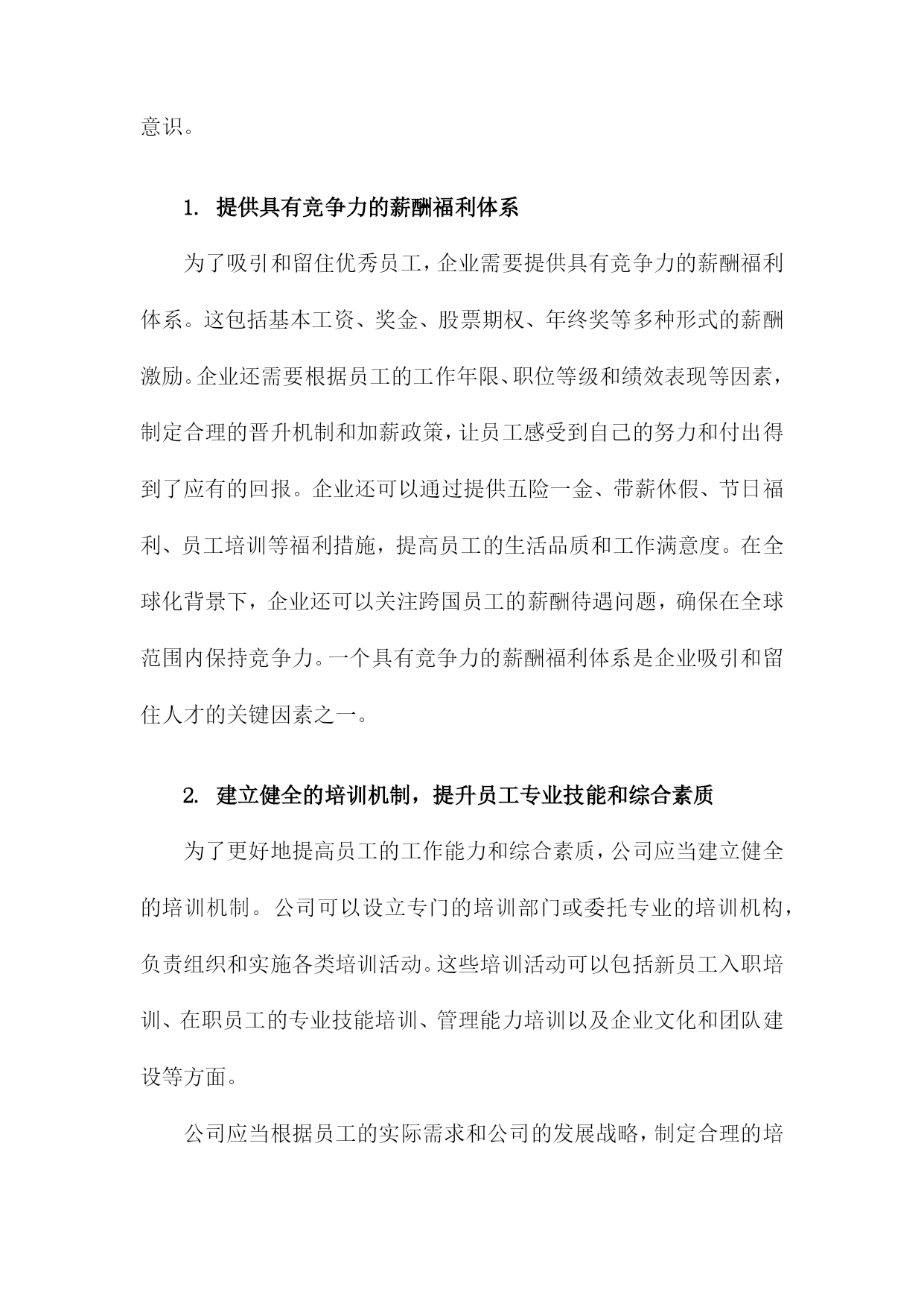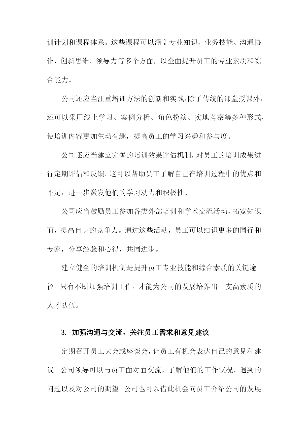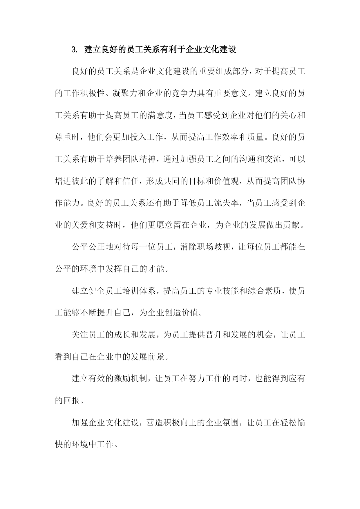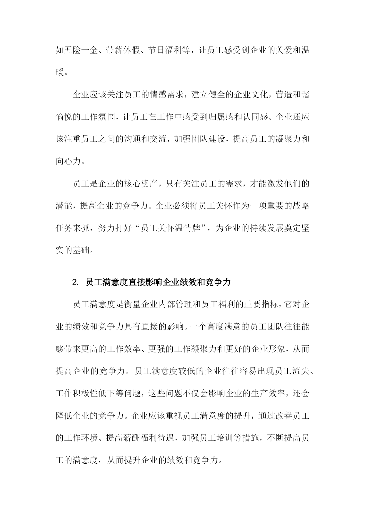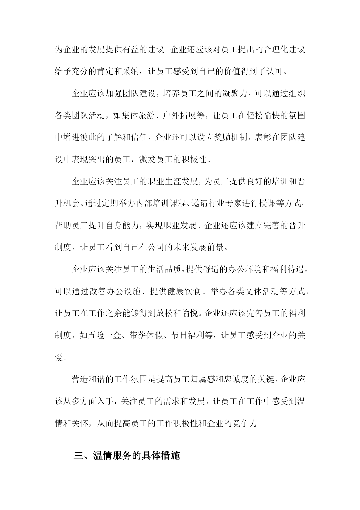 打好员工关怀温情牌一、员工关怀的重要性提高员工满意度和忠诚度:员工关怀是企业对员工的关心和关注,通过提供良好的工作环境、合理的薪酬福利、职业发展机会等多方面的支持,使员工感受到企业的关爱,从而提高员工的工作满意度和忠诚度。增强企业凝聚力:员工关怀有助于增强企业内部的凝聚力,使员工更加认同企业文化,形成共同的价值观和目标。当员工对企业有归属感时,他们会更加投入工作,为企业创造更大的价值。促进人才留任:员工关怀是吸引和留住人才的重要手段。通过对员工的关心和关注,企业能够为员工提供更好的职业发展空间,使员工在工作中不断成长和进步,从而降低员工流失率。提升企业形象:一个关心员工的企业,往往会给人留下良好的印象。员工关怀不仅有助于提升企业的社会责任感,还能树立企业的正面形象,吸引更多的优秀人才加入。优化组织氛围:员工关怀有助于营造一个积极向上、团结友爱的组织氛围。当员工在一个充满关爱的环境中工作时,他们的工作效率和创造力将得到充分激发,从而推动企业的发展。促进企业可持续发展:员工关怀是企业发展的基础。只有关注员工的需求和期望,才能使企业在激烈的市场竞争中立于不败之地,实现可持续发展。1.员工是企业的核心资产在当今竞争激烈的市场环境中,企业的核心竞争力往往取决于其员工的素质、能力和忠诚度。员工是企业最宝贵的财富,他们的工作态度、技能水平和团队协作能力直接影响到企业的运营效率和盈利能力。企业必须高度重视员工的培养和发展,为他们提供良好的工作环境和福利待遇,激发他们的工作积极性和创造力,从而提高企业的核心竞争力。企业应该关注员工的职业发展,通过制定合理的晋升机制和培训计划,帮助员工提升自己的职业技能,实现个人价值。企业还应该鼓励员工参加各类专业培训和学术交流活动,拓宽知识面,提高综合素质。企业应该关注员工的工作与生活平衡,合理安排工作时间,避免过度加班,确保员工有足够的休息时间。企业还应该关注员工的身心健康,定期开展体检和健康讲座,提倡健康的生活方式。企业应该关注员工的福利待遇,提供具有竞争力的薪酬体系,确保员工的基本生活需求得到满足。企业还应该设立完善的福利制度,如五险一金、带薪休假、节日福利等,让员工感受到企业的关爱和温暖。企业应该关注员工的情感需求,建立健全的企业文化,营造和谐愉悦的工作氛围,让员工在工作中感受到归属感和认同感。企业还应该注重员工之间的沟通和交流,加强团队建设,提高员工的凝聚力和向心力。员工是企业的核心资产,只有关注员工的需求,才能激发他们的潜能,提高企业的竞争力。企业必须将员工关怀作为一项重要的战略任务来抓,努力打好“员工关怀温情牌”,为企业的持续发展奠定坚实的基础。2.员工满意度直接影响企业绩效和竞争力员工满意度是衡量企业内部管理和员工福利的重要指标,它对企业的绩效和竞争力具有直接的影响。一个高度满意的员工团队往往能够带来更高的工作效率、更强的工作凝聚力和更好的企业形象,从而提高企业的竞争力。员工满意度较低的企业往往容易出现员工流失、工作积极性低下等问题,这些问题不仅会影响企业的生产效率,还会降低企业的竞争力。企业应该重视员工满意度的提升,通过改善员工的工作环境、提高薪酬福利待遇、加强员工培训等措施,不断提高员工的满意度,从而提升企业的绩效和竞争力。3.建立良好的员工关系有利于企业文化建设良好的员工关系是企业文化建设的重要组成部分,对于提高员工的工作积极性、凝聚力和企业的竞争力具有重要意义。建立良好的员工关系有助于提高员工的满意度,当员工感受到企业对他们的关心和尊重时,他们会更加投入工作,从而提高工作效率和质量。良好的员工关系有助于培养团队精神,通过加强员工之间的沟通和交流,可以增进彼此的了解和信任,形成共同的目标和价值观,从而提高团队协作能力。良好的员工关系还有助于降低员工流失率,当员工感受到企业的关爱和支持时,他们更愿意留在企业,为企业的发展做出贡献。公平公正地对待每一位员工,消除职场歧视,让每位员工都能在公平的环境中发挥自己的才能。建立健全员工培训体系,提高员工的专业技能和综合素质,使员工能够不断提升自己,为企业创造价值。关注员工的成长和发展,为员工提供晋升和发展的机会,让员工看到自己在企业中的发展前景。建立有效的激励机制,让员工在努力工作的同时,也能得到应有的回报。加强企业文化建设,营造积极向上的企业氛围,让员工在轻松愉快的环境中工作。重视员工的心理健康,关注员工的身心健康问题,为员工提供必要的心理支持和帮助。建立健全员工沟通机制,鼓励员工提出意见和建议,及时解决员工的问题和困扰。举办丰富多彩的员工活动,增进员工之间的友谊和感情,提高员工的凝聚力和向心力。建立良好的员工关系有利于企业文化建设,有助于提高员工的满意度、凝聚力和企业的竞争力。企业应该从多方面入