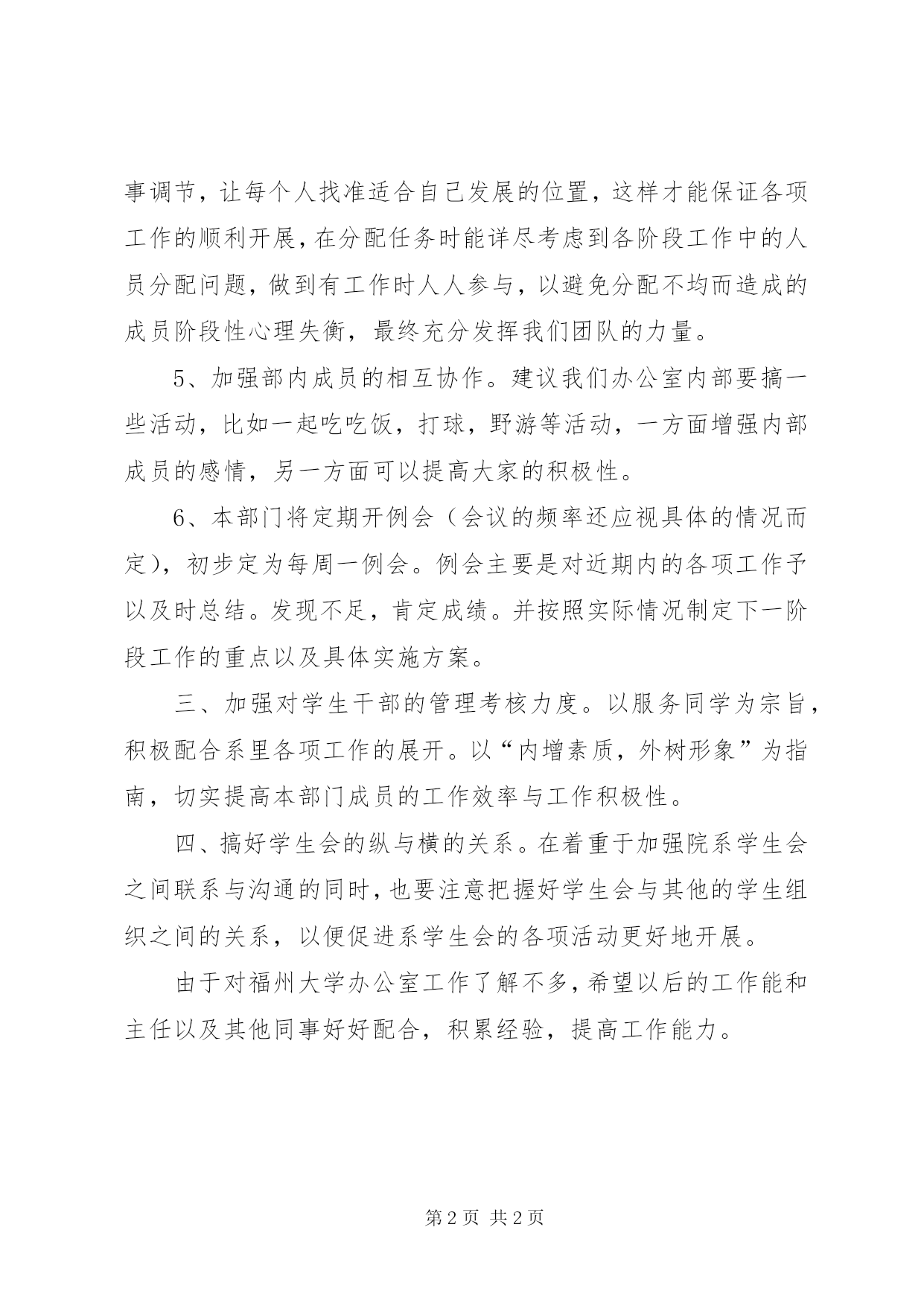 第PAGE\*Arabic\*MERGEFORMAT2页共NUMPAGES\*MERGEFORMAT2页研究生会办公室工作计划新的学期开始,很开心加入一个新的组织,总结过去经验,对2011-2011学年上半学期的工作做了制定与规划。办公室是一个极为重要的部门,是学生会的咽喉,有着自己的特色与优势,所以我们要做好这个学院联系学生的桥梁和纽带作用,更好的为同学服务。本学期,我对将要开展的工作制定了框架,具体计划如下:一、针对本学期学校要组织的50年校庆以及有关活动做好规划,协调学生会各部门做好宣传和策划,负责好文件和有关筹备工作。二、做好内部常规工作和内部建设,做好办公室本职工作。一些内部建设工作在本学期进行了规划或已开始进行,要对规划进行补充和完善,同时继续做好常规工作。1、信息管理。每学年人员变动,学生会成员信息要确定下来,本学期我部将做好成员信息的统计情况,方便主席团及各部的联系工作。2、档案管理。办公室档案,在本学期中,我部将对档案保存和整理做到精细而且简便易查。3、在值班、订会等方面要细化日常工作,实行个人负责制,任务到人,人人负责,相互协调和配合。4、因人而宜,因事而宜。在具体开展工作的同时,因人因事调节,让每个人找准适合自己发展的位置,这样才能保证各项工作的顺利开展,在分配任务时能详尽考虑到各阶段工作中的人员分配问题,做到有工作时人人参与,以避免分配不均而造成的成员阶段性心理失衡,最终充分发挥我们团队的力量。5、加强部内成员的相互协作。建议我们办公室内部要搞一些活动,比如一起吃吃饭,打球,野游等活动,一方面增强内部成员的感情,另一方面可以提高大家的积极性。6、本部门将定期开例会(会议的频率还应视具体的情况而定),初步定为每周一例会。例会主要是对近期内的各项工作予以及时总结。发现不足,肯定成绩。并按照实际情况制定下一阶段工作的重点以及具体实施方案。三、加强对学生干部的管理考核力度。以服务同学为宗旨,积极配合系里各项工作的展开。以“内增素质,外树形象”为指南,切实提高本部门成员的工作效率与工作积极性。四、搞好学生会的纵与横的关系。在着重于加强院系学生会之间联系与沟通的同时,也要注意把握好学生会与其他的学生组织之间的关系,以便促进系学生会的各项活动更好地开展。由于对福州大学办公室工作了解不多,希望以后的工作能和主任以及其他同事好好配合,积累经验,提高工作能力。