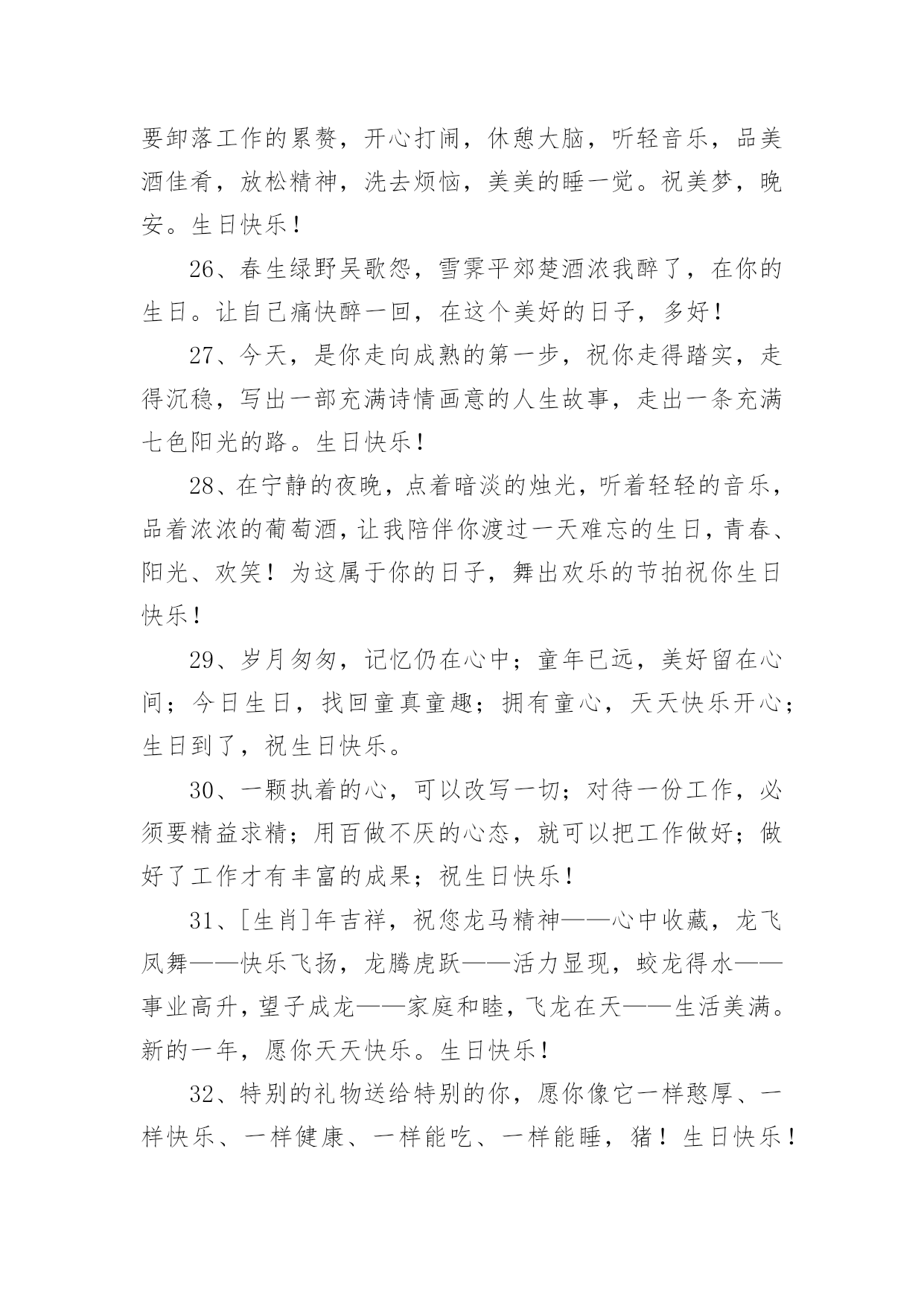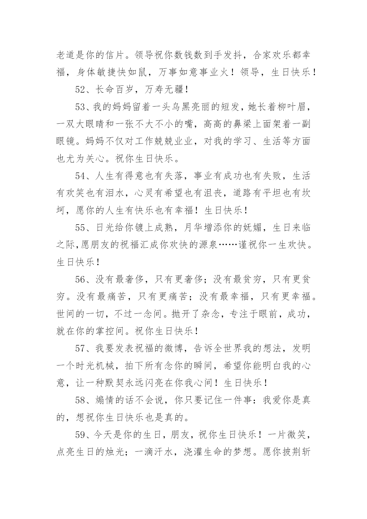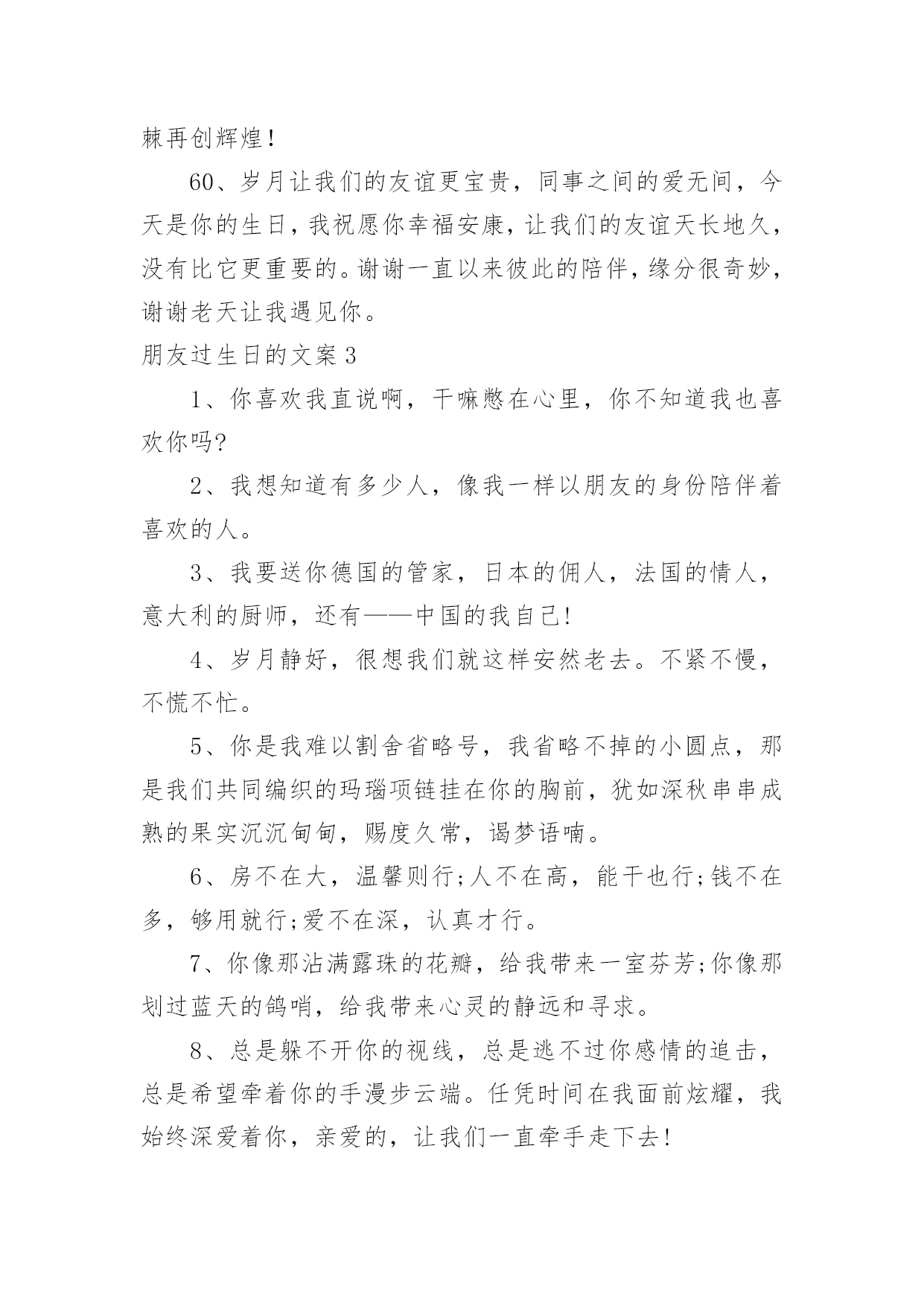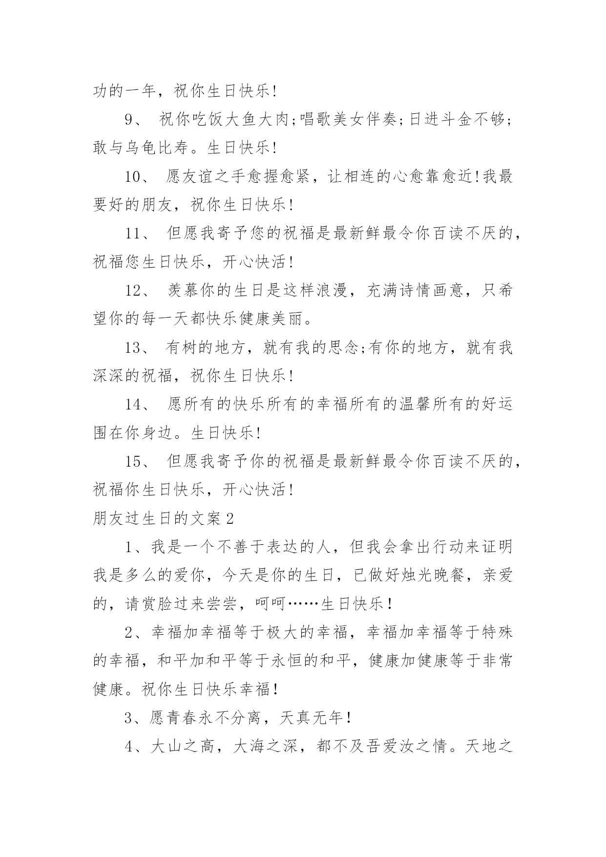 朋友过生日的文案朋友过生日的文案(汇编15篇)在现实生活或工作学习中,大家一定都接触过一些使用较为普遍的文案吧,文案用于跟亲朋好友分享个人生活情况。朋友圈发什么样的文案才受欢迎呢?以下是小编为大家收集的朋友过生日的文案,仅供参考,欢迎大家阅读。朋友过生日的文案11、祈望你心灵深处芳草永绿,青春常驻,笑口常开。祝你生日快乐,健康幸福!2、祝福一位美丽迷人,聪明大方,成熟端庄,又倍受赞叹的妙人儿,生日快乐。3、在你生日这一天,将快乐的音符,作为礼物送给你,愿你拥有个美丽的日子!4、在您的身上,我懂得了人生的意义,看到了真正的生命之光。祝您生日快乐!5、为像你这样慈祥的父亲祝寿,只有最好的,真正的祝愿才够。生日快乐!オ6、祝奶奶生日快乐,身体健康,寿比南山!福如东海长流水,寿比南山不老松。7、今天,像小鸟初展新翅;,明天,像雄鹰鹏程万里。,愿你拥有愉快的生日!8、又是一个美好的开始,愿我虔诚的祝福,带给你成功的一年,祝你生日快乐!9、祝你吃饭大鱼大肉;唱歌美女伴奏;日进斗金不够;敢与乌龟比寿。生日快乐!10、愿友谊之手愈握愈紧,让相连的心愈靠愈近!我最要好的朋友,祝你生日快乐!11、但愿我寄予您的祝福是最新鲜最令你百读不厌的,祝福您生日快乐,开心快活!12、羡慕你的生日是这样浪漫,充满诗情画意,只希望你的每一天都快乐健康美丽。13、有树的地方,就有我的思念;有你的地方,就有我深深的祝福,祝你生日快乐!14、愿所有的快乐所有的幸福所有的温馨所有的好运围在你身边。生日快乐!15、但愿我寄予你的祝福是最新鲜最令你百读不厌的,祝福你生日快乐,开心快活!朋友过生日的文案21、我是一个不善于表达的人,但我会拿出行动来证明我是多么的爱你,今天是你的生日,已做好烛光晚餐,亲爱的,请赏脸过来尝尝,呵呵……生日快乐!2、幸福加幸福等于极大的幸福,幸福加幸福等于特殊的幸福,和平加和平等于永恒的和平,健康加健康等于非常健康。祝你生日快乐幸福!3、愿青春永不分离,天真无年!4、大山之高,大海之深,都不及吾爱汝之情。天地之广,宇宙之极,都不如吾思汝之情。牛郎织女,爱情典范,天作之合,相恋之愿。短信传情,给吾之便,爱汝之情,其意自现。生日快乐!5、我的牵挂一样多情;愿你的生命抬头是春,俯首是梦,甜蜜伴随你每个春夏秋冬。生日快乐!6、今天是你生日,我为你做了一碗长寿面,每根面条里都有一份快乐,最后浇上开心的汤汁、放上幸福的煎蛋。愿你吃在嘴里,美在心里。7、您的节日,和春天一起来临;您的心血,为企业的明天书写。在这个美好的日子里,我们的祝福和季节一样温馨:生日快乐!领导生日祝福短信8、一个人,如果不给你自己设限,哪么就无法发挥你的所有智慧;这世上,没有不劳而获之人,想成功,就应该有更加努力的未来;过去的一切,公司感谢你,并希望你再接再励,生日快乐!9、祝你生日快乐,只愿你新衣怒马,一天看到长安花,穿过千山万水,归来依然年轻。来吧!未来是有希望的。10、生日快乐!在你生日来临之际,送上我最真挚的祝福。祝你事业正当午,身体壮如虎,金钱不胜数,干活不辛苦,悠闲像老鼠,浪漫似乐谱,快乐非你莫属!生日快乐!11、未来的道路,不仅有雨露阳光,也会有雷电风暴,你要有勇气去面对这一切。12、你是我唯一的执着丶亲爱的,生日快乐!13、你是一个好员工,对待工作从来都是兢兢业业;你是一个好同事,对人和善待人又好;你是一个好朋友,我们从来都是无话不说;在此,我真的好喜欢你,祝你生日快乐!14、相互协助,是我们跋涉道路;构建双赢,是我们共同心情;携手未来,是我们真心关怀;祝福事业,是我们美好快乐;愿您事业蒸腾!生日快乐!15、甜美的音乐飘荡,明亮的蜡烛摇曳,美丽的鲜花芬芳,美丽的礼物微笑,大蛋糕甜蜜,真诚的祝福飞翔。祝你享受这美好的时刻,生日快乐,生活幸福。16、祝愿你,乐无边,福无尽。生日快乐!17、天天天真快乐;年年年轻漂亮。生日快乐!18、生日将临,我也没啥好送的,送您五万万吧:万万要开心,万万要舒心,万万要健!19、祈望你心灵深处芳草永绿,青春常驻,笑口常开。祝你生日快乐,健康幸福,家庭和睦!20、在宁静的夜晚,伴着梦幻的烛光,听着轻轻的音乐,品着浓浓的葡萄酒,让我陪伴你渡过一个难忘的生日!——情侣之间的生日就应该是这样的,夜晚、音乐、烛光,情调的体现了祝福对方生日快乐。21、高山远水,历经千帆,岁月长河,这一年,这一刻,心愿君,生辰悦。22、事业有成,平安喜乐。23、岁岁生日的幸福。幸运的你,明天会更好!24、最幸福的全给你,最好是你的心事都如意。25、夕阳抚慰你一天的疲累,星辉按揉酸痛的背,夜晚要卸落工作的累赘,开心打闹,休憩大脑,听轻音乐,品美酒佳肴,放松精神,洗去烦恼,美美的睡一觉。祝美梦,晚安。生日快乐!26、春生绿野吴歌怨,雪霁平郊楚酒浓我醉了,在你的生日。让自己痛快