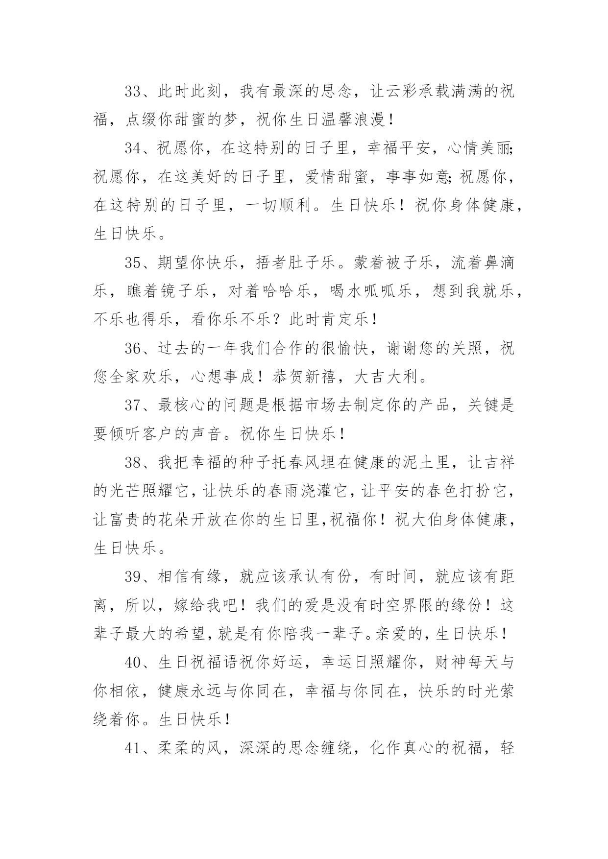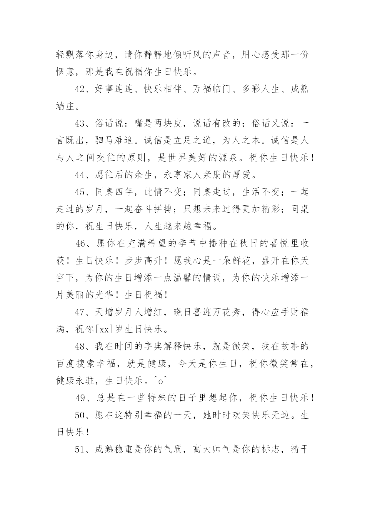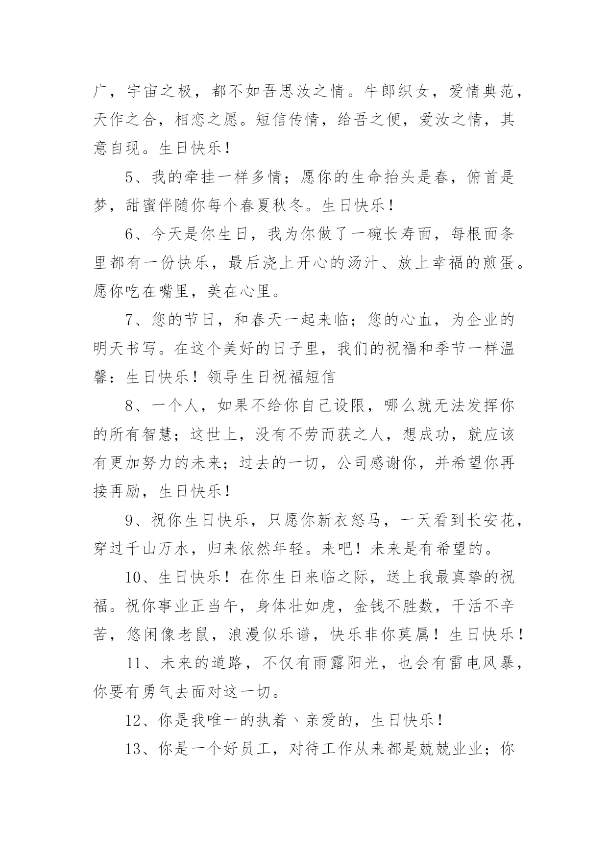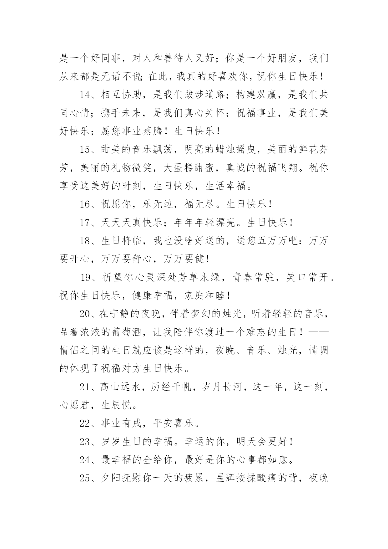 朋友过生日的文案朋友过生日的文案(汇编15篇)在现实生活或工作学习中,大家一定都接触过一些使用较为普遍的文案吧,文案用于跟亲朋好友分享个人生活情况。朋友圈发什么样的文案才受欢迎呢?以下是小编为大家收集的朋友过生日的文案,仅供参考,欢迎大家阅读。朋友过生日的文案11、祈望你心灵深处芳草永绿,青春常驻,笑口常开。祝你生日快乐,健康幸福!2、祝福一位美丽迷人,聪明大方,成熟端庄,又倍受赞叹的妙人儿,生日快乐。3、在你生日这一天,将快乐的音符,作为礼物送给你,愿你拥有个美丽的日子!4、在您的身上,我懂得了人生的意义,看到了真正的生命之光。祝您生日快乐!5、为像你这样慈祥的父亲祝寿,只有最好的,真正的祝愿才够。生日快乐!オ6、祝奶奶生日快乐,身体健康,寿比南山!福如东海长流水,寿比南山不老松。7、今天,像小鸟初展新翅;,明天,像雄鹰鹏程万里。,愿你拥有愉快的生日!8、又是一个美好的开始,愿我虔诚的祝福,带给你成功的一年,祝你生日快乐!9、祝你吃饭大鱼大肉;唱歌美女伴奏;日进斗金不够;敢与乌龟比寿。生日快乐!10、愿友谊之手愈握愈紧,让相连的心愈靠愈近!我最要好的朋友,祝你生日快乐!11、但愿我寄予您的祝福是最新鲜最令你百读不厌的,祝福您生日快乐,开心快活!12、羡慕你的生日是这样浪漫,充满诗情画意,只希望你的每一天都快乐健康美丽。13、有树的地方,就有我的思念;有你的地方,就有我深深的祝福,祝你生日快乐!14、愿所有的快乐所有的幸福所有的温馨所有的好运围在你身边。生日快乐!15、但愿我寄予你的祝福是最新鲜最令你百读不厌的,祝福你生日快乐,开心快活!朋友过生日的文案21、我是一个不善于表达的人,但我会拿出行动来证明我是多么的爱你,今天是你的生日,已做好烛光晚餐,亲爱的,请赏脸过来尝尝,呵呵……生日快乐!2、幸福加幸福等于极大的幸福,幸福加幸福等于特殊的幸福,和平加和平等于永恒的和平,健康加健康等于非常健康。祝你生日快乐幸福!3、愿青春永不分离,天真无年!4、大山之高,大海之深,都不及吾爱汝之情。天地之广,宇宙之极,都不如吾思汝之情。牛郎织女,爱情典范,天作之合,相恋之愿。短信传情,给吾之便,爱汝之情,其意自现。生日快乐!5、我的牵挂一样多情;愿你的生命抬头是春,俯首是梦,甜蜜伴随你每个春夏秋冬。生日快乐!6、今天是你生日,我为你做了一碗长寿面,每根面条里都有一份快乐,最后浇上开心的汤汁、放上幸福的煎蛋。愿你吃在嘴里,美在心里。7、您的节日,和春天一起来临;您的心血,为企业的明天书写。在这个美好的日子里,我们的祝福和季节一样温馨:生日快乐!领导生日祝福短信8、一个人,如果不给你自己设限,哪么就无法发挥你的所有智慧;这世上,没有不劳而获之人,想成功,就应该有更加努力的未来;过去的一切,公司感谢你,并希望你再接再励,生日快乐!9、祝你生日快乐,只愿你新衣怒马,一天看到长安花,穿过千山万水,归来依然年轻。来吧!未来是有希望的。10、生日快乐!在你生日来临之际,送上我最真挚的祝福。祝你事业正当午,身体壮如虎,金钱不胜数,干活不辛苦,悠闲像老鼠,浪漫似乐谱,快乐非你莫属!生日快乐!11、未来的道路,不仅有雨露阳光,也会有雷电风暴,你要有勇气去面对这一切。12、你是我唯一的执着丶亲爱的,生日快乐!13、你是一个好员工,对待工作从来都是兢兢业业;你是一个好同事,对人和善待人又好;你是一个好朋友,我们从来都是无话不说;在此,我真的好喜欢你,祝你生日快乐!14、相互协助,是我们跋涉道路;构建双赢,是我们共同心情;携手未来,是我们真心关怀;祝福事业,是我们美好快乐;愿您事业蒸腾!生日快乐!15、甜美的音乐飘荡,明亮的蜡烛摇曳,美丽的鲜花芬芳,美丽的礼物微笑,大蛋糕甜蜜,真诚的祝福飞翔。祝你享受这美好的时刻,生日快乐,生活幸福。16、祝愿你,乐无边,福无尽。生日快乐!17、天天天真快乐;年年年轻漂亮。生日快乐!18、生日将临,我也没啥好送的,送您五万万吧:万万要开心,万万要舒心,万万要健!19、祈望你心灵深处芳草永绿,青春常驻,笑口常开。祝你生日快乐,健康幸福,家庭和睦!20、在宁静的夜晚,伴着梦幻的烛光,听着轻轻的音乐,品着浓浓的葡萄酒,让我陪伴你渡过一个难忘的生日!——情侣之间的生日就应该是这样的,夜晚、音乐、烛光,情调的体现了祝福对方生日快乐。21、高山远水,历经千帆,岁月长河,这一年,这一刻,心愿君,生辰悦。22、事业有成,平安喜乐。23、岁岁生日的幸福。幸运的你,明天会更好!24、最幸福的全给你,最好是你的心事都如意。25、夕阳抚慰你一天的疲累,星辉按揉酸痛的背,夜晚要卸落工作的累赘,开心打闹,休憩大脑,听轻音乐,品美酒佳肴,放松精神,洗去烦恼,美美的睡一觉。祝美梦,晚安。生日快乐!26、春生绿野吴歌怨,雪霁平郊楚酒浓我醉了,在你的生日。让自己痛快