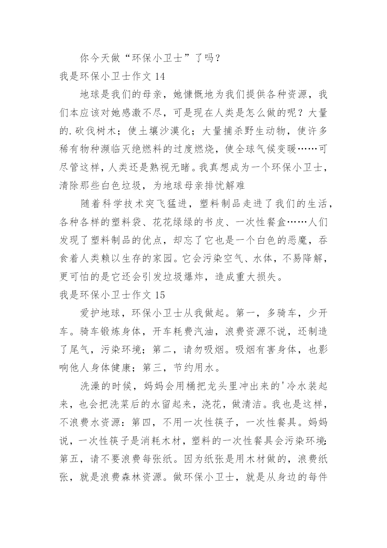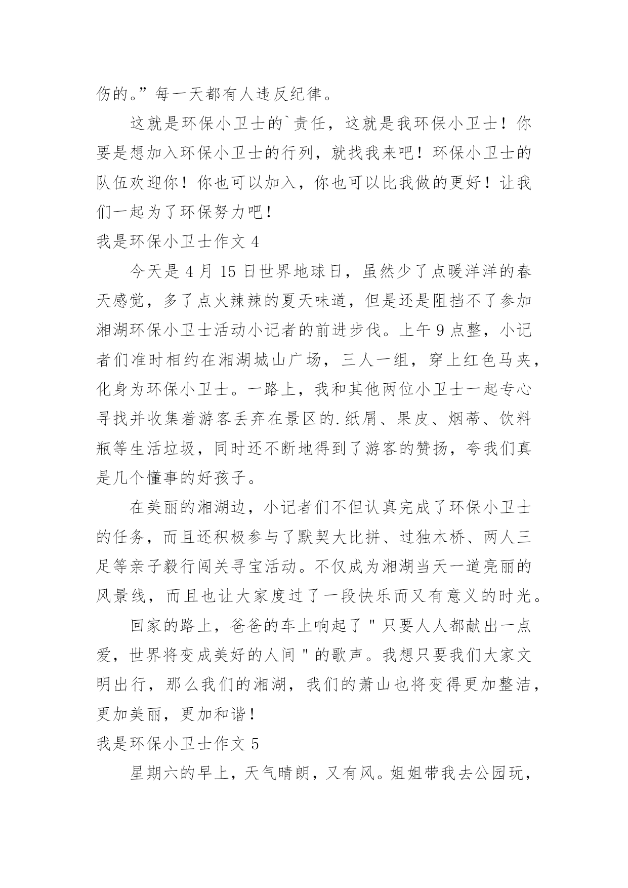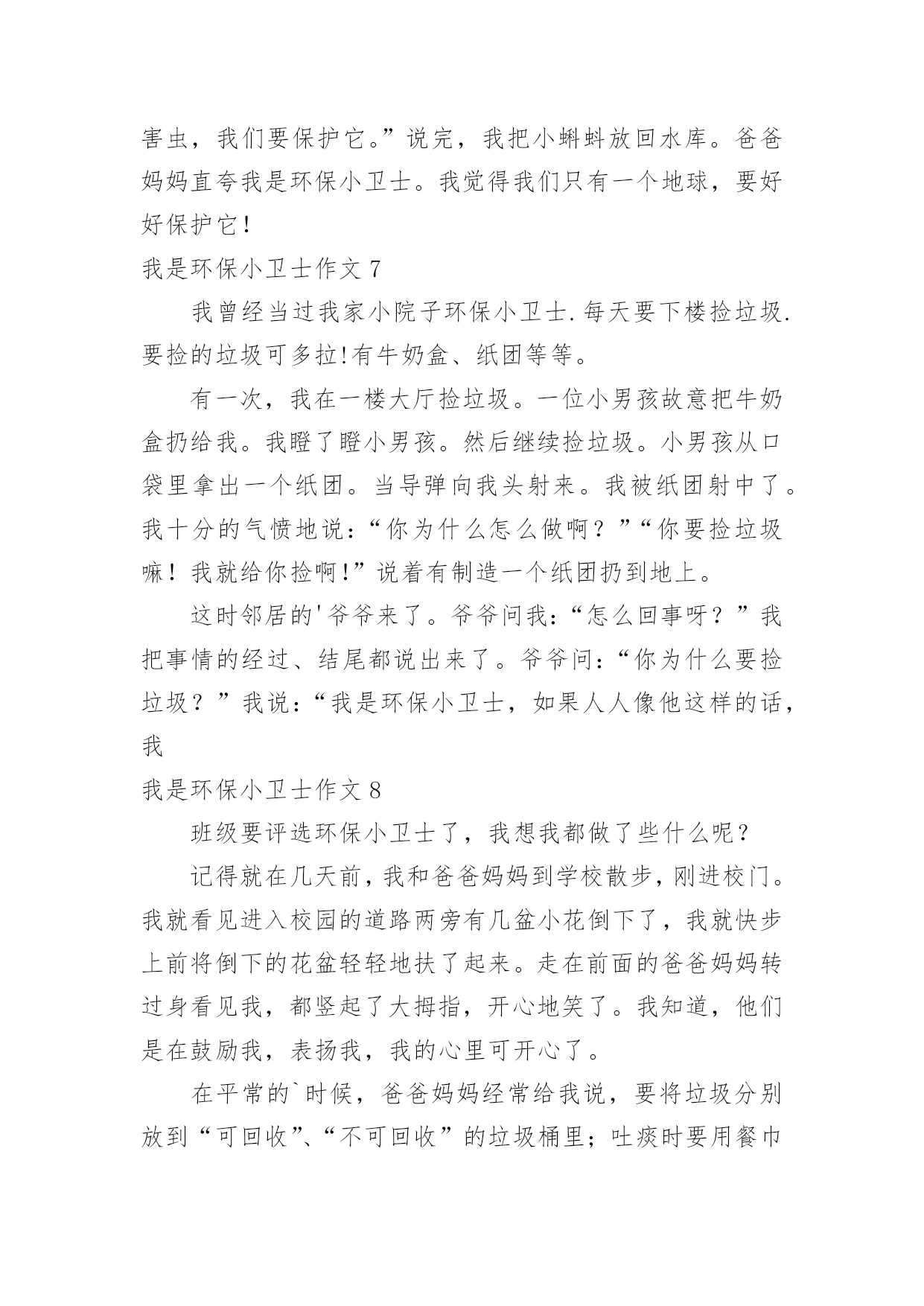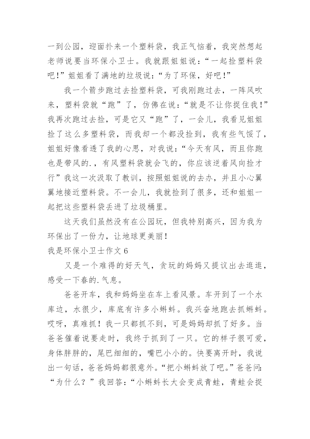 我是环保小卫士作文我是环保小卫士作文(精选)在日常的学习、工作、生活中,大家总免不了要接触或使用作文吧,作文根据体裁的不同可以分为记叙文、说明文、应用文、议论文。如何写一篇有思想、有文采的作文呢?下面是小编帮大家整理的我是环保小卫士作文,仅供参考,希望能够帮助到大家。我是环保小卫士作文1天空是鸟儿的家,河水是小鱼的家,森林是动物的家,地球是我们的家,我们应该好好保护这个家,才能让它更美丽。一个阳光明媚的上午,天空一片蔚蓝,像是一幅蓝色的画,云朵在天上自由地散步。地面也一尘不染。我哼着歌走在亲水平台边,突然,我听见了一声咳嗽,紧接着一口痰出现在了地上,我仔细一看原来是一位西装革履的叔叔,他怎么可以这样?难道不知道不能随地吐痰,当我正准备走的时候地面上又出现了一片“雪花”,当我看见干净的地面上出现了这么多的`垃圾,我心想到了一句话:地球是我家,环保靠大家。这位叔叔可能没有听过这句话。我想找他,可是他已经走得无影无踪了。我捡起了这张纸,丢进垃圾桶了,默默地走开了。通过这件事我知道了我们要爱护环境,这样我们的生活环境会变得到更加美丽。也希望大家从身边的小事做起,爱护我们的家园。共同来环保真实的自己家乡的清江我是环保小卫士神奇的动力船我是环保小卫士作文2昔日的地球是一个美丽的蓝色水球,外围弥漫着一层神密的薄纱;现在的地球就快变成了一个千疮百孔的灰色星球,人类的.这种行为使地球毫无生机。曾经有一片大海,它与蓝天对印,与天空的小鸟做朋友。人们坐在沙滩上,孩子们玩了起来。海很静,仿佛明镜一般,倒映着蓝天白云,绿树红花,犹如一块碧玉。再看仔细一点,便可以看清海水格外清澈,连里面的细沙、石子都看得一清二楚。不过,现在的那片海已经不那么美丽了――因为它已经被人类破坏了。我是环保小卫士作文3今天我给大家讲一讲我当环保小卫士也是有原因的哦!每到外面都有人把垃圾乱扔,当我拣起垃圾时,我都在想,应该在垃圾桶旁立起一个牌子,上面写着“把垃圾扔进垃圾桶里”。我看见一位叔叔随地吐痰,我就走到他的身边说:“叔叔请不要随地吐痰。”我看见有人践踏草坪,我就跟他说:“请不要践踏草坪!”我希望每一个人都不要践踏草坪,所以我要在那里立一个牌子,“请不要践踏草坪!”我在马路上看见有人闯红灯,我就跟他说:“乱闯红灯危险,会被撞伤的。”每一天都有人违反纪律。这就是环保小卫士的`责任,这就是我环保小卫士!你要是想加入环保小卫士的行列,就找我来吧!环保小卫士的队伍欢迎你!你也可以加入,你也可以比我做的更好!让我们一起为了环保努力吧!我是环保小卫士作文4今天是4月15日世界地球日,虽然少了点暖洋洋的春天感觉,多了点火辣辣的夏天味道,但是还是阻挡不了参加湘湖环保小卫士活动小记者的前进步伐。上午9点整,小记者们准时相约在湘湖城山广场,三人一组,穿上红色马夹,化身为环保小卫士。一路上,我和其他两位小卫士一起专心寻找并收集着游客丢弃在景区的.纸屑、果皮、烟蒂、饮料瓶等生活垃圾,同时还不断地得到了游客的赞扬,夸我们真是几个懂事的好孩子。在美丽的湘湖边,小记者们不但认真完成了环保小卫士的任务,而且还积极参与了默契大比拼、过独木桥、两人三足等亲子毅行闯关寻宝活动。不仅成为湘湖当天一道亮丽的风景线,而且也让大家度过了一段快乐而又有意义的时光。回家的路上,爸爸的车上响起了"只要人人都献出一点爱,世界将变成美好的人间"的歌声。我想只要我们大家文明出行,那么我们的湘湖,我们的萧山也将变得更加整洁,更加美丽,更加和谐!我是环保小卫士作文5星期六的早上,天气晴朗,又有风。姐姐带我去公园玩,一到公园,迎面扑来一个塑料袋,我正气恼着,我突然想起老师说要当环保小卫士。我就跟姐姐说:“一起捡塑料袋吧!”姐姐看了满地的垃圾说:“为了环保,好吧!”我一个箭步跑过去捡塑料袋,可我刚跑过去,一阵风吹来,塑料袋就“跑”了,仿佛在说:“就是不让你捉住我!”我再次跑过去捡,可是它又“跑”了,一会儿,我看见姐姐捡了这么多塑料袋,而我却一个都没捡到,我有些气馁了,姐姐好像看透了我的心思,对我说:“今天有风,而且你跑也是带风的.,有风塑料袋就会飞的,你应该逆着风向捡才行”我这一次汲取了教训,按照姐姐说的去办,并且小心翼翼地接近塑料袋。不一会儿,我就捡到了很多,还和姐姐一起把这些塑料袋丢进了垃圾桶里。这天我们虽然没有在公园玩,但我特别高兴,因为我为环保出了一份力,让地球更美丽!我是环保小卫士作文6又是一个难得的好天气,贪玩的妈妈又提议出去逛逛,感受一下春的.气息。爸爸开车,我和妈妈坐在车上看风景。车开到了一个水库边,水很少,库底有许多小蝌蚪。我兴奋地跑去抓蝌蚪。哎呀,真难抓!我一只都抓不到,可是妈妈却抓了好多。当爸爸催着说要走时,我终于抓到了一只。它的样子很可爱,身体胖胖的,尾巴细细的,嘴巴小小的。快要离开时,我说出一句话,爸爸妈妈都很