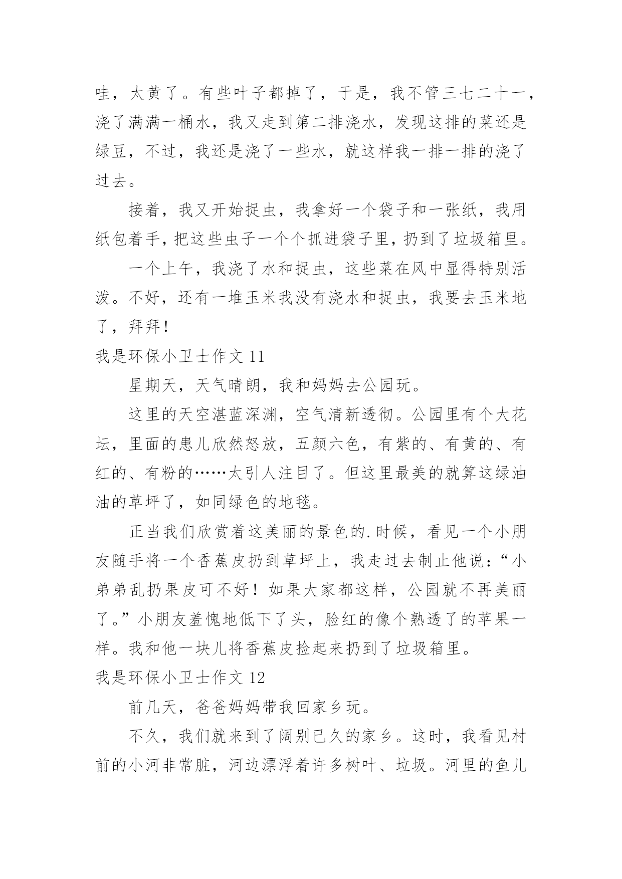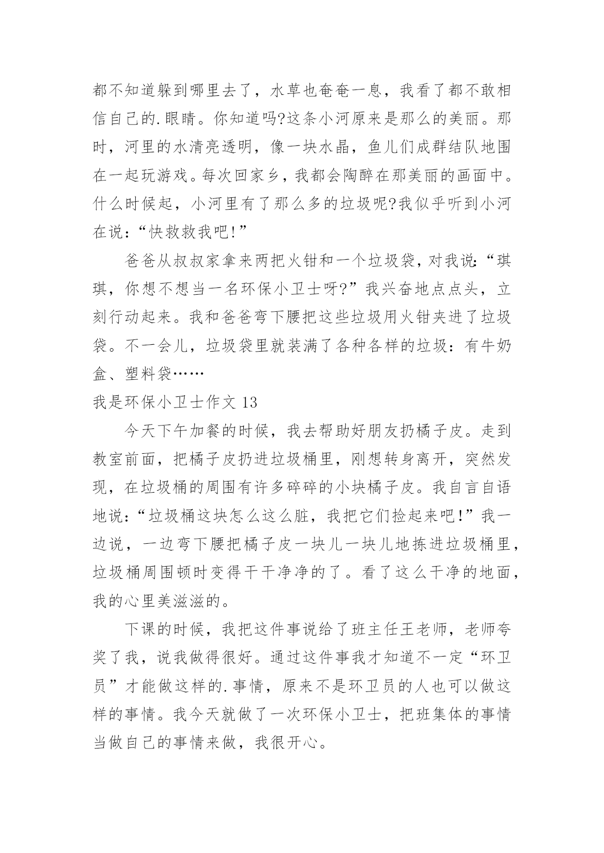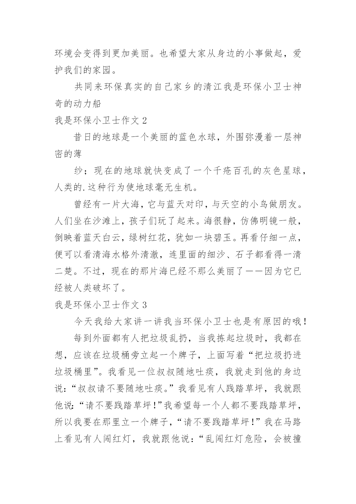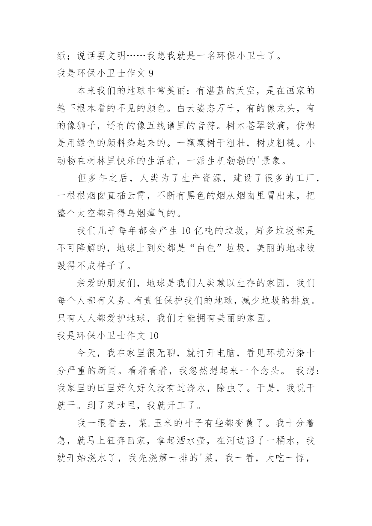 我是环保小卫士作文我是环保小卫士作文(精选)在日常的学习、工作、生活中,大家总免不了要接触或使用作文吧,作文根据体裁的不同可以分为记叙文、说明文、应用文、议论文。如何写一篇有思想、有文采的作文呢?下面是小编帮大家整理的我是环保小卫士作文,仅供参考,希望能够帮助到大家。我是环保小卫士作文1天空是鸟儿的家,河水是小鱼的家,森林是动物的家,地球是我们的家,我们应该好好保护这个家,才能让它更美丽。一个阳光明媚的上午,天空一片蔚蓝,像是一幅蓝色的画,云朵在天上自由地散步。地面也一尘不染。我哼着歌走在亲水平台边,突然,我听见了一声咳嗽,紧接着一口痰出现在了地上,我仔细一看原来是一位西装革履的叔叔,他怎么可以这样?难道不知道不能随地吐痰,当我正准备走的时候地面上又出现了一片“雪花”,当我看见干净的地面上出现了这么多的`垃圾,我心想到了一句话:地球是我家,环保靠大家。这位叔叔可能没有听过这句话。我想找他,可是他已经走得无影无踪了。我捡起了这张纸,丢进垃圾桶了,默默地走开了。通过这件事我知道了我们要爱护环境,这样我们的生活环境会变得到更加美丽。也希望大家从身边的小事做起,爱护我们的家园。共同来环保真实的自己家乡的清江我是环保小卫士神奇的动力船我是环保小卫士作文2昔日的地球是一个美丽的蓝色水球,外围弥漫着一层神密的薄纱;现在的地球就快变成了一个千疮百孔的灰色星球,人类的.这种行为使地球毫无生机。曾经有一片大海,它与蓝天对印,与天空的小鸟做朋友。人们坐在沙滩上,孩子们玩了起来。海很静,仿佛明镜一般,倒映着蓝天白云,绿树红花,犹如一块碧玉。再看仔细一点,便可以看清海水格外清澈,连里面的细沙、石子都看得一清二楚。不过,现在的那片海已经不那么美丽了――因为它已经被人类破坏了。我是环保小卫士作文3今天我给大家讲一讲我当环保小卫士也是有原因的哦!每到外面都有人把垃圾乱扔,当我拣起垃圾时,我都在想,应该在垃圾桶旁立起一个牌子,上面写着“把垃圾扔进垃圾桶里”。我看见一位叔叔随地吐痰,我就走到他的身边说:“叔叔请不要随地吐痰。”我看见有人践踏草坪,我就跟他说:“请不要践踏草坪!”我希望每一个人都不要践踏草坪,所以我要在那里立一个牌子,“请不要践踏草坪!”我在马路上看见有人闯红灯,我就跟他说:“乱闯红灯危险,会被撞伤的。”每一天都有人违反纪律。这就是环保小卫士的`责任,这就是我环保小卫士!你要是想加入环保小卫士的行列,就找我来吧!环保小卫士的队伍欢迎你!你也可以加入,你也可以比我做的更好!让我们一起为了环保努力吧!我是环保小卫士作文4今天是4月15日世界地球日,虽然少了点暖洋洋的春天感觉,多了点火辣辣的夏天味道,但是还是阻挡不了参加湘湖环保小卫士活动小记者的前进步伐。上午9点整,小记者们准时相约在湘湖城山广场,三人一组,穿上红色马夹,化身为环保小卫士。一路上,我和其他两位小卫士一起专心寻找并收集着游客丢弃在景区的.纸屑、果皮、烟蒂、饮料瓶等生活垃圾,同时还不断地得到了游客的赞扬,夸我们真是几个懂事的好孩子。在美丽的湘湖边,小记者们不但认真完成了环保小卫士的任务,而且还积极参与了默契大比拼、过独木桥、两人三足等亲子毅行闯关寻宝活动。不仅成为湘湖当天一道亮丽的风景线,而且也让大家度过了一段快乐而又有意义的时光。回家的路上,爸爸的车上响起了"只要人人都献出一点爱,世界将变成美好的人间"的歌声。我想只要我们大家文明出行,那么我们的湘湖,我们的萧山也将变得更加整洁,更加美丽,更加和谐!我是环保小卫士作文5星期六的早上,天气晴朗,又有风。姐姐带我去公园玩,一到公园,迎面扑来一个塑料袋,我正气恼着,我突然想起老师说要当环保小卫士。我就跟姐姐说:“一起捡塑料袋吧!”姐姐看了满地的垃圾说:“为了环保,好吧!”我一个箭步跑过去捡塑料袋,可我刚跑过去,一阵风吹来,塑料袋就“跑”了,仿佛在说:“就是不让你捉住我!”我再次跑过去捡,可是它又“跑”了,一会儿,我看见姐姐捡了这么多塑料袋,而我却一个都没捡到,我有些气馁了,姐姐好像看透了我的心思,对我说:“今天有风,而且你跑也是带风的.,有风塑料袋就会飞的,你应该逆着风向捡才行”我这一次汲取了教训,按照姐姐说的去办,并且小心翼翼地接近塑料袋。不一会儿,我就捡到了很多,还和姐姐一起把这些塑料袋丢进了垃圾桶里。这天我们虽然没有在公园玩,但我特别高兴,因为我为环保出了一份力,让地球更美丽!我是环保小卫士作文6又是一个难得的好天气,贪玩的妈妈又提议出去逛逛,感受一下春的.气息。爸爸开车,我和妈妈坐在车上看风景。车开到了一个水库边,水很少,库底有许多小蝌蚪。我兴奋地跑去抓蝌蚪。哎呀,真难抓!我一只都抓不到,可是妈妈却抓了好多。当爸爸催着说要走时,我终于抓到了一只。它的样子很可爱,身体胖胖的,尾巴细细的,嘴巴小小的。快要离开时,我说出一句话,爸爸妈妈都很