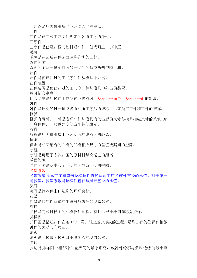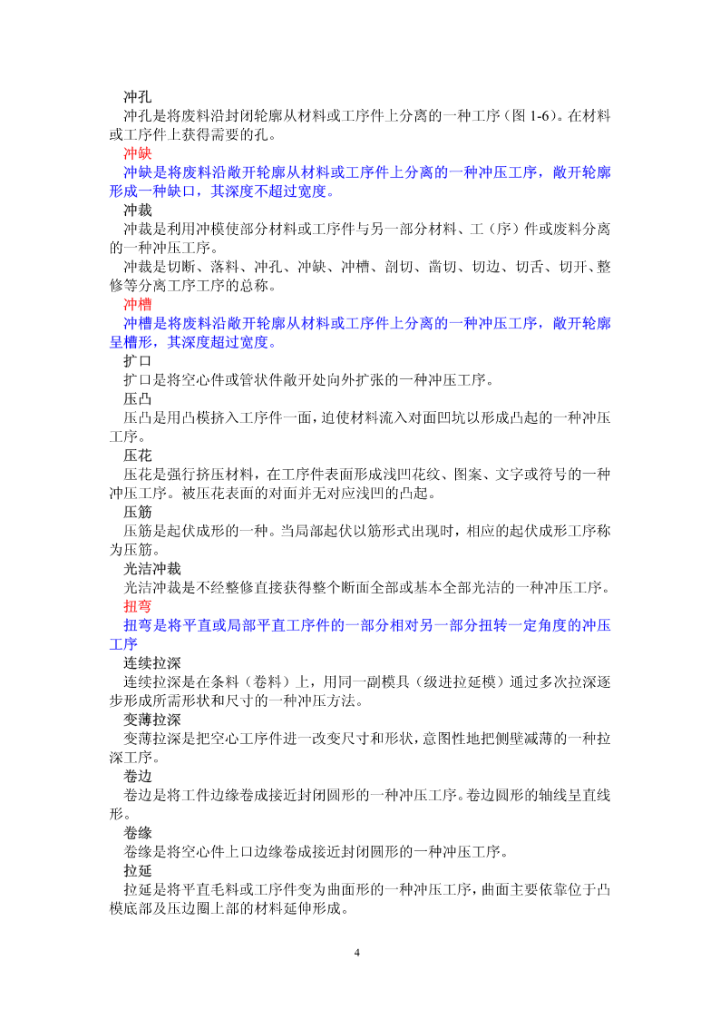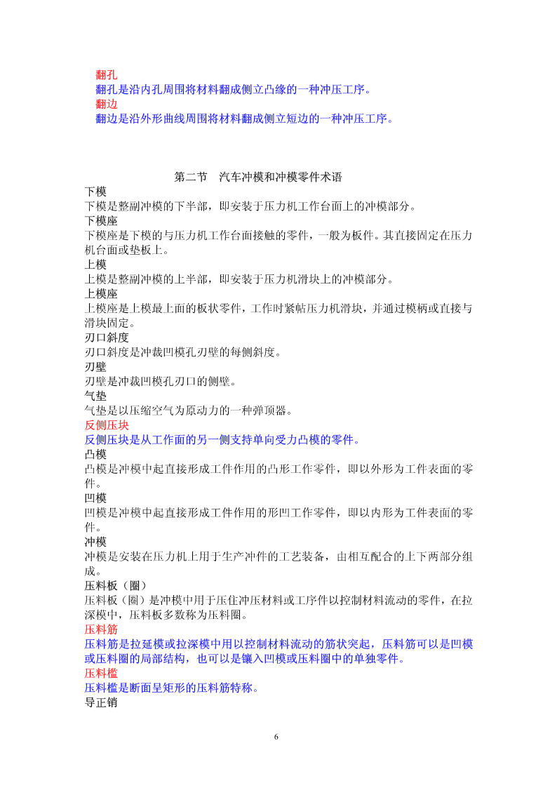 汽车冲模培训教程盘起工业(大连)有限公司汽模标准件专题组2003年12月总纲第一章冲模有关术语第一节冲压工序术语第二节冲模和冲模零件术语第三节冲压工艺术语第二章汽车覆盖件冲模第一节汽车覆盖件的特点与要求第二节工艺方案的确定第三节拉延模第四节修边模第五节翻边模第六节斜楔模第七节压合模第三章汽车冲模所用的标准件第一节导向件第二节定位件第三节冲压元件第四节弹性元件第五节取料件第六节限位件第七节起重件第八节附属零件第四章汽车冲模示例第一节拉延摸第二节修边模第三节翻边模第四节斜楔翻边模第五节综合工序图或DL图2第一章汽车冲模有关术语冲模有关术语,包括冲压工序术语、冲模和冲模零件术语以及冲压工序以外的其他冲压工艺术语。大多数术语付有简图,以便理解。但白马非马,术语简图只是术语的一个示意图例,不包括术语的全部内容。而且此处的术语只是通用术语,不包括一些地方上的通用叫法。第一节汽车冲压工艺术语切开切开是将材料沿敞开轮廓局部而不是完全分离的一种冲压工序。被切开而分离的材料位于或基本位于分离前所处的平面上。切边切边是利用冲模修边成形工序件的边缘,使之具有一定直径、一定高度或一定形状的一种冲压工序切舌切舌是将材料沿敞开轮廓局部而不是完全分离的一种冲压工序。被局部分离的材料,具有工件所要求的一定位置,不再位于分离前所处的平面上。切断切断是将材料沿敞开轮廓分离的一种冲压工序,被分离的材料成为工件或工序件。反拉深(反拉延)反拉深是把空心工序件内壁外翻的一种拉深工序。反拉深的特点:1反拉深材料流动方向与正拉深相反,有利于相互抵消拉深过程中形成的残余应力。2反拉深时,材料弯曲与反弯曲次数较少,冷作硬化也少,有利于成型。正拉深中,位于压料圈圆角部的材料,流向凹模圆角时,内圆弧成了外圆弧。而反拉深中,位于内圆弧处的材料在流动中始终处于内圆弧地位。3反拉深将原有的外表面内翻,原有外表面拉深时的划痕将不影响外观。4反拉深坯料与凹模接触面较正拉深大,材料流动阻力也大,因而一般可不用压料圈。但坯料外缘流经凹模入口圆角时,阻力已明显减少,故大直径薄料拉深仍需压料,以免起皱。5反拉深的拉深力可比正拉深力大20%左右。6反拉深坯料内径D1套在凹模外面,工件外径d2通过凹模内孔。故凹模壁厚不能超过1/2(D1-d2)。即反拉深系数不能太大,太大则凹模壁厚过薄,强度不足。另外,凹模圆角半径不能大于1/4(D1-d2).冲中心孔冲中心孔是在工序件表面形成浅凹中心孔的一种冲压工序,背面材料并无相应凸起。3冲孔冲孔是将废料沿封闭轮廓从材料或工序件上分离的一种工序(图1-6)。在材料或工序件上获得需要的孔。冲缺冲缺是将废料沿敞开轮廓从材料或工序件上分离的一种冲压工序,敞开轮廓形成一种缺口,其深度不超过宽度。冲裁冲裁是利用冲模使部分材料或工序件与另一部分材料、工(序)件或废料分离的一种冲压工序。冲裁是切断、落料、冲孔、冲缺、冲槽、剖切、凿切、切边、切舌、切开、整修等分离工序工序的总称。冲槽冲槽是将废料沿敞开轮廓从材料或工序件上分离的一种冲压工序,敞开轮廓呈槽形,其深度超过宽度。扩口扩口是将空心件或管状件敞开处向外扩张的一种冲压工序。压凸压凸是用凸模挤入工序件一面,迫使材料流入对面凹坑以形成凸起的一种冲压工序。压花压花是强行挤压材料,在工序件表面形成浅凹花纹、图案、文字或符号的一种冲压工序。被压花表面的对面并无对应浅凹的凸起。压筋压筋是起伏成形的一种。当局部起伏以筋形式出现时,相应的起伏成形工序称为压筋。光洁冲裁光洁冲裁是不经整修直接获得整个断面全部或基本全部光洁的一种冲压工序。扭弯扭弯是将平直或局部平直工序件的一部分相对另一部分扭转一定角度的冲压工序连续拉深连续拉深是在条料(卷料)上,用同一副模具(级进拉延模)通过多次拉深逐步形成所需形状和尺寸的一种冲压方法。变薄拉深变薄拉深是把空心工序件进一改变尺寸和形状,意图性地把侧壁减薄的一种拉深工序。卷边卷边是将工件边缘卷成接近封闭圆形的一种冲压工序。卷边圆形的轴线呈直线形。卷缘卷缘是将空心件上口边缘卷成接近封闭圆形的一种冲压工序。拉延拉延是将平直毛料或工序件变为曲面形的一种冲压工序,曲面主要依靠位于凸模底部及压边圈上部的材料延伸形成。4拉弯拉弯是在拉力及弯矩的共同作用下实现弯曲变形,使整个弯曲横断面全部受拉伸应力的一种冲压工序。拉深拉深是将平直毛坯或工序件变为空心件,或者把空心件进一步改变形状和尺寸的一种冲压工序。拉深时主要依靠凸模以外的材料流入凹模而形成。胀形胀形是