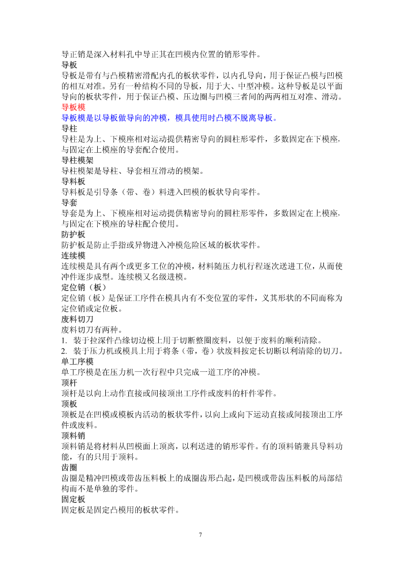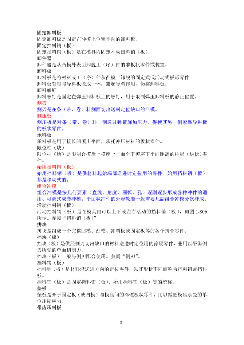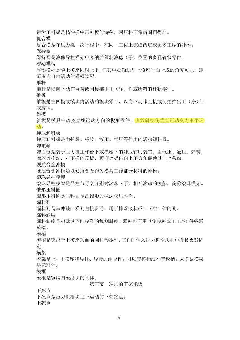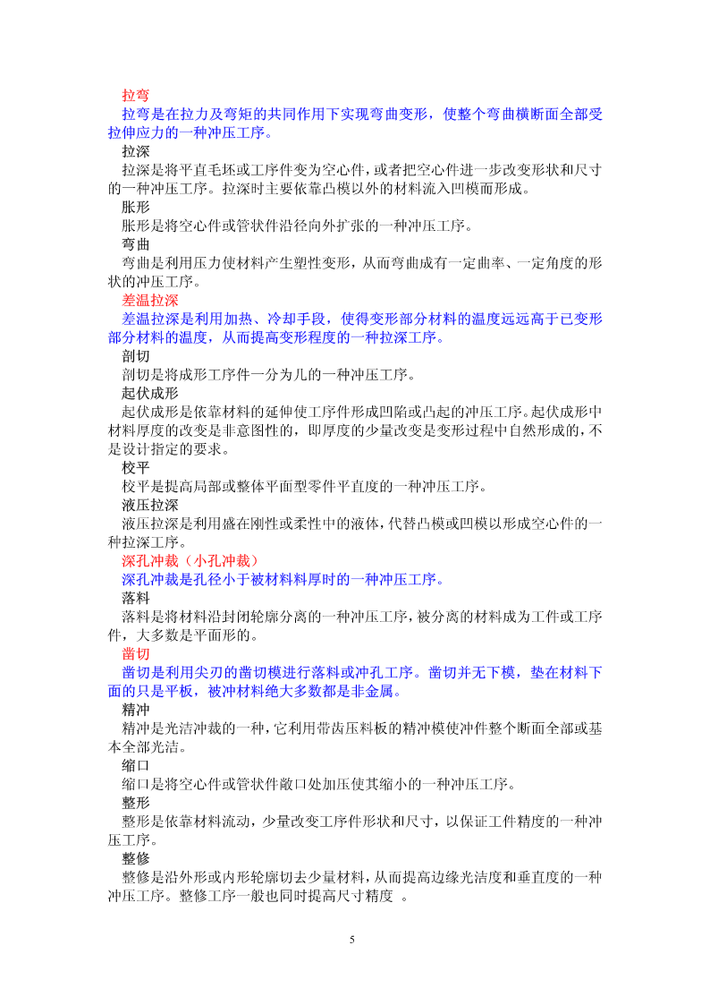 汽车冲模培训教程盘起工业(大连)有限公司汽模标准件专题组2003年12月总纲第一章冲模有关术语第一节冲压工序术语第二节冲模和冲模零件术语第三节冲压工艺术语第二章汽车覆盖件冲模第一节汽车覆盖件的特点与要求第二节工艺方案的确定第三节拉延模第四节修边模第五节翻边模第六节斜楔模第七节压合模第三章汽车冲模所用的标准件第一节导向件第二节定位件第三节冲压元件第四节弹性元件第五节取料件第六节限位件第七节起重件第八节附属零件第四章汽车冲模示例第一节拉延摸第二节修边模第三节翻边模第四节斜楔翻边模第五节综合工序图或DL图2第一章汽车冲模有关术语冲模有关术语,包括冲压工序术语、冲模和冲模零件术语以及冲压工序以外的其他冲压工艺术语。大多数术语付有简图,以便理解。但白马非马,术语简图只是术语的一个示意图例,不包括术语的全部内容。而且此处的术语只是通用术语,不包括一些地方上的通用叫法。第一节汽车冲压工艺术语切开切开是将材料沿敞开轮廓局部而不是完全分离的一种冲压工序。被切开而分离的材料位于或基本位于分离前所处的平面上。切边切边是利用冲模修边成形工序件的边缘,使之具有一定直径、一定高度或一定形状的一种冲压工序切舌切舌是将材料沿敞开轮廓局部而不是完全分离的一种冲压工序。被局部分离的材料,具有工件所要求的一定位置,不再位于分离前所处的平面上。切断切断是将材料沿敞开轮廓分离的一种冲压工序,被分离的材料成为工件或工序件。反拉深(反拉延)反拉深是把空心工序件内壁外翻的一种拉深工序。反拉深的特点:1反拉深材料流动方向与正拉深相反,有利于相互抵消拉深过程中形成的残余应力。2反拉深时,材料弯曲与反弯曲次数较少,冷作硬化也少,有利于成型。正拉深中,位于压料圈圆角部的材料,流向凹模圆角时,内圆弧成了外圆弧。而反拉深中,位于内圆弧处的材料在流动中始终处于内圆弧地位。3反拉深将原有的外表面内翻,原有外表面拉深时的划痕将不影响外观。4反拉深坯料与凹模接触面较正拉深大,材料流动阻力也大,因而一般可不用压料圈。但坯料外缘流经凹模入口圆角时,阻力已明显减少,故大直径薄料拉深仍需压料,以免起皱。5反拉深的拉深力可比正拉深力大20%左右。6反拉深坯料内径D1套在凹模外面,工件外径d2通过凹模内孔。故凹模壁厚不能超过1/2(D1-d2)。即反拉深系数不能太大,太大则凹模壁厚过薄,强度不足。另外,凹模圆角半径不能大于1/4(D1-d2).冲中心孔冲中心孔是在工序件表面形成浅凹中心孔的一种冲压工序,背面材料并无相应凸起。3冲孔冲孔是将废料沿封闭轮廓从材料或工序件上分离的一种工序(图1-6)。在材料或工序件上获得需要的孔。冲缺冲缺是将废料沿敞开轮廓从材料或工序件上分离的一种冲压工序,敞开轮廓形成一种缺口,其深度不超过宽度。冲裁冲裁是利用冲模使部分材料或工序件与另一部分材料、工(序)件或废料分离的一种冲压工序。冲裁是切断、落料、冲孔、冲缺、冲槽、剖切、凿切、切边、切舌、切开、整修等分离工序工序的总称。冲槽冲槽是将废料沿敞开轮廓从材料或工序件上分离的一种冲压工序,敞开轮廓呈槽形,其深度超过宽度。扩口扩口是将空心件或管状件敞开处向外扩张的一种冲压工序。压凸压凸是用凸模挤入工序件一面,迫使材料流入对面凹坑以形成凸起的一种冲压工序。压花压花是强行挤压材料,在工序件表面形成浅凹花纹、图案、文字或符号的一种冲压工序。被压花表面的对面并无对应浅凹的凸起。压筋压筋是起伏成形的一种。当局部起伏以筋形式出现时,相应的起伏成形工序称为压筋。光洁冲裁光洁冲裁是不经整修直接获得整个断面全部或基本全部光洁的一种冲压工序。扭弯扭弯是将平直或局部平直工序件的一部分相对另一部分扭转一定角度的冲压工序连续拉深连续拉深是在条料(卷料)上,用同一副模具(级进拉延模)通过多次拉深逐步形成所需形状和尺寸的一种冲压方法。变薄拉深变薄拉深是把空心工序件进一改变尺寸和形状,意图性地把侧壁减薄的一种拉深工序。卷边卷边是将工件边缘卷成接近封闭圆形的一种冲压工序。卷边圆形的轴线呈直线形。卷缘卷缘是将空心件上口边缘卷成接近封闭圆形的一种冲压工序。拉延拉延是将平直毛料或工序件变为曲面形的一种冲压工序,曲面主要依靠位于凸模底部及压边圈上部的材料延伸形成。4拉弯拉弯是在拉力及弯矩的共同作用下实现弯曲变形,使整个弯曲横断面全部受拉伸应力的一种冲压工序。拉深拉深是将平直毛坯或工序件变为空心件,或者把空心件进一步改变形状和尺寸的一种冲压工序。拉深时主要依靠凸模以外的材料流入凹模而形成。胀形胀形是
