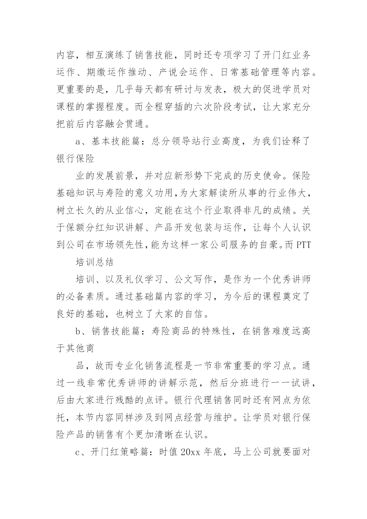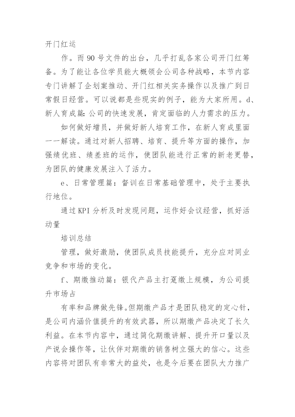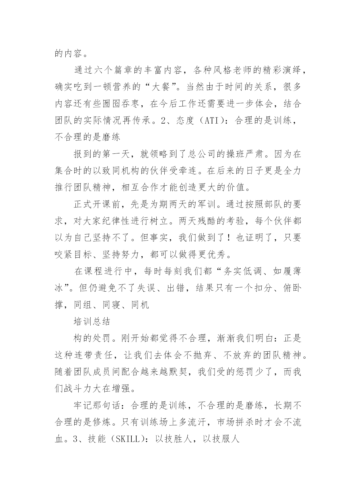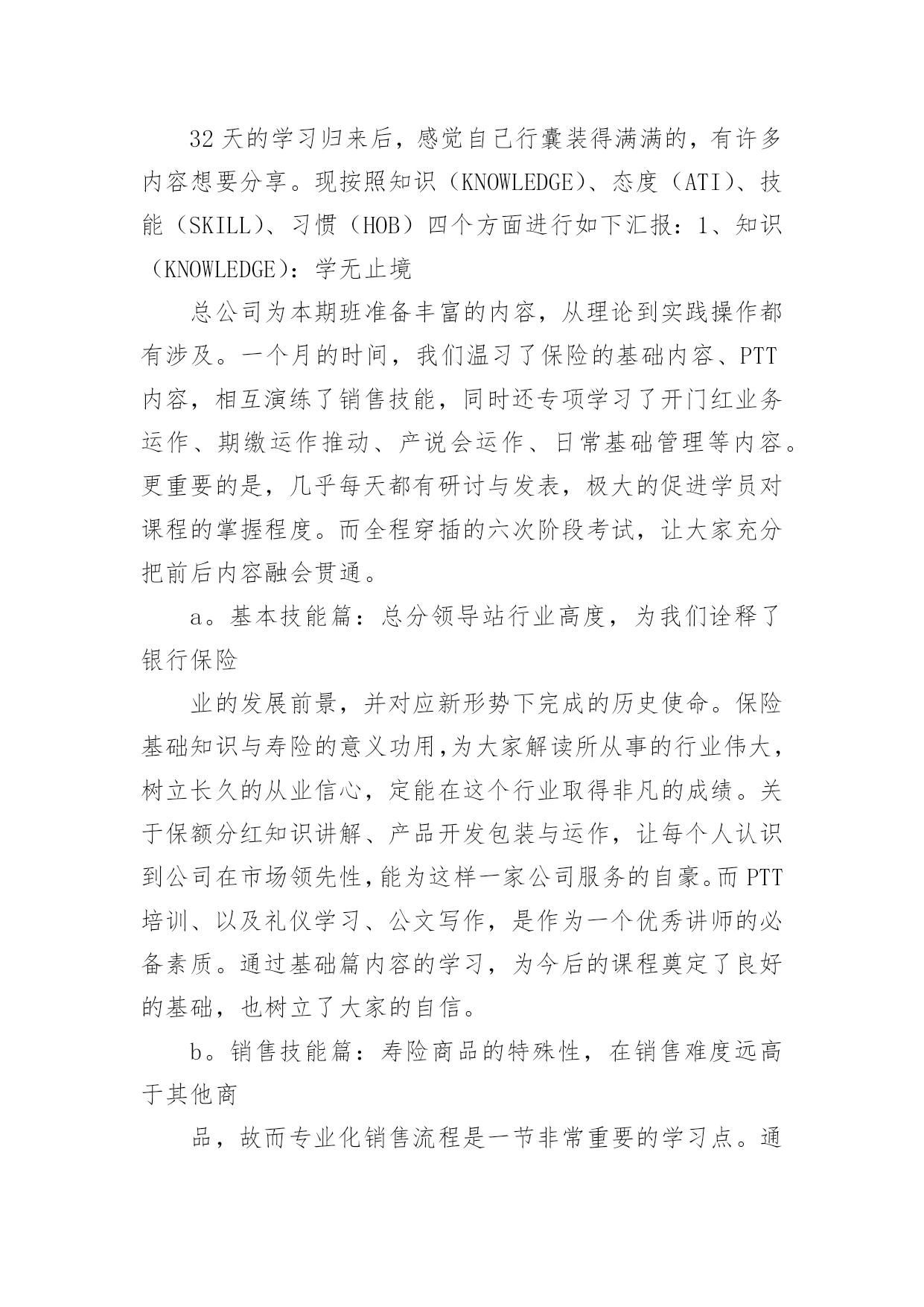保险公司员工培训总结总结就是把一个时间段取得的成绩、存在的问题及得到的经验和教训进行一次全面系统的总结的书面材料,它能使我们及时找出错误并改正,让我们好好写一份总结吧。你想知道总结怎么写吗?下面是小编为大家收集的保险公司员工培训总结,仅供参考,希望能够帮助到大家。保险公司员工培训总结1一、前言得益于中支领导支持,分公司大力推荐以及总公司给的机会,十分荣幸能够参加这个班。一个月的培训时间很快过去了,这段人生中弥足珍贵的经历,给我留下了难忘而又充实的记忆。在这段时间里,正是业务正紧的日子,但各级领导给予了我足够的宽容、支持和帮助,让我能有机会感受到了来自总公司领导的风范、全国顶级讲师的精彩讲解以及来自全国84位伙伴的优秀表现。在对所培训总结有为这个培训班举行的而努力领导肃然起敬,也为自己有机会成为全一员而自豪。正是在领导的关怀下和伙伴的帮扶下,通过努力的吸引各种知识,经常与各地的伙伴交流操作经验,在各方面均取得一定的进步,希望能自己所学能够服务于团队的伙伴,以回报公司的培养。二、培训收获32天的学习归来后,感觉自己行囊装得满满的,有许多内容想要分享。现按照知识(KNOWLEDGE)、态度(ATI)、技能(SKILL)、习惯(HOB)四个方面进行如下汇报:1、知识(KNOWLEDGE):学无止境总公司为本期班准备丰富的内容,从理论到实践操作都有涉及。一个月的时间,我们温习了保险的基础内容、PTT内容,相互演练了销售技能,同时还专项学习了开门红业务运作、期缴运作推动、产说会运作、日常基础管理等内容。更重要的是,几乎每天都有研讨与发表,极大的促进学员对课程的掌握程度。而全程穿插的六次阶段考试,让大家充分把前后内容融会贯通。a。基本技能篇:总分领导站行业高度,为我们诠释了银行保险业的发展前景,并对应新形势下完成的历史使命。保险基础知识与寿险的意义功用,为大家解读所从事的行业伟大,树立长久的从业信心,定能在这个行业取得非凡的成绩。关于保额分红知识讲解、产品开发包装与运作,让每个人认识到公司在市场领先性,能为这样一家公司服务的自豪。而PTT培训、以及礼仪学习、公文写作,是作为一个优秀讲师的必备素质。通过基础篇内容的学习,为今后的课程奠定了良好的基础,也树立了大家的自信。b。销售技能篇:寿险商品的特殊性,在销售难度远高于其他商品,故而专业化销售流程是一节非常重要的学习点。通过一线非常优秀讲师的讲解示范,然后分班进行一一试讲,后由大家进行残酷的点评。银行代理销售同时还有网点为依托,本节内容同样涉及到网点经营与维护。让学员对银行保险产品的销售有个更加清晰在认识。c。开门红策略篇:时值20xx年底,马上公司就要面对开门红运作。而90号文件的出台,几乎打乱各家公司开门红筹备。为了能让各位学员能大概领会公司各种战略,本节内容专门讲解了企划案推动、开门红相关实务操作以及推广到日常假日经营。可以说都是些现实的例子,能为大家所用。d。新人育成篇:公司的快速发展,肯定面临的人力需求的压力。如何做好增员,并做好新人培育工作,在新人育成里面一一解读。通过对新人招聘、培育、提升等方面的操作,加强绩优班、绩差班的运作,使团队能进行正常的新老更替,为团队的健康发展注入了活力。e。日常管理篇:督训在日常基础管理中,处于主要执行地位。通过KPI分析及时发现问题,运作好会议经营,抓好活动量管理,做好激励,使团队成员技能提升,充分应对同业竞争和市场的变化。f。期缴推动篇:银代产品主打趸缴上规模,为公司提升市场占有率和品牌做先锋。但期缴产品才是团队稳定的定心针,是公司内涵价值提升的有效武器,所以期缴产品决定了长久利益。在本节内容中,通过简化期缴讲解、提升开口量以及产说会操作等,让伙伴对期缴的销售树立强大的信心。这些内容将对团队有非常大的益处,也是今后要在团队大力推广的内容。通过六个篇章的丰富内容,各种风格老师的精彩演绎,确实吃到一顿营养的“大餐”。当然由于时间的关系,很多内容还有些囫囵吞枣,在今后工作还需要进一步体会,结合团队的实际情况再传承。1、态度(ATI):合理的是训练,不合理的是磨练报到的第一天,就领略到了总公司的操班严肃。因为在集合时的以致同机构的伙伴受牵连。在后来的日子更是全力推行团队精神,相互合作才能创造更大的价值。正式开课前,先是为期两天的军训。通过按照部队的要求,对大家纪律性进行树立。两天残酷的考验,每个伙伴都以为自己坚持不了。但事实,我们做到了!也证明了,只要咬紧目标、坚持努力,都可以做得更优秀。在课程进行中,每时每刻我们都“务实低调、如履薄冰”。但仍避免不了失误、出错,结果只有一个扣分、俯卧撑,同组、同寝、同机构的'处罚。刚开始都觉得不合理,渐渐我们明白:正是这种连带责任,让我们去体会不抛弃、不放弃的团队精神。随着团队成员间配合越来越默契,我们受的惩罚少了
