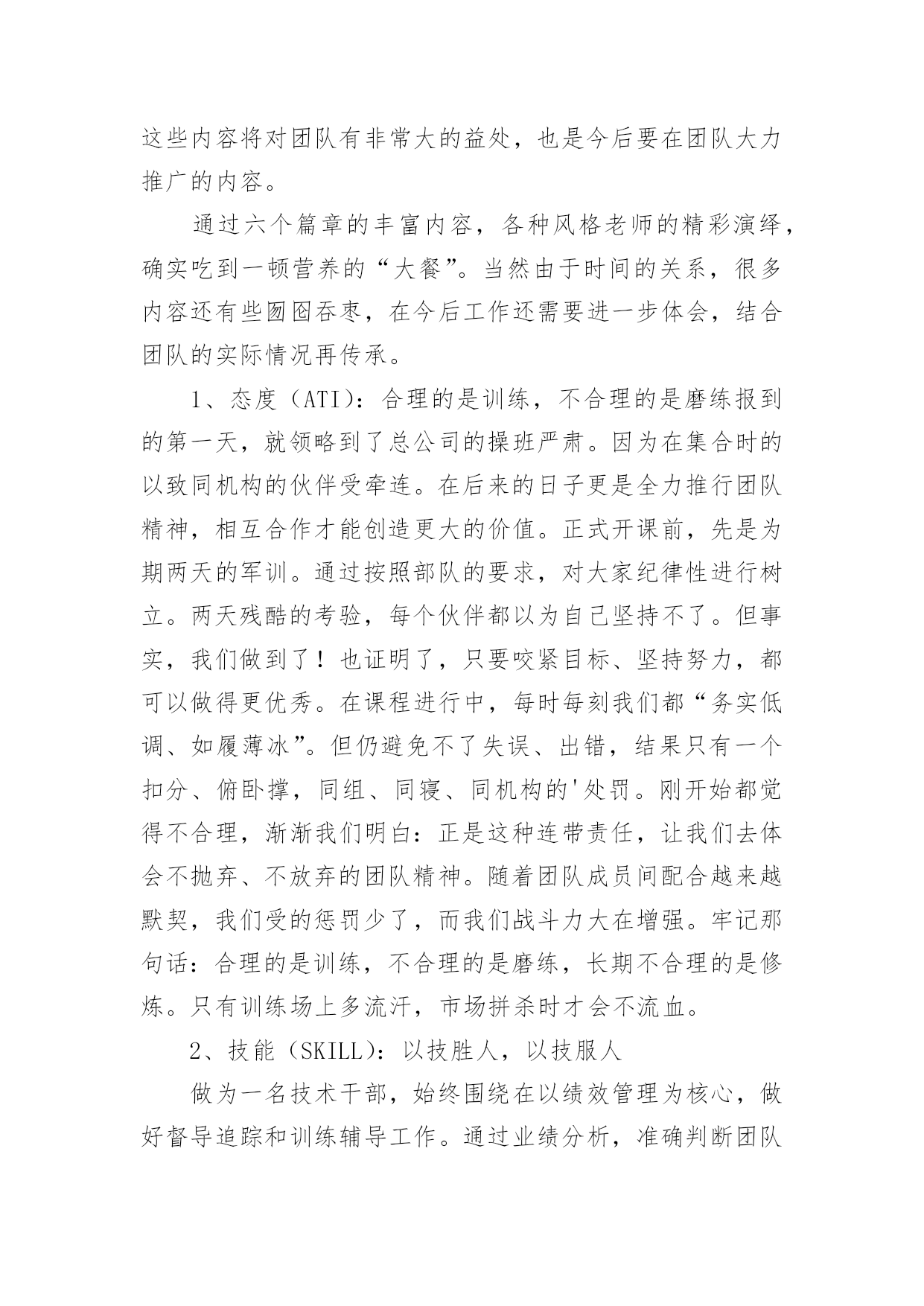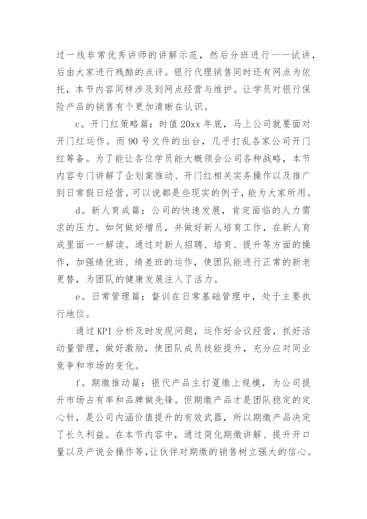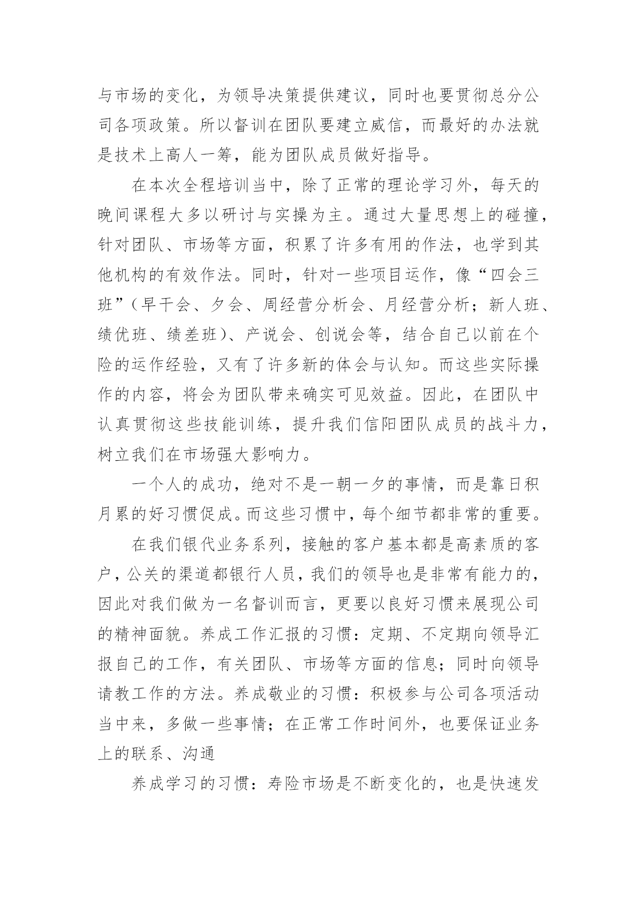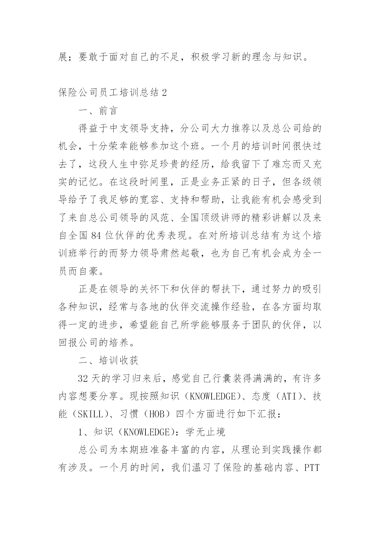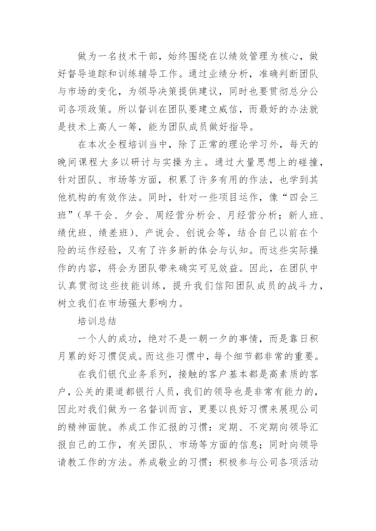 保险公司员工培训总结总结就是把一个时间段取得的成绩、存在的问题及得到的经验和教训进行一次全面系统的总结的书面材料,它能使我们及时找出错误并改正,让我们好好写一份总结吧。你想知道总结怎么写吗?下面是小编为大家收集的保险公司员工培训总结,仅供参考,希望能够帮助到大家。保险公司员工培训总结1一、前言得益于中支领导支持,分公司大力推荐以及总公司给的机会,十分荣幸能够参加这个班。一个月的培训时间很快过去了,这段人生中弥足珍贵的经历,给我留下了难忘而又充实的记忆。在这段时间里,正是业务正紧的日子,但各级领导给予了我足够的宽容、支持和帮助,让我能有机会感受到了来自总公司领导的风范、全国顶级讲师的精彩讲解以及来自全国84位伙伴的优秀表现。在对所培训总结有为这个培训班举行的而努力领导肃然起敬,也为自己有机会成为全一员而自豪。正是在领导的关怀下和伙伴的帮扶下,通过努力的吸引各种知识,经常与各地的伙伴交流操作经验,在各方面均取得一定的进步,希望能自己所学能够服务于团队的伙伴,以回报公司的培养。二、培训收获32天的学习归来后,感觉自己行囊装得满满的,有许多内容想要分享。现按照知识(KNOWLEDGE)、态度(ATI)、技能(SKILL)、习惯(HOB)四个方面进行如下汇报:1、知识(KNOWLEDGE):学无止境总公司为本期班准备丰富的内容,从理论到实践操作都有涉及。一个月的时间,我们温习了保险的基础内容、PTT内容,相互演练了销售技能,同时还专项学习了开门红业务运作、期缴运作推动、产说会运作、日常基础管理等内容。更重要的是,几乎每天都有研讨与发表,极大的促进学员对课程的掌握程度。而全程穿插的六次阶段考试,让大家充分把前后内容融会贯通。a。基本技能篇:总分领导站行业高度,为我们诠释了银行保险业的发展前景,并对应新形势下完成的历史使命。保险基础知识与寿险的意义功用,为大家解读所从事的行业伟大,树立长久的从业信心,定能在这个行业取得非凡的成绩。关于保额分红知识讲解、产品开发包装与运作,让每个人认识到公司在市场领先性,能为这样一家公司服务的自豪。而PTT培训、以及礼仪学习、公文写作,是作为一个优秀讲师的必备素质。通过基础篇内容的学习,为今后的课程奠定了良好的基础,也树立了大家的自信。b。销售技能篇:寿险商品的特殊性,在销售难度远高于其他商品,故而专业化销售流程是一节非常重要的学习点。通过一线非常优秀讲师的讲解示范,然后分班进行一一试讲,后由大家进行残酷的点评。银行代理销售同时还有网点为依托,本节内容同样涉及到网点经营与维护。让学员对银行保险产品的销售有个更加清晰在认识。c。开门红策略篇:时值20xx年底,马上公司就要面对开门红运作。而90号文件的出台,几乎打乱各家公司开门红筹备。为了能让各位学员能大概领会公司各种战略,本节内容专门讲解了企划案推动、开门红相关实务操作以及推广到日常假日经营。可以说都是些现实的例子,能为大家所用。d。新人育成篇:公司的快速发展,肯定面临的人力需求的压力。如何做好增员,并做好新人培育工作,在新人育成里面一一解读。通过对新人招聘、培育、提升等方面的操作,加强绩优班、绩差班的运作,使团队能进行正常的新老更替,为团队的健康发展注入了活力。e。日常管理篇:督训在日常基础管理中,处于主要执行地位。通过KPI分析及时发现问题,运作好会议经营,抓好活动量管理,做好激励,使团队成员技能提升,充分应对同业竞争和市场的变化。f。期缴推动篇:银代产品主打趸缴上规模,为公司提升市场占有率和品牌做先锋。但期缴产品才是团队稳定的定心针,是公司内涵价值提升的有效武器,所以期缴产品决定了长久利益。在本节内容中,通过简化期缴讲解、提升开口量以及产说会操作等,让伙伴对期缴的销售树立强大的信心。这些内容将对团队有非常大的益处,也是今后要在团队大力推广的内容。通过六个篇章的丰富内容,各种风格老师的精彩演绎,确实吃到一顿营养的“大餐”。当然由于时间的关系,很多内容还有些囫囵吞枣,在今后工作还需要进一步体会,结合团队的实际情况再传承。1、态度(ATI):合理的是训练,不合理的是磨练报到的第一天,就领略到了总公司的操班严肃。因为在集合时的以致同机构的伙伴受牵连。在后来的日子更是全力推行团队精神,相互合作才能创造更大的价值。正式开课前,先是为期两天的军训。通过按照部队的要求,对大家纪律性进行树立。两天残酷的考验,每个伙伴都以为自己坚持不了。但事实,我们做到了!也证明了,只要咬紧目标、坚持努力,都可以做得更优秀。在课程进行中,每时每刻我们都“务实低调、如履薄冰”。但仍避免不了失误、出错,结果只有一个扣分、俯卧撑,同组、同寝、同机构的'处罚。刚开始都觉得不合理,渐渐我们明白:正是这种连带责任,让我们去体会不抛弃、不放弃的团队精神。随着团队成员间配合越来越默契,我们受的惩罚少了