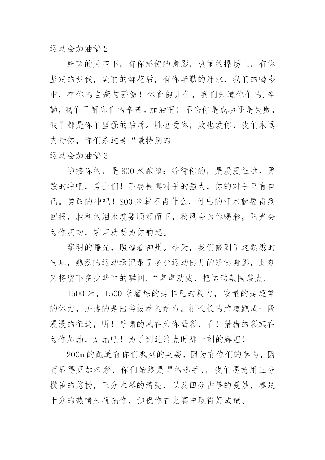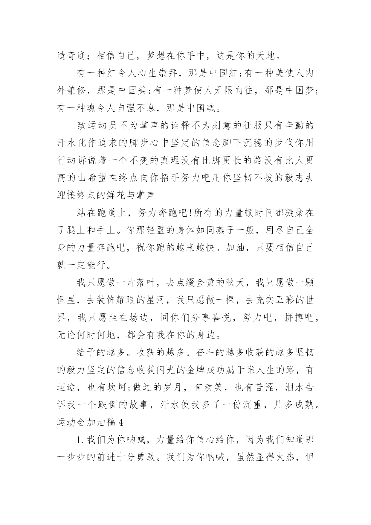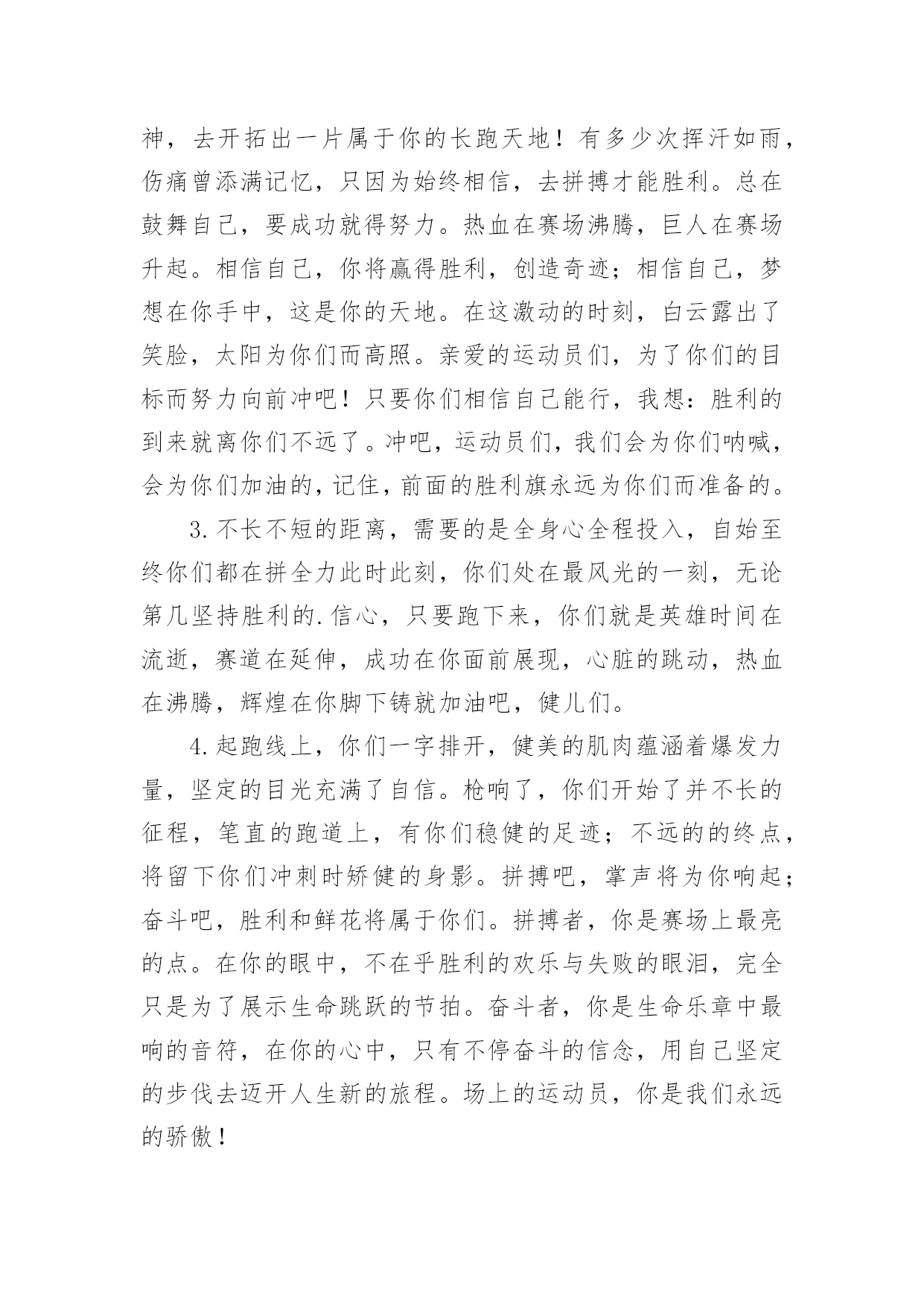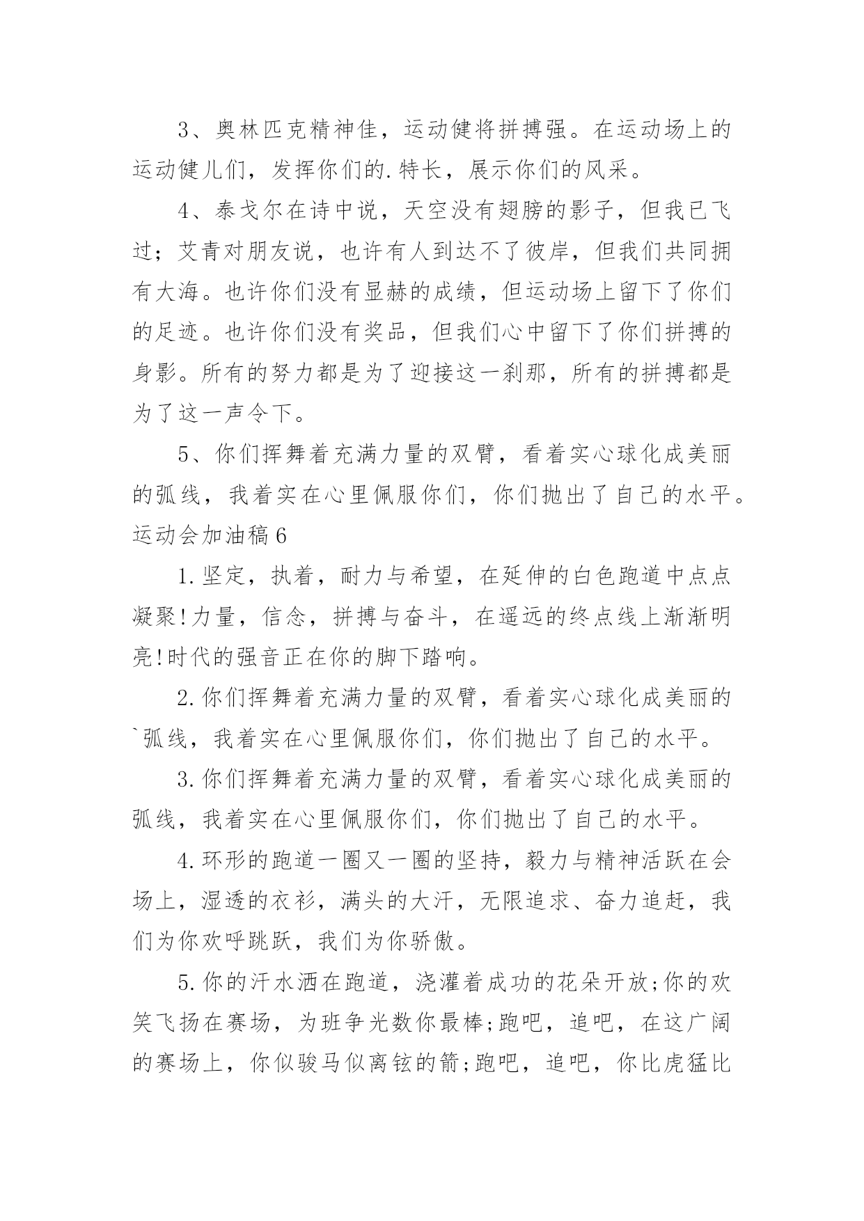 运动会加油稿(优选)运动会加油稿15篇在我们平凡的日常里,用到加油稿的地方越来越多,借助加油稿可以给对方传达鼓励。还是对加油稿一筹莫展吗?以下是小编为大家整理的运动会加油稿,仅供参考,大家一起来看看吧。运动会加油稿11.就像花儿准备了春、秋、冬,就是为了红透整个盛夏。就像雪花经历了春、夏、秋就是为了洁白整个严冬。蹲下,昂首,出发……轻轻的一抬脚,便牵动了全场的目光潇洒的迫挥挥手,便满足了那一份无言的等待。迎着朝阳,你们踏歌而去,背着希望,我们等待你们的归来。百米迸发的是无穷的力量,温暖的是我们的家,演绎的是团结友爱。也许你心理忐忑不安,我们的心里早已热血沸腾。昔日,长长的跑道上,留下了你深深的足迹,抹不去你渗出的汗水,拉不动你沉重的双脚,你为分院,不在乎自己的疲倦,不在乎汗水和泪水,因为你心里有一种坚定的信念,诺大的竞技场期待着你矫健的身影,瑟瑟的秋风为你送来爽朗的气息。2.踏上跑道,是一种选择。离开起点,是一种勇气。驰骋赛场,是一种胜利。运动健将们,用你的实力,用你的精神,去开拓出一片属于你的长跑天地!有多少次挥汗如雨,伤痛曾添满记忆,只因为始终相信,去拼搏才能胜利。总在鼓舞自己,要成功就得努力。热血在赛场沸腾,巨人在赛场升起。相信自己,你将赢得胜利,创造奇迹;相信自己,梦想在你手中,这是你的天地。在这激动的时刻,白云露出了笑脸,太阳为你们而高照。亲爱的运动员们,为了你们的目标而努力向前冲吧!只要你们相信自己能行,我想:胜利的到来就离你们不远了。冲吧,运动员们,我们会为你们呐喊,会为你们加油的,记住,前面的胜利旗永远为你们而准备的。3.不长不短的距离,需要的是全身心全程投入,自始至终你们都在拼全力此时此刻,你们处在最风光的一刻,无论第几坚持胜利的.信心,只要跑下来,你们就是英雄时间在流逝,赛道在延伸,成功在你面前展现,心脏的跳动,热血在沸腾,辉煌在你脚下铸就加油吧,健儿们。4.起跑线上,你们一字排开,健美的肌肉蕴涵着爆发力量,坚定的目光充满了自信。枪响了,你们开始了并不长的征程,笔直的跑道上,有你们稳健的足迹;不远的的终点,将留下你们冲刺时矫健的身影。拼搏吧,掌声将为你响起;奋斗吧,胜利和鲜花将属于你们。拼搏者,你是赛场上最亮的点。在你的眼中,不在乎胜利的欢乐与失败的眼泪,完全只是为了展示生命跳跃的节拍。奋斗者,你是生命乐章中最响的音符,在你的心中,只有不停奋斗的信念,用自己坚定的步伐去迈开人生新的旅程。场上的运动员,你是我们永远的骄傲!运动会加油稿2蔚蓝的天空下,有你矫健的身影,热闹的操场上,有你坚定的步伐,美丽的鲜花后,有你辛勤的汗水,我们的喝彩中,有你的自豪与骄傲!体育健儿们,我们知道你们的.辛勤,我们了解你们的辛苦。加油吧!不论你是成功还是失败,我们都是你们坚强的后盾。胜也爱你,败也爱你,我们永远支持你,你们永远是“最特别的运动会加油稿3迎接你的,是800米跑道;等待你的,是漫漫征途。勇敢的冲吧,勇士们!不要畏惧对手的强大,你的对手只有自己。勇敢的冲吧!800米算不得什么,付出的汗水就要得到回报,胜利的泪水就要顺颊而下,秋风会为你喝彩,阳光会为你庆功,掌声就要为你响起。黎明的曙光,照耀着神州。今天,我们修到了这熟悉的气息,熟悉的运动场记录了多少运动健儿的矫健身影,此刻又将留下多少华丽的瞬间。“声声助威,把运动氛围装点。1500米,1500米磨炼的是非凡的毅力,较量的是超常的体力,拼搏的是出类拔萃的耐力。把长长的跑道跑成一段漫漫的征途,听!呼啸的风在为你喝彩,看!猎猎的彩旗在为你加油,加油吧!为了到达终点时那一刻的辉煌!200m的跑道有你们飒爽的英姿,因为有你们的参与,因而显得更加精彩,你们始终是悍的选手,,我们愿意用三分横笛的悠扬,三分木琴的清亮,以及四分古筝的曼妙,凑足十分的热情来祝福你,预祝你在比赛中取得好成绩。枪声伴你踏上征程,你昂着自信的头,带着必胜的信念,冲去,奔去。那一刻时光仿佛都为你停住,你的勇气振动了一切,震撼了每一个人的心灵。终点。你赢了。青春的脚步,青春的速度,青春的活力,青春的活力,将会在你们的身上尽情体现。迎接自我,挑战自我,战胜自我!我们相信你们必须能行,加油吧,运动员!终点就在眼前!年轻的我们不言失败,没有风浪,就不能显示帆的本色;没有曲折,就无法品味人生的乐趣。固然我们没得第一,但至少我们付出过努力过拼搏过。400米的跑道上,你正在飞驰,头一百米:你可能心急如焚,可心知落后就要挨打。次一百米:你也许有点心神不定,我是不是该安静的退开?再一百米:你正在进行着心理斗争,“生存”还“死亡”?超越对手,超越自我,是我们的目标,我们的信念,在清凉的初秋,在喧嚣的田径场上。你们点燃了似火的热情,无论成败,我们都为你们感到自豪,你们永远是我们的骄傲!看!蔚蓝的天空下,有你矫健的身影,热闹的操场上,