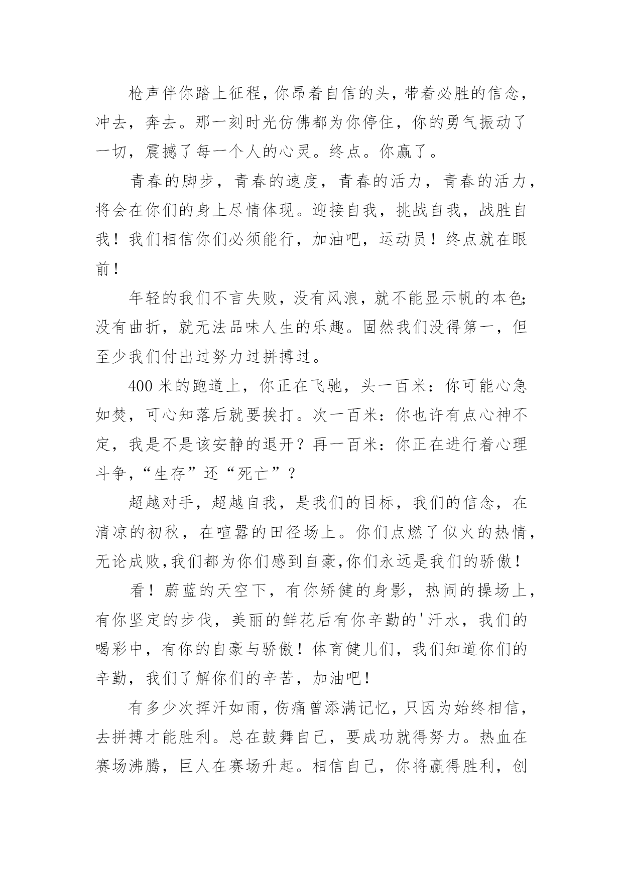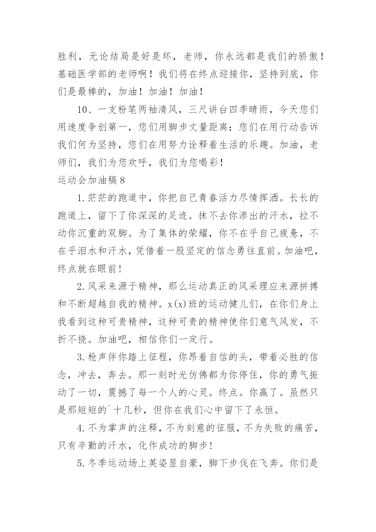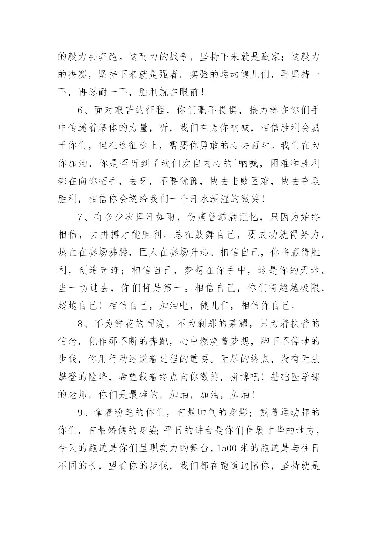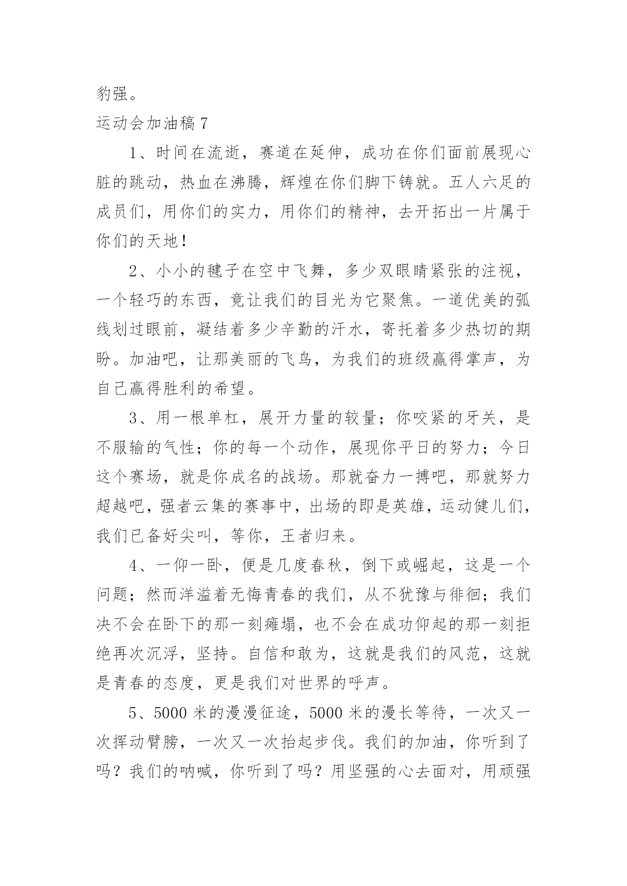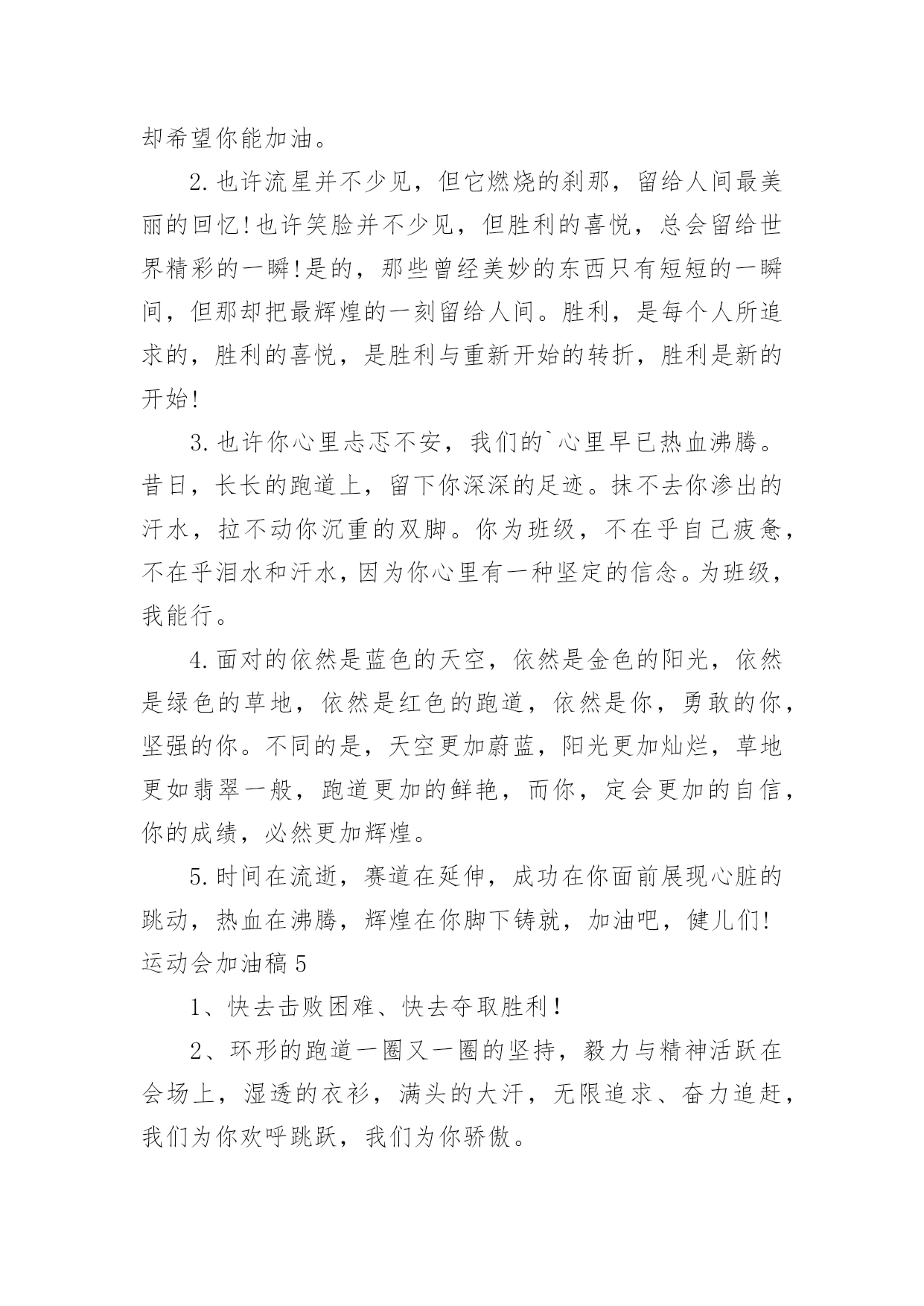 运动会加油稿(优选)运动会加油稿15篇在我们平凡的日常里,用到加油稿的地方越来越多,借助加油稿可以给对方传达鼓励。还是对加油稿一筹莫展吗?以下是小编为大家整理的运动会加油稿,仅供参考,大家一起来看看吧。运动会加油稿11.就像花儿准备了春、秋、冬,就是为了红透整个盛夏。就像雪花经历了春、夏、秋就是为了洁白整个严冬。蹲下,昂首,出发……轻轻的一抬脚,便牵动了全场的目光潇洒的迫挥挥手,便满足了那一份无言的等待。迎着朝阳,你们踏歌而去,背着希望,我们等待你们的归来。百米迸发的是无穷的力量,温暖的是我们的家,演绎的是团结友爱。也许你心理忐忑不安,我们的心里早已热血沸腾。昔日,长长的跑道上,留下了你深深的足迹,抹不去你渗出的汗水,拉不动你沉重的双脚,你为分院,不在乎自己的疲倦,不在乎汗水和泪水,因为你心里有一种坚定的信念,诺大的竞技场期待着你矫健的身影,瑟瑟的秋风为你送来爽朗的气息。2.踏上跑道,是一种选择。离开起点,是一种勇气。驰骋赛场,是一种胜利。运动健将们,用你的实力,用你的精神,去开拓出一片属于你的长跑天地!有多少次挥汗如雨,伤痛曾添满记忆,只因为始终相信,去拼搏才能胜利。总在鼓舞自己,要成功就得努力。热血在赛场沸腾,巨人在赛场升起。相信自己,你将赢得胜利,创造奇迹;相信自己,梦想在你手中,这是你的天地。在这激动的时刻,白云露出了笑脸,太阳为你们而高照。亲爱的运动员们,为了你们的目标而努力向前冲吧!只要你们相信自己能行,我想:胜利的到来就离你们不远了。冲吧,运动员们,我们会为你们呐喊,会为你们加油的,记住,前面的胜利旗永远为你们而准备的。3.不长不短的距离,需要的是全身心全程投入,自始至终你们都在拼全力此时此刻,你们处在最风光的一刻,无论第几坚持胜利的.信心,只要跑下来,你们就是英雄时间在流逝,赛道在延伸,成功在你面前展现,心脏的跳动,热血在沸腾,辉煌在你脚下铸就加油吧,健儿们。4.起跑线上,你们一字排开,健美的肌肉蕴涵着爆发力量,坚定的目光充满了自信。枪响了,你们开始了并不长的征程,笔直的跑道上,有你们稳健的足迹;不远的的终点,将留下你们冲刺时矫健的身影。拼搏吧,掌声将为你响起;奋斗吧,胜利和鲜花将属于你们。拼搏者,你是赛场上最亮的点。在你的眼中,不在乎胜利的欢乐与失败的眼泪,完全只是为了展示生命跳跃的节拍。奋斗者,你是生命乐章中最响的音符,在你的心中,只有不停奋斗的信念,用自己坚定的步伐去迈开人生新的旅程。场上的运动员,你是我们永远的骄傲!运动会加油稿2蔚蓝的天空下,有你矫健的身影,热闹的操场上,有你坚定的步伐,美丽的鲜花后,有你辛勤的汗水,我们的喝彩中,有你的自豪与骄傲!体育健儿们,我们知道你们的.辛勤,我们了解你们的辛苦。加油吧!不论你是成功还是失败,我们都是你们坚强的后盾。胜也爱你,败也爱你,我们永远支持你,你们永远是“最特别的运动会加油稿3迎接你的,是800米跑道;等待你的,是漫漫征途。勇敢的冲吧,勇士们!不要畏惧对手的强大,你的对手只有自己。勇敢的冲吧!800米算不得什么,付出的汗水就要得到回报,胜利的泪水就要顺颊而下,秋风会为你喝彩,阳光会为你庆功,掌声就要为你响起。黎明的曙光,照耀着神州。今天,我们修到了这熟悉的气息,熟悉的运动场记录了多少运动健儿的矫健身影,此刻又将留下多少华丽的瞬间。“声声助威,把运动氛围装点。1500米,1500米磨炼的是非凡的毅力,较量的是超常的体力,拼搏的是出类拔萃的耐力。把长长的跑道跑成一段漫漫的征途,听!呼啸的风在为你喝彩,看!猎猎的彩旗在为你加油,加油吧!为了到达终点时那一刻的辉煌!200m的跑道有你们飒爽的英姿,因为有你们的参与,因而显得更加精彩,你们始终是悍的选手,,我们愿意用三分横笛的悠扬,三分木琴的清亮,以及四分古筝的曼妙,凑足十分的热情来祝福你,预祝你在比赛中取得好成绩。枪声伴你踏上征程,你昂着自信的头,带着必胜的信念,冲去,奔去。那一刻时光仿佛都为你停住,你的勇气振动了一切,震撼了每一个人的心灵。终点。你赢了。青春的脚步,青春的速度,青春的活力,青春的活力,将会在你们的身上尽情体现。迎接自我,挑战自我,战胜自我!我们相信你们必须能行,加油吧,运动员!终点就在眼前!年轻的我们不言失败,没有风浪,就不能显示帆的本色;没有曲折,就无法品味人生的乐趣。固然我们没得第一,但至少我们付出过努力过拼搏过。400米的跑道上,你正在飞驰,头一百米:你可能心急如焚,可心知落后就要挨打。次一百米:你也许有点心神不定,我是不是该安静的退开?再一百米:你正在进行着心理斗争,“生存”还“死亡”?超越对手,超越自我,是我们的目标,我们的信念,在清凉的初秋,在喧嚣的田径场上。你们点燃了似火的热情,无论成败,我们都为你们感到自豪,你们永远是我们的骄傲!看!蔚蓝的天空下,有你矫健的身影,热闹的操场上,