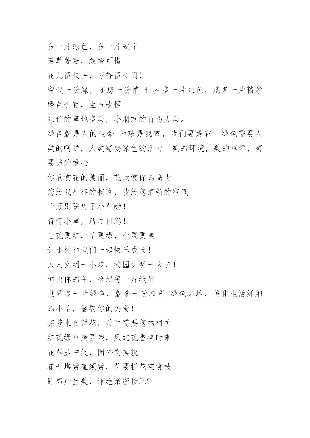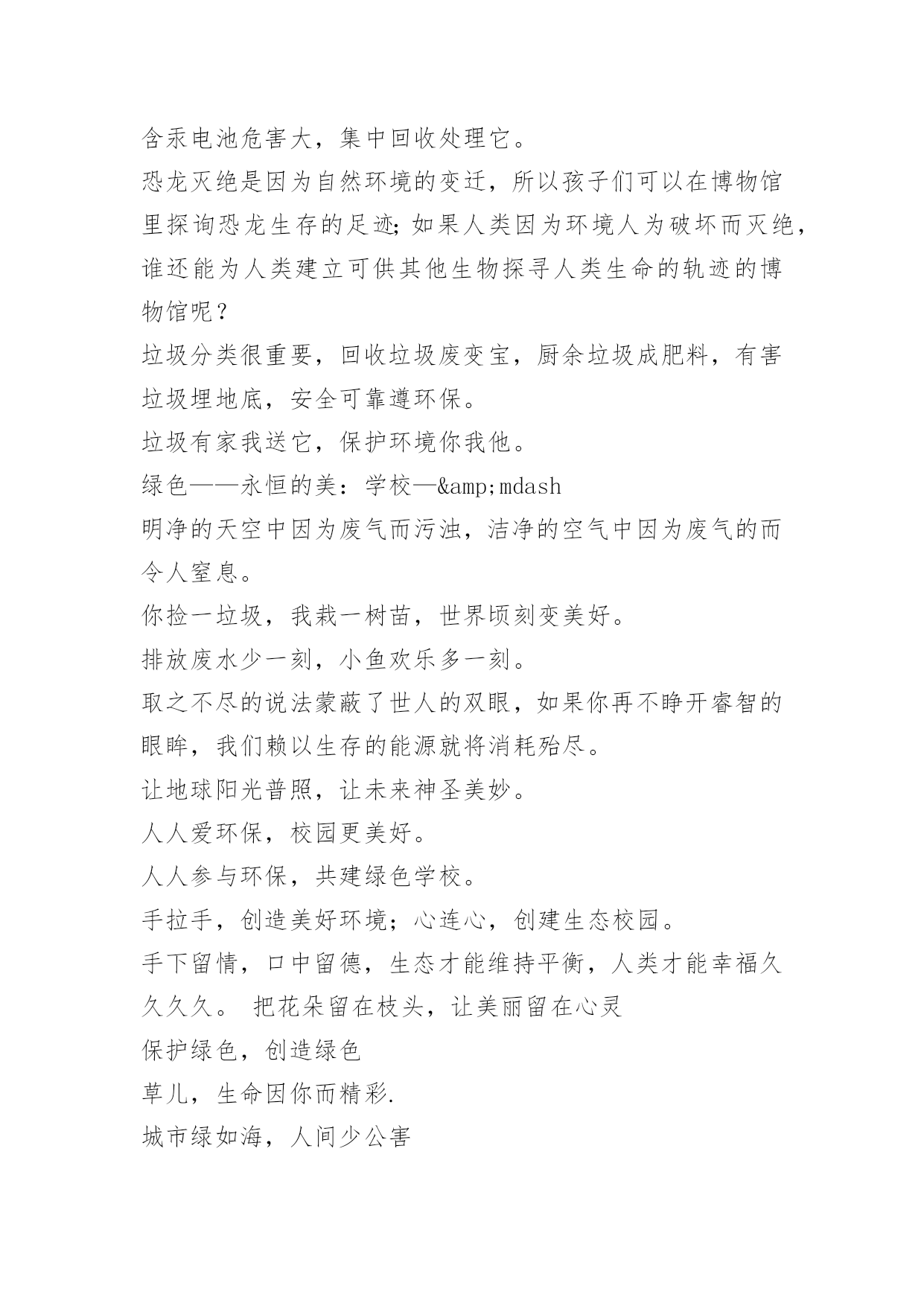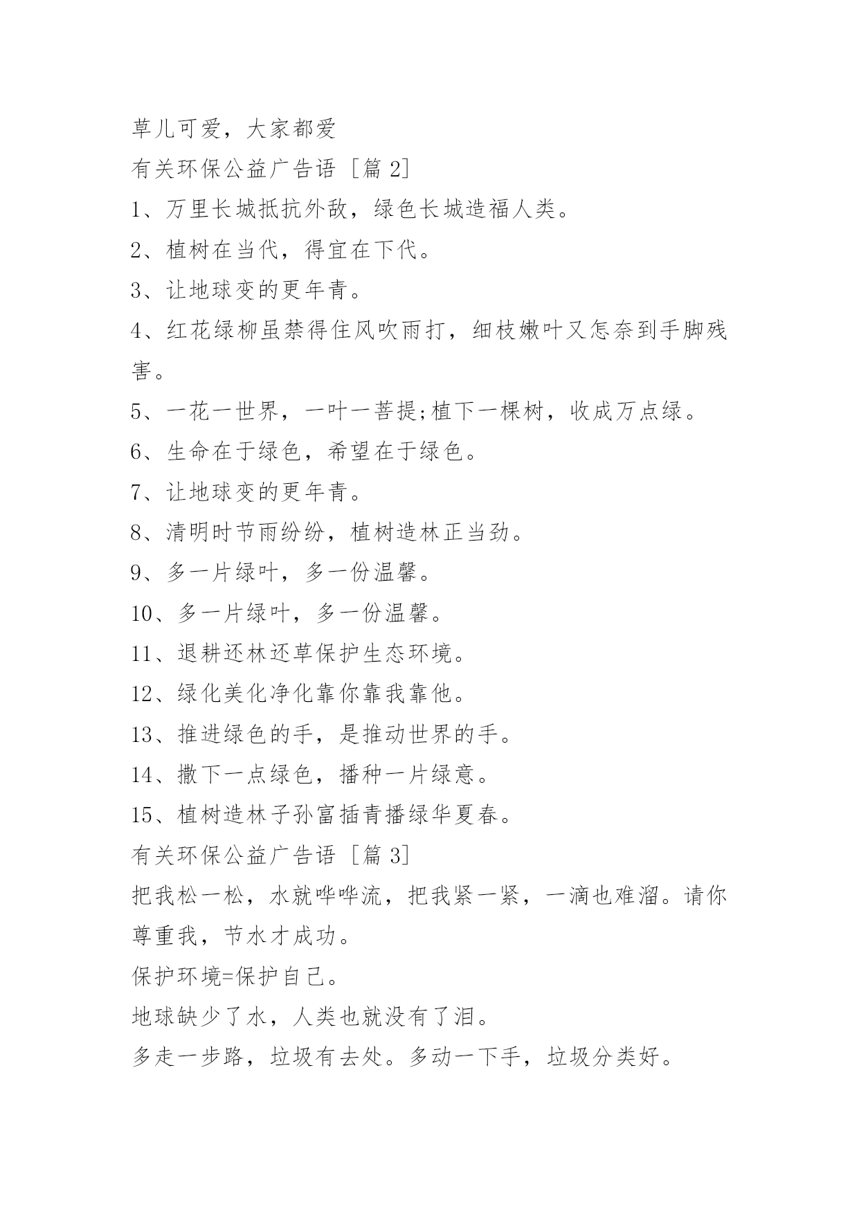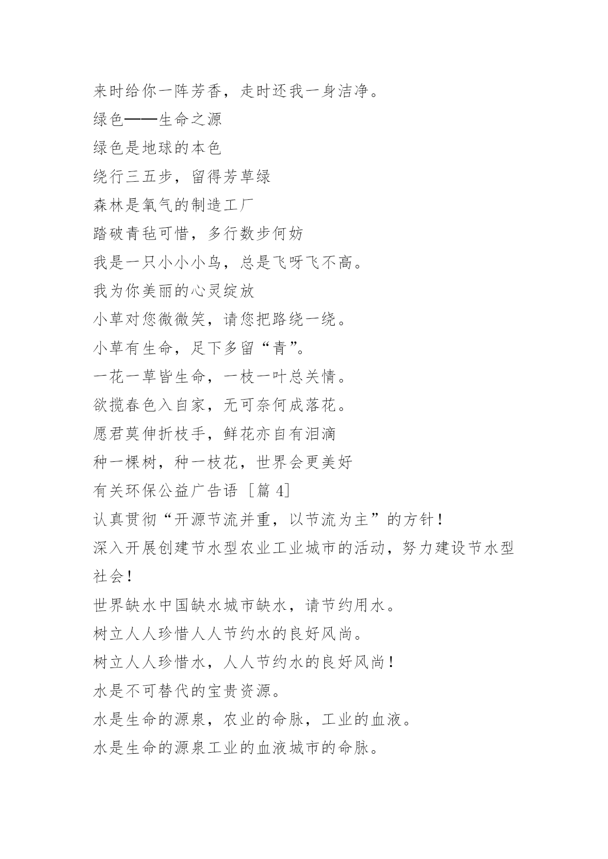 环保公益广告语有关环保公益广告语认真贯彻“开源节流并重,以节流为主”的方针!深入开展创建节水型农业工业城市的活动,努力建设节水型社会!世界缺水中国缺水城市缺水,请节约用水。树立人人珍惜人人节约水的良好风尚。树立人人珍惜水,人人节约水的良好风尚!水是不可替代的宝贵资源。水是生命的源泉,农业的命脉,工业的血液。水是生命的源泉工业的血液城市的命脉。水是生命的源泉农业的命脉工业的血液!水是生命之源,浪费水就是扼杀自己的生命。为何血浓于水?因有爱在其中。为了人类和您自身的生命,请珍惜每一滴水!惜水爱水节水,从我做起。现在,人类渴了有水喝;将来,地球渴了会怎样?要像爱护眼睛一样珍惜水资源。依法管水,科学用水,自觉节水。珍惜水就是珍惜您的生命。树木拥有绿色,地球才有脉搏。1+1=2,一棵树+一棵树=一片树林保护树木,就是保护自己草儿可爱,大家都爱有关环保公益广告语[篇2]1、万里长城抵抗外敌,绿色长城造福人类。2、植树在当代,得宜在下代。3、让地球变的更年青。4、红花绿柳虽禁得住风吹雨打,细枝嫩叶又怎奈到手脚残害。5、一花一世界,一叶一菩提;植下一棵树,收成万点绿。6、生命在于绿色,希望在于绿色。7、让地球变的更年青。8、清明时节雨纷纷,植树造林正当劲。9、多一片绿叶,多一份温馨。10、多一片绿叶,多一份温馨。11、退耕还林还草保护生态环境。12、绿化美化净化靠你靠我靠他。13、推进绿色的手,是推动世界的手。14、撒下一点绿色,播种一片绿意。15、植树造林子孙富插青播绿华夏春。有关环保公益广告语[篇3]把我松一松,水就哗哗流,把我紧一紧,一滴也难溜。请你尊重我,节水才成功。保护环境=保护自己。地球缺少了水,人类也就没有了泪。多走一步路,垃圾有去处。多动一下手,垃圾分类好。含汞电池危害大,集中回收处理它。恐龙灭绝是因为自然环境的变迁,所以孩子们可以在博物馆里探询恐龙生存的足迹;如果人类因为环境人为破坏而灭绝,谁还能为人类建立可供其他生物探寻人类生命的轨迹的博物馆呢?垃圾分类很重要,回收垃圾废变宝,厨余垃圾成肥料,有害垃圾埋地底,安全可靠遵环保。垃圾有家我送它,保护环境你我他。绿色——永恒的美:学校—&mdash明净的天空中因为废气而污浊,洁净的空气中因为废气的而令人窒息。你捡一垃圾,我栽一树苗,世界顷刻变美好。排放废水少一刻,小鱼欢乐多一刻。取之不尽的说法蒙蔽了世人的双眼,如果你再不睁开睿智的眼眸,我们赖以生存的能源就将消耗殆尽。让地球阳光普照,让未来神圣美妙。人人爱环保,校园更美好。人人参与环保,共建绿色学校。手拉手,创造美好环境;心连心,创建生态校园。手下留情,口中留德,生态才能维持平衡,人类才能幸福久久久久。把花朵留在枝头,让美丽留在心灵保护绿色,创造绿色草儿,生命因你而精彩.城市绿如海,人间少公害多一片绿色,多一片安宁芳草萋萋,践踏可惜花儿留枝头,芳香留心间!留我一份绿,还您一份情世界多一片绿色,就多一片精彩绿色长存,生命永恒绿色的草地多美,小朋友的行为更美。绿色就是人的生命地球是我家,我们要爱它绿色需要人类的呵护,人类需要绿色的活力美的环境,美的草坪,需要美的爱心你欣赏花的美丽,花欣赏你的高贵您给我生存的权利,我给您清新的空气千万别踩疼了小草呦!青青小草,踏之何忍!让花更红,草更绿,心灵更美让小树和我们一起快乐成长!人人文明一小步,校园文明一大步!伸出你的手,捡起每一片纸屑世界多一片绿色,就多一份精彩绿色环境,美化生活纤细的小草,需要你的关爱!芬芳来自鲜花,美丽需要您的呵护红花绿草满园栽,风送花香碟时来花草丛中笑,园外赏其貌花开堪赏直须赏,莫要折花空赏枝距离产生美,谢绝亲密接触?来时给你一阵芳香,走时还我一身洁净。绿色──生命之源绿色是地球的本色绕行三五步,留得芳草绿森林是氧气的制造工厂踏破青毡可惜,多行数步何妨我是一只小小小鸟,总是飞呀飞不高。我为你美丽的心灵绽放小草对您微微笑,请您把路绕一绕。小草有生命,足下多留“青”。一花一草皆生命,一枝一叶总关情。欲揽春色入自家,无可奈何成落花。愿君莫伸折枝手,鲜花亦自有泪滴种一棵树,种一枝花,世界会更美好有关环保公益广告语[篇4]认真贯彻“开源节流并重,以节流为主”的方针!深入开展创建节水型农业工业城市的活动,努力建设节水型社会!世界缺水中国缺水城市缺水,请节约用水。树立人人珍惜人人节约水的良好风尚。树立人人珍惜水,人人节约水的良好风尚!水是不可替代的宝贵资源。水是生命的源泉,农业的命脉,工业的血液。水是生命的源泉工业的血液城市的命脉。水是生命的源泉农业的命脉工业的血液!水是生命之源,浪费水就是扼杀自己的生命。为何血浓于水?因有爱在其中。为了人类和您自身的生命,请珍惜每一滴水!惜水爱水节水,从我做起。现在,人类渴了有水喝;将来,地球渴了会怎样?要像爱护眼睛一样珍惜水资源。依法管