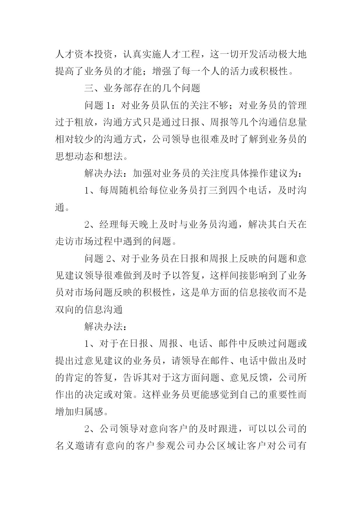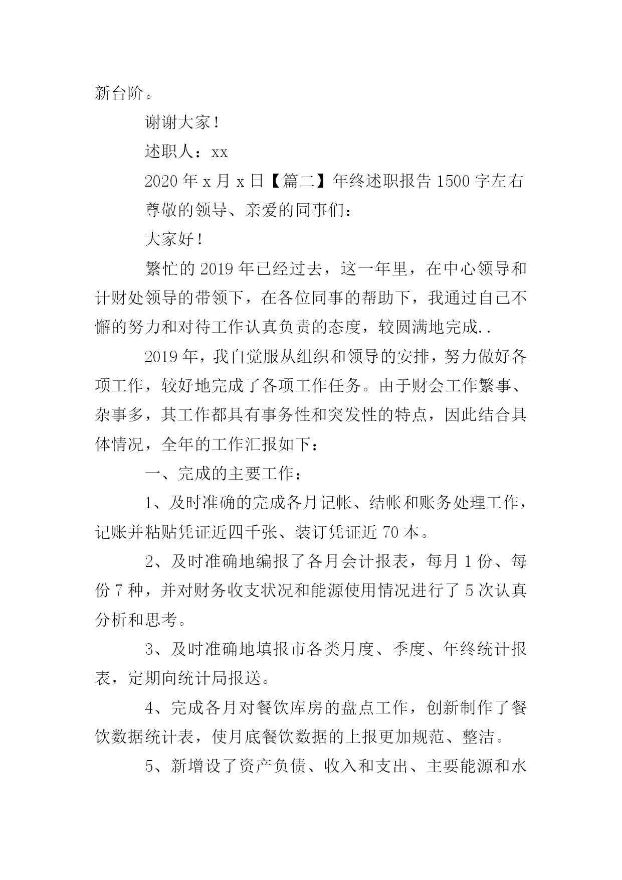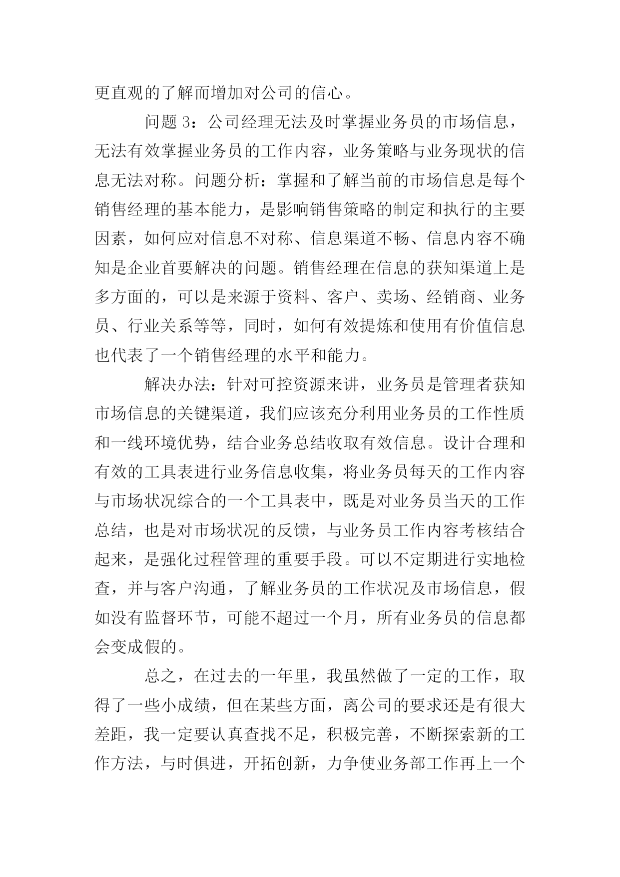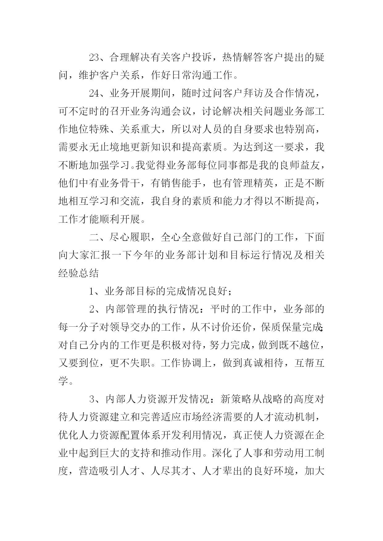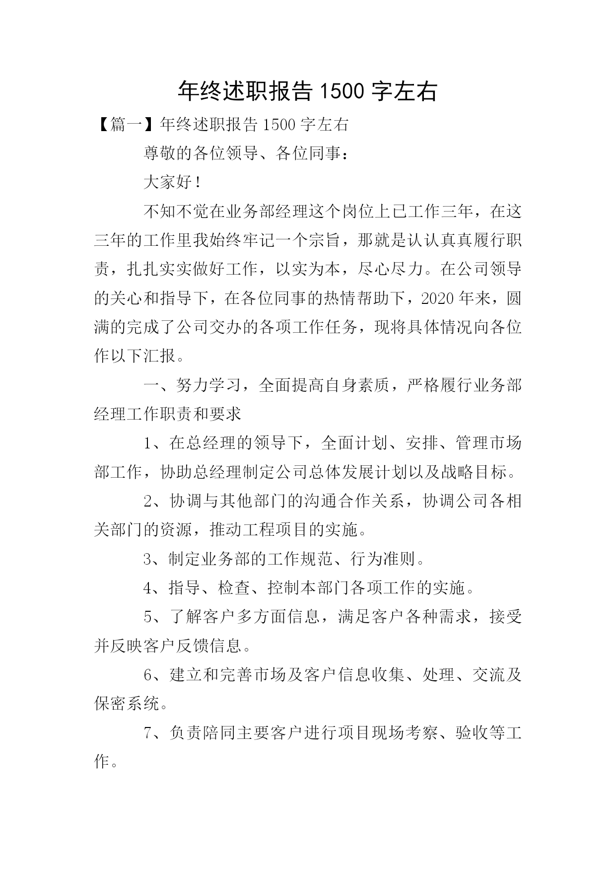 年终述职报告1500字左右【篇一】年终述职报告1500字左右尊敬的各位领导、各位同事:大家好!不知不觉在业务部经理这个岗位上已工作三年,在这三年的工作里我始终牢记一个宗旨,那就是认认真真履行职责,扎扎实实做好工作,以实为本,尽心尽力。在公司领导的关心和指导下,在各位同事的热情帮助下,2020年来,圆满的完成了公司交办的各项工作任务,现将具体情况向各位作以下汇报。一、努力学习,全面提高自身素质,严格履行业务部经理工作职责和要求1、在总经理的领导下,全面计划、安排、管理市场部工作,协助总经理制定公司总体发展计划以及战略目标。2、协调与其他部门的沟通合作关系,协调公司各相关部门的资源,推动工程项目的实施。3、制定业务部的工作规范、行为准则。4、指导、检查、控制本部门各项工作的实施。5、了解客户多方面信息,满足客户各种需求,接受并反映客户反馈信息。6、建立和完善市场及客户信息收集、处理、交流及保密系统。7、负责陪同主要客户进行项目现场考察、验收等工作。8、指导及开展相应的公关及商务活动。9、制定不同时期完成项目的广告宣传制作。10、与合作方建立并保持正常稳定的关系,保证业务良好开展。11、指导与拟写部门日常内外工作往来函件,并给与决策。12、对于突发事件的协调处理,解决客户对于部门员工及工作的疑问与投诉。13、阶段性进行工作总结并完善部门工作制度,结合公司安排,提出年度市场销售、出差及网点建设计划。14、指导部门配合其他各部门进行公司资料档案的建立及整理。15、在公司授权的范围内进行业务洽谈,完成报价部所涉及的各种表格、文件,并协助财务部作好催款等后续工作。16、为公司提供准确的行业定位,及时提供市场信息反馈。17、指导组织部门人员接受最新业务知识与市场知识的相关培训。18、配合人力资源部对市场人员的培训、考核、调配。19、配合业务主管的各项工作。20、每日部门员工报告的信息整理。21、改善部门员工的形象及礼仪。22、整理部门员工每日工作汇报,合理分配工作。23、合理解决有关客户投诉,热情解答客户提出的疑问,维护客户关系,作好日常沟通工作。24、业务开展期间,随时过问客户拜访及合作情况,可不定时的召开业务沟通会议,讨论解决相关问题业务部工作地位特殊、关系重大,所以对人员的自身要求也特别高,需要永无止境地更新知识和提高素质。为达到这一要求,我不断地加强学习。我觉得业务部每位同事都是我的良师益友,他们中有业务骨干,有销售能手,也有管理精英,正是不断地相互学习和交流,我自身的素质和能力才得以不断提高,工作才能顺利开展。二、尽心履职,全心全意做好自己部门的工作,下面向大家汇报一下今年的业务部计划和目标运行情况及相关经验总结1、业务部目标的完成情况良好;2、内部管理的执行情况:平时的工作中,业务部的每一分子对领导交办的工作,从不讨价还价,保质保量完成;对自己分内的工作更是积极对待,努力完成,做到既不越位,又要到位,更不失职。工作协调上,做到真诚相待,互帮互学。3、内部人力资源开发情况:新策略从战略的高度对待人力资源建立和完善适应市场经济需要的人才流动机制,优化人力资源配置体系开发利用情况,真正使人力资源在企业中起到巨大的支持和推动作用。深化了人事和劳动用工制度,营造吸引人才、人尽其才、人才辈出的良好环境,加大人才资本投资,认真实施人才工程,这一切开发活动极大地提高了业务员的才能;增强了每一个人的活力或积极性。三、业务部存在的几个问题问题1:对业务员队伍的关注不够;对业务员的管理过于粗放,沟通方式只是通过日报、周报等几个沟通信息量相对较少的沟通方式,公司领导也很难及时了解到业务员的思想动态和想法。解决办法:加强对业务员的关注度具体操作建议为:1、每周随机给每位业务员打三到四个电话,及时沟通。2、经理每天晚上及时与业务员沟通,解决其白天在走访市场过程中遇到的问题。问题2、对于业务员在日报和周报上反映的问题和意见建议领导很难做到及时予以答复,这样间接影响到了业务员对市场问题反映的积极性,这是单方面的信息接收而不是双向的信息沟通解决办法:1、对于在日报、周报、电话、邮件中反映过问题或提出过意见建议的业务员,请领导在邮件、电话中做出及时的肯定的答复,告诉其对于这方面问题、意见反馈,公司所作出的决定或对策。这样业务员更能感觉到自己的重要性而增加归属感。2、公司领导对意向客户的及时跟进,可以以公司的名义邀请有意向的客户参观公司办公区域让客户对公司有更直观的了解而增加对公司的信心。问题3:公司经理无法及时掌握业务员的市场信息,无法有效掌握业务员的工作内容,业务策略与业务现状的信息无法对称。问题