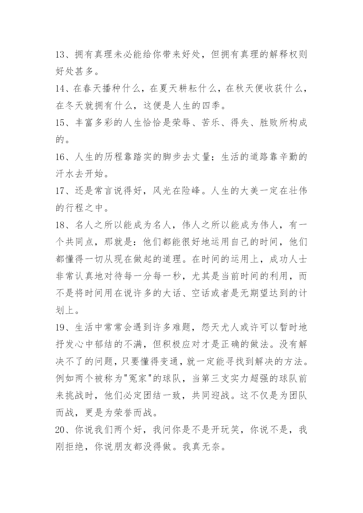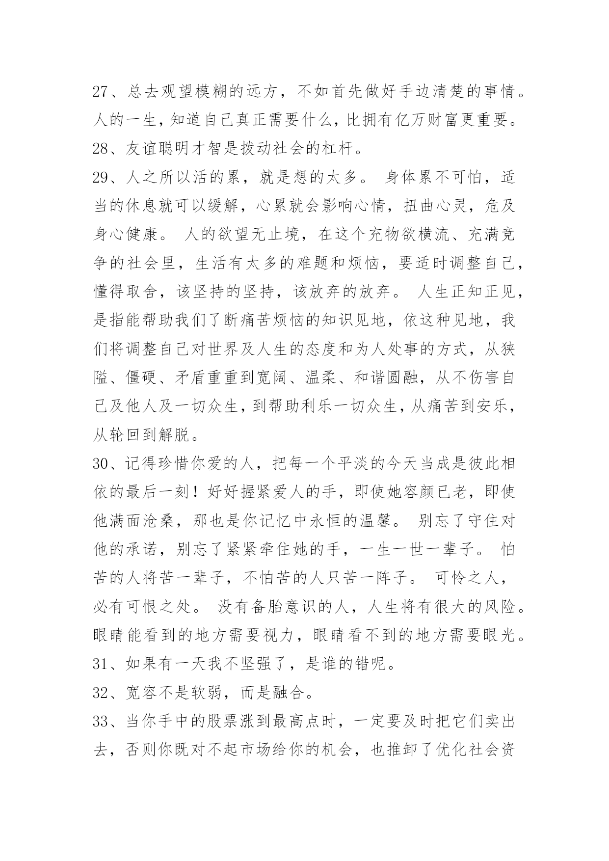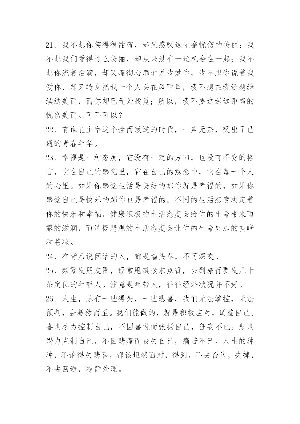 生活个性感言生活个性感言(精选40句)每个富人都希望他人分享自己的快乐,而不希望他人分享自己的快乐之源:金钱。下面这篇文章是小编特地为大家收集的生活个性感言,一起来看一下吧。1、懵觉漫天丝丝缕缕,漫天缠缠绵绵,徒添浑身湿气,浑身惆怅。尽管有漫天的凝雪白霜也掩盖不住我那早已溢满心房的相思。所以说:平生不会相思,才会相思,便害相思。2、不知道,千年的梦里,都有些什么样的曲折和反复。五百年前,五百年后,有没有一个女子前来,为你含泪低唱。而月色一样满山,青春一样如酒。3、我们走得太快的时候会不自觉地忽略身边的风景。那么请你偶尔也放慢自己的脚步,左右观看、前后欣赏,你会发现自己已经遗失了那么多的美好。4、很多事情,当经历过,自己知道就好,很多改变,不需要说出来,自己明白就好。所有的日子,都会到来,所有的日子,又都会过去,一切仿佛发生了,又仿佛一切没有发生。5、选择金钱而不成为利欲的奴仆,选择权势而不成为卑鄙的侍从,选择酒绿灯红而不陷入风尘,选择高楼别墅而不沦为情人、"小蜜"。6、拥有大智慧的人,可以做到"忘心不除境",而普通人往住在外境消除以后,心里依旧备受困扰。这就是凡人与具有大智慧的人的区别,也正是我们需要多加修炼的地方。7、谁欠谁的幸福,人有时候,总在失去时才后知后觉,一些人,一些事,以为只是生命中一抹浮云,以为可以从此相忘于江湖,却在别离之际发现,那些过往原来早已扎根在心底,拿不掉,抹不去。8、不遗忘别人,也许别人已把你遗忘,但你并不介意。你是那紫罗兰,固执地不在白天绽放,只在黑暗时默默地害羞,默默地祝福别人,默默地闪烁贞洁。9、了解对方的弱点;逆反心理能否起到应有的作用,就要我们了解对方的弱点。请将不如激将,也要了解"将"的"致命伤"。比如那些爱表现的人,我们不妨从反面说:"我知道您也是能力有限……"这样一激,对方肯定答应了你的请求。10、生活不可能一帆风顺,总会有波折,总会有险阻。也许今天给你所有,明天又会让你一无所有,无须烦恼,该来的总会来,再黑的夜晚也会有黎明到来的那一刻。不管生活有多么曲折,只要拥有幸福的态度就能挺过漫漫长夜,就能迎来美好的明天一痛是一种钙,能让我们长久地挺立;苦是一味药,能让我们顽强地支撑。11、夜静静地躺在宇宙的怀抱里,轻轻发出甜甜的鼾声,此刻我们会感觉到自己的心跳,也能感觉到夜的寂寞之美,我喜欢这样的夜晚,静静地梳理自己的心绪,聆听自己的呼吸,感受生命的美丽,感悟生活的幸福。12、孩子有探索精神是好事,但在有危险的探索上则需要父母的指导与保护。13、拥有真理未必能给你带来好处,但拥有真理的解释权则好处甚多。14、在春天播种什么,在夏天耕耘什么,在秋天便收获什么,在冬天就拥有什么,这便是人生的四季。15、丰富多彩的人生恰恰是荣辱、苦乐、得失、胜败所构成的。16、人生的历程靠踏实的脚步去丈量;生活的道路靠辛勤的汗水去开始。17、还是常言说得好,风光在险峰。人生的大美一定在壮伟的行程之中。18、名人之所以能成为名人,伟人之所以能成为伟人,有一个共同点,那就是:他们都能很好地运用自己的时间,他们都懂得一切从现在做起的道理。在时间的运用上,成功人士非常认真地对待每一分每一秒,尤其是当前时间的利用,而不是将时间用在说许多的大话、空话或者是无期望达到的计划上。19、生活中常常会遇到许多难题,怨天尤人或许可以暂时地抒发心中郁结的不满,但积极应对才是正确的做法。没有解决不了的问题,只要懂得变通,就一定能寻找到解决的方法。例如两个被称为"冤家"的球队,当第三支实力超强的球队前来挑战时,他们必定团结一致,共同迎战。这不仅是为团队而战,更是为荣誉而战。20、你说我们两个好,我问你是不是开玩笑,你说不是,我刚拒绝,你说朋友都没得做。我真无奈。21、我不想你笑得很甜蜜,却又感叹这无奈忧伤的美丽;我不想我们爱得这么美丽,却从来没有一丝机会在一起;我不想你流着泪滴,却又痛彻心扉地说我爱你,我不想你说着我爱你,却又转身把我一个人丢在风雨里,我不想在我还想继续这美丽,而你却已无处找觅;所以,我不要这遥远距离的忧伤美丽。可不可以?22、有谁能主宰这个性而叛逆的时代,一声无奈,叹出了已逝的青春年华。23、幸福是一种态度,它没有一定的方向,也没有不变的格言,它在自己的感觉里,它在自己的意念中,它在每一个人的心里。如果你感觉生活是美好的那你就是幸福的,如果你感觉自己是快乐的那你也是幸福的。不同的生活态度决定着你的快乐和幸福,健康积极的生活态度会给你的生命带来雨露的滋润,而消极悲观的生活态度会让你的生命更加的灰暗和苍凉。24、在背后说闲话的人,都是墙头草,不可深交。25、频繁发朋友圈,经常甩链接求点赞,去到旅行要发几十条定位的年轻人。注意是年轻人,往往经济状况并不好。26、人生,总有一些得失,一些悲喜,我们无法掌控,无法预判,会蓦然而至。